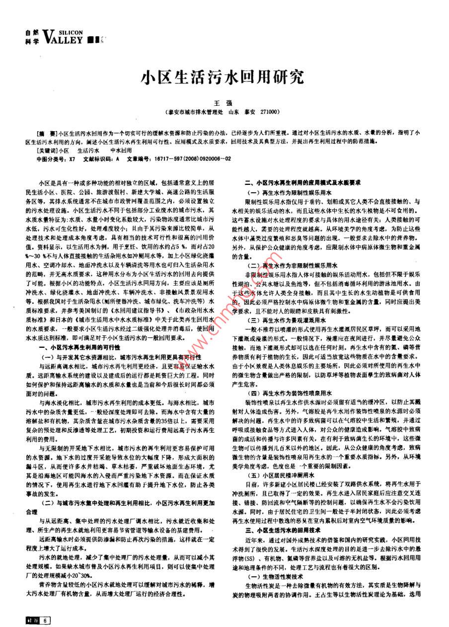 VA亞E■小區(qū)生活污水回用研究王強(豪安市城市排水管理處山東泰安271000賽]小區(qū)生活污水回用作為一個切實可行的緩解水資源和防止污染的辦法,已經(jīng)逐步為人們所重視,通過對小區(qū)生活污水的水質(zhì)、水歌的分析,指明了小區(qū)生活污水利用的方向,闡述小區(qū)生活污水再生利用可打性,應用模式及水質(zhì)要求,回用技術(shù)及其典型方法,并提出再生利用過程中的防范措施.[關(guān)鍵詞]小區(qū)生活污水中水回用中圖分類號:X7文獻標識碼:A文章編號:16717-597(2008)0920006-02小區(qū)是具有一種或多種功能的相對獨立的區(qū)域,包括通常意義上的居二、小區(qū)污水再生利用的應用式及水質(zhì)要求民生活小區(qū)、醫(yī)院、公園、旅游渡假村、新建大學城、高速公路的生活服(一)再生水作為限制性娛樂用水務區(qū)等,其排水系統(tǒng)通常不在城市市政管網(wǎng)覆蓋范圍之內(nèi),必須設置獨立限制性娛樂用水指僅用于垂釣、劃船或其它人類不會直接接觸的、與的污水處理設施。小區(qū)生活污水不同于包括部分工業(yè)廢水的城巾污水,其水相關(guān)的娛樂活動的水,而且這些水體中生長的水生物是不可食用的水質(zhì)水量特征為:水質(zhì)、水量小時變化系數(shù)較大,污染物濃度通常比城市污這些蓄水設施對水處理程度的要求與具體的用水途徑有關(guān):人類接觸的可水低,污水可生化性好,處理難度較小;且由于其污染來源比較簡單,從能性越大,需要的處理程度就越高。從環(huán)境美學的角度考慮,為防止這些處理技術(shù)和處理成本角度考慮,具有相當?shù)募夹g(shù)可行性和很高的回用價水體中藻類過度繁殖和臭等問題的出現(xiàn),一般要求去除水中的背養(yǎng)物值.資料顯示,以生活用水為例,用于烹飪、飲用的水約占5%,而對占20另外,從保護公眾健康的角度考慮,應限制水體中病原體微生物和重金屬~30%不與人體直接接觸的生活雜用水如沖廁用水等,加上小區(qū)綠化澆灌的含量用水、空調(diào)冷卻水、地面沖洗水以及4輛清洗等用水也可歸入生活雜用水二)再生水作為非限制性娛樂用水的范疇,并無高水質(zhì)要求,這種用水分布為小區(qū)生活污水的回用去向提供非限制性娛樂用水指人體可接觸的娛樂活動用水,包括但不限于娛樂了可能,根據(jù)小區(qū)的功能特點,小區(qū)生活污水問用方向,主要應該是廁所性湖泊、公共水塘以及魚池等,但不包括消毒循環(huán)利用的游泳池用水。由沖洗水、綠化澆灌水、地面沖洗水、車輛沖洗水、非接觸風景景觀用水于這些水體允許人類全身接觸,而且其中生長的水生動植物是可供食用等.根據(jù)我國對于生活雜用水(則所便器沖洗、城市綠化,洗車沖洗等)水的,因此必須嚴格控制水中病原體微物和重金屬的含量,同時應提出美質(zhì)標準要求,并參考美國制訂的《水問用建議指導書》、《市政雜用水水學要求,且不能對人的眼睛和皮膚具有刺激性質(zhì)標準》和日本的《城市生活用水中水水質(zhì)標準》中關(guān)于此類冉生回用水(三)再生水作為景觀灌溉用水的水質(zhì)要求,一般要求小區(qū)生活污水經(jīng)過二級強化處理并消毒后,使回用一般不推薦以噴灌的形式使用再生水灌溉居民區(qū)草坪,而可以采用地水水質(zhì)達到標準,即可滿足對于小區(qū)生活污水的一般回用要求下灌溉或漫的形式。一般情況下,漫灌應在夜間進行,并盡量避免公眾小區(qū)污水再生利用的可行性接觸,而地下灌溉形式卻可以選在任何時刻。冉生水中含有的氮、磷等營(一)與開發(fā)其它水資源相比,城市污水再生利用更具有可行性養(yǎng)物質(zhì)有利于植物的生長,因此可適當放寬這些物質(zhì)在水中的含量要求與遠距離調(diào)水相比,城市污水再生利用更經(jīng)濟,且更容易保證輸水水由于小區(qū)景觀是人類休息娛樂的主要場所,因此必須對所使用的再生水中質(zhì)。遠距離輸水系統(tǒng)的建設以及建成后的運行都是耗資巨大的工程。同時的微生物含量做出嚴格的限制,以防草坪等植物表面孽生的致病菌對人體如何保護和保持遠距離輸水的水質(zhì)和水量也是當前和今后很長時間都必須產(chǎn)生危害面對的問題。(四)再生水作為裝飾性噴泉用水與海水液化相比,城市污水再生利用的成本更低,與海水相比,城市裝飾性噴泉以再生水作供水源時必須留有適當?shù)木彌_區(qū),以防止其派污水中的雜質(zhì)含量更低,一般經(jīng)深度處理即可去除。而海水中含有大量的射對人體造成傷害。另外,氣溶膠是冉生水用作裝飾性噴泉的水源時必須溶解鹽和有機物,其雜質(zhì)含量在城市污水雜質(zhì)含的35倍以上,需要采用解決的向題。再生水中的許多致病菌可以在氣溶膠中生活和繁蘋,并通過復雜的預處理和反滲透等處理工藝,初期投資和運行費用遠高于污水再生呼吸或接觸食品等方式進入人體,對公眾的健康造成影響,氣溶膠中致病利用的費用菌的成活和傳播與許多因素有關(guān),在有利于致病蔭生長的環(huán)境中,這些微與無限制的開采地下水相比,城市污水的再生利用更容易保護可用生物可以傳播到幾白米以外的地區(qū)。因此,從公眾健康的角度考慮,致病的水資源,地下水的過度開采能導致水位的大幅度下降,形成大面積的微生物的含量是裝飾性噴泉用再生水的一個重要水質(zhì)指