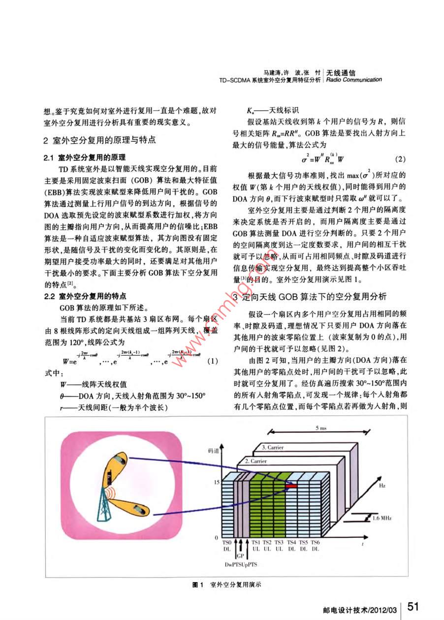 無線通信馬建濤許波張忖RadNoaon;TD- SCDMA系統(tǒng)室外空分復用特征分析TD- SCDMA系統(tǒng)室外aracteristIc AnalysIs o空分復用特征分析馬建濤,許波,張忖(中訊郵電咨詢設計院有限公司,河南鄭州450007Ma Jiantao, Xu Bo, Zhang Cun( china Information Technology Designing&Consulting Institute Co. Ltd, Zhengzhou 450007, China關鍵詞:闡述了TD- SCDMA系統(tǒng)扇區(qū)定向天線室外空分復用的原理及特點,給空分復用時分同步碼分多址隔離;固定波束掃面出了GB算法下判斷是否開啟空外空分復用的最小隔離度并分析了特中圈分類號:TN9295殊情況下的波束賦型瓣零陷點性能碼:A文章編號:1007-3043(2011)03-0050-04AbstractIt analyzes the principle of outdoor SDM in TD-SCDMA system, and provides the least isolation degree by GOB, which can determine whether the system opens SDM function. At the same time, it analyzes the performance of side-lobe beam forming andKeywordsSDM: TD-SCDMA; Isolation degree; GOB方向上形成不同的定向波束,即使用戶占用相同的頻1概述域、時域及碼道資源也不會發(fā)生相互干擾或干擾很小。隨著數(shù)據(jù)用戶規(guī)模的不斷擴大和通信業(yè)務的不在無需增加載頻資源、修改用戶終端、調(diào)整網(wǎng)絡規(guī)劃及斷增長,現(xiàn)有的通信資源(如FDMA、CDMA、TDMA)的改變空口技術的情況下,利用智能天線的室外隔離度容量已接近飽和。時分同步碼分多址( TD-SCDMA,簡(即用戶人射角度差)或室內(nèi)多通道隔離度來實現(xiàn)碼道稱TD)屬碼道資源受限系統(tǒng),提高碼道利用率是提升的重復利用,從而達到了提高小區(qū)吞吐量的效果。其吞吐量和頻率利用率的關鍵。目前TD系統(tǒng)使用的目前,室內(nèi)空分復用業(yè)已實現(xiàn)它主要是利用室內(nèi)是B頻段,室/內(nèi)外各有6個頻點,由其載頻資源少、碼樓板及墻體構(gòu)成的用戶天然隔離、使用空分復用和室道數(shù)量有限而導致的容量受限尤為突出。內(nèi)覆蓋技術,根據(jù)用戶在不同通道上的功率值計算用鑒于空分多址(SDMA)技術通過陣列天線提供的戶的隔離度,并選取隔離度大的用戶進行時隙及碼資空間動態(tài)控制增加了1個維度,故而能解決上述難源的重復利用來有效地提高室內(nèi)吞吐量的。中興通題。通常移動用戶位于小區(qū)的不同位置,因此在基站訊 HSDPA Mx(倍速)的室內(nèi)測試結(jié)果表明,其吞吐量側(cè)接收到的不同用戶的空間特征也是不一樣的。SD-能增加2倍。MA就是利用這種差異性,通過陣列天線技術在用戶由于室外空分復用實際無線環(huán)境的復雜性(如波瓣和旁瓣干擾比、來波方向(DOA)估計精度和信道快收稿日期:201201-19速變化)很容易導致錯誤的觸發(fā)空分,其效果并不理50|201203DTPT馬建濤許波張忖無線通信cDMA系統(tǒng)室外空分復用特征分析 Radio Communication想。鑒于究竟如何對室外進行復用一直是個難題故對K?!炀€標識室外空分復用進行分析具有重要的現(xiàn)實意義。假設基站天線收到第k個用戶的信號為R,則信2室外空分復用的原理與特點號相關矩陣R。=RR"。GOB算法是要找出人射方向上最大的信號能量,算法公式為21室外空分復用的原理WR WTD系統(tǒng)室外是以智能天線實現(xiàn)空分復用的。目前主要是采用固定波束掃面(GOB)算法和最大特征值根據(jù)最大信號功率準則,找出max(o)所對應的(EBB)算法實現(xiàn)波束賦型來降低用戶間干擾的。GOB權(quán)值W(第k個用戶的天線權(quán)值),同時能得到用戶的算法通過測量上行用戶信號的到達方向,根據(jù)信號的DOA方向,而下行波束賦型時只需取就可以了。DOA選取預先設定的波束賦型系數(shù)進行加權(quán),將方向室外空分復用主要是通過判斷2個用戶的隔離度圖的主瓣指向用戶方向從而提高用戶的信噪比:EB來決定系統(tǒng)是否開啟的,而用戶隔離度主要是通過算法是一種自適應波束賦型算法,其方向圖沒有固定GOB算法測量DOA進行空分判斷的。只要2個用戶形狀是隨信號及干擾的變化而變化的。其原則是,在的空間隔離度到達一定度數(shù)要求,用戶間的相互干擾期望用戶接受功率最大的同時,還要滿足對其他用戶就可子以忽略,從而可占用相同頻點時隙及碼道進行干擾最小的要求。下面主要分析GOB算法下空分復用信息傳輸實現(xiàn)空分復用,最終達到提高整個小區(qū)吞吐的特點2。量的目的。室外空分復用演示見圖1。22室外空分復用的特點3定向天線GOB算法下的空分復用分析GOB算法的原理如下所述。當前TD系統(tǒng)都是共基站3扇區(qū)布網(wǎng)。每個假設一個扇區(qū)內(nèi)多個用戶空分復用占用相同的頻由8根線陣形式的定向天線組成一組陣列天線,覆蓋率、時隙及碼道,理想情況下只要用戶DOA方向落在圍為120°,線陣公式為其他用戶的波束零陷位置上(波束復制為0的點),用戶間的干擾就可予以忽略(見圖2)。(1)由圖2可知,當用戶的主瓣方向(DOA方向)落在式中其他用戶的零陷點處時,用戶間的干擾可予以忽略,此W——線陣天線權(quán)值時就可空分復用了。經(jīng)仿真遍歷搜索30-150°范圍內(nèi)DOA方向,天線入射角范圍為30°-150°的所有入射角零陷點,可發(fā)現(xiàn)一個規(guī)律:每個人射角都天線間距(一般為半個波長)有幾個零陷點位置,而每個零陷點若再做為入射角,則5 ms3.Carrier2. Carrier1.6 MHzTS0魯44TsiT2Ts3T4TsULULUL DLDL DDwPISUpPTS圖1室外空分復用演示郵電設計技術20120351無線通信馬建濤許波張忖Radio Communica
