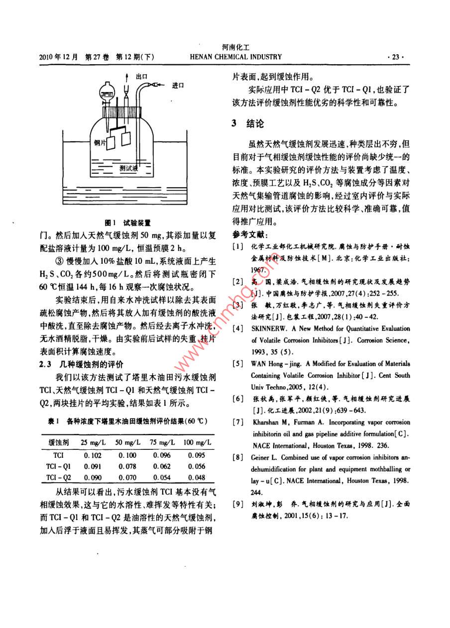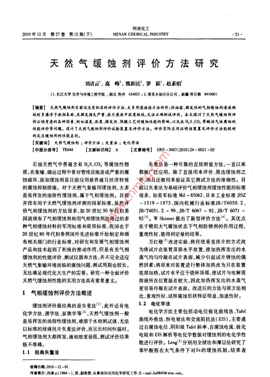 河南化工2010年12月第27卷第12期(下)HENAN CHEMICAL INDUSTRY天然氣緩蝕劑評價方法研究劉清云,高峰,熊新民2,羅躍,趙素娟(1長江大學(xué)化學(xué)與環(huán)境工程學(xué)院,湖北荊州434023;2塔里木油田分公司,新疆庫爾勒841000)【擠要】天然氣緩蝕劑目前還沒有標準的評價方瀆,大多用浸液掛片法評價;但油溶、揮發(fā)性的氣相緩蝕劑浸液測誠時多瀮浮于液相表面,且揮發(fā)損失嚴重,掛片浸液中濃度極低,無法正確測試評價。本文揮討了天然氣緩蝕劑評價必須考慮的各種因素,例如溫度、濃度、揮發(fā)性、預(yù)膜工藝對緩蝕性能的彩響,以及抗H2S、CO2等酸性氣體腐蝕的性能評價等問題。設(shè)計了天然氣緩蝕劑評價試驗裝置及評價方法。評價實際應(yīng)用誣明該裝及評價方法能較好的反應(yīng)緩蝕劑的性能差別?!娟P(guān)鍵詞】天然氣緩蝕劑;評價方法;失重法;電化學(xué)法【中圖分類號】T644【文獻標識碼】A【文章編號】1003-3467(2010)24-0021-03石油天然氣中普遍含有H2S、CO2等腐蝕性物失重法是一種可靠的直接測量方法,一直以來質(zhì),在集輸、儲運過程中常對管線設(shè)施造成嚴重的腐都被廣泛應(yīng)用。除了直接用來評價、篩選緩蝕劑之蝕破壞,添加緩蝕劑是目前應(yīng)用最普遍且經(jīng)濟特效外,而且還被用來驗證其它測試方法的準確性。目的腐蝕抑制措施。對于天然氣集輸用緩蝕劑,大多前以失重法為基礎(chǔ)評價氣相緩蝕劑緩蝕性能的標準是易揮發(fā)的油溶性緩蝕劑,屬于氣相緩蝕劑。目前很多,如美軍標準Ml-85062、日本工業(yè)標準JlsZ并沒有用于天然氣緩蝕劑評測的國家標準,雖然評-1519-1973、國內(nèi)機械行業(yè)標準JB/T4050.2、價氣相緩蝕劑的方法很多,如20世紀50年代初美JB/T4051.2-99、JBT6067-92、JBT6071國就頒布了氣相緩蝕劑和用氣相緩蝕劑處理過的多921。 W Skinner提出了新型評價方法“。其優(yōu)點種氣相緩蝕材料的軍用標準和聯(lián)邦標準,我國也于在于模擬大氣腐蝕狀態(tài)下氣相防銹劑的作用過程20世紀80年代初參照國外先進標準開始制定和頒重現(xiàn)性好能得到定量的結(jié)果。布相關(guān)部門的行業(yè)標準,對研究和發(fā)展氣相緩蝕劑萬紅敬改進實驗將傳統(tǒng)垂直掛片的方式改產(chǎn)品和技術(shù)起到了積極的推動作用,但是有關(guān)氣相為將試片在裝置頂部水平放置,使加熱揮發(fā)出的水緩蝕劑的性能評價、測試儀器和方法,并不完全適應(yīng)蒸氣均勻冷凝在試片表面,減少引起試片銹蝕的偶天然氣集輸環(huán)境面臨的腐蝕問題測試周期也較長,然因素;將原來對裝置進行整體加熱改為只在裝置無法滿足現(xiàn)代化大生產(chǎn)的需要。研究一種全面評價底部加熱,試片水平位于燒杯頂部,使試片與電解質(zhì)天然氣緩蝕劑性能的實用方法具有重要意義。溶液所在位置溫差較大,因此加熱揮發(fā)出的水蒸氣1氣相緩蝕劑評價方法概述更容易冷凝在試片表面。改進后的方法與原方法相比,重現(xiàn)性好,試樣腐蝕形狀特征明顯加速性好。緩蝕劑評價最經(jīng)典的是失重法,此外還有電1.2電化學(xué)法化學(xué)方法譜學(xué)法、顯微學(xué)等2,天然氣緩蝕劑一般電化學(xué)方法主要包括動電位極化曲線法、Tael是易揮發(fā)的油溶性緩蝕劑,難溶于水相測試液,無法曲線外推法恒電t法和交流阻抗法(ES),主要通以標準的浸液掛片失重法評價而且長時間恒溫時,過自腐蝕電位、陰陽極Tael斜率、自腐蝕電流極化氣相緩蝕劑大都揮發(fā),液相濃度很低,測試評價結(jié)果電阻和ES解析等電化學(xué)數(shù)據(jù)對緩蝕劑的電化學(xué)性極不準確。能進行評價。Leng2分別用全浸法和薄層法研究了11經(jīng)典失重法苯甲酸胺在大氣條件下對Fe的緩蝕機制。結(jié)果表收稿日期:2010-12-01作者簡介:劉清云(1964-),男副教授從事油田應(yīng)用化學(xué)研究工作,E-mail;i9845@nina,com河南化工HENAN CHEMICAL INDUSTRY2010年12月第27卷第12期(下)明電解液的厚度對陰陽極反應(yīng)過程有很大的影響。緩蝕劑抗H2S、CO2腐蝕的緩蝕能力是天然氣緩蝕劑的加入可以引起金屬表面鈍化但是只有當緩蝕劑需具備的最基本的性能。石油天然氣中往往金屬表面的電解液很薄時才可以觀察到穩(wěn)定的鈍化含有H2S、H2O、CO2等因子,例如我國西南部油田現(xiàn)象。因此他提出金屬的緩蝕效率不能通過傳統(tǒng)的四川高含硫氣田,新疆塔里木部分油氣井含H1S也大體積測量,而必須在薄層電解液中甚至在吸附層比較高。另外,一些油田還高含CO2。所以為了防中進行測量。止和減緩天然氣集輸管道的腐蝕,加入緩蝕劑是非13其它方法常有效的措施。目前現(xiàn)場使用最多的咪唑啉類油溶另外還有譜學(xué)法、顯微學(xué)法等。譜學(xué)法利用人性緩蝕劑抗H2S、CO2等腐蝕性能良好,但大都為復(fù)射光波對金屬表面吸附分子振動的影響得到關(guān)于電配物。 M Kharshan等利用咪唑啉、有機酸、不同極表面狀態(tài)的結(jié)構(gòu)信息,主要包括紫外—可見光譜、的表面活性劑和氣相緩蝕劑的復(fù)配,研制出一種可橢圓偏振光法拉曼光譜和紅外光譜法。顯微學(xué)法以用于油氣管道的緩蝕劑配方。也有將VCs和去主要有電化學(xué)掃描隧道顯微技術(shù)(STM)掃描電子濕劑復(fù)配得到較好的緩蝕劑配方。另外俄羅斯顯微術(shù)(SEM)、透射電子顯微術(shù)(TEM)和光學(xué)顯