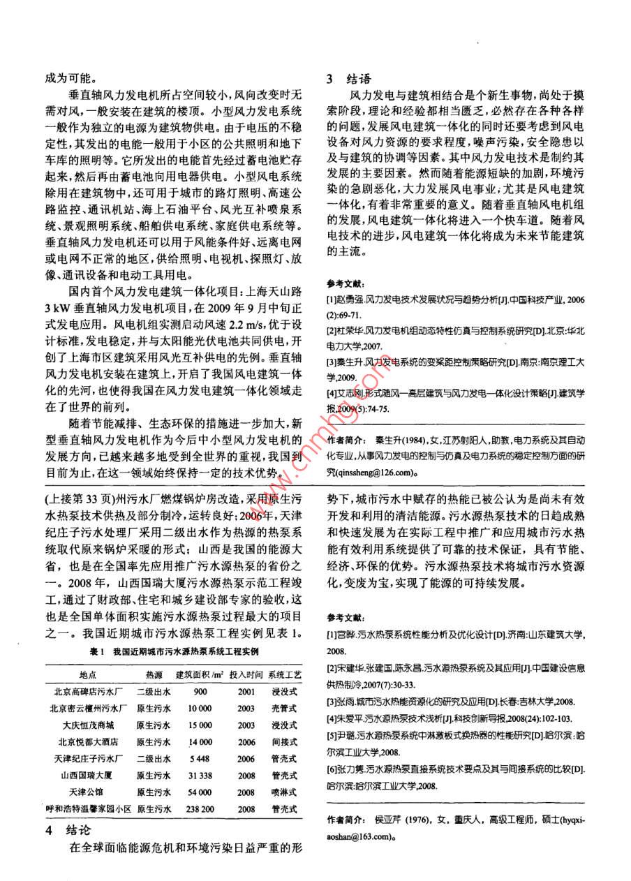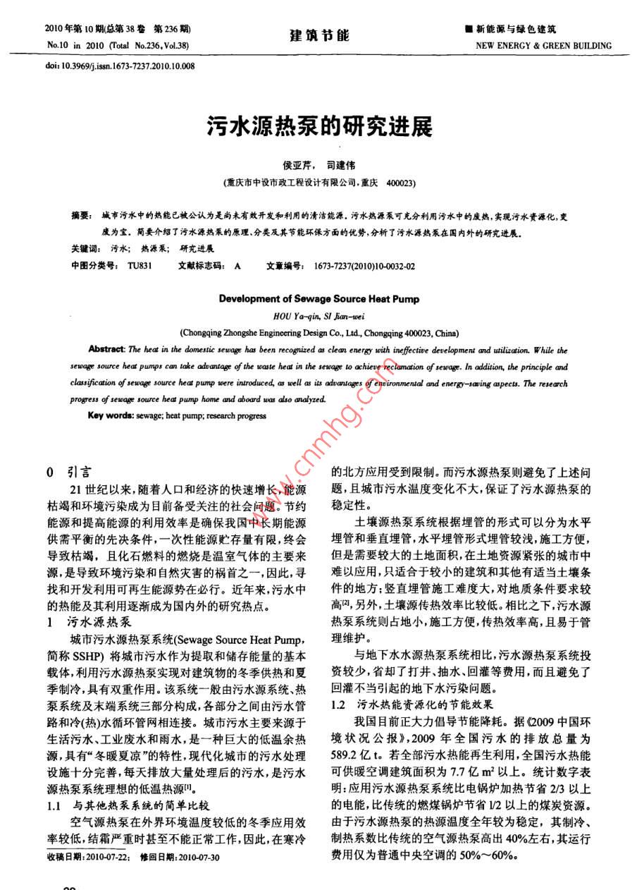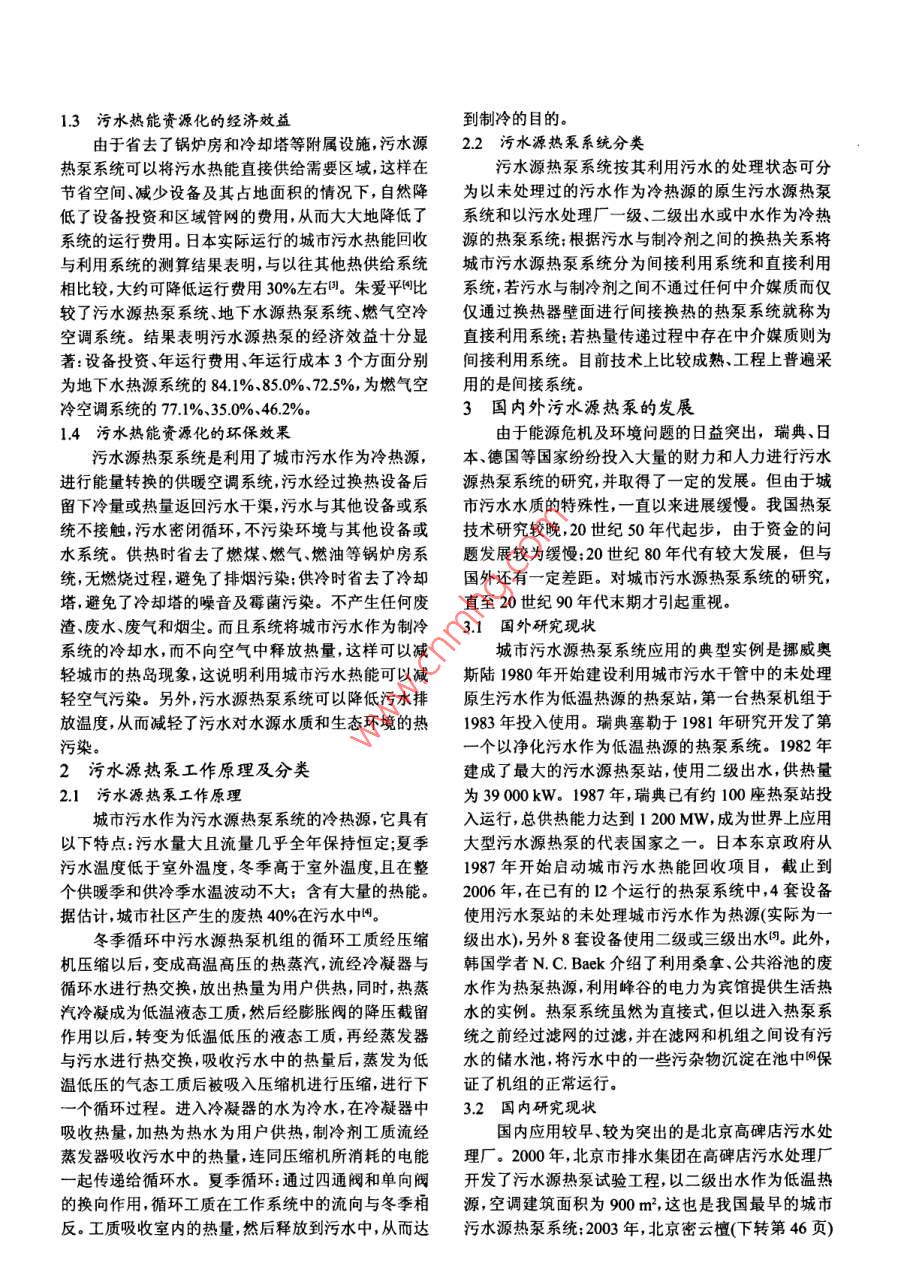 2010年第10期總第38卷第236期建筑節(jié)能■新能源與綠色建筑No 10 in 2010(Total No 236, Vol 38)NEW ENERGY GREEN BUILDINGdoi:10,3969/issn67372372010.10.008污水源熱泵的研究進(jìn)展侯亞芹,司建偉(重慶市中設(shè)市政工程設(shè)計(jì)有限公司,重慶40003)摘要:城市污水中的熱能已被公認(rèn)為是尚未有效開發(fā)和利用的清潔能源,污水熱源泵可克分利用污水中的廢熱,實(shí)現(xiàn)污水資源化,變廢為寶簡(jiǎn)要介紹了污水源熱泵的原理分類及其節(jié)能環(huán)保方面的優(yōu)勢(shì),分析了污水源熱泵在國內(nèi)外的研究進(jìn)展關(guān)鍵詞:污水;熱源泵;研究進(jìn)展中圖分類號(hào):TU831文獻(xiàn)標(biāo)志碼:A文章編號(hào);1673-7237(2010)10003202Development of Sewage Source Heat PumpHOU Ya-gin, SI Jan-woei(Chongqing Zhongshe Engineering Design Co, Ltd, Chongqing 400023, China)ewage source hear pumps can take advantage of the waste heat in the sewage to achieve reclamation of sewage. In addition, the principleclassification of sewage source heat pump were introduced, as well as its advantages of environmentol and energ - saming aspects. The researchprogress of sewage souree heat pump home and aboard was also analyzedKey words: sewage: heat pump; research progress0引言的北方應(yīng)用受到限制。而污水源熱泵則避免了上述問21世紀(jì)以來隨著人口和經(jīng)濟(jì)的快速增長,能源題,且城市污水溫度變化不大,保證了污水源熱泵的枯竭和環(huán)境污染成為目前備受關(guān)注的社會(huì)問題。節(jié)約穩(wěn)定性能源和提高能源的利用效率是確保我國中長期能源土壤源熱泵系統(tǒng)根據(jù)埋管的形式可以分為水平供需平衡的先決條件,一次性能源貯存量有限,終會(huì)埋管和垂直埋管,水平埋管形式埋管較淺施工方便,導(dǎo)致枯竭,且化石燃料的燃燒是溫室氣體的主要來但是需要較大的土地面積在土地資源緊張的城市中源是導(dǎo)致環(huán)境污染和自然災(zāi)害的禍?zhǔn)字?因此,尋難以應(yīng)用只適合于較小的建筑和其他有適當(dāng)土壤條找和開發(fā)利用可再生能源勢(shì)在必行。近年來污水中件的地方;豎直埋管施工難度大,對(duì)地質(zhì)條件要求較的熱能及其利用逐漸成為國內(nèi)外的研究熱點(diǎn)。高,另外,土壤源傳熱效率比較低。相比之下,污水源1污水源熱泵熱泵系統(tǒng)則占地小,施工方便,傳熱效率高,且易于管城市污水源熱泵系統(tǒng)( Sewage Source Heat Pump,理維護(hù)。簡(jiǎn)稱SSH)將城市污水作為提取和儲(chǔ)存能量的基本與地下水水源熱泵系統(tǒng)相比,污水源熱泵系統(tǒng)投載體,利用污水源熱泵實(shí)現(xiàn)對(duì)建筑物的冬季供熱和夏資較少,省卻了打井、抽水、回灌等費(fèi)用,而且避免了季制冷,具有雙重作用。該系統(tǒng)一般由污水源系統(tǒng)、熱回灌不當(dāng)引起的地下水污染問題。泵系統(tǒng)及末端系統(tǒng)三部分構(gòu)成,各部分之間由污水管1,2污水熱能資源化的節(jié)能效果路和冷(熱)水循環(huán)管網(wǎng)相連接。城市污水主要來源于我國目前正大力倡導(dǎo)節(jié)能降耗。據(jù)《2009中國環(huán)生活污水、工業(yè)廢水和雨水,是一種巨大的低溫余熱境狀況公報(bào)》,2009年全國污水的排放總量為源,具有“冬暖夏涼的特性,現(xiàn)代化城市的污水處理5892億t。若全部污水熱能再生利用全國污水熱能設(shè)施十分完善,每天排放大量處理后的污水,是污水可供暖空調(diào)建筑面積為77億m2以上。統(tǒng)計(jì)數(shù)字表源熱泵系統(tǒng)理想的低溫?zé)嵩磫?。?應(yīng)用污水源熱泵系統(tǒng)比電鍋爐加熱節(jié)省23以上1.1與其他熱泵系統(tǒng)的簡(jiǎn)單比較的電能,比傳統(tǒng)的燃煤鍋爐節(jié)省2以上的煤炭資源??諝庠礋岜迷谕饨绛h(huán)境溫度較低的冬季應(yīng)用效由于污水源熱泵的熱源溫度全年較為穩(wěn)定,其制冷、率較低,結(jié)霜嚴(yán)重時(shí)甚至不能正常工作因此,在寒冷制熱系數(shù)比傳統(tǒng)的空氣源熱泵高出40%左右,其運(yùn)行收稿日期:20100722:修回日期:20100730費(fèi)用僅為普通中央空調(diào)的50%~60%13污水熱能資源化的經(jīng)濟(jì)效益到制冷的目的由于省去了鍋爐房和冷卻塔等附屬設(shè)施污水源22污水源熱泵系統(tǒng)分類熱泵系統(tǒng)可以將污水熱能直接供給需要區(qū)域,這樣在污水源熱泵系統(tǒng)按其利用污水的處理狀態(tài)可分節(jié)省空間減少設(shè)備及其占地面積的情況下,自然降為以未處理過的污水作為冷熱源的原生污水源熱泵低了設(shè)備投資和區(qū)域管網(wǎng)的費(fèi)用,從而大大地降低了系統(tǒng)和以污水處理廠一級(jí)、二級(jí)出水或中水作為冷熱系統(tǒng)的運(yùn)行費(fèi)用。日本實(shí)際運(yùn)行的城市污水熱能回收源的熱泵系統(tǒng);根據(jù)污水與制冷劑之間的換熱關(guān)系將與利用系統(tǒng)的測(cè)算結(jié)果表明,與以往其他熱供給系統(tǒng)城市污水源熱泵系統(tǒng)分為間接利用系統(tǒng)和直接利用相比較,大約可降低運(yùn)行費(fèi)用30%左右。朱愛平比系統(tǒng),若污水與制冷劑之間不通過任何中介媒質(zhì)而僅較了污水源熱泵系統(tǒng)、地下水源熱泵系統(tǒng)燃?xì)饪绽鋬H通過換熱器壁面進(jìn)行間接換熱的熱泵系統(tǒng)就稱為空調(diào)系統(tǒng)。結(jié)果表明污水源熱泵的經(jīng)濟(jì)效益十分顯直接利用系統(tǒng);