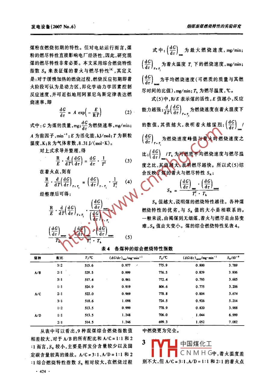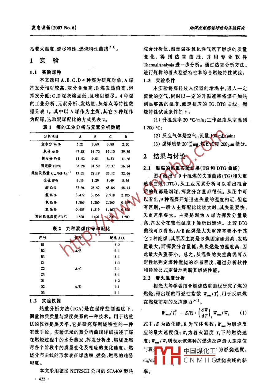 燜煤混煤燃燒特性的實驗研究發(fā)電設(shè)備(2007 No.6).;研究與分析:Ac..e.c煙煤混煤燃燒特性的實驗研究朱建忠,呂當振’,姚洪2(1.燕山石化公司動力事業(yè)部二電站,北京102500;2.華中科技大學(xué)煤燃燒國家重點實驗室,湖北武漢430074)摘要:近年來 ,混煤燃燒在世界范圍.特別是在中國得到了廣泛的應(yīng)用。針對這種情況,選定4種單一煤種及其9種混合比例的混煤進行了試驗研究,得到了著火溫度、可燃性指數(shù)w.m7和綜合燃盡指數(shù)Sn等數(shù)據(jù),確定了幾種燃燒特性較好的混合比例的混煤。關(guān)鍵詞:能源與動力工程;煤的燃燒;混煤;摻混比例;著火特性;燃盡特性中圖分類號:TKI6文獻標識碼:A文章編號:1671-0866(007)06-0421-05Experimental Study on Combustion Characterstics ofBituminous Coal and of Coal MixturesZHU Jian-zhong', L0 Dangzhen',YAO Hong'(1. Power Department' s Power Station No.2, Yanshan Petrochemical Co., Beijing 102500, China;2. National Key Lab of Coal Combustion, Huazhong University of Science and Technology , Wuhan 430074, China)Abstract: In recent years coal mitres are widely used in word, and especilly in China. In view of theseeircunstances, 4 individual coal calegories and mixtures of them blended in 9 dfferent proportions were chosen forexperimental studies. Data conceming ignition temperature, combustibility index w_1Tf and bun-of index Sw wereherewith obtaned. Consequenly, ●few bleding proportions, featured by relatively good combustion propeties, were fixedKeywords: enengy and power engnering; coal combustion; coal misture; blending propotion; ignition poperty;bum-of property我國是世界上唯一以煤為主要能源的大國,煤,可提高經(jīng)濟效益。這樣的能源構(gòu)成在今后相當長的一段時期內(nèi)不會然而,混煤雖是簡單的機械混合過程,但其燃改變。作為一次能源,煤的利用方式在我國主要燒特性并不是組分煤種的簡單疊加。由于不同煤是燃燒,火力發(fā)電站用煤約占原煤消耗的30%左種在燃燒過程中相互影響,使得混煤的煤質(zhì)特性右。近年來,由于原煤供不應(yīng)求,很多電廠很難燃和燃燒性能更加復(fù)雜。煤的著火和燃燒穩(wěn)定性是用設(shè)計煤種,而是使用幾種煤的混煤或摻燒。頇影響鍋爐爐內(nèi)燃燒穩(wěn)定性的主要因素。對已投運計以后相當長的時間內(nèi),混煤的使用將更為廣泛。的鍋爐,當煤種改變時將涉及煤的著火性能對鍋如果使用正確的方法來配煤,則有以下優(yōu)越性": .爐的適應(yīng)性和如何進行改造等問題,因此對混煤(1)提高鍋爐熱效率,以節(jié)約煤炭;(2)充分利用的著火性能進行深人研究就顯得特別重要。因當?shù)孛禾抠Y源,做到物盡其用;(3)盡量少用優(yōu)質(zhì)此,中國煤化工的燃燒特性,包收稿日期:0025;修囡日期2007-0625MYHCNMHG作者簡介:朱建忠(1970-),男,工程師,主要從事熱電站技術(shù)和管理工作。421●發(fā)電設(shè)備(2007 No.6)煙媒混煤燃燒特性的實驗研兗括著火溫度、燃盡特性、燃燒特性曲線13)。綜合分析儀.測量煤在氧化性氣氛下燃燒的質(zhì)量變化,得到熱重曲線,并用專業(yè)軟件1實驗ThemalAnalysis進一步分析。通過熱重分析方法,1.1 實驗煤種.進行煤樣的著火穩(wěn)燃特性和綜合燃燒特性試驗。本文選用A、B、C、D4種煤為研究對象,A煤1.3 實驗條件揮發(fā)分相對較高,灰分含量高;B煤發(fā)熱值高,但本實驗將煤樣放人儀器的坩堝中,通人一定.揮發(fā)分低;C、D煤灰熔點低,且難以燃盡。4種煤流量的空氣,同時以一定的升溫速率將煤樣加熱的工業(yè)分析、元索分析、發(fā)熱量、灰熔點等特性數(shù)到足夠高的溫度,測定相應(yīng)的TC、DTG曲線。燃據(jù)見表1。其中以A煤作為主煤,其它3種煤作燒特性試驗條件如下:為配煤,選取混煤配比的方式見表2。(1)升溫速率20。C/min;工作溫度從室溫到表1煤的工業(yè)分析與元素分析數(shù)據(jù)1 200 °C;分析項目BC(2)反應(yīng)氣體是空氣,流量100mL/min;全水分w1%5.21 3.60 3.802.20(3)煤樣質(zhì)量20^_10 g,煤粉細度200μm篩分。灰分N%47.88.14.70 19.1029.80揮發(fā)分V/%.11.52 9.01 8.33 11.362結(jié)果與討論固定碳FC/%38.2874.59 70.372.1 混煤的熱重實驗結(jié)果{TG和DTG曲線)低位發(fā)熱量Q./MJ.kg-' 13.27 28.19 26.1222.66圖1給出了9個混煤的失重曲線(TG)和失重全硫s/%6.131.29 3.49 .s.36速率曲線(DTC),從工業(yè)元素分析可以看出混合碳C/%37.9476.57 68.8658.73后的煤都是煙煤,揮發(fā)分含量都很低。從圖中可氫H/%.3.472 3.156 2.918 2.935以看出,9種混煤開始迅速失重的溫度相近,但也氧0/%1.8631.265 2.260.349有區(qū)別,一般A主煤配比比較大時,其失重要快,氦NI%0.405 1.319 1.167 0.826灰的軟化溫度 ST/C 1500 1490 1290 1 200失重速率要大。主要是因為A煤含揮發(fā)分量最高,揮發(fā)分在較低溫度下便析出燃饒。比較DTG表2九種混煤序號和配比曲線可以看出:A/B配煤最大失重速率要小于其序號煤種配比A:X它2種配煤,其原因主要是B煤固定碳最高,發(fā)熱B13:2量最大,而揮發(fā)分含量低,焦炭燃燒的溫度高,因AVB2:1此最大失重要小??傊?從混煤的失重曲線可以3:1c11:定性地判定煤種燃燒的難易程度,通過分析軟件.:2NC2:和經(jīng)驗公式定量地判斷其燃燒性能。2.2蓍火溫度分析)2A/D相光大等學(xué)者結(jié)合燃燒熱重曲線研究了煤的燃燒,得出煤的可燃性指數(shù)w. /咒,用于反映煤1.2 實驗儀器在燃燒前期的反應(yīng)能力[41。熱重分析方法(TGA)是在程序控制溫度下,測量物質(zhì)質(zhì)量與溫度關(guān)系的一種技