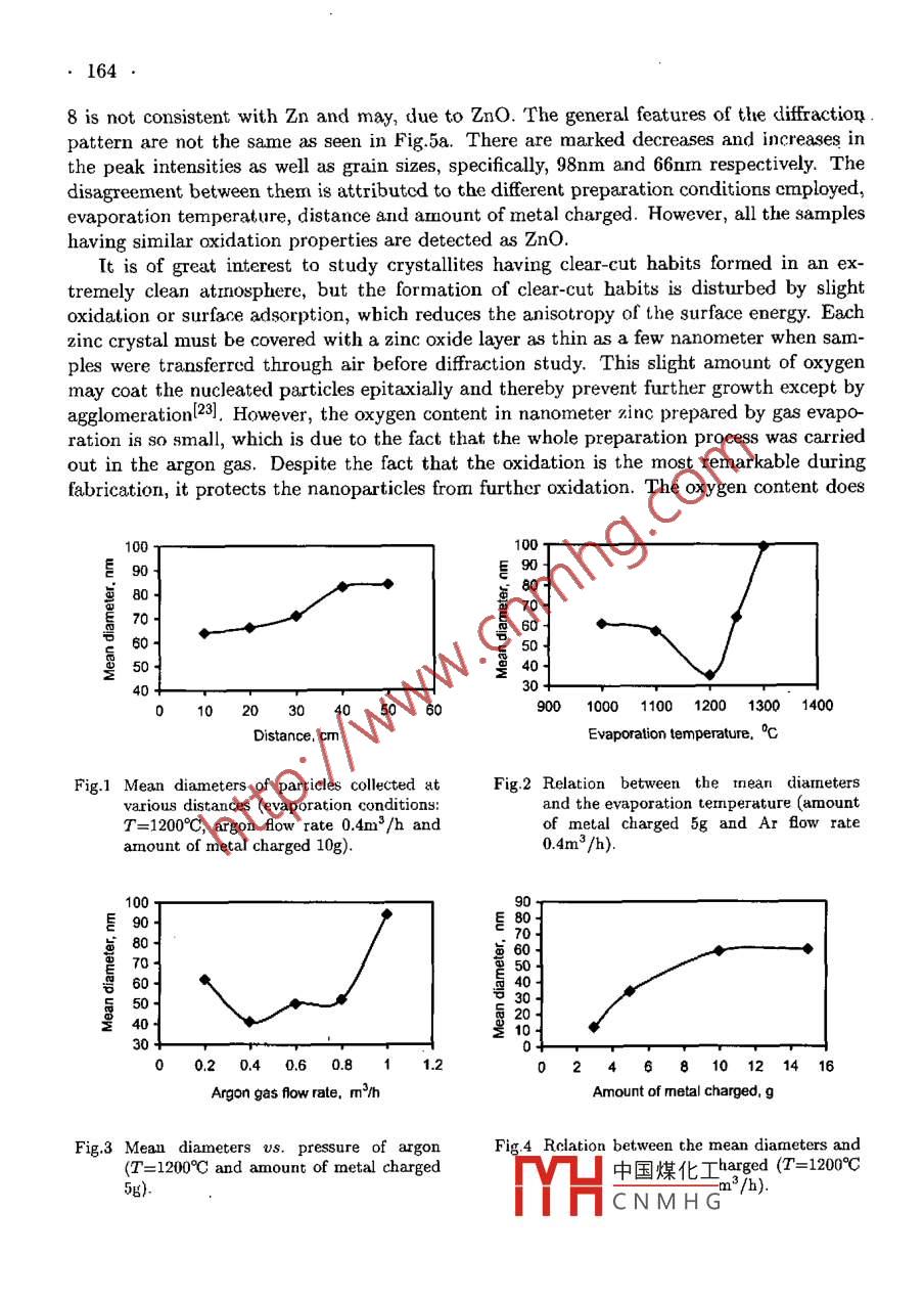 ACTA METALLURGICA SINICA (ENGLISH LETTERSVol 16 No. 3 pp 161-168 June 2003STUDY ON NANOMETER ZINC PARTICLES FABRICATED BYGAS EVAPORATION METHODManuscript, received 19 September 2002; in revised form 6 January 200, eiaA.A.A. Salch. X.. Zhai, Y.C. Zhai.Y. Fu and A.L. ZhatSchool of Materials and Metallurgy, Northeastern University, ShenyangNanometer in particles urith mean diameters 12-100nm made by evaporating its pow-ders in argon gas were studied mainly by X-ray diffraction and electron microscopyThey are collected at various distances and those factors infiuencing the mean particlesize were studied. The optimal synthetic conditiong were obtained, i. e, evaporationtemperature is 1200C; argon Row rate is 0.4m/h; amount of pounder charged is 3gdistance from evaporation source is 10cm. It was found that the size of particles wasgoverned by argon flow rate, evaporation temperature, amount of metal charged anddistance from the source. The size increases remarkably with distance in the spacewhere no metal vapor exists. This implies that the crystallites grow by coalescence.Electron micrographs and diffraction patterns are reproduced to show the size, shapeand state of oxidations. Nanoparticles with definite crystal habits were sometime.observed among those with irregular onesKEY WORDs gas evaporation method, nanometer Zn, XRD,2'EM1. IntroductionNanomaterials are those with a crystal sizc in the region of 1-100nm, which can beproduced by gas evaporation method(1-41. This method has had a rather long historystretching back to the formation and use of"smokes"such as carbon or bismuth"blacksfor a variety of applications(5-71. PfundlBI evaporated zinc in air at low pressure andobtained a soot like substances zinc black, which was used as an absorber of infraredradiation. Uyeda and Kimotol9) was able to vary the average particle size by changingthe gas pressure, Wadaobserved and qualitatively explained variations of particle sizesoccurring when different noble gases were usedOf many methods to prepare nanometer Zn particles, the gas evaporation method seemssurface, but production cost is fairly high. The chemical methods take precedence overthe former in a large amount produced at low cost. The gas evaporation method can buThe principle is very simple and dircct, but there exist many difficulties in practice]It can be used most frequently for the production of dry (i.e. not in liquid suspensionmetal nanoparticles with very low impurity content is based on the condensation of ace ofling gaelium that acts both as a cooling agent and a carril山中國煤化工mevapour nucleates homogeneously as a result of collCNMH Gncrt gas atomsGrowth of particles within the convective gas flow occurs via coalcscenceli5-221162Previous investigators[5-6, 23-25, have prepared ultrafine Zn particles by evaporatingfrorn tungsten basket, spiral, conical, helix or boat tungsten heaters were adopted, while inthe present investigation, nanometer Zn particles was produced by the direct evaporationfrom crucible in which the heat source was an electric furnace; experimental conditions forpreparation of nanometer Zn have been studied first; then observation by X-ray diffraction and transmission electron microscopy(TEM) have been made about structure andInorphology of Zn particles condensed onto inner wall and onto collector2. ExperimentalThe powder of zinc metal used in the present study was of purity 99.994% and that ofargon gas, of 99.99%. An alumina crucible containing about 5 to 15g of metal zinc powderof 370um in mean grain size was placed in an alumina tube This outer alumina tube wassct in a horizontal electric furnace. The work chamber, in which the particles were made,was a metal cylinder whose inner diameter and height were 360cm and 500cm, respecc-olletThis chamber was evacuated and back filled with argon gas through a sensor iow controllerup to the desired pressure during the condensation. Water was used to cool inner wall ofwork chamber to make deposition easy. The temperature was monitored by a Pt-ptrhthermocouple attached to the bottom, and was controlled within +10C. a new techniqueof collecting samples at various heights in a vapor was developed, and confirmed that theparticle size was different in different heights. A simple device 50cm in height consists offive sheets of stainless steel which were placed at a distance of 10cm from each other andwere supported and welded to a double tube, thus allowing the water Hows through oncedownward and back through other upward. These sheets were made in a rectangular case6cm in length and 1.5cm in width and they cooled by water to promote the sticking ofparticles on them. This collector was placed vertically in the work chamber. The verticaldistance from the crucible to the collection positions was fixed. Vapor particles, which hitthe rectangle condensed there as well as they condensed on the wall of the work chamber.The structures of the samples collected from the inner wall of the work chamber and fromthe collector wore identified by X-ray diffraction with Cuka radiation in the 20 rangeof 25 to 60. Samples for TEM were prepared by dispersing particles in HC3HC2OH(2.5mol ethanol)solution using ultrasonic bath( DXM-CSPR III) for approximately 1h tobreak down the agglomerates. A microscope grid was dipped in the suspension and slowlywithdrawn and, after drying under lamp it was ready for viewing. This technique is calledrandom sampling. The observation of morphology of the particles and electron diffractionpatterns was carried out on a TEM(Philips; Model EM400T, Holland) operating with aighest accelerating voltage of 100kv. Micrographs were taken at different magnificationsaccording to the particle size. The average particle size was evaluated by XRD and TEMThe particle sizes range from 12 to 100nm, depending on the production conditions. Therange of particle sizes was remarkable3. Result and Discussionblck\s soon as the zinc powder was inserted into tl中國煤化工 pou