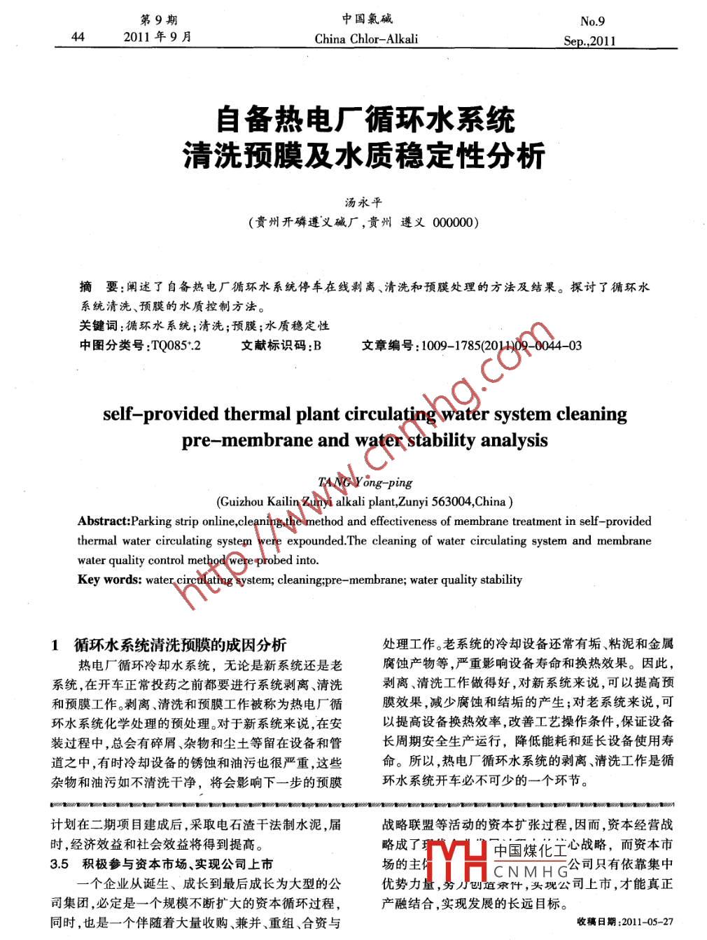 第9期中國氯堿No.9142011年9月China Chlor- - AlkaliSep,2011自備熱電廠循環(huán)水系統(tǒng)清洗預(yù)膜及水質(zhì)穩(wěn)定性分析湯永平(貴州開磷遵義堿廠,貴州遵義00000)摘要:闡述了 自備熱電廠循環(huán)水系統(tǒng)停車在線剝離、清洗和預(yù)膜處理的方法及結(jié)果。探討了循環(huán)水.系統(tǒng)清洗、預(yù)膜的水質(zhì)控制方法。關(guān)鍵詞:循環(huán)水系統(tǒng);清洗;預(yù)膜;水質(zhì)穩(wěn)定性中圖分類號:TQ085+.2文獻(xiàn)標(biāo)識碼:B文章編號: 1009-1785(2011)09 -0044-03self-provided thermal plant circulating water system cleaningpre- -membrane and water stability analysisTANG Yong -ping(Guizhou Kailin Zunyi alkali plant,Zunyi 563004,China )Abstract:Parking strip online,cleaning,the method and effectiveness of membrane treatment in self- providedthermal water circulating system were expounded.The cleaning of water circulating system and membranewater quality control method were probed into.Key words: water circulating system; cleaning;pre-membrane; water quality stability1循環(huán)水 系統(tǒng)清洗預(yù)膜的成因分析處理工作。老系統(tǒng)的冷卻設(shè)備還常有垢、粘泥和金屬熱電廠循環(huán)冷卻水系統(tǒng),無論是新系統(tǒng)還是老腐蝕產(chǎn)物等,嚴(yán)重影響設(shè)備壽命和換熱效果。因此,系統(tǒng),在開車正常投藥之前都要進(jìn)行系統(tǒng)剝離、清洗剝離、清洗工作做得好,對新系統(tǒng)來說,可以提高預(yù)和預(yù)膜工作。剝離、清洗和預(yù)膜工作被稱為熱電廠循膜效果,減少腐蝕和結(jié)垢的產(chǎn)生;對老系統(tǒng)來說,可環(huán)水系統(tǒng)化學(xué)處理的預(yù)處理。對于新系統(tǒng)來說,在安以提高設(shè)備換熱效率,改善工藝操作條件,保證設(shè)備裝過程中,總會有碎屑、雜物和塵土等留在設(shè)備和管長周期安全生產(chǎn)運行,降低能耗和延長設(shè)備使用壽道之中,有時冷卻設(shè)備的銹蝕和油污也很嚴(yán)重,這些命。所以,熱電廠循環(huán)水系統(tǒng)的剝離、清洗工作是循雜物和油污如不清洗干凈,將會影響下一步的預(yù)膜環(huán)水系統(tǒng)開車必不可少的一一個環(huán)節(jié)。計劃在二期項目建成后,采取電石渣干法制水泥,屆戰(zhàn)略聯(lián)盟等活動的資本擴張過程,因而,資本經(jīng)營戰(zhàn)時,經(jīng)濟(jì)效益和社會效益將得到提高。略成了現(xiàn)“1中國煤化工心戰(zhàn)略,而資本市3.5積極參 與資本市場、實現(xiàn)公司上市場的主1H1CNMHG公司只有依靠集中個企業(yè)從誕生、成長到最后成長為大型的公優(yōu)勢力量,分乃刨道汆件,頭現(xiàn)公司上市,才能真正司集團(tuán),必定是-一個規(guī)模不斷擴大的資本循環(huán)過程,產(chǎn)融結(jié)合,實現(xiàn)發(fā)展的長遠(yuǎn)目標(biāo)。同時,也是-一個伴隨著大量收購.兼并、重組、合資與收稿日期:2011-05-27第9期湯永平:自備熱電廠循環(huán)水系統(tǒng)清洗預(yù)膜及水質(zhì)穩(wěn)定性分析4:循環(huán)水系統(tǒng)的預(yù)膜是為了提高緩蝕劑的成膜效的集水池和循環(huán)水泵吸水井底部的污泥,補充水經(jīng)果,常在循環(huán)水開車初期投加較高的緩蝕劑量,待成過過濾處理后注人池中,其目的是要降低剝離、清洗膜后,再降低藥劑濃度維持補膜,即所謂的正常處水質(zhì)的濁度。清洗前,檢測對池中的補充水,水質(zhì)已理。這種預(yù)膜處理的目的是在金屬表面能很快地形達(dá)到清洗預(yù)膜的要求,見表3。成一層保護(hù)膜,提高緩蝕劑抑制腐蝕的效果。表3_清洗前的補充水水質(zhì)2循環(huán)水 系統(tǒng)構(gòu)成簡介項目指標(biāo)實測值COD≤2016遵義堿廠熱電廠建有3萬kW的自備發(fā)電機組,pH值7~97.7其循環(huán)水量為7 500 th,系統(tǒng)保有水量為2 500 m/h,總磷循環(huán)水主要供凝汽器、冷油器和空氣冷卻器冷卻≤1 0003.用水,主要換熱材質(zhì)為銅和碳鋼。電導(dǎo)串754系統(tǒng)參數(shù)配置如表1所示。補充水水質(zhì)分析結(jié)獨度(NTU)7.1果如表2所示。硬度≥100300表1 循環(huán)水系統(tǒng)參數(shù)配置同時,組織有關(guān)部門對開車前需確認(rèn)的設(shè)備、系系統(tǒng)參數(shù)名稱參數(shù)數(shù)值統(tǒng)、電氣、儀表及相關(guān)參數(shù)進(jìn)行確認(rèn),在確保無誤簽循環(huán)水量R/(m'.h*)7 500字確認(rèn)后,整個準(zhǔn)備工作結(jié)束。保有水量V/m?'2 00-3 000(估計值)3.2循環(huán)水系統(tǒng)的剝離、清洗溫差O7/C10自2010年10月31號開始剝離、清洗工作,此濃縮倍數(shù)2.0-3.0(現(xiàn)狀)蒸發(fā)水量E/(m2.h")100(估算值)次使用的清洗劑和預(yù)膜劑含有高效粘泥剝離劑、除補充水量M(m'.h*)167油劑、滲透劑、金屬螯合劑分散劑、除銹劑和高效緩換熱器材質(zhì)銅、碳鋼、不銹鋼蝕阻垢劑。在清洗過程中,循環(huán)水的濁度不斷.上升,旁濾水量/(m2-h-)后趨于平穩(wěn),此過程說明,剝離劑將系統(tǒng)管道及設(shè)備阻垢緩蝕劑加藥設(shè)備自動計量泵加藥中的污泥及沉積物清理出來溶于水中,最終使換熱表2補充水水質(zhì)mg/L設(shè)備及金屬管道露出金屬表面。分析項目補充水濁度從最小上升到最大值,由于旁濾系統(tǒng)的投入,7.35使循環(huán)水質(zhì)不斷得到過濾,從而使得濁度上升到最大總硬度(以CaCO,計)25后逐漸下降。循環(huán)水表面有一-層烏黑的泡沫,這說明其鈣硬度(以CaCO,計)55中的粘泥剝離劑起了作用。至此