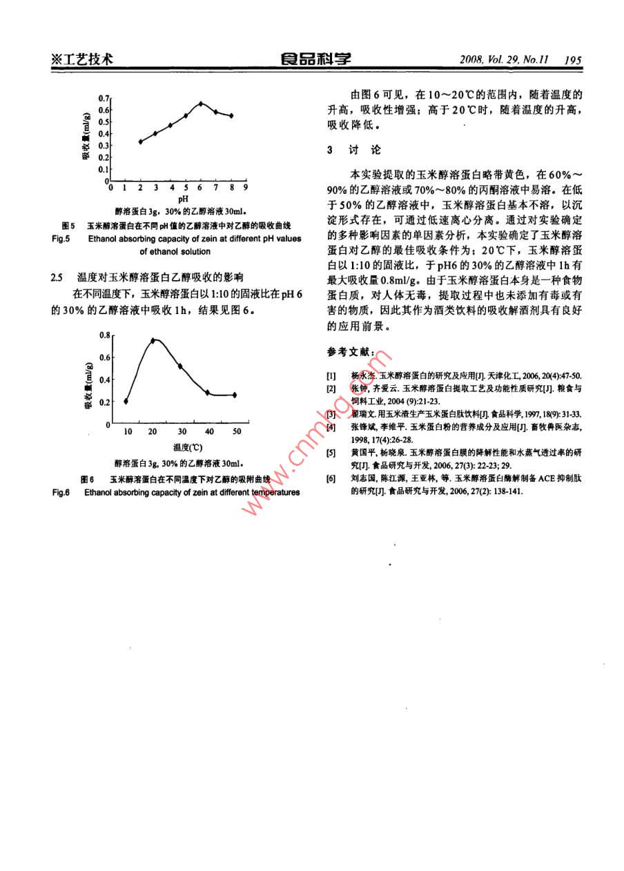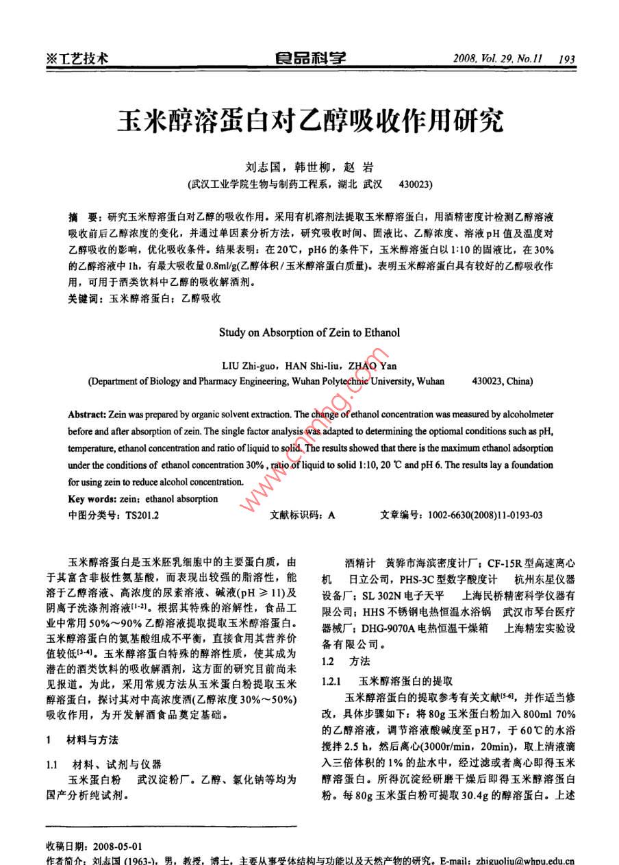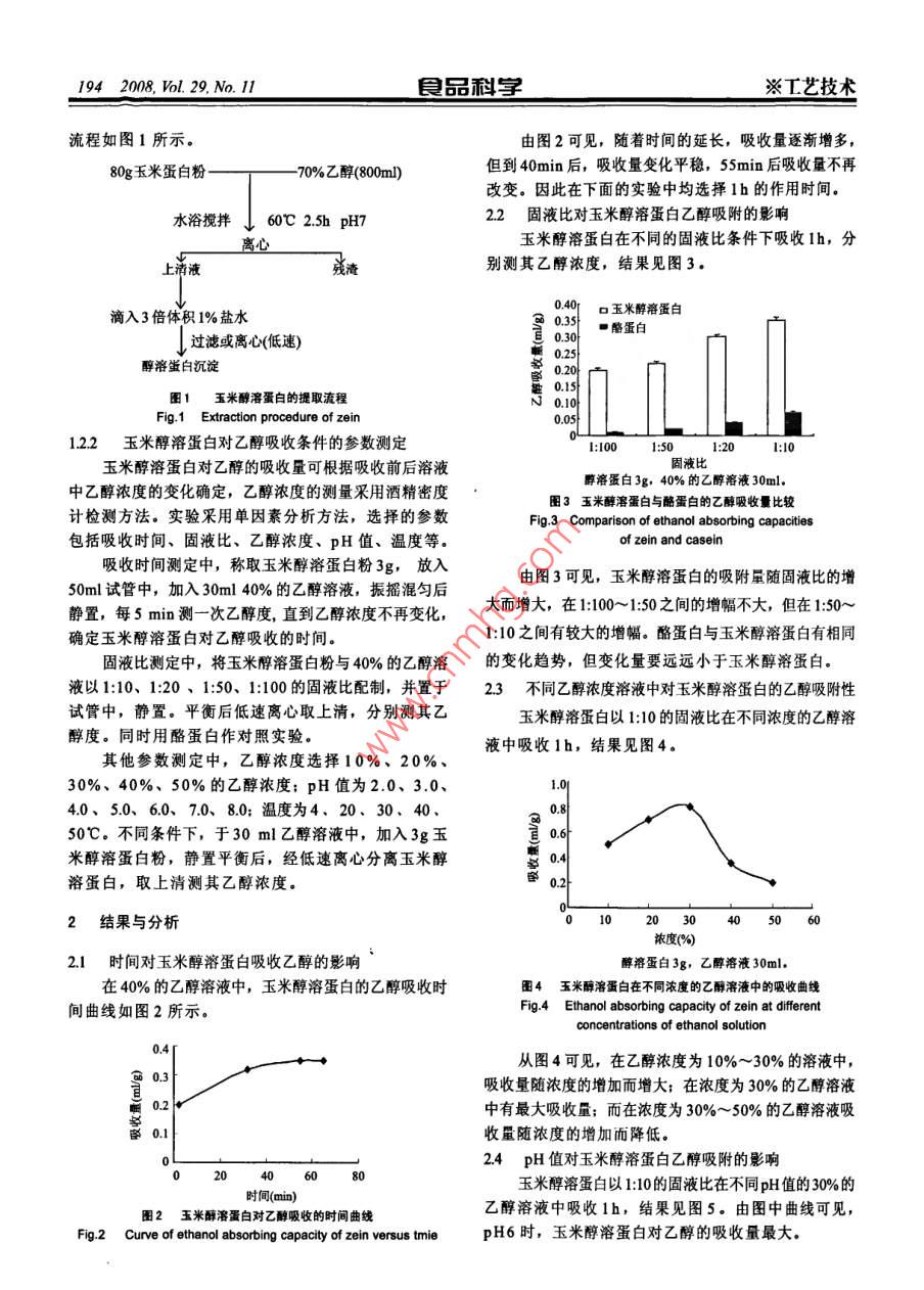 藝技術(shù)自品利2008,l.29,No.ll193玉米醇溶蛋白對乙醇吸收作用研究劉志國,韓世柳,趙巖(武漢工業(yè)學(xué)院生物與制藥工程系,湖北武漢430023)摘要:研究玉米醇溶蛋白對乙醇的吸收作用。采用有機溶劑法提取玉米醇溶蛋白,用酒精密度計檢測乙醇溶液吸收前后乙醇濃度的變化,并通過單因素分析方法,研究吸收時間、固液比、乙醇濃度、溶液pH值及溫度對乙醇吸收的影響,優(yōu)化吸收條件。結(jié)果表明:在20℃,pH6的條件下,玉米醇溶蛋白以1:10的固液比,在30%的乙醇溶液中1h,有最大吸收量0.8mlg(乙醇體積/玉米醇溶蛋白質(zhì)量)。表明玉米醇溶蛋白具有較好的乙醇吸收作用,可用于酒類飲料中乙醇的吸收解酒劑。關(guān)鍵詞:玉米醇溶蛋白;乙醇吸收Study on Absorption of Zein to EthanolLIU Zhi-guo, HAN Shi-liu, ZHAO Yan(Department of Biology and Pharmacy Engineering, wuhan Polytechnic University, Wuhan430023,ChiAbstract: Zein was prepared by organic solvent extraction. The change of ethanol concentration was measured by alcoholmeterbefore and after absorption of zein. The single factor analysis was adapted to determining the optiomal conditions such as pH,temperature, ethanol concentration and ratio of liquid to solid. The results showed that there is the maximum ethanol adsorptionunder the conditions of ethanol concentration 30%, ratio of liquid to solid 1: 10, 20 C and pH 6. The results lay a foundationfor using zein to reduce alcohol concentration.Key words: zein: ethanol absorption中圖分類號:TS2012文獻標識碼:A文章編號:1002-6630(2008)11019303玉米醇溶蛋白是玉米胚乳細胞中的主要蛋白質(zhì),由酒精計黃驊市海濱密度計廠;CF-15R型高速離心于其富含非極性氨基酸,而表現(xiàn)出較強的脂溶性,能機日立公司,PHS-3C型數(shù)字酸度計杭州東星儀器溶于乙醇溶液、高濃度的尿素溶液、堿液(pH≥11)及設(shè)備廠;S302N電子天平上海民橋精密科學(xué)儀器有陰離子洗滌劑溶液2,根據(jù)其特殊的溶解性,食品工限公司;HHS不銹鋼電熱恒溫水浴鍋武漢市琴臺醫(yī)療業(yè)中常用50%~90%乙群溶液提取提取玉米醇溶蛋白。器械廠;DHG9070A電熱恒溫干燥箱上海精宏實驗設(shè)潛在的酒類飲料的吸收解酒劑這方面的研究目前尚未12玉米醇溶蛋白的氨基酸組成不平衡,直接食用其營養(yǎng)價備有限公司見報道。為此,采用常規(guī)方法從玉米蛋白粉提取玉米12l玉米醇溶蛋白的提取醇溶蛋白,探討其對中高濃度酒(乙醇濃度30%~50%)玉米醇溶蛋白的提取參考有關(guān)文獻56,并作適當修吸收作用,為開發(fā)解酒食品奠定基礎(chǔ)。改,具體步驟如下:將80g玉米蛋白粉加入800ml70%的乙醇溶液,調(diào)節(jié)溶液酸堿度至pH7,于60℃的水浴材料與方法攪拌25h,然后離心(3000r/min,20min),取上清液滴11材料、試劑與儀器入三倍體積的1%的鹽水中,經(jīng)過濾或者離心即得玉米玉米蛋白粉武漢淀粉廠。乙醇、氯化鈉等均為醇溶蛋白。所得沉淀經(jīng)研磨干燥后即得玉米醇溶蛋白國產(chǎn)分析純試劑粉。每80g玉米蛋白粉可提取304g的醇溶蛋白。上述收稿日期:2008-05-01942008l.29.No.ll品利字※工藝技術(shù)流程如圖1所示。由圖2可見,隨著時間的延長,吸收量逐漸增多,80g玉米蛋白粉70%乙醇(800m但到40min后,吸收量變化平穩(wěn),55min后吸收量不再改變。因此在下面的實驗中均選擇1h的作用時間水浴攪拌J60℃25hpH722固液比對玉米醇溶蛋白乙醇吸附的影響離心玉米醇溶蛋白在不同的固液比條件下吸收1h,分上清液別測其乙醇濃度,結(jié)果見圖3。滴入3倍體積1%鹽水040玉米醇溶蛋白酪蛋白過濾或離心低速)0.25醇溶蛋白沉淀圖1玉米酵溶蛋白的提取流程Fig 1 Extraction procedure of zein122玉米醇溶蛋白對乙醇吸收條件的參數(shù)測定l:I00l:0玉米醇溶蛋白對乙醇的吸收量可根據(jù)吸收前后溶液固液比中乙醇濃度的變化確定,乙醇濃度的測量采用酒精密度醇溶蛋白3g,40%的乙醇溶液30ml,圖3玉米醇溶蛋白與酪蛋白的乙醇吸收量比較計檢測方法。實驗采用單因素分析方法,選擇的參數(shù)Fig 3 Comparison of ethanol absorbing capacities包括吸收時間、固液比、乙醇濃度、pH值、溫度等。of zein and casein收時間測定中,稱取玉米醇溶蛋白粉3g,放入50m1試管中,加入30ml40%的乙醇溶液,振搖混勻后由圖3可見,玉米醇溶蛋白的吸附量隨固液比的增靜置,每5min測一次乙醇度,直到乙醇濃度不再變化,大而增大,在1:100~1:50之間的增幅不大,但在1:50確定玉米醇溶蛋白對乙醇吸收的時間。1:10之間有較大的增幅。酪蛋白與玉米醇溶蛋白有相同固液比測定中,將玉米醇溶蛋白粉與40%的乙醇溶的變化趨勢,但變化量要遠遠小于玉米醇溶蛋白。液以1:10、1:20、1:50、1:100的固液比配制,并置于23不同乙醇濃度溶液中對玉米醇溶蛋白的乙醇吸附性試管中,靜置。平衡后低速離心取上清,分別測其乙玉米醇溶蛋白以110的固液比在不同濃度的乙醇溶醇度。同時用酪蛋白作對照實驗。液中吸收1h,結(jié)果見圖4。其他參數(shù)測定中,乙醇濃度選擇10%、20%30%、40%50%的乙醇濃度;pH值為2.0、3.0、40、50、60、7.0、80;溫度為4、20、30、4050℃。不同條件下,于30m乙醇溶液中,加入3g玉米醇溶蛋白粉,靜置平衡后,經(jīng)低速離心分離玉米醇溶蛋白,取上清測其乙醇濃度。2結(jié)果與分析濃度(%)21時間對玉米醇溶蛋白吸收乙醇的影響醇溶蛋白3g,乙醇溶液30ml,在40%的乙醇溶液中,玉米醇溶蛋白的乙醇吸收時圖4玉米醇溶蛋白在不同濃度的乙醇溶液中的吸收曲線間曲線如圖2所