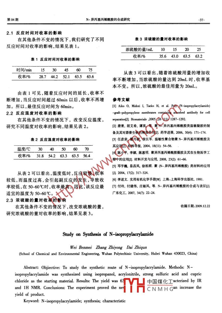 化工中間體Chemical Intermed2010年第04期科研開發(fā)N-異丙基丙烯酰胺的合成研究未本奠張智勇散志群武漢工業(yè)學(xué)院化學(xué)與環(huán)境工程學(xué)院湖北武漢430023)摘要:目的,研究N異丙基丙烯酰胺的合成路線。方法,以異丙醇丙烯腈、濃硫酸氯化銅為原料合成了N-異丙基丙烯酰胺。結(jié)果:合成了目標(biāo)化合物收率635%,并通過紅外光譜核磁共振對(duì)產(chǎn)品進(jìn)行了表征。結(jié)論,降低了成本提高了N-異丙基丙烯酰胺的收關(guān)鍵詞:N-異丙基丙烯酰胺;合成;表征中圖分類號(hào):TQ2263文獻(xiàn)標(biāo)識(shí)碼:A文章編號(hào):1672-8114(2010)04-0036021實(shí)驗(yàn)部分聚N-異丙基丙烯酰胺是一種重要的化工中1.1試劑與儀器間體,其在藥物釋放2、酶的固定生化物質(zhì)分異丙醇、丙烯腈、濃硫酸、氯化銅、氨水、乙離叫、免疫分析等領(lǐng)域應(yīng)用廣泛。而N-異丙基丙醚、正己烷等均為分析純。烯酰胺是制備聚N-異丙基丙烯酰胺的最主要原DF-101B集熱式恒溫加熱磁力攪拌器(鞏義料,因此,研究N-異丙基丙烯酰胺的合成就具有市英峪予華儀器廠);X-4數(shù)字顯示顯微熔點(diǎn)測定非常重要的意義。儀(北京泰克儀器有限公司);IR-330型傅里葉變目前,N-異丙基丙烯酰胺的合成主要有以換紅外光譜儀(美國 Nicolet公司); Mercury-330核下幾種方法:(1)不飽和酸與胺反應(yīng)或不飽和酰氯磁共振儀(美國vaan公司)。與胺反應(yīng);(2) Beckmann重排或 Chemist重排;(3)不12N-異丙基丙烯酰胺的合成飽和酰胺N上的烷基化;(4)烯腈或烯胺烷基化再在250mL三口燒瓶中加入20m198%(0.3部分水解6。方法(1)要求較多的反應(yīng)溫度,反應(yīng)mol)濃硫酸,攪拌下滴加15mL(0.2mol)異丙醇,利能耗大,(2)容易產(chǎn)生兩種N-取代酰胺,副產(chǎn)物較用稀釋反應(yīng)熱使反應(yīng)體系升溫至50-60℃。然后多,(3)分離較為復(fù)雜,而(4操作簡單、原料易得,加入1%二水合氯化銅,再緩慢滴加13mL(0.2是一種具有工業(yè)化應(yīng)用前景的方法。我們?cè)诜椒╩o丙烯腈,保持溫度在50-60℃。滴加完畢,在(4)的基礎(chǔ)上對(duì)工藝進(jìn)行了改進(jìn),收率提高了9%。60~-70℃反應(yīng)1小時(shí)。反應(yīng)完畢,冷至室溫,反應(yīng)液具體合成路線如下:用氨水中和至pH=2-3,再用乙醚萃取(15mLX3),有機(jī)層用無水硫酸鎂干燥過夜,蒸干溶劑,殘留液用正己烷重結(jié)晶,得白色針狀晶體,收率CH2=CH心N+CH3CHCH363.5%。1.3產(chǎn)品表征H2SO4, CuCICH2=CH-C-NH-CH3H316m.p61-63℃。IR(KBr)m2:32942(-H),VI1?1中國煤化15504(CN),1367.2(異00MHz,D20)CNMHG作者簡介:未本美(1977-),男,湖北江陵人,講師,研究方,-y,-1-,1H),6.01(m,2H)。向:有機(jī)合成通訊聯(lián)系人2結(jié)果與討論第04期N-異丙基丙烯酰胺的合成研究2.1反應(yīng)時(shí)間對(duì)收率的影響在其他條件不變的情況下,我們研究了不同表3濃硫酸的量對(duì)收率的影響反應(yīng)時(shí)間對(duì)收率的影響,結(jié)果見表1。濃硫酸的量/mL10152025收率/%35.643063.563.2表1反應(yīng)時(shí)間對(duì)收率的影響時(shí)間/mn1530456075從表3可以看出,隨著濃硫酸用量的增加收收率/%28744.252.1635636率不斷增加,當(dāng)濃硫酸的量達(dá)到20mL時(shí),收率基本不變。所以,濃硫酸的最佳用量為20mL。由表1可見,隨著反應(yīng)時(shí)間的延長,收率不斷增加,當(dāng)反應(yīng)時(shí)間超過60min以后,收率不再增參考文獻(xiàn)加。所以,最佳反應(yīng)時(shí)間為60min[I] Aiko 0, Midori L, Taeko H, et al. Poly(N-isopropylacrylamide)22反應(yīng)溫度對(duì)收率的影響-graft-polypropylene membranes containing adsorbed antibody for cell在其他條件不變的情況下,改變反應(yīng)溫度, separation[J]. Biomaterials20026(1l1287-1292研究不同溫度對(duì)收率的影響,結(jié)果見表2。2]唐青,胡艾希,譚英,等.聚N-異丙基內(nèi)烯酰胺類溫敏凝膠的制備及其對(duì)萘普生鈉的釋放作用門藥學(xué)進(jìn)展,2006,30(4k171-174表2反應(yīng)溫度對(duì)收率的影響3]任彥榮,霍丹群,侯長軍.溫敏性聚合物聚N-異丙基丙烯酰胺及溫度℃3040506070其應(yīng)用門材料導(dǎo)報(bào),2004,18(11:54-56.收率/%31854263363.55644]陳小平,李娜陳惠明.聚異丙基丙烯酰胺凝膠及其在生物醫(yī)學(xué)工程中的應(yīng)用U材料開發(fā)與應(yīng)用,2008,23(2:61-665]鄧字巍,易昌風(fēng)徐相順.聚(N-異丙基丙烯酰胺)類材料的應(yīng)用從表2可以看出,溫度低時(shí),反應(yīng)較慢,收率204.12)317-324.較低,而溫度過高,會(huì)引起副反應(yīng)的發(fā)生,導(dǎo)致收6李述文實(shí)用有機(jī)化學(xué)手冊(cè)M上海:上海科學(xué)出版社,1981率較低,在5060℃時(shí),收率最高。因此,該反應(yīng)最7]付玲,付建偉,莊銀風(fēng),等N-異內(nèi)基內(nèi)烯酰胺的合成與表征U適宜的溫度為50-60℃。廣東化工,2007,347:22-242.3濃硫酸的量對(duì)收率的影響在其他條件不變的情況下,改變濃硫酸的量,收稿日期:2009.1222研究濃硫酸的量對(duì)收率的影響,結(jié)果見表3Study on Synthesis of N-isopropylacrylamideBenmei Zhang Zhi(School of Chemical and Environmental Engineering, Wuhan Polytechinic University, Hubei Wuhan 430023, China)Abstract: Objiective: To study the synthetic route of N-isopropylacrylamide. Methods: Nisopropylacrylamide was synthesized using isopropanol, acrylonitrile, strong sulfuric acid and cupricchloride as the starting material. Results: The yield was 63YH中國煤化工 acterized by IRand 1H NMR. Conclusions: The experiment proved the nerCNMH Gan i