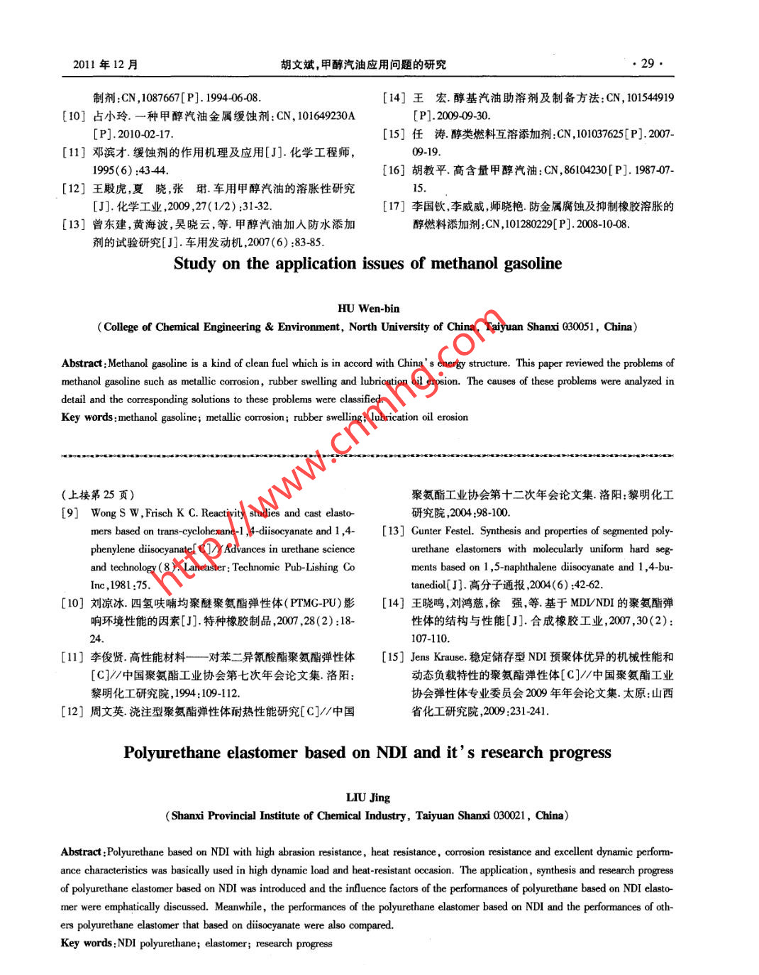 第31卷第6期山西化工Vol.31 No. 62011年12月SHANXI CHEMICAL INDUSTRYDec.2011綜述與論壇甲醇汽油應(yīng)用問題的研究胡文斌(中北大學(xué)化工與環(huán)境學(xué)院,山西太原030051)摘要:甲醇汽油是一種符合我國能源結(jié)構(gòu)的清潔燃料。綜述了甲醇汽油中存在的金屬腐蝕、橡膠溶脹侵蝕潤滑油等問題,分析了產(chǎn)生的原因,分類總結(jié)了相應(yīng)的解決方法。關(guān)鍵詞:甲醇汽油;金屬腐蝕;橡膠溶脹;潤滑油侵蝕中圖分類號:TQ517.4文獻(xiàn)標(biāo)識碼:A 文章編號 :1004-7050(2011 )06-0026-04動機(jī)汽缸壁的銅、鐵、鋁、鋅等金屬部件表面均具有引言腐蝕作用。甲醇汽油造成金屬腐蝕的主要原因有以煤炭為原料生產(chǎn)的甲醇,具有高辛烷值2個方面:1)甲醇在生產(chǎn)、儲運及燃燒過程中生成(MON106, RON112)、高含氧量(氧質(zhì)量分?jǐn)?shù)的甲 醛、甲酸以及汽油中含有的硫?qū)饘俦砻嬖斐?0%)、不含硫等污染物質(zhì)、熱值是汽油的45%、產(chǎn)- -定的酸腐蝕。當(dāng)甲醇汽油中含有水時,在電離作量充足等特點[1.21,可以與汽油以一-定比例混合后用下加劇了金屬的酸腐蝕,并且引發(fā)了其他腐蝕行作為甲醇汽油使用。但是,甲醇所具有的物化性質(zhì)為。2)由于甲醇?xì)饣瘽摕岽?甲醇汽油氣化不充分使各種比例的甲醇汽油在實際使用中均面臨金屬腐時,未氣化的甲醇汽油會沖刷汽缸壁潤滑油層,造成蝕、橡膠溶脹、發(fā)動機(jī)潤滑油侵蝕變質(zhì)等問題,從而汽缸壁 部分金屬表面完全暴露,甲醇以及燃燒后產(chǎn)對甲醇汽油的使用造成了不容忽視的影響。多年生的甲醛、甲酸就會腐蝕汽缸壁的金屬表面13.4]。來,經(jīng)過研究人員的不斷努力,以上問題通過更換部據(jù)相關(guān)研究報道,不同比例的甲醇汽油對銅、件材料與添加相應(yīng)的助劑得到了緩解。目前,低比鐵、鋅、鋁等金屬都具有腐蝕性,并且甲醇含量越高例甲醇汽油已在山西、陜西等省得到大范圍使用,高腐蝕越嚴(yán)重。目前,抑制甲醇汽油金屬腐蝕的主要比例甲醇汽油的相關(guān)標(biāo)準(zhǔn)也已出臺,顯示出甲醇汽方法包括更換耐腐蝕的金屬材料和向甲 醇汽油中添油良好的發(fā)展前景。加腐蝕抑制劑2種。相比較而言,前者成本高,且只本文主要對甲醇汽油中普遍存在的金屬腐蝕、適用于新制造容器、發(fā)動機(jī)等設(shè)備,無法解決現(xiàn)有容橡膠溶脹、發(fā)動機(jī)潤滑油侵蝕變質(zhì)等問題的研究進(jìn)器、發(fā)動機(jī)的腐蝕問題;后者則更簡便,成本低,效展情況進(jìn)行了論述。果好”。1.2 緩蝕機(jī)理及方法1金屬腐蝕目前,甲醇汽油所添加的腐蝕抑制劑中含有的1.1 腐蝕原因化合物一般由極性基團(tuán)和非極性基團(tuán)組成。極性基甲醇汽油對燃料儲運設(shè)備車輛供油系統(tǒng)及發(fā)團(tuán)可以吸附在金屬表面的活性點,在金屬表面形成一層保護(hù)膜;非極性基團(tuán)- -側(cè)處于保護(hù)膜外部,可以隔離甲醇、甲酸、水等物質(zhì)對金屬的腐蝕。腐蝕抑制收稿日期:2011-08-22作者簡介:胡文斌,男,1982年出生,中北大學(xué)在讀碩士研究生。研劑的關(guān)鍵是保護(hù)膜與金屬表面結(jié)合強(qiáng)度的大小。如究方向:甲醇汽油。果結(jié)合力小,則容易脫落,失去防腐作用。而不同的.2011年12月.胡文斌,甲醇汽油應(yīng)用問題的研究.27.金屬對于不同化合物的結(jié)合力不同,因此需要將不的腐蝕抑制劑。除此以外,研究者還提供了同時具同的化合物進(jìn)行復(fù)配,以適用不同的金屬。目前使有緩蝕功能和其他功能的腐蝕抑制劑配方。例如,用的腐蝕抑制劑主要是由不同化合物按照一-定要求在專利CN10164923010]中就公開了成分為脂肪酸、復(fù)配后制備出的適用于甲醇汽油的混合物。防銹劑、烯基酯或醚、非離子表面活性劑的甲醇汽油郭四虎與吳耀曲3]制備了不同的腐蝕抑制劑,腐蝕抑制劑。這種腐蝕抑制劑不但對銅、鋁、45#鋼、并且在M15甲醇汽油中進(jìn)行了防腐蝕實驗,結(jié)果如鋅和氣化器材質(zhì)等多種金屬具有優(yōu)良緩蝕性能,而表1所示。其中,由糖類與多元有機(jī)酸合成的化合且具有助溶作用,不會破壞甲醇汽油的酸堿平衡。物和氮雜環(huán)類復(fù)配而成的H-G腐蝕抑制劑具有較以上所述甲醇汽油腐蝕抑制劑多為含有羥基等好的緩蝕效果。組分分子中的極性基團(tuán)能夠吸附在極性基團(tuán)的化合物、含氮類化合物以及屏蔽酚類。銅、鋁表面,非極性基團(tuán)在金屬表面形成保護(hù)膜,起這是因為,這些化合物分子中含有的羥基等極性基到了阻止電化學(xué)腐蝕和減弱硫等酸性物質(zhì)的酸腐蝕團(tuán)可以吸附在金屬表面形成保護(hù)膜;而含有未配對作用。而且,腐蝕抑制劑組分分子中的部分官能團(tuán)電子的氮原子能與金屬形成配位鍵“",從而形成一能與鐵等金屬形成絡(luò)合物,在鋼鐵表面形成致密保層阻擋腐蝕物質(zhì)的保護(hù)膜;屏蔽酚類起到的主要作護(hù)膜,阻止對鋼鐵金屬表面的腐蝕。在李圣勇與李用是減少空氣對甲醇與金屬的氧化,避免空氣對金圣濤的銅腐蝕實驗中,以苯并唑與吡唑酮2種氮雜屬腐蝕的影響。因此,甲醇汽油腐蝕抑制劑組成- -般環(huán)化合物進(jìn)行復(fù)配制備腐蝕抑制劑,并在不同比例包括酸類醇類、酯類胺類氮雜環(huán)類與屏蔽酚類。的甲醇汽油中添加不同比例的腐