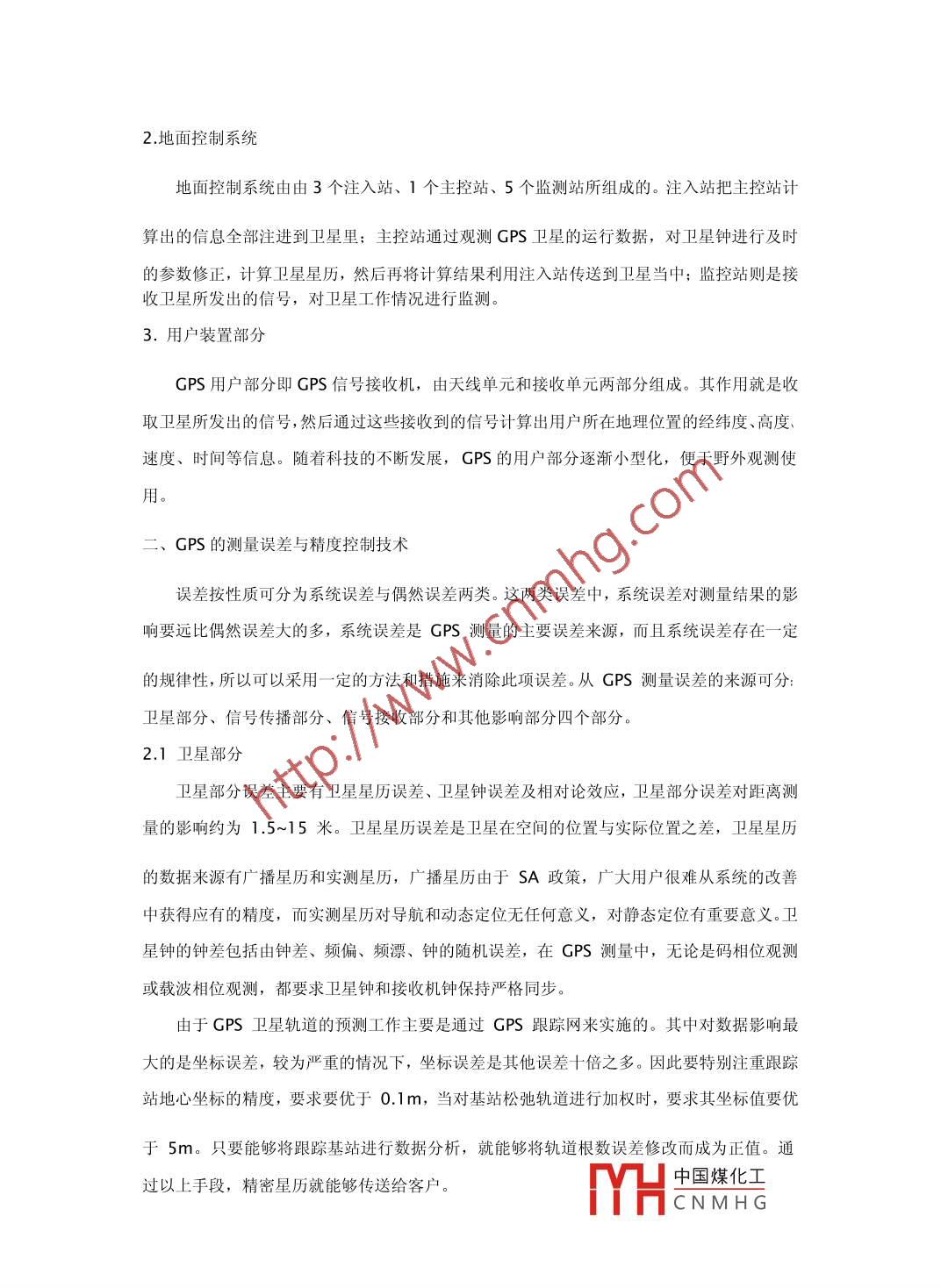GPS測(cè)量的誤差分析邢寶奇遼寧省冶金地質(zhì)勘查局四O- -隊(duì)114005[摘要] GPS具有測(cè)量時(shí)間短、精度高、全球、全天候等諸多優(yōu)點(diǎn),在社會(huì)各個(gè)領(lǐng)域都得到了廣泛的應(yīng)用。但是由于各種各樣的因素,導(dǎo)致GPS系統(tǒng)在測(cè)量過(guò)程中有一定程度上的不穩(wěn)定,從而導(dǎo)致了各種誤差。本文分析了GPS定位系統(tǒng)的組成部分,對(duì)其誤差來(lái)源做出了分析,并對(duì)相應(yīng)的精度控制技術(shù)進(jìn)行了簡(jiǎn)單介紹。[關(guān)鍵字] GPS測(cè)量測(cè)量誤差精度控制技術(shù)中圖分類號(hào): 0433文獻(xiàn)標(biāo)識(shí)碼: A全球定位系統(tǒng)(GPS) 因?yàn)闇y(cè)量時(shí)間短、測(cè)量精度高、觀測(cè)站之間無(wú)需通視,可提供三維坐標(biāo),測(cè)量過(guò)程具有全球性、全天候性、連續(xù)性和實(shí)時(shí)性等優(yōu)點(diǎn),在全球范圍內(nèi)的各個(gè)領(lǐng)域都得到了廣泛的運(yùn)用。任何先進(jìn)技術(shù)都不可避免的有些不盡人意或者有待改善的不足,GPS也不例外,具體表現(xiàn)在實(shí)際測(cè)量過(guò)程中有- -定程度上的不穩(wěn)定,經(jīng)常由于- -種或者幾種因素導(dǎo)致測(cè)量結(jié)果出現(xiàn)誤差。為了改進(jìn)GPS的上述缺點(diǎn),本文對(duì)GPS測(cè)量中的誤差以及誤差精度控制技術(shù)進(jìn)行分析。GPS定位系統(tǒng)的組成部分GPS定位系統(tǒng)是基于全球24顆定位人造衛(wèi)星,向全球各個(gè)地方全天候地提供三維位置、三維速度信息的一一種無(wú)線電導(dǎo)航定位系統(tǒng)。它由空間衛(wèi)星群、地面控制系統(tǒng)以及用戶裝置部分組成,民用的定位精度可達(dá)10米內(nèi)。1.空間衛(wèi)星群GPS的空間衛(wèi)星群由24顆衛(wèi)星(21 顆工作衛(wèi)星: 3顆備用衛(wèi)星)組成,衛(wèi)星分布在.六個(gè)距地表20200 km的特定軌道上,每個(gè)軌道上有4顆衛(wèi)星,各軌道面之間的交角60軌道傾角55°,衛(wèi)星軌道運(yùn)行的周期11 h 58 min,衛(wèi)星的分部保證了在全球任何地點(diǎn)、時(shí)間、地平線能夠至少接收到4顆衛(wèi)星的信號(hào)。中國(guó)煤化工MHCNMH G2.地面控制系統(tǒng)地面控制系統(tǒng)由由3個(gè)注入站、1個(gè)主控站、5個(gè)監(jiān)測(cè)站所組成的。注入站把主控站計(jì)算出的信息全部注進(jìn)到衛(wèi)星里;主控站通過(guò)觀測(cè)GPS衛(wèi)星的運(yùn)行數(shù)據(jù),對(duì)衛(wèi)星鐘進(jìn)行及時(shí)的參數(shù)修正,計(jì)算衛(wèi)星星歷,然后再將計(jì)算結(jié)果利用注入站傳送到衛(wèi)星當(dāng)中;監(jiān)控站則是接收衛(wèi)星所發(fā)出的信號(hào),對(duì)衛(wèi)星工作情況進(jìn)行監(jiān)測(cè)。3.用戶裝置部分GPS用戶部分即GPS信號(hào)接收機(jī),由天線單元和接收單元兩部分組成。其作用就是收取衛(wèi)星所發(fā)出的信號(hào),然后通過(guò)這些接收到的信號(hào)計(jì)算出用戶所在地理位置的經(jīng)緯度、高度、速度、時(shí)間等信息。隨著科技的不斷發(fā)展,GPS 的用戶部分逐漸小型化,便于野外觀測(cè)使用。二、GPS的測(cè)量誤差與精度控制技術(shù)誤差按性質(zhì)可分為系統(tǒng)誤差與偶然誤差兩類。這兩類誤差中,系統(tǒng)誤差對(duì)測(cè)量結(jié)果的影響要遠(yuǎn)比偶然誤差大的多,系統(tǒng)誤差是GPS測(cè)量的主要誤差來(lái)源,而且系統(tǒng)誤差存在一定的規(guī)律性,所以可以采用- -定的方法和措施來(lái)消除此項(xiàng)誤差。從GPS測(cè)量誤差的來(lái)源可分:衛(wèi)星部分、信號(hào)傳播部分、信號(hào)接收部分和其他影響部分四個(gè)部分。2.1 衛(wèi)星部分衛(wèi)星部分誤差主要有衛(wèi)星星歷誤差、衛(wèi)星鐘誤差及相對(duì)論效應(yīng),衛(wèi)星部分誤差對(duì)距離測(cè)量的影響約為1.5~15 米。衛(wèi)星星歷誤差是衛(wèi)星在空間的位置與實(shí)際位置之差,衛(wèi)星星歷的數(shù)據(jù)來(lái)源有廣播星歷和實(shí)測(cè)星歷,廣播星歷由于SA政策,廣大用戶很難從系統(tǒng)的改善中獲得應(yīng)有的精度,而實(shí)測(cè)星歷對(duì)導(dǎo)航和動(dòng)態(tài)定位無(wú)任何意義,對(duì)靜態(tài)定位有重要意義。衛(wèi)星鐘的鐘差包括由鐘差、頻偏、頻漂、鐘的隨機(jī)誤差,在GPS測(cè)量中,無(wú)論是碼相位觀測(cè)或載波相位觀測(cè),都要求衛(wèi)星鐘和接收機(jī)鐘保持嚴(yán)格同步。由于GPS衛(wèi)星軌道的預(yù)測(cè)工作主要是通過(guò)GPS跟蹤網(wǎng)來(lái)實(shí)施的。其中對(duì)數(shù)據(jù)影響最大的是坐標(biāo)誤差,較為嚴(yán)重的情況下,坐標(biāo)誤差是其他誤差十倍之多。因此要特別注重跟蹤站地心坐標(biāo)的精度,要求要優(yōu)于0.1m,當(dāng)對(duì)基站松他軌道進(jìn)行加權(quán)時(shí),要求其坐標(biāo)值要優(yōu)于5m。只要能夠?qū)⒏櫥具M(jìn)行數(shù)據(jù)分析,就能夠?qū)④壍栏鶖?shù)誤差修改而成為正值。通中國(guó)煤化工過(guò)以上手段,精密星歷就能夠傳送給客戶。YHCNMH G2.2信號(hào)傳播部分.信號(hào)傳播部分的誤差有電離層折射誤差、多路徑效應(yīng)誤差以及對(duì)流層折射誤差,這些誤差對(duì)距離測(cè)量的影響為1.5~15 米,電離層折射誤差是由于GPS信號(hào)在通過(guò)電離層時(shí),信號(hào)的路徑發(fā)生