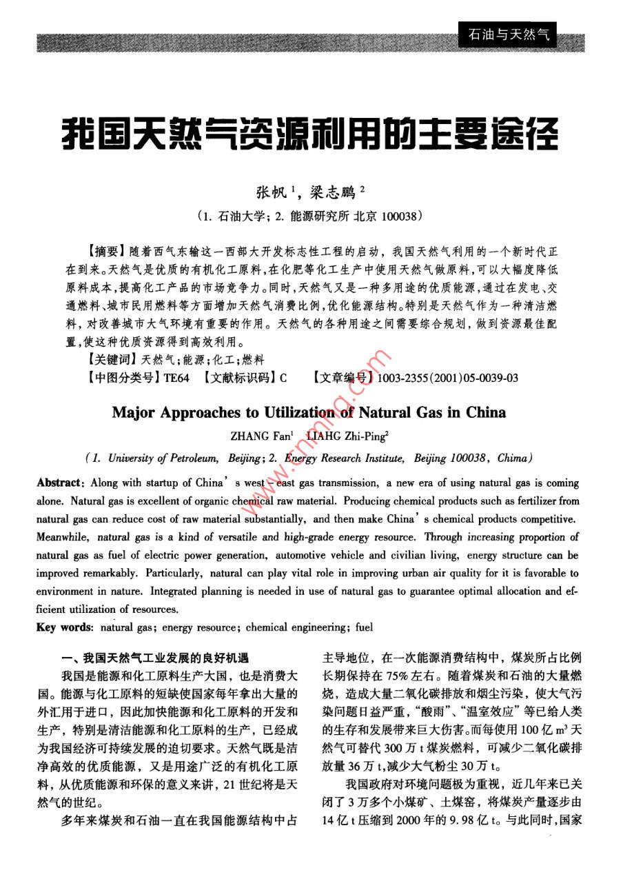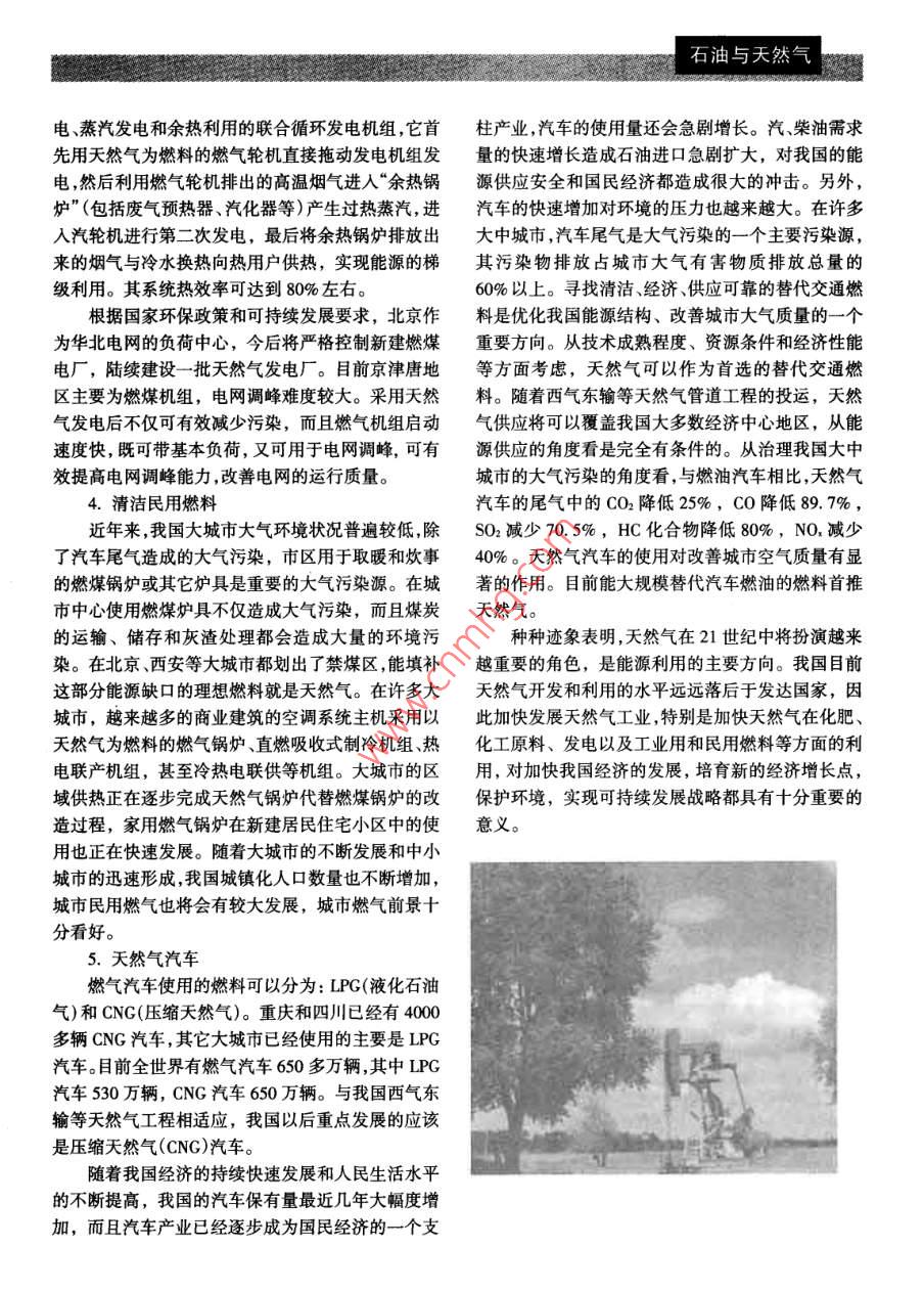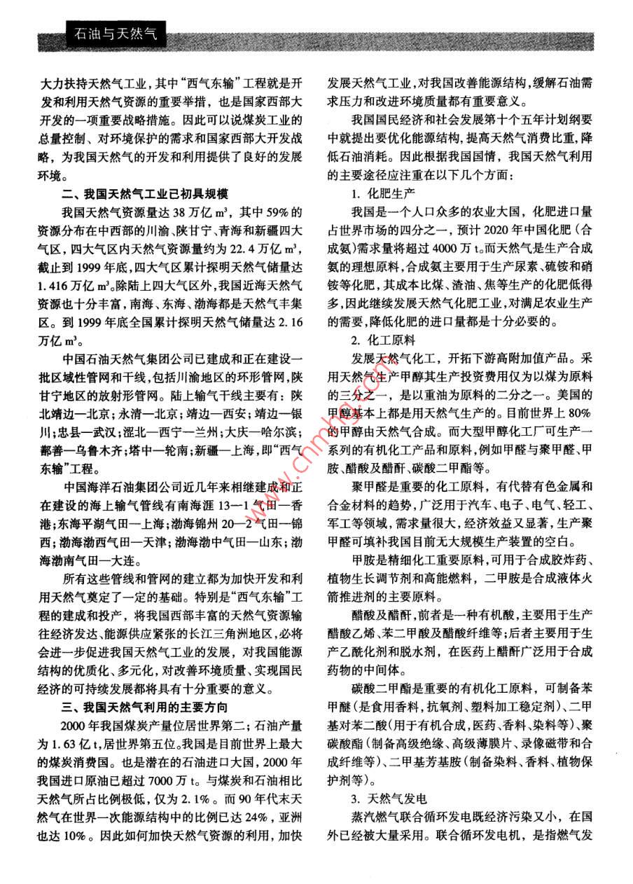 石油與天然氣我國(guó)天然氣資源利用的主要途徑張帆',梁志鵬2(1.石油大學(xué); 2.能源研究所北京100038)[摘要]隨著西氣東輸這一西部大開發(fā)標(biāo)志性工程的啟動(dòng),我國(guó)天然氣利用的一個(gè)新時(shí)代正在到來。天然氣是優(yōu)質(zhì)的有機(jī)化工原料,在化肥等化工生產(chǎn)中使用天然氣做原料,可以大幅度降低.原料成本,提高化工產(chǎn)品的市場(chǎng)競(jìng)爭(zhēng)力。同時(shí),天然氣又是一種多用途的優(yōu)質(zhì)能源,通過在發(fā)電、交.通燃料、城市民用燃料等方面增加天然氣消費(fèi)比例,優(yōu)化能源結(jié)構(gòu)。特別是天然氣作為一種清潔燃料,對(duì)改善城市大氣環(huán)境有重要的作用。天然氣的各種用途之間需要綜合規(guī)劃,做到資源最佳配置,使這種優(yōu)質(zhì)資源得到高效利用。[關(guān)鍵詞]天然氣;能源;化工;燃料[中圖分類號(hào)] TE64 [文獻(xiàn)標(biāo)識(shí)碼] C[文章編號(hào)] 1003-2355(2001 )05-0039-03Major Approaches to Utilization of Natural Gas in ChinaZHANG Fan' AHG Zhi-Ping2( I. University of Petroleum, Bejing; 2. Energy Research Institute, Bejing 100038, Chima)Abstract: Along with startup of China’s west - east gas transmission, a new era of using natural gas is comingalone. Natural gas is excellent of organic chemical raw material. Producing chemical products such as ferilizer fromnatural gas can reduce cost of raw material substantially, and then make China’s chemical products competitive.Meanwhile, natural gas is a kind of versatile and high grade energy resource. Through increasing proportion ofnatural gas as fuel of electric power generation, automotive vehicle and cilian living, energy structure can beimproved remarkably. Particularly, natural can play vital role in improving urban air quality for it is favorable toenvironment in nature. Integrated planning is needed in use of natural gas to guarantee optimal allocation and ef-ficient utilization of resources.Key words: natural gas; energy resource; chemical engineering; fuel一、我國(guó)天然氣工業(yè)發(fā)展的良好機(jī)遇主導(dǎo)地位,在一次能源消費(fèi)結(jié)構(gòu)中,煤炭所占比例我國(guó)是能源和化工原料生產(chǎn)大國(guó),也是消費(fèi)大長(zhǎng)期保持在75%左右。隨著煤炭和石油的大量燃國(guó)。能源與化工原料的短缺使國(guó)家每年拿出大量的燒,造成大量二氧化碳排放和煙塵污染,使大氣污外匯用于進(jìn)口,因此加快能源和化工原料的開發(fā)和染問題日益嚴(yán)重,“酸雨”、“溫室效應(yīng)”等已給人類生產(chǎn),特別是清潔能源和化工原料的生產(chǎn),已經(jīng)成的生存和發(fā)展帶來巨大傷害。而每使用100億m2天為我國(guó)經(jīng)濟(jì)可持續(xù)發(fā)展的迫切要求。天然氣既是潔然氣可替代300萬t煤炭燃料,可減少二氧化碳排凈高效的優(yōu)質(zhì)能源,又是用途廣泛的有機(jī)化工原放量36萬t,減少大氣粉塵30萬to料,從優(yōu)質(zhì)能源和環(huán)保的意義來講, 21世紀(jì)將是天我國(guó)政府對(duì)環(huán)境問題極為重視,近幾年來已關(guān)然氣的世紀(jì)。閉了3萬多個(gè)小煤礦、土煤窯,將煤炭產(chǎn)量逐步由多年來煤炭和石油一直在我國(guó)能源結(jié)構(gòu)中占14億t壓縮到2000年的9.98億t。與此同時(shí),國(guó)家石油與天然氣大力扶持天然氣工業(yè),其中“西氣東輸”工程就是開發(fā)展天然氣工業(yè),對(duì)我國(guó)改善能源結(jié)構(gòu),緩解石油需發(fā)和利用天然氣資源的重要舉措,也是國(guó)家西部大求壓力和改進(jìn)環(huán)境質(zhì)量都有重要意義。開發(fā)的一-項(xiàng)重要戰(zhàn)略措施。因此可以說煤炭工業(yè)的我國(guó)國(guó)民經(jīng)濟(jì)和社會(huì)發(fā)展第十個(gè)五年計(jì)劃綱要總量控制、對(duì)環(huán)境保護(hù)的需求和國(guó)家西部大開發(fā)戰(zhàn)中就提出要優(yōu)化能源結(jié)構(gòu),提高天然氣消費(fèi)比重,降略,為我國(guó)天然氣的開發(fā)和利用提供了良好的發(fā)展低石油消耗。因此根據(jù)我國(guó)國(guó)情,我國(guó)天然氣利用環(huán)境。的主要途徑應(yīng)注重在以下幾個(gè)方面:二、我國(guó)天然氣工業(yè)已初具規(guī)模1.化肥生產(chǎn)我國(guó)天然氣資源量達(dá)38萬億m',其中59%的我國(guó)是一個(gè)人口眾多的農(nóng)業(yè)大國(guó),化肥進(jìn)口量資源分布在中西部的川渝陜甘寧、青海和新疆四大占世界市場(chǎng)的四分之一,預(yù)計(jì)2020年中國(guó)化肥(合氣區(qū),四大氣區(qū)內(nèi)天然氣資源量約為22. 4萬億m',成氨)需求量將超過4000萬t。而天然氣是生產(chǎn)合成截止到1999年底,四大氣區(qū)累計(jì)探明天然氣儲(chǔ)量達(dá)氨的理想原料,合成氨主要用于生產(chǎn)尿素、硫銨和硝1. 416萬億m'。除陸上四大氣區(qū)外,我國(guó)近海天然氣銨等化肥,其成本比煤、渣油、焦等生產(chǎn)的化肥低得資源也十分豐富,南海、東海、渤海都是天然氣豐集多,因此繼續(xù)發(fā)展天然氣化肥工業(yè),對(duì)滿足農(nóng)業(yè)生產(chǎn)區(qū)。到1999年底全國(guó)累計(jì)探明天然氣儲(chǔ)量達(dá)2.16的需要,降低化肥的進(jìn)口量都是十分必要的。萬億m'。2.化工原料中國(guó)石油天然氣集團(tuán)公司已建成和正在建設(shè)一發(fā)展天然氣化工,開拓下游高附加值產(chǎn)品。采批區(qū)域性管網(wǎng)和于線,包括川渝地區(qū)的環(huán)形管