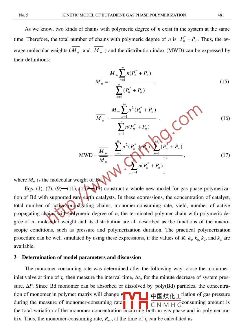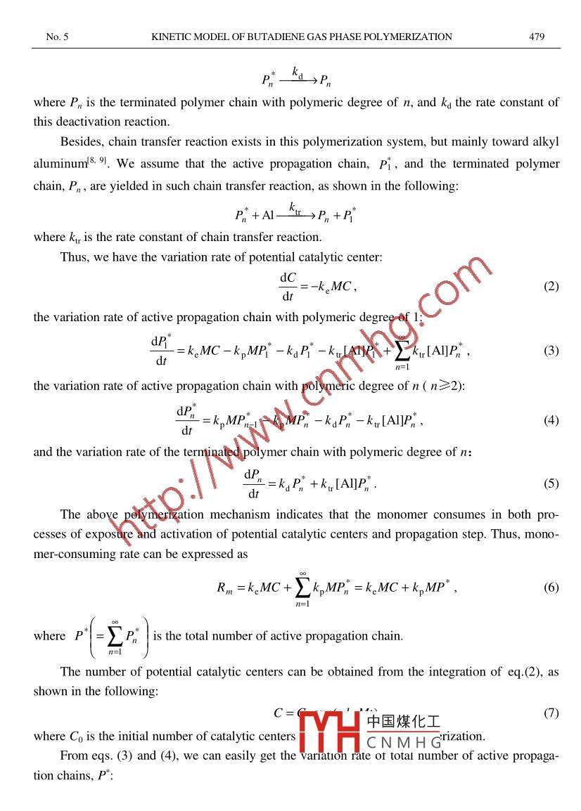 Vol. 43 No. 5SCIENCE IN CHINA (Series B)October 2000Kinetic model of gas phase polymerization of 1,3-butadienecatalyzed by supported rare earth coordination systemSHEN Zhiquan (沈之荃), LI Weishi (李維實) & ZHANG Yifeng (張-烽)Department of Polymer Science and Engineering, Zhejiang University, Hangzhou 310027, ChinaCorrespondence should be addressed to Shen Zhiquan (email: zqshen@163.net)Received May 10, 2000Abstract Gas phase polymerization of 1 ,3-butadiene (Bd) catalyzed by supported rare earth coor-dination system is studied and a new kinetic model is proposed. Four elementary reactions or proc-esses: the process of exposure and activation of potential active catalytic center, propagation,deactivation and chain transfer reaction to alkyl aluminum, are considered in this model. Someimportant parameters, such as monomer-consuming rate, are well expressed as the functions ofmacroscopic polymerization conditions such as pressure, temperature, and duration. The modelcan simulate the whole polymerization procedure satisfactorily.Keywords: rare earth catalyst, 1,3-butadiene, gas phase polymerization, kinetic, modeling.Because gas phase polymerization is conducted without solvent in the process, the compli-cate procedures of aggregation and separation of polymer from solution, which are needed in so-lution polymerization, are excluded from gas phase polymerization. This leads to not only cuttingdown the cost of construction and operation, but also reducing environmental pollution. On theother hand, it also avoids the shortages of bulk polymerization such as low conversion, polymerquality difficult to control and the danger of violent polymerization, which are due to system vis-cosity enhancing rapidly with the increase of conversion and reaction heat being difficult to dif-fuse in bulk polymerization. Although the gas phase polymerization technology of ethylene andpropylene has been industrialized for a long time, gas phase polymerization of Bd has just beenstudied. However, it represents the trend of Bd polymerization technology.Study on gas phase polymerization of Bd was firstly carried out by Berlin Technical Univer-sity and Bayer Company in 19941. Recently, we have studied it succesfully with supported rareearth coordination catalysts. However, the kinetic study of gas phase polymerization of Bd has notbeen performed except for a preliminary work of Eberstein et al.!21. In this paper, the kinetic be-havior and a whole model of gas phase polymerization of Bd with supported rare earth coordinati-on catalysts are reported for the first time. This model can simulate the whole polymerization pro-cedure satisfactorily.中國煤化工MHCNMHG1 ExperimentalGas phase polymerization of butadiene was carried out in a 150 mL kettle. The monomerpressure and the polymerization temperature were kept constant during the whole procedure. Mo-SCIENCE IN CHINA (Series B)Vol.43lecular weight and its distribution of Poly(Bd) prepared were determined on a WATERS 150CGPC chromatograph under the following conditions: 35"C, THF as eluent, flow rate of 1 ml /min,polystyrene as standard, gel columns of 10, 104 and linear. The Mark-Houwink constants'3] ofhigh-cis poly(Bd) in THF at 35°C are K = 4.57x10- and a = 0.693.2 Modeling principleA growing particle is considered as a“solution”of polymeric continuous phase. All reactionstake place in the intraparticle. The difference between the surface and the bulk of particle is ig-nored in this model. The effective monomer concentration in the particle maintains a certain valuewith respect to the constant pressure of Bd during the whole polymerization procedure. Their re-lationship can be well described by Henry' s law: .M=K.P,(1)where K is the reciprocal of Henry constant.Reasonably, the following three elementary reactions or processes are taken into considera-tion for gas phase polymerization of Bd with supported rare earth coordination catalysts.( i ) Process of exposure and activation of potential catalytic centers. In the case of gasphase polymerization of Bd by supported rare earth catalysts, the catalytic centers deposit on theouter and inner surfaces or in the cavity of the carrier. Monomer diffuses from outer to inner of theparticle in a slow rate. Therefore, some zones in inner have no monomer at the very beginning ofthe polymerization. Consequently, no polymerization has happened at the catalytic centers in thesezones, which is regarded as the potential catalytic centers. However, the monomer reaches thesezones gradually along with the polymerization proceeding. In such a case, these centers have φp-portunities to meet with monomer. They become the“true”active propagation centers right afterreacting with monomer. This is consistent with the multigrain model4+. 51 and multilayer model6.7.The process is called the exposure and activation of potential catalytic centers, as expressed in thefollowing:C+M- Ake→>P*where C is the number of potential catalytic centers, and ke the rate constant.(il ) Propagation. The propagation reaction isP1-1+Mk。P%where kp is the rate constant of propagation, and P" the number of active propagation chains with中國煤化工polymeric degree of n.(ii) Deactivation. It is reported!21 that thereMHCNMHGionreationinthegasphase polymerization of Bd. To take it into account, we consider the following deactivation reac-tion:No.5KINETIC MODEL OF BUTADIENE GAS PHASE POLYMERIZATION479P*_kg>Pnwhere Pn is the terminated polymer chain with polymeric degree of n, and kg the rate constant ofthis deactivation reaction.Besides, chain transfer reaction exists in this polymerization system, but mainly toward alkylaluminuml8.9. We assume that the active propagation chain,Pi, and the terminated polymerchain, Pn , are yielded in such chain transfer reaction, as shown in the following:P,*+Al-kr→P, +P*where kr is the rate constant of chain transfer reaction.Thus, we have the variation rate of potential catalytic center:dC=-k。MC,(2)Itthe