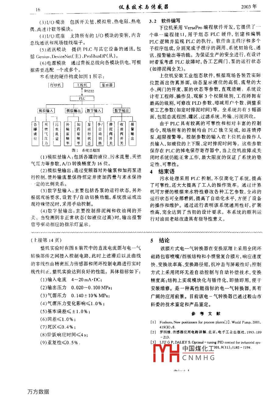 第4期.儀器與儀表.l5VersaMax PLC在污水處理中的應(yīng)用陳繼明',張智芳(1.石油大學(xué),山東東營(yíng)257061;2. 勝利石油學(xué)校,山東東營(yíng)257098)摘要:文中介紹了污水處理的工藝流程及控制要求,并針對(duì)該要求設(shè)計(jì)了控制系統(tǒng)。系統(tǒng)采用PL.C:作為控制中心。文中對(duì)該系統(tǒng)的功能硬件配置和軟件編寫進(jìn)行了討論,詳細(xì)分析了各I/O模塊的功能.并給出了流程框圖。該系統(tǒng)具有較好的通用性和擴(kuò)展性,并已成功的運(yùn)用在實(shí)際生產(chǎn)中。關(guān)鍵詞:PLC;污水處理;硬件配制;軟件設(shè)計(jì)中圖分類號(hào):TP274文獻(xiàn)標(biāo)識(shí)碼:A文章編號(hào) :1002 - 1841(2003)04 - 0015-02Application of VersaMax PLC in Sewage DisposalChen Jiming' , Zhang Zhifang'(1 The Prrleumn Unversiry. ShanDong [ongying 257061;2. Shcngli Petroleum school. ShanDong Dongying 257098)Alstract:This paper introduces technological process of sewage disposul and require of control.We design the controlsystemThis systerm use PLC for control center. This paper discussed the system function. hardware arangemnent and soft .ware consistence. It has analyzed the function of every 1/() module and presented the progran chart. This system is univer.sal and easy to expand. This design has scessfully applied in real production.Key Words: PLC ;Sewage Disposal;Hardware Arrangement ;Software Consisting1問(wèn)題的提出(2)實(shí)時(shí)監(jiān)測(cè)各泵的運(yùn)行狀態(tài)(啟、停、故障);勝利油田某聯(lián)合站污水處理系統(tǒng)建于70年代,主(3)次、二次沉降罐定時(shí)收油,定時(shí)排泥;要工藝是對(duì)含油污水進(jìn)行分離,除去污油和污泥,經(jīng)過(guò)(4)濾罐定時(shí)反沖洗;濾后送注水站。運(yùn)行至今,設(shè)備出現(xiàn)不同程度的老化,(5)外輸緩沖罐液位極低連鎖停外輸泵;部分匕損壞.許多管線已出現(xiàn)局部穿孔現(xiàn)象,需要對(duì)全(6)污泥濃縮罐液位極高禁止各罐排泥;站進(jìn)行大修。另外,該站自建成以來(lái),一直無(wú)自動(dòng)控制(7)天然氣密閉壓力極低報(bào)瞥;系統(tǒng),生產(chǎn)全部依靠手工操作,勞動(dòng)強(qiáng)度高。所有的儀(8)根據(jù)來(lái)水流量自動(dòng)調(diào)整加藥量;表均為現(xiàn)場(chǎng)就地顯示.大罐液位還一直沿用老式的鋼(9)多種運(yùn)行模式選擇,有自動(dòng)、手動(dòng)、半自動(dòng)3種繩浮球式指針顯示,測(cè)量精度低。針對(duì)此現(xiàn)狀,我們承模式;擔(dān)了全站的污水處理自控系統(tǒng)的設(shè)計(jì)工作。(10)系統(tǒng)具有聯(lián)網(wǎng)功能,可通過(guò)廠級(jí)網(wǎng)實(shí)現(xiàn)對(duì)全2工藝流程及測(cè)控要求站生產(chǎn)過(guò)程的監(jiān)測(cè)。2.1工藝流程3系統(tǒng)的軟、 硬件構(gòu)成含油污水首先進(jìn)入- -次沉降罐,在重力的作用下,3.1硬件構(gòu)成污油、污水、污泥自然分離,污油從大罐的9m溢流口系統(tǒng)采用兩級(jí)管理方式:上位機(jī)采用工業(yè)挖制機(jī),排入污油池;污泥由罐底的4個(gè)排泥閥控制定時(shí)排走;完成系統(tǒng)的組態(tài)、流保顯示、數(shù)據(jù)存儲(chǔ)、報(bào)表打印等功污水進(jìn)入二次沉降罐、其工藝與一次罐完全相同。為能。 下位機(jī)是VersaMax PLC,完成現(xiàn)場(chǎng)參數(shù)的采集與加速油水的分離,在污水入口處按一定比例加入微量控制功能。的化學(xué)藥品。兩罐排出的污泥進(jìn)入污泥濃縮罐,由污VersaMax是GE Fanuc Automation公司推出的新泥濃縮泵打入過(guò)濾篩,濾去水分,變成干泥運(yùn)走。污油-代控制系統(tǒng),具有結(jié)構(gòu)緊湊、通用性強(qiáng)、配制靈活等池的原油經(jīng)污油泵外輸至原油處理裝置再加工,污水特點(diǎn)。 它既可以作為單獨(dú)的PLC控制機(jī).又可以作為進(jìn)入外輸緩沖罐準(zhǔn)備外輸。為保證水質(zhì),新上5套濾1/O子站,通過(guò)現(xiàn)場(chǎng)總線受控于其它主掠設(shè)備,還可以罐,進(jìn)行外輸前的最后-一道過(guò)濾處理。為使濾縩保持構(gòu)成由 多臺(tái)PIC組成的分布式大型控制系統(tǒng)。較好的過(guò)濾效果,需定期用清水進(jìn)行反沖洗。另外,各VersaMax由6個(gè)基本單元組成:罐都使用天然氣作密閉氣體,污水與氧氣分離,減少對(duì)(1)CPU模塊用來(lái)執(zhí)行 用戶程序,直接控制I/O罐體和曾道的腐蝕作用。模塊或與其它PLC通訊;2.2測(cè)控要求(2)NIU模塊提 供從站通訊協(xié)議、將1/O模塊(1)監(jiān)測(cè)各罐液位,高低限報(bào)瞥;和主機(jī)通過(guò)現(xiàn)場(chǎng)總線連接起來(lái);收桶口期:2002.11 23收修改稿日期:2003 02-10中國(guó)煤化工MHCNMHG儀表技術(shù)與傳感器2003年6(3)1/O模塊包括開關(guān)量 、模擬量、熱電阻、熱電3.2軟件編寫偶、高速計(jì)數(shù)等模塊。下位機(jī)采用VersaPro編程軟件開發(fā),它是供了-.(4)1/O底座支持 所有的1/O模塊的安裝,內(nèi)含個(gè)單- -編程接口,用于組態(tài)PLC硬件,創(chuàng)建和編輯總線灑訊和現(xiàn)場(chǎng)接線端子。PL.C邏輯并監(jiān)視plC的執(zhí)行。軟件由主程序和多個(gè)(5)通訊模塊提供 PLC與其它設(shè)備的通訊,包子程序組成,分別完成子程序的調(diào)用、系統(tǒng)初始化、通括Cienius.DeviceNet(主)、ProfibusDP(從)。訊、報(bào)警輸出等功能。為保證生產(chǎn)的安全進(jìn)行,在設(shè)計(jì)(6)電源模塊通過(guò)背 板總線向各模塊供電,可根時(sh