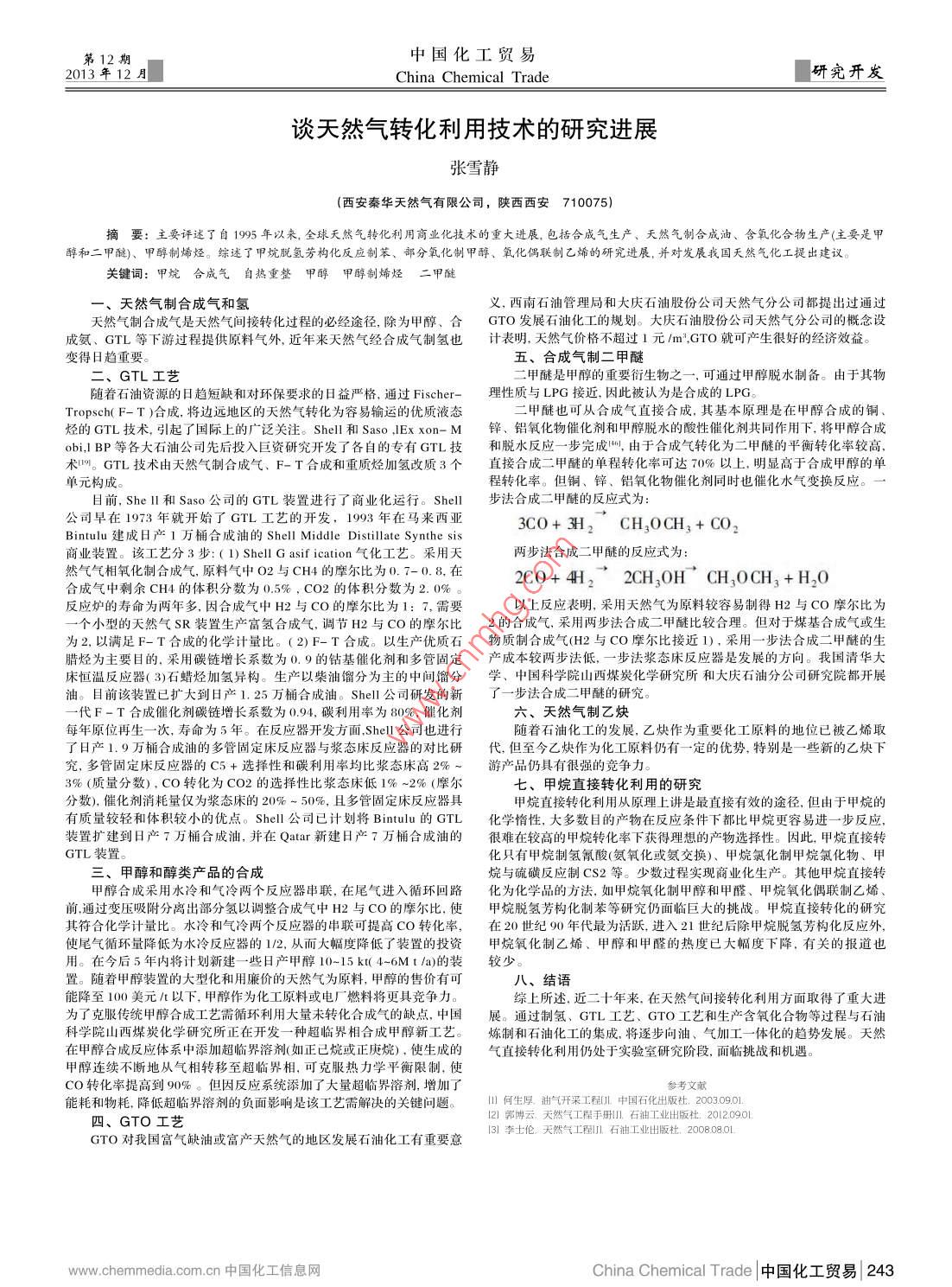 第12期中國化工貿易2013年12China Chemical Trade研究開發(fā)談天然氣轉化利用技術的研究進展張雪靜.(西安秦華天然氣有限公司,陜西西安710075)摘要:主要評述了自1995年以來,全球天然氣轉化利用商業(yè)化技術的重大進展,包括合成氣生產、天然氣制合成油、含氧化合物生產(主要是甲醇和二甲醇)、甲醇制烯烴。綜述了甲烷脫氫芳構化反應制苯、部分氧化制甲醇、氧化偶聯制乙烯的研究進展,并對發(fā)展我國天然氣化工提出建議。關鍵詞:甲烷合成氣自熱重整 甲醇甲醇制烯烴 二 甲醚一、天然氣制合成氣和氫義,西南石油管理局和大慶石油股份公司天然氣分公司都提出過通過天然氣制合成氣是天然氣間接轉化過程的必經途徑,除為甲醇、合GTO 發(fā)展石油化工的規(guī)劃。大慶石油股份公司天然氣分公司的概念設成氨、GTL等下游過程提供原料氣外,近年來天然氣經合成氣制氫也計 表明,天然氣價格不超過1元/m*,GTO就可產生很好的經濟效益。變得日趨重要。五、合成氣制二甲醚二、GTL工藝二甲醚是甲醇的重要衍生物之一,可通過甲醇脫水制備。由于其物隨著石油資源的日趨短缺和對環(huán)保要求的8益嚴格,通過Fischer-理性質與LPG接近,因此被認為是合成的LPG。Tropsch( F- T )合成,將邊遠地區(qū)的天然氣轉化為容易輸運的優(yōu)質液態(tài)二甲醚也可從合成氣直接合成,其基本原理是在甲醇合成的銅、烴的GTL技術,引起了國際上的廣泛關注。Shell 和Saso ,IEx xon- M鋅 、鋁氧化物催化劑和甲醇脫水的酸性催化劑共同作用下,將甲醇合成obi,l BP等各大石油公司先后投入巨資研究開發(fā)了各自的專有GTL技和脫水反應一 步完成網,由于合成氣轉化為二甲醚的平衡轉化率較高,術9。GTL技術由天然氣制合成氣、F-T合成和重質烴加氫改質3個直接合成二甲醚的單程轉化率可達70%以上,明顯高于合成甲醇的單單元構成。程轉化率。但銅、鋅、鋁氧化物催化劑同時也催化水氣變換反應。目前,Shell和Saso公司的GTL裝置進行了商業(yè)化運行。Shell步法合 成二甲醚的反應式為:公司早在1973年就開始了GTL工藝的開發(fā),1993 年在馬來西亞3CO+ 3H2 CH3OCH3+ CO2Bintulu 建成日產1萬桶合成油的Shell Middle Distillate Synthe sis商業(yè)裝置。該工藝分3步:( 1) Shell G asif ication氣化工藝。采用天兩步法合成二甲醚的反應式為:然氣氣相氧化制合成氣,原料氣中02與CH4的摩爾比為0.7-0.8,在2CO+ 4H2”2CH,OH CH,OCH3+ H20,合成氣中剩余CH4的體積分數為0.5%,CO2的體積分數為2.0%。反應爐的壽命為兩年多,因合成氣中H2與CO的摩爾比為1: 7.需要以上反應表明,采用天然氣為原料較容易制得H2與co摩爾比為一一個小型的天然氣SR裝置生產富氫合成氣,調節(jié)H2與co的摩爾比2 的合成氣,采用兩步法合成二甲醚比較合理。但對于煤基合成氣或生為2.以滿足F- T合成的化學計量比。(2)F-T合成。以生產優(yōu)質石物 質制合成氣(H2與Co摩爾比接近).采用-步法合成二甲醚的生臘烴為主要目的,采用碳鏈增長系數為0.9的鈷基催化劑和多管固定產成本較兩步法低,一-步法漿態(tài)床反應器是發(fā)展的方向。我國清華大床恒溫反應器(3)石蠟烴加氫異構。生產以柴油餾分為主的中間餾分學、中國科學院山西煤炭化學研究所和大慶石油分公司研究院都開展油。目前該裝置已擴大到日產1.25萬桶合成油。Shell公司研發(fā)的新了一步法合成二甲醚的研究。一代F-T合成催化劑碳鏈增長系數為0.94,碳利用率為80%,催化劑六、天然氣制乙炔每年原位再生一-次,壽命為5年。在反應器開發(fā)方面.Shell公司也進行隨著石油化工的發(fā)展,乙炔作為重要化工原料的地位已被乙烯取了日產1.9萬桶合成油的多管固定床反應器與漿態(tài)床反應器的對比研代,但至今乙炔作為化工原料仍有一一定的優(yōu)勢,特別是--些新的乙炔下究,多管固定床反應器的C5+選擇性和碳利用率均比漿態(tài)床高2%~游產品仍具有很強的競爭力。3%(質量分數),co轉化為CO2的選擇性比漿態(tài)床低1%~2%(摩爾七、甲烷直接轉化利用的研究分數),催化劑消耗量僅為漿態(tài)床的20%-50%,且多管固定床反應器具甲烷直接轉化利用從原理上講是最直接有效的途徑,但由于甲烷的有質量較輕和體積較小的優(yōu)點。Shell公司已計劃將Bintulu的GTL化學惰性,大多數8的產物在反應條件下都比甲烷更容易進一一步反應,裝置擴建到日產7萬桶合成油,并在Qatar新建日產7萬桶合成油的很難 在較高的甲烷轉化率下獲得理想的產物選擇性。因此,甲烷直接轉GTL裝置?;挥屑淄橹茪淝杷?氨氧化或氨交換)、甲烷氯化制甲烷氯化物、甲三、甲醇和醇類產品的合成烷與硫磺反應制CS2等。少數過程實現商業(yè)化生產。其他甲烷直接轉甲醇合成采用水冷和氣冷兩個反應器串聯,在尾氣進入循環(huán)回路化為化學品的方法,如甲烷氧化制甲醇和甲醛、甲烷氧化偶聯制乙烯、前,通過變壓吸附分離出部分氫以調整合成氣中H2與co的摩爾比,使甲烷脫氫芳構化制苯等研究仍面臨巨大的挑戰(zhàn)。甲烷直接轉化的研究其符合化學計量比。水冷和氣冷兩個反應器的串聯可提高CO轉化率,在20世紀90年代最為活躍,進入21世紀后除甲烷脫氫芳構化反應外,使尾氣循環(huán)量降低為水冷反應器的1/2,從而大幅度降低了裝置的投資甲烷氧化制乙烯、甲醇和甲醛的熱度已大幅度下降,有關的報道也用。在今后5年內將計劃新建一些日 產甲醇10-15 kt( 4-6Mt 