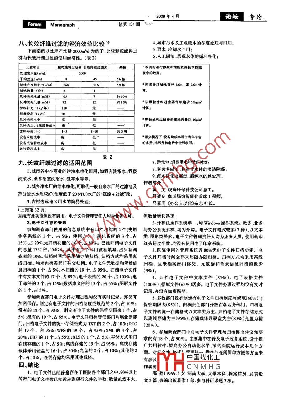 2009年4月論壇專論”Forwm Monograph總第154期節(jié)水減排,污水回用.黃文舒適良馬慕周(辦公自動化學(xué)會北京 100026)摘要水資源問題是二十一世紀(jì)全球環(huán)境資源的首要問題。解決水資源問題的一個重要方法是污水處理問用,回用的關(guān)鍵是過濾處理,傳統(tǒng)的過濾使用顆粒濾料,存在精度不高和過濾空隙易堵塞等缺陷。用纖維取代顆粒濾料,用創(chuàng)新的長效纖維過濾取代傳統(tǒng)的顆粒過濾器,它具有高濾速低濾阻.高出水水質(zhì)、低能耗等特點(diǎn)以提高過濾效率和綜合過濾性能,是-場過濾技術(shù)的創(chuàng)新,以完成污水凈化問用。關(guān)鍵詞水資源顆粒濾料長效纖維 過濾處理中圖分類號X702文獻(xiàn)標(biāo)識碼A文章編號090413- -4962Water- saving, Emission- reduction & Sewage ReuseHuang Wen Shu Shiliang Ma Muzhou(OA SocietyBeijing100026)Abstract W ater resource is a primary problem of the global environmental resource in 21st century. An important methodof water resource problem solution is the sewage reused and its key point is filtering treatment to be used as a traditionalfiltration with granular filter which existed the dects of low refined and filtering gap to be blocked up easily etc. Thegranular filtering material be substituted with fabre, and the traditional granular filter to be substituted with innovativeenduring effect fibre filter, it possesses the features of high filtering speed, low filtering resistance, high quality wateroutput and low energy- -consumptions etc, so as to raise the filtering fficiency and the comprehesive filtering performance,those are a revolution of filtering technology which the purification and reuse of sewage can be accomplished.Keywords W ater resource Granular filtering material Enduring effect fibre Filtering treatment-水資源危機(jī)二、傳統(tǒng)過濾存在的缺陷隨著水資源危機(jī)的加劇和水環(huán)境的不斷惡化,水資源問題傳統(tǒng)深層過濾使用石英砂、無煙煤、鐵礦石等顆粒濾料,其已成為21世紀(jì)全球環(huán)境資源的首要問題,而節(jié)約用水和重復(fù)利固有缺陷為:用水資源(污水回用)是解決有限水資源和用水量之間矛盾的最首先:為防止反沖洗效果的降低和過濾阻力的增大,濾料粒為有效、經(jīng)濟(jì)的辦法。徑不應(yīng)小于0.5mm,因此過濾精度不高;在污水回用中,過濾是保證再生水質(zhì)的- -項(xiàng)關(guān)鍵過程,其目其次,在反沖洗時會產(chǎn)生水分級現(xiàn)象,即自動按反沖洗水流的是通過具有孔隙的過濾介質(zhì)(濾料)去除水中懸浮物和膠體,使方向從大到小顆粒排列.使過濾孔腺也是從大到小,但過濾時水水獲得澄清的物理處理,通常作為二級水處理后的三級或深度流方向逆 反.過濾孔隙沿過濾方向從小到大.因此水流經(jīng)過小粒水處理。但在處理微污染水情況下,污水也可經(jīng)過深度過濾后直徑、 小孔隙濾層,懸浮物大部分被截留在表面濾層數(shù)厘米深度接排放或回用。內(nèi),從而使濾層表面孔隙迅速堵塞.濾床壓降迅速上升,而深層過濾可分為深層過濾和表層過濾(濾餅過濾)。深層過濾是利大部分濾層未發(fā)揮作用,使識污容量 遠(yuǎn)遠(yuǎn)低于設(shè)計容量。這是顆用相當(dāng)厚的濾料的巨大表面積,依靠篩除.吸附.沉淀、接觸絮凝粒濾料過濾運(yùn)行- -陣 子后性能急劇變差的原因之-。等復(fù)雜作用截留濾液中的懸浮物和膠體,其過濾效果比表層過其三,為防止反沖洗時濾料過度流化造成濾料流失(“跑濾優(yōu)勝。砂"現(xiàn)象)。反沖洗水、氣強(qiáng)度不能很高,這使得積泥反沖洗出率過濾和反沖洗是深層過濾的兩個基本操作,性能良好的深較低。 過濾一段時間后.其高殘余積泥易結(jié)成沈球和泥餅而加劇層過濾處理應(yīng)能滿足在過濾時濾料排列緊密,濾床橫斷面上孔過濾孔中國煤化工頓粒濾料過濾運(yùn)行一-段隙均勻分布,沿過濾向?yàn)V層孔隙由大到小過濾效率由低到高時間后YHCNMHG的理想過濾狀態(tài):而反沖洗時則能達(dá)到濾層蓬松舒展,內(nèi)部孔腺三、 長雙計班過濾的出現(xiàn)充分張開,濾料間劇烈碰撞摩擦,以保證濾料的徹底清洗。理想的濾層應(yīng)沿過濾方向孔隙尺寸從大到小遞減分布,從13方數(shù)徐 自動化雜志論壇專論2009年4月總第154期ForumMonograph而使更多懸浮物進(jìn)人更深濾層而被截留,使整個濾層的過濾效低制水成本;能得以充分發(fā)揮。7.過濾出水水質(zhì)優(yōu)異而穩(wěn)定,可用于直接過濾水庫、湖泊及以纖維取代傳統(tǒng)的顆粒濾料,是近年過濾技術(shù)創(chuàng)新的發(fā)展。相關(guān)地表 地下水以作為生活用水;纖維濾床不僅具有巨大的比表面積和較高的孔隙率,在水力壓8、反沖洗容易,反洗時間短,可大大節(jié)省反沖洗用水,用縮的作用下可形成上述“理想濾層”的過濾方式,使過濾床層結(jié)氣量;構(gòu)更合理,過濾效率更高。9、反沖洗徹底,過濾周期長,可長期穩(wěn)定、高效運(yùn)行;比較不同過濾的優(yōu)劣是在其平均濾速、過濾周期、截污周10、設(shè)備結(jié)構(gòu)簡潔.緊湊,運(yùn)行維護(hù)和維修簡單、快捷。期、截污容量、過濾效率(包括出水濁度、過濾精度、各種污染物六、 長效纖維過濾的流程示意去除率)、反沖洗效率(包括反洗時間、積泥反洗出率、濾床成熟長效纖維過濾器以無毒、無害的人造纖維為過濾介質(zhì),采期)、運(yùn)行耗損(包括反沖洗水耗反沖洗[耗電耗)等多方面進(