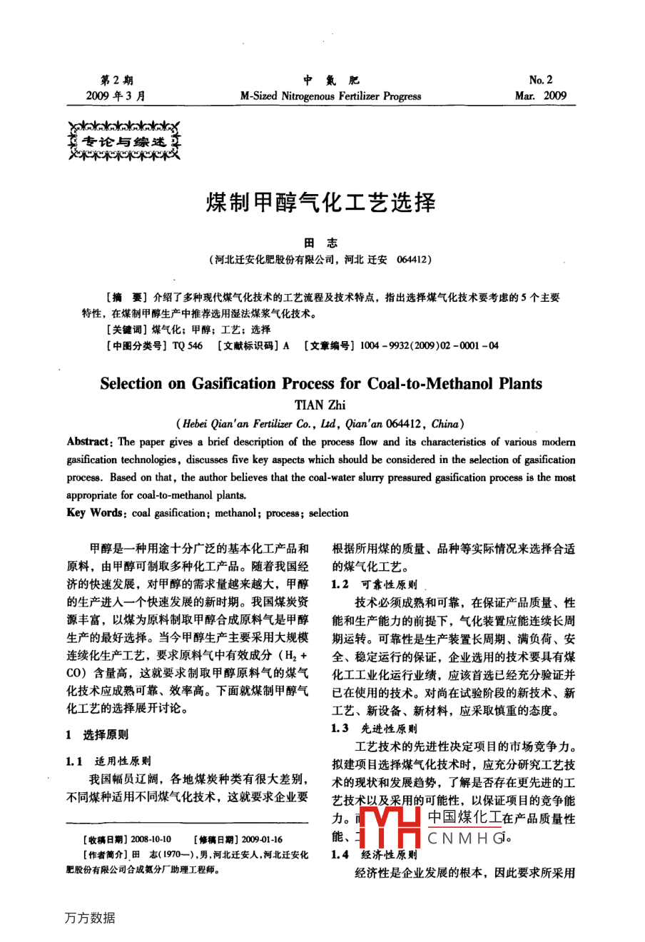 第2期中氮肥No. 22009年3月M-Sized Nitrogenous Fertilizer ProgressMar.2009rlokakoooookcx專論與綜迷不不不不術(shù)個不8煤制甲醇?xì)饣に囘x擇田志河北遷安化肥股份有限公司,河北遷安06442)[摘要]介紹了多種現(xiàn)代煤氣化技術(shù)的工藝流程及技術(shù)特點,指出選擇煤氣化技術(shù)要考慮的5個主要特性,在煤制甲醇生產(chǎn)中推薦選用濕法煤漿氣化技術(shù)[關(guān)鍵詞]煤氣化;甲醇;工藝;選擇中圖分類號]TQ546[文獻(xiàn)標(biāo)識碼]A[文章編號]1004-992(2009)02-0001-04Selection on Gasification Process for Coal-to-Methanol plantsTiaN ZhiHebei Qian'an Fertilizer Co, Ltd, Qian'an 064412, China)Abstract: The paper gives a brief description of the process flow and its characteristics of various modemgasification technologies, discusses five key aspects which should be considered in the selection of gasificationprocess. Based on that, the author believes that the coal-water slurry pressured gasification process is the mostappropriate for coal-to-methanol plantsKey Words: coal gasification; methanol; process; selection甲醇是一種用途十分廣泛的基本化工產(chǎn)品和根據(jù)所用煤的質(zhì)量、品種等實際情況來選擇合適原料,由甲醇可制取多種化工產(chǎn)品。隨著我國經(jīng)的煤氣化工藝。濟(jì)的快速發(fā)展,對甲醇的需求量越來越大,甲醇1.2可靠性原則的生產(chǎn)進(jìn)入一個快速發(fā)展的新時期。我國煤炭資技術(shù)必須成熟和可靠,在保證產(chǎn)品質(zhì)量、性源豐富,以煤為原料制取甲醇合成原料氣是甲醇能和生產(chǎn)能力的前提下,氣化裝置應(yīng)能連續(xù)長周生產(chǎn)的最好選擇。當(dāng)今甲醇生產(chǎn)主要采用大規(guī)模期運轉(zhuǎn)。可靠性是生產(chǎn)裝置長周期、滿負(fù)荷、安連續(xù)化生產(chǎn)工藝,要求原料氣中有效成分(H2+全、穩(wěn)定運行的保證,企業(yè)選用的技術(shù)要具有煤C0)含量高,這就要求制取甲醇原料氣的煤氣化工工業(yè)化運行業(yè)績,應(yīng)該首選已經(jīng)充分驗證并化技術(shù)應(yīng)成熟可靠、效率高。下面就煤制甲醇?xì)庖言谑褂玫募夹g(shù)。對尚在試驗階段的新技術(shù)、新化工藝的選擇展開討論。工藝、新設(shè)備、新材料,應(yīng)采取慎重的態(tài)度。1選擇原則1.3先進(jìn)性原則工藝技術(shù)的先進(jìn)性決定項目的市場競爭力。1.1適用性原則擬建項目選擇煤氣化技術(shù)時,應(yīng)充分研究工藝技我國幅員遼闊,各地煤炭種類有很大差別,術(shù)的現(xiàn)狀和發(fā)展趨勢,了解是否存在更先進(jìn)的工不同煤種適用不同煤氣化技術(shù),這就要求企業(yè)要藝技術(shù)以及采用的可能性,以保證項目的競爭能力。"V凵中國煤化工在產(chǎn)品質(zhì)量性收稿日期]2008010[修稿日期]20001-16能CNMHGo作者簡介]田志(190),男河北遷安人河北遷安化14經(jīng)濟(jì)性原則肥股份有限公司合成氨分廠助理工程師經(jīng)濟(jì)性是企業(yè)發(fā)展的根本,因此要求所采用中氮肥第2期技術(shù)投資省、消耗低、運行成本和維護(hù)成本低。22國外引進(jìn)的干法粉煤氣化工藝1.5安全環(huán)保原則Shl粉煤氣化、GSP煤氣化技術(shù)同屬此類。煤的固有特性決定煤化工生產(chǎn)過程中容易產(chǎn)2.2.1適用性生大量的煤粉、煤灰、煤渣、廢水、廢氣,對其2種煤氣化技術(shù)均為粉狀煤入爐,各微粒單處理的難度有的還比較大。企業(yè)在選擇技術(shù)時應(yīng)獨完成熱解、氣化、熔渣,不會相互黏結(jié),不受以人為本,選擇的工藝技術(shù)應(yīng)確保安全并實現(xiàn)清煤的黏結(jié)性影響,同時由于氣化溫度高,可用高潔生產(chǎn),盡量少排放“三廢”,盡可能地減少對灰熔點煤,對不同煤種的適應(yīng)性較強。生態(tài)環(huán)境的影響。2.2.2可靠性2主要煤氣化技術(shù)的比較he!粉煤氣化在國外只用于電廠,國內(nèi)引進(jìn)此技術(shù)首次用于化工,無經(jīng)驗可參考。從國內(nèi)2.1濕法進(jìn)料加壓氣流床氣化技術(shù)幾套爐子開車情況來看,困難還很多,開車運行該類技術(shù)包括CE水煤漿加壓氣化技術(shù)、多過程中出現(xiàn)了很多問題,連續(xù)運行周期只有2~噴嘴對置式水煤漿氣化技術(shù)以及多元料漿煤氣化3個月,要解決所有問題尚需時日,可靠性有待技術(shù)。提高。GSP煤氣化技術(shù)國內(nèi)也是首次引進(jìn),國外2.L.1適用性大工業(yè)化運行經(jīng)驗也不多,國內(nèi)引進(jìn)項目剛剛開3種煤氣化技術(shù)都對原料煤有特殊要求:具始,可靠性有待考證有較好的成漿性,低灰熔點和低含水量。否則就2.2.3先進(jìn)性要進(jìn)行煤的干燥以及加入添加劑和助熔劑,由此2種煤氣化技術(shù)氣化溫度高,一般在1400而增加操作難度和生產(chǎn)消耗。1700℃,碳轉(zhuǎn)化率可達(dá)99%,煤氣中甲烷含量2.1.2可靠性極少[φ(CH4)<0.1%],不含重?zé)N,合成氣中3種煤氣化技術(shù)都有工業(yè)化運行裝置,都具d(CO+H2)高達(dá)90%以上,氣化效率很高。有較好的可靠性,相比較CE氣化技術(shù)由于引進(jìn)2.2.4經(jīng)濟(jì)性較早,建設(shè)裝置最多,商業(yè)運行時間最長,經(jīng)過2種煤氣化技術(shù)與濕法進(jìn)料水煤漿氣化相多年的探索改進(jìn),用于化工生產(chǎn)技術(shù)已成熟,可比,氧耗量低,降低了配套的空分裝置的投資;靠性最高。均釆用水冷壁結(jié)構(gòu),無耐火磚,水冷壁使用壽命2.1.3先進(jìn)性較長;二者均為干法氣化,
