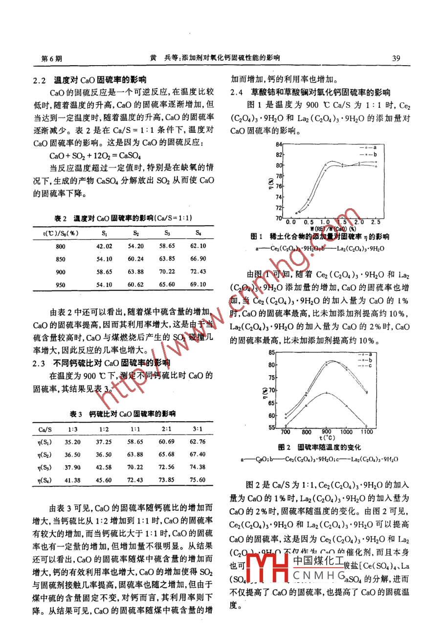 第22卷第6期有色礦冶Vol. 22. No62006年12月NON - FERROUS MINING AND METALLURGYDecember 2006文章編號: 1007 - 967X(2006)06 - 0038 - 03添加劑對氧化鈣固硫性能的影響黃兵1,2,牛 剛了,邵忠寶,楊 雪',矯立男1(1東北大學(xué)理學(xué)院,遼寧沈陽1000;2沈陽市第三十八中學(xué),遼寧沈陽10001;3長春工程學(xué)院,長春130012)摘要:研究了掭 加劑對氧化鈣在煤燃燒過程中固硫性能的影響。討論了燃煤硫的含量、溫度、鈣'硫比、添加草酸鈰和草酸鑭對氧化鈣固硫性能的影響。實驗結(jié)果表明:隨蓍煤中硫含量的增加,氧化鈣的固硫率增大;氧化鈣的固硫率在最佳固硫溫度以下隨溫度升高而增大,超過最佳固硫溫度則隨溫度升高而下降;氧化鈣的最佳固硫溫度約900C;鈣硫比大于1:1時固硫效果比較好,最大固硫率可達約72%;草酸鈰和草酸鑭的掭加,更有效地提高了氧化鈣的利用率,可提高氧化鈣的固硫率約10%,且使固硫溫度提高約100 C。關(guān)鍵詞:氧化鈣;草酸鈰;草酸鑭;固硫率;鈣硫比中圖分類號:TF111.145文獻標(biāo)識碼:A的用量對CaO固硫性能的影響。0前言我國是以煤為主要能源,在一次能源中煤占1實驗75%左右,有關(guān)SO2來源的分類研究表明,我國大1.1 儀器及藥品氣中的sO2主要是煤炭燃燒產(chǎn)生的,約占總排量的電子天平,感量為0.0001 g; 馬弗爐;氧化鈣94%左右。SO2和酸雨污染是我國大氣污染的主要(CaO,分析純);草酸鈰[Ce2(C204)s●9H2O,分析問題,是可能制約我國經(jīng)濟可持續(xù)發(fā)展的重要環(huán)境純];草酸鑭[ La2(C2O4)3.9H2O,分析純]。因素。所以,發(fā)展燃煤鍋爐的脫硫技術(shù),削減其SO21.2 實驗方法排放量已成為一項刻不容緩的任務(wù)??萍脊ぷ髡咴谶x用4種不同質(zhì)量分數(shù)硫的煤,用艾士卡法測這方面已進行了大量的研究工作[1-8]。根據(jù)脫硫定煤中的硫質(zhì)量分數(shù),測量結(jié)果列于表1。以分析技術(shù)的實施階段,基本可分為三大類:即燃燒前脫純的CaO為基,添加不同比例的草酸鈰和草酸鑭,硫[9]、燃燒中脫硫(1,2和燃燒后的煙氣脫硫[10]。燃將CaO基的固硫劑以不同的鈣硫比加入煤粉里混燒前脫硫因脫除效率較低,難以滿足環(huán)保要求;煙氣合均勻后放入剛玉坩堝中,在馬弗爐中煅燒,升溫速脫硫技術(shù)發(fā)展與應(yīng)用已較為成熟,但其昂貴的設(shè)備率為5C/min,保溫30min,用硫酸鋇質(zhì)量法測定投資和運行費用極大地限制了它的廣泛應(yīng)用11];燃燃燒后煤質(zhì)中的全硫含量,按下式計算固硫率:燒中脫(固)硫技術(shù)是在媒中添加一-定 的固硫劑使煤η= S:/So 100%在燃燒或氣化時生成的氣態(tài)硫化物在爐內(nèi)吸收,或式中:p一固硫率;S 燒結(jié) 后煤灰中的全氣相中殘存的硫化物與剛進入爐內(nèi)的脫硫劑接觸而硫含量;So一-煤中的全硫含 量。被吸收,從而使排出氣體中SO2含量降低,其具有2結(jié)果與討論設(shè)備操作簡單,占用空間小,投資少等優(yōu)勢,適合于對現(xiàn)行鍋爐進行改進及含中、低硫的燃煤;它存在的2.1四種煤質(zhì)的全硫含量一個很大的缺陷便是脫硫效果較差。CaO 價格便表1示出了不同煤質(zhì)的全硫含量。宜,原材料豐富,目前普遍用作脫硫技術(shù)中的固硫表14 種煤質(zhì)的全磅含量劑,但CaO固硫率較低,高溫時固硫效果較差,為解中國煤化工- sSs決這一問題,本文在CaO固硫劑中添了草酸鈰和草.822.24酸鑭,研究燃煤的硫含量、溫度、鈣硫比以及添加劑三HCNMHG●收稿日期:2006 -08 -25作者簡介:黃兵女,碩士,研究方向:材料化學(xué)。第6期黃兵等:添加劑對 氧化鈣固硫性能的影響392.2溫 度對CaO固硫率的影響加而增加,鈣的利用率也增加。CaO的固硫反應(yīng)是一個可逆反應(yīng),在溫度比較2.4草酸鈰和草酸鑭對氧化鈣固硫率的影響低時,隨著溫度的升高,CaO的固硫率逐漸增加,但圖1是溫度為900 CCa/S為1:1 時, Cer當(dāng)達到一定溫度時,隨著溫度的升高, CaO的固硫率(C2O4)3. 9H2O和Laz (C2O4)3.9H2O的添加量對逐漸減少。表2是在Ca/S=1:1條件下,溫度對CaO固硫率的影響。CaO固硫率的影響。這是因為CaO的固硫反應(yīng):84CaO+ SO2 + 1202 = CaSO482- -.-b當(dāng)反應(yīng)溫度超過--定值時,特別是在缺氧的情8況下,生成的產(chǎn)物CaSO4分解放出SO2從而使CaO?70的固硫率下降。7472表2溫度對CaO固破率的影響(Ca/S= 1:1)700.00.510152025t(C)/S。(%)SS4圖1稀土化合物的添加 對固碗率η的影響800042.0254.2058.6562.10a--Ce(C2O)s*.9H2O;b- - -La2(C204)3.9H2O85(54.1060.2463.8566.9063.8870.2272.43由圖1可知,隨著Cer (C204)3.9H2O和laz95060. 6265.6069. 10(C2O4)3●9H20添加量的增加,CaO的固硫率也增加,當(dāng)Ce2(C2O4)3.9H20的加入量為CaO的1%由表2中還可以看出,隨著煤中硫含量的增加,時,CaO的固硫率最高,比未加添加劑提高約10%,CaO的固硫率提高,因而其利用率增大,這是由于當(dāng)La(C204)s.9H20的加入量為CaO的2%時, CaO硫含量較高時,CaO與煤燃燒后產(chǎn)生的SO2碰撞幾的固硫率最高,比未加添加劑提高約10%。率增大,因此反應(yīng)的幾率也增大。852.3不同鈣硫比對 CaO固硫率的影響8C-6在溫度為900 C下,測定不同鈣硫比時CaO的75固硫率,其結(jié)果見表3。27065表3鈣硫比對CaO固硫率的影響6C_Ca/S1:3:21:12:13:155700~ 800~ 90、 1000 1100n(S)35. 2037.2560.6962.76圖2固硫率隨溫 度的變化n(Sz) 36 5036.5065.6867.40o一-GgO;b-- -Ce(C2O)s+9H2O;c- _Laz(C204)s.9H2O》(Ss) :37.9042.5872.56 74.3n(S4)41.3845.6073.8575.60圖2是Ca/S為1:1, Cer(C2O4)3.9H2O的加入量為CaO的1%時, La2(C2O,)s .9H2O的加入量為由表3可見,CaO