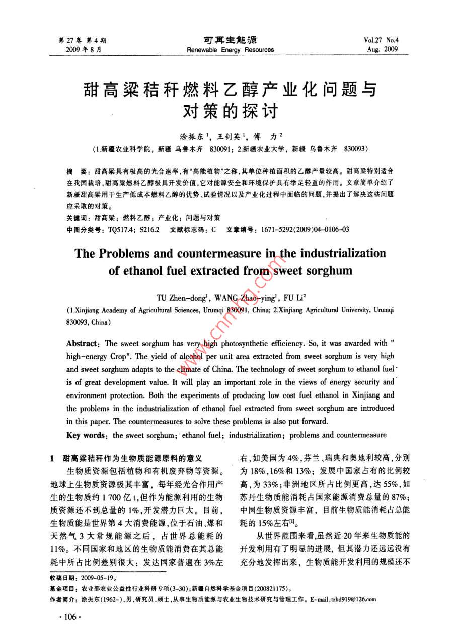 第27卷第4期可耳生能Vol 27 No 42009年8月Renewable Energy Resourcesug.2009甜高粱秸稈燃料乙醇產(chǎn)業(yè)化問(wèn)題與對(duì)策的探討涂振東',王釗英!,傅力2(1新疆農(nóng)業(yè)科學(xué)院,新疆烏魯木齊830091;2新疆農(nóng)業(yè)大學(xué),新疆烏魯木齊830093)摘要:甜高粱具有極高的光合速率,有“高能植物”之稱,其單位種植面積的乙醇產(chǎn)量較高。甜高粱特別適合在我國(guó)栽培,甜高粱燃料乙醇極具開發(fā)價(jià)值,它對(duì)能源安全和環(huán)境保護(hù)具有舉足輕重的作用。文章簡(jiǎn)單介紹了新甜高粱用于生產(chǎn)低成本燃料乙醇的優(yōu)勢(shì)試驗(yàn)情況以及產(chǎn)業(yè)化過(guò)程中面臨的問(wèn)題,并提出了解決這些問(wèn)題應(yīng)采取的對(duì)策。關(guān)鍵詞:甜高粱;燃料乙醇;產(chǎn)業(yè)化;問(wèn)題與對(duì)策中圖分類號(hào):TQ5174;S2l6,2文獻(xiàn)標(biāo)志碼:C文章編號(hào):1671-5292(2009)04-0106-03The problems and countermeasure in the industrializationof ethanol fuel extracted from sweet sorghumWANG Zhao-ying, FU Li(1.Xinjiang Academy of Agricultural Sciences, Urumqi 830091, China; 2. Xinjiang Agricultural University, UrumqiAbstract: The sweet sorghum has very high photosynthetic efficiency. So, itwas awarded wlhigh-energy Crop". The yield of alcohol per unit area extracted from sweet sorghum is very highand sweet sorghum adapts to the climate of China. The technology of sweet sorghum to ethanol fuelis of great development value. It will play an important role in the views of energy security andenvironment protection. Both the experiments of producing low cost fuel ethanol in Xinjiang andthe problems in the industrialization of ethanol fuel extracted from sweet sorghum are introducedin this paper. The countermeasures to solve these problems is also put forwardKey words: the sweet sorghum' ethanol fuel; industrialization; problems and countermeasure1甜高粱秸稈作為生物質(zhì)能源原料的意義右,如美國(guó)為4%,芬蘭瑞典和奧地利較高,分別生物質(zhì)資源包括植物和有機(jī)廢棄物等資源。為18%,16%和13%;發(fā)展中國(guó)家占有的比例較地球上生物質(zhì)資源極其豐富,每年經(jīng)光合作用產(chǎn)高,為33%;非洲地區(qū)所占比例更高,達(dá)55%,如生的生物質(zhì)約1700億t,但作為能源利用的生物蘇丹生物質(zhì)能消耗占國(guó)家能源消費(fèi)總量的87%;質(zhì)資源還不到總量的1%,開發(fā)潛力巨大。目前,中國(guó)生物質(zhì)資源豐富,目前生物質(zhì)能消耗占總能生物質(zhì)能是世界第4大消費(fèi)能源,位于石油、煤和耗的15%左右。天然氣3大常規(guī)能源之后,占世界總能耗的從世界范圍來(lái)看雖然近20年來(lái)生物質(zhì)能的11%。不同國(guó)家和地區(qū)的生物質(zhì)能消費(fèi)在其總能開發(fā)利用有了明顯的進(jìn)展,但其潛力還遠(yuǎn)遠(yuǎn)沒(méi)有耗中所占比例差別很大:發(fā)達(dá)國(guó)家普遍在3%左充分地發(fā)揮出來(lái),生物質(zhì)能開發(fā)利用的規(guī)模還不收稿日期:2009-05-19。基金項(xiàng)目:農(nóng)業(yè)部農(nóng)業(yè)公益性行業(yè)科研專項(xiàng)(3-30);新疆自然科學(xué)基金項(xiàng)目(200821175)。作者簡(jiǎn)介:涂振東(1962-),男,研究員,碩士,從事生物質(zhì)能源與農(nóng)業(yè)生物技術(shù)研究與管理工作。E- mail: thd919@126com涂振東,等甜高梁秸稈燃料乙醇產(chǎn)業(yè)化問(wèn)題與對(duì)策的探討大科學(xué)技術(shù)水平還不高,能源轉(zhuǎn)換效率低產(chǎn)業(yè)化續(xù)表1薄弱商品化程度低。不少國(guó)家還沒(méi)有把生物質(zhì)能項(xiàng)名稱單位棉花玉來(lái)翻高梁的開發(fā)利用納人國(guó)家的能源建設(shè)計(jì)劃中,投人不自營(yíng)地折租元/hm22123.70111375120000足,缺乏一整套鼓勵(lì)、扶持推廣的政策法規(guī)。凈收人元∧hm26851404127.25963000近年來(lái),能源作物(如甜高粱、甘薯、木薯、芭注;1棉花、玉米的數(shù)據(jù)來(lái)源于2004年度新疆發(fā)展與改革蕉芋、綠玉樹、巨藻等)作為現(xiàn)代生物質(zhì)能資源在委員會(huì)工農(nóng)業(yè)產(chǎn)品成本調(diào)查隊(duì)編印的《農(nóng)牧產(chǎn)品成本收益資料匯編》;2甜高粱數(shù)據(jù)來(lái)源于2002-2005年度新疆農(nóng)業(yè)科學(xué)院對(duì)我國(guó)已引起廣泛關(guān)注,開發(fā)生物質(zhì)能源對(duì)我國(guó)農(nóng)吐魯番市、瑪納斯縣和略什地區(qū)農(nóng)民種植情況的統(tǒng)計(jì)資料。村發(fā)展、能源開發(fā)、環(huán)境和資源保護(hù)、國(guó)家安全和2.2豐富的后備土地資源生態(tài)平衡具有重要意義。甜高粱是高溫短日照作物,一般說(shuō)來(lái),凡是可甜高粱是一種能源、糖料和飼料作物,具有很以栽培玉米的地區(qū),都可以栽培甜高粱。研究表髙的綜合利用價(jià)值。甜高粱在我國(guó)栽培歷史悠久,明,新疆大部分非宜棉區(qū)均可種植甜高粱。適合在不同生態(tài)區(qū)域種植。我國(guó)新疆地區(qū)干旱少調(diào)查統(tǒng)計(jì)表明,新疆各地水電站和大型水利雨,光照充足,全年日照時(shí)間為2500~3500h,為樞紐工程建成后,新疆宜開墾的后備耕地資源總甜高粱提供了得天獨(dú)厚的生長(zhǎng)條件。量為148751884lhm2,其中荒草地10l62007.37甜高粱植株高達(dá)4m以上,鮮生物量產(chǎn)量可hm2,鹽堿地3983604.70hm2,沼澤地321865.04達(dá)160thm24,甜高粱所合成的碳水化合物的產(chǎn)hm2,葦?shù)?574683hm2,灘涂25026447hm2,后