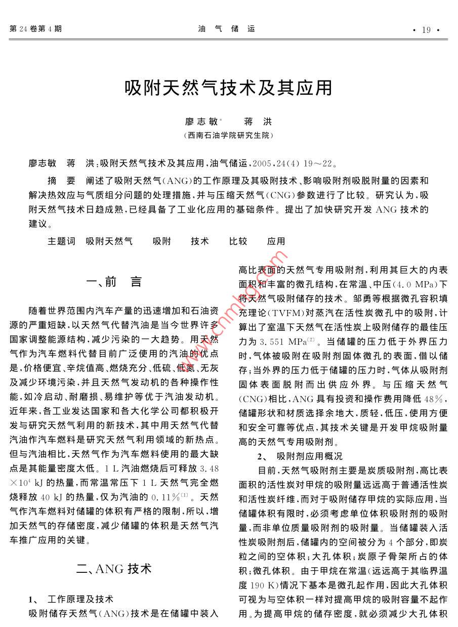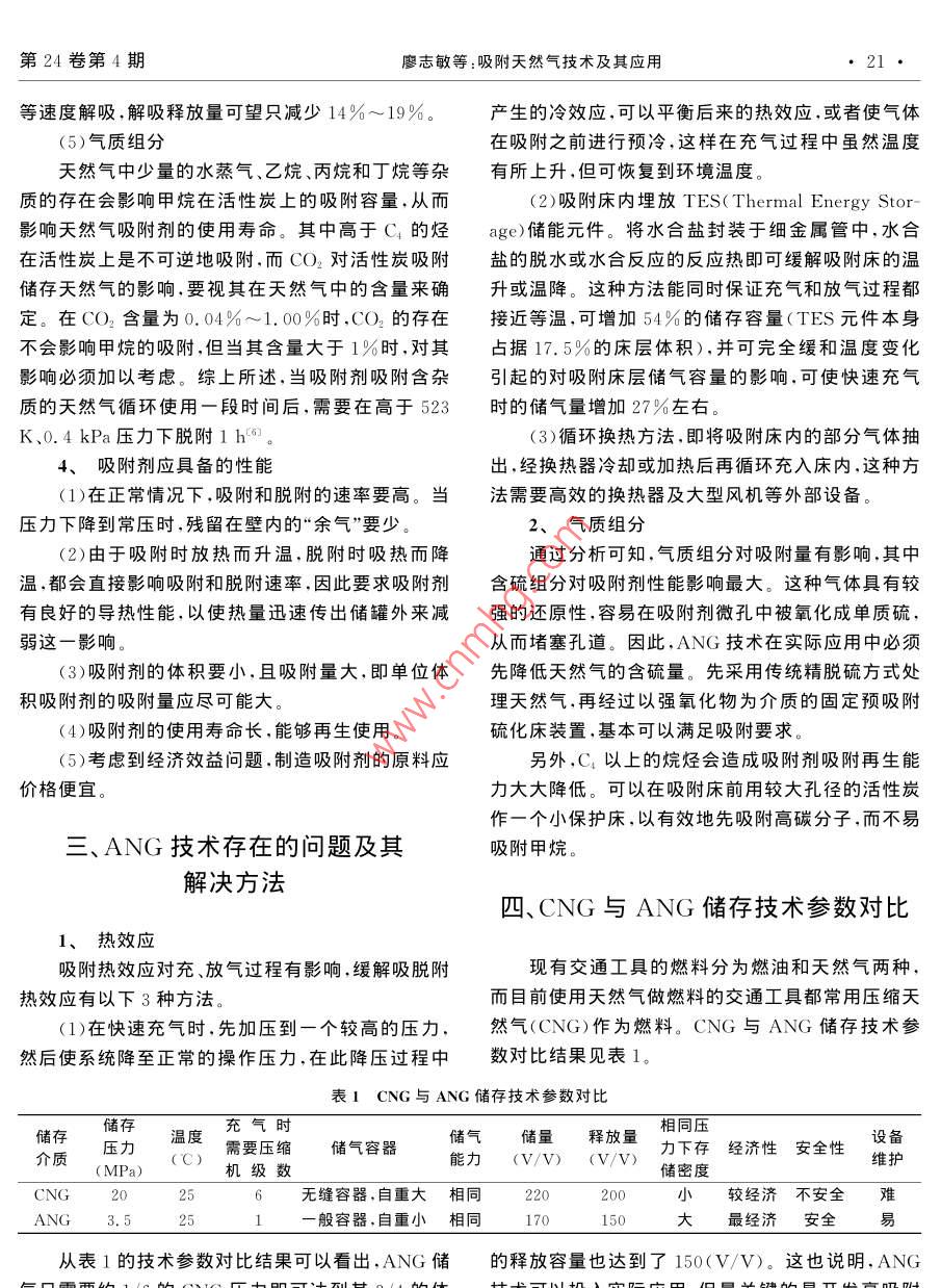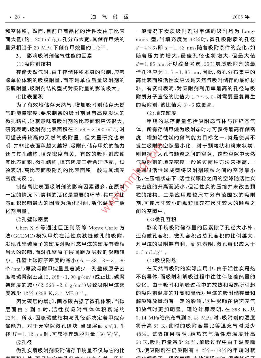 第24卷第4期油氣儲(chǔ)運(yùn)吸附天然氣技術(shù)及其應(yīng)用廖志敏蔣洪(西南石油學(xué)院研究生院)廖志敏蔣洪:吸附天然氣技術(shù)及其應(yīng)用,油氣儲(chǔ)運(yùn),2005,24(4)19~摘要闡述了吸附天然氣(ANG)的工作原理及其吸附技術(shù)、影響吸附劑吸脫附量的因素和解決熱效應(yīng)與氣質(zhì)組分問(wèn)題的處理措施,并與壓縮天然氣(CNG)參數(shù)進(jìn)行了比較。研究認(rèn)為,吸附天然氣技術(shù)日趨成熟,已經(jīng)具備了工業(yè)化應(yīng)用的基礎(chǔ)條件。提出了加快研究開(kāi)發(fā)ANG技術(shù)的建議主題詞吸附天然氣吸附技術(shù)比較應(yīng)用高比表面的天然氣專用吸附劑,利用其巨大的內(nèi)表前言面積和豐富的微孔結(jié)構(gòu),在常溫、中壓(4.0MPa)下將天然氣吸附儲(chǔ)存的技術(shù)。鄒勇等根據(jù)微孔容積填隨著世界范圍內(nèi)汽車產(chǎn)量的迅速增加和石油資充理論(TVFM)對(duì)蒸汽在活性炭微孔中的吸附.計(jì)源的嚴(yán)重短缺,以天然氣代替汽油是當(dāng)今世界許多算出了室溫下天然氣在活性炭上吸附儲(chǔ)存的最佳壓國(guó)家調(diào)整能源結(jié)構(gòu)減少污染的一大趨勢(shì)。用天然力為3.551MPa2)。當(dāng)儲(chǔ)罐的壓力低于外界壓力氣作為汽車燃料代替目前廣泛使用的汽油的優(yōu)點(diǎn)時(shí),氣體被吸附在吸附劑固體微孔的表面,借以儲(chǔ)是,價(jià)格便宜、辛烷值高、燃燒充分、低硫、低氮、無(wú)灰存;當(dāng)外界的壓力低于儲(chǔ)罐的壓力時(shí),氣體從吸附劑及減少環(huán)境污染,并且天然氣發(fā)動(dòng)機(jī)的各種操作性固體表面脫附而出供應(yīng)外界。與壓縮天然氣能如冷啟動(dòng)、耐曆損、易維護(hù)等優(yōu)于汽油發(fā)動(dòng)機(jī)。(CNG)相比,ANG具有投資和操作費(fèi)用降低48%,近年來(lái)各工業(yè)發(fā)達(dá)國(guó)家和各大化學(xué)公司都積極開(kāi)儲(chǔ)罐形狀和材質(zhì)選擇余地大,質(zhì)輕,低壓,使用方便發(fā)與研究天然氣利用的新技術(shù),其中用天然氣代替和安全可靠等優(yōu)點(diǎn),其技術(shù)關(guān)鍵是開(kāi)發(fā)甲烷吸附量汽油作汽車燃料是研究天然氣利用領(lǐng)域的新熱點(diǎn)。高的天然氣專用吸附劑但與汽油相比,天然氣作為汽車燃料使用的最大缺2、吸附劑應(yīng)用概況點(diǎn)是其能量密度太低。1L汽油燃燒后可釋放3.48目前,天然氣吸附劑主要是炭質(zhì)吸附劑,高比表10kJ的熱量,而常溫常壓下1L天然氣完全燃面積的活性炭對(duì)甲烷的吸附量遠(yuǎn)遠(yuǎn)高于普通活性炭燒釋放40kJ的熱量?jī)H為汽油的0.11%。天然和活性炭纖維而對(duì)于吸附儲(chǔ)存甲烷的實(shí)際應(yīng)用當(dāng)氣作汽車燃料對(duì)儲(chǔ)罐的體積有嚴(yán)格的限制所以,增儲(chǔ)罐體積有限時(shí),必須考慮單位體積吸附劑的吸附加天然氣的存儲(chǔ)密度減少儲(chǔ)罐的體積是天然氣汽量而非單位質(zhì)量吸附劑的吸附量。當(dāng)儲(chǔ)罐裝入活車推廣應(yīng)用的關(guān)鍵性炭吸附劑后,儲(chǔ)罐內(nèi)的空間被分為4個(gè)部分,即炭粒之間的空體積;大孔體積;炭原子骨架所占的體二、ANG技術(shù)積;微孔體積。由于甲烷在常溫(遠(yuǎn)遠(yuǎn)高于其臨界溫度190K)情況下基本是微孔起作用,因此大孔體積1、工作原理及技術(shù)可視為與空體積一樣對(duì)提高甲烷的吸附容量不起作吸附儲(chǔ)存天然氣(ANG技術(shù)是在儲(chǔ)罐中裝入用。為提高甲烷的儲(chǔ)存密度,就必須減少大孔體積油氣儲(chǔ)運(yùn)2005年和空體積。然而,目前已商品化的活性炭由于比表一般情況下炭質(zhì)吸附劑對(duì)甲烷的吸附均為L(zhǎng)ang面太低(約1200m2/g),孔分布太寬,其儲(chǔ)存甲烷的mura型,當(dāng)填充度為92%時(shí),微孔吸附質(zhì)的孔徑量只相當(dāng)于20MPa下儲(chǔ)存甲烷量的1/2d=4×δ,即d=1.52mm,隨著吸附條件的變化,如3、影響吸附劑儲(chǔ)氣性能的因素隨著壓力的增大,最佳孔徑也將增大,但最大值(1)吸附劑結(jié)構(gòu)d=1.85nm,所以綜合考慮,25C炭質(zhì)吸附劑的最存儲(chǔ)天然氣時(shí),由于存儲(chǔ)體積本身的限制,應(yīng)考佳孔徑應(yīng)為1.5~1.85nm,因此,微孔分布集中的慮單位體積的吸脫附量,而不是單位質(zhì)量吸附劑的高比表面積活性炭應(yīng)該是天然氣吸附儲(chǔ)存的最好材吸脫附量.吸附劑結(jié)構(gòu)型式對(duì)吸附量的影響極大。料。有資料表明,對(duì)吸附劑利用率最高的孔徑與吸①比表面積附質(zhì)分子直徑的比值為1.7~3.0,對(duì)需要重復(fù)再生為了有效地儲(chǔ)存天然氣,增加吸附劑儲(chǔ)存天然的吸附劑,該比值為3~6或更高。氣的能量密度,要求制備的吸附劑具有高度發(fā)達(dá)的(2)填充密度微孔結(jié)構(gòu),這就意味著吸附劑的比表面積應(yīng)該很大。甲烷的總存儲(chǔ)量包括吸附態(tài)氣體與壓縮態(tài)氣研究表明,吸附劑比表面積在2500~3000m2/g時(shí)體。所有存儲(chǔ)甲烷為吸附態(tài)時(shí)才可獲得最高存儲(chǔ)密可望獲得較高的天然氣吸附量。但大量硏究也表度。增加活性炭旳儲(chǔ)氣能力目標(biāo)之-,就是使其不明,并非比表面積越大越好,吸附劑儲(chǔ)存甲烷的能力發(fā)生吸附的空隙最小化。對(duì)于顆粒狀和粉末狀炭,還與其孔結(jié)構(gòu)、填充密度有關(guān)。有效的吸附劑應(yīng)使則包括了大孔與顆粒之