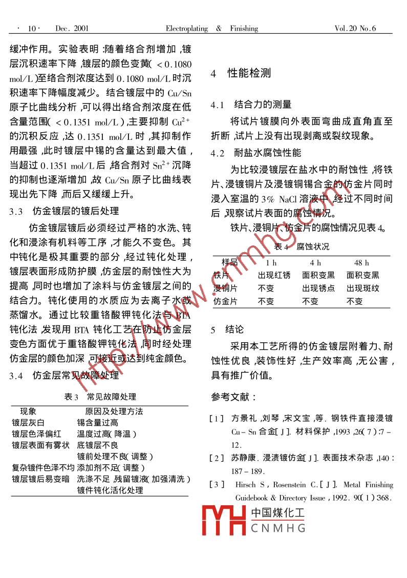 Dec.2001Electroplating FinishinVol 20 No 6文章編號(hào):1001-227X2001)6-0008-03工藝技術(shù)浸漬鍍仿金工藝鐘萍,黃先威湖南工程學(xué)院化學(xué)化工系湖南湘潭41101)摘要采用硫酸銅、硫酸亞錫為主鹽的置換反應(yīng)浸鍍法在鋼鐵件表面制得金黃色銅錫合金層。通過添加含氟系陰離子及羧基系陰離子的絡(luò)合劑控制銅、錫離子的置換反應(yīng)速度獲得15%~39%銅含量的合金鍍層外觀呈18~22K金色膜層結(jié)合力好耐蝕性優(yōu)良。關(guān)鍵詞浸漬鍍;仿金;置換反應(yīng)中圖分類號(hào):TG1744:TQ153文獻(xiàn)標(biāo)識(shí)碼Gold imitation deposition by immersion platingZHONG Pin, HUANG Xian-wei(Dept. of Chemistry and Chemical Engineering Hunan Inst. of Engineering Xiangtan 411101, ChinaAbstract Golden copper- tin alloy deposit was obtained on surface of steel and iron articles by immersion plating process with exchange reaction in which copper sulfate and stannous sulfate was used as main salt. By addition of chelating agent containing fluoride and carboxyl anion, rate ofge reaction for cupric and stannouions could be controlled. Copper-tin alloy with 15%0-39% copperhas 18 to 22 K golden appearanceand corrosion resistance can be depositedKeywords immersion plating gold imitation exchange reaction少、效率高、成本低、操作簡(jiǎn)單、分散能力、深1前言鍍能力佳瘕鍍層色調(diào)一致但是置換反應(yīng)因其速度太快形成的鍍層大都為粗糙疏松的化學(xué)鍍仿金的類型有兩種,種是使用多孔和結(jié)合力不良的鍍層。如果能很好控還原劑的化學(xué)還原型所形成的鍍膜一般為置換應(yīng)的諫度也可獲得光亮細(xì)致且結(jié)赤褐色或色澤不好的金色其鍍膜的附著力中國煤化工良據(jù)化學(xué)熱力學(xué)與動(dòng)差。浸鍍即置換鍍或接觸鍍是一種無需外CNMH換銅與錫是完全可能界電流或還原劑利用兩種金屬的電位差產(chǎn)的而通過對(duì)工藝的調(diào)整,調(diào)節(jié)鍍膜中生的電動(dòng)勢(shì)驅(qū)動(dòng)的置換反應(yīng)。浸漬鍍?cè)O(shè)備SmCu含量比可獲得不同色澤的仿金層2]。本文介紹以硫酸銅、硫酸亞錫為主鹽的含有收稿日期2001-08-20氟系陰離子及羧基系陰離子的浸鍍金黃色200年12月電鍍與涂飾第20卷第6期銅錫合金工藝它可以荻得18~22K金黃色0.1860mol/L時(shí)浸鍍層呈銅紅色,硫酸亞錫的鍍層很適于生產(chǎn)應(yīng)用。的濃度在0.2326~0.4186molL時(shí)漫鍍層呈仿金色。它的含銅量在61%~85%之間2實(shí)驗(yàn)當(dāng)硫酸亞錫的濃度大于0.4186mol/L時(shí)浸鍍層的色澤無明顯變化。2.1工藝流程3.1.2硫酸銅的影響堿性除油→亠熱水洗→≯水洗→酸洗除銹硫酸銅是浸鍍仿金液的主鹽。為探討水洗→化學(xué)拋光→水洗→10%鹽酸弱浸Cu2+的含量對(duì)鍍層色澤的影響在固定硫酸蝕→水洗→鍍光亮鎳→水洗→活化→水洗亞錫濃度為0.3721mol/L的條件下改變硫浸鍍→水洗→鈍化亠水洗一吹干封閉酸銅的濃度用目測(cè)法觀察鍍層的色澤隨硫酸銅濃度的變化結(jié)果如表2所2.2浸鍍基礎(chǔ)配方與操作條件表2硫酸銅濃度對(duì)鍍層色澤的影響硫酸亞鏍SnSO4)0.300mol/LnoV/I顏色硫酸鋮CuSO;H2O)0.007mol/L0.0016含氟系陰離子的酸.340mol/L0.0032白白羧酸0.080mol/L0.0048淺金色時(shí)間0.006410~15min淺金色0.0080金黃色溫度室溫0.0096金黃色0.0112金黃色3實(shí)驗(yàn)結(jié)果與討論0.0128銅紅色由表2可知,當(dāng)硫酸銅的濃度低于3.1主鹽的影響0.0032mo/L時(shí),鍍層呈錫的白色。硫酸銅3.1.1硫酸亞錫的影響的含量高于0.0120mol/L時(shí),鍍層呈銅紅硫酸亞錫是浸鍍仿金的主鹽,為探討鍍色。硫酸銅濃度在0.0032~-0.0120mol/L液中sn2+的含量對(duì)鍍層色澤的影響在其他時(shí)鍍層才呈仿金色。這說明CSO4的含量條件固定的情況下改變硫酸亞錫的濃度,對(duì)仿金層的色澤有很大影響這是由于Fe用目測(cè)法觀察鍍層的色澤隨硫酸亞錫濃度Cur2+之間的置換反應(yīng)較Fe/Sn2+間的反應(yīng)快的變化如表1所示得多的緣故。因此要穩(wěn)定地獲得仿金色浸表1硫酸亞錫濃度對(duì)鍍層色澤的影響鍍層就要嚴(yán)格控制硫酸銅的濃度。濃度molL顏色3.2絡(luò)合劑的影響銅紅用金屬鐵置換銅比置換錫快得多,因此0.139銅紅淺紅在簡(jiǎn)單的(n2+、Sn2+鹽溶液中難以獲得含銅0.2326金色中國煤化工層只有當(dāng)C12+的置0.2791金色CNMH(引或者是sn2+的置換0.3256金色反應(yīng)受到適當(dāng)?shù)拇龠M(jìn)時(shí),才能獲得含銅量較金黃0.4186金黃低的金色仿金層。本實(shí)驗(yàn)采用加入一種羧酸與含氟系陰離子的酸作為絡(luò)合劑來調(diào)節(jié)由表1可見,當(dāng)硫酸亞錫的濃度低于仿金鍍層的沉積速度與顏色并對(duì)pH值有10·Dec.2001Electroplating FinishinVol 20 No 6緩沖作用。實(shí)驗(yàn)表明隨著絡(luò)合劑增加,鍍層沉積速率下降鍍層的顏色變黃<0.1080mo/L)至絡(luò)合劑濃度達(dá)到0.1080m/L時(shí)沉4性能檢測(cè)積速率下降幅度減少。結(jié)合鍍層中的Cu/Sn原子比曲線分析可以得出絡(luò)合劑濃度在低4.1結(jié)合力的測(cè)量含量范圍(<0.1351mo/L)主要抑制Cun2+將試片鍍膜向外表面彎曲成直角直至的沉積反應(yīng),達(dá)0.1351moL時(shí),其抑制作折斷試片上沒有出現(xiàn)剝離或裂紋現(xiàn)象。用最強(qiáng)此時(shí)鍍層中錫的含量達(dá)到最大值,4.2耐鹽水腐蝕性能當(dāng)超過0.1351mo/L后絡(luò)合劑對(duì)Sn2+沉降為比較浸鍍層在鹽水中的耐蝕性將鐵的抑制也逐漸增加故CuSn