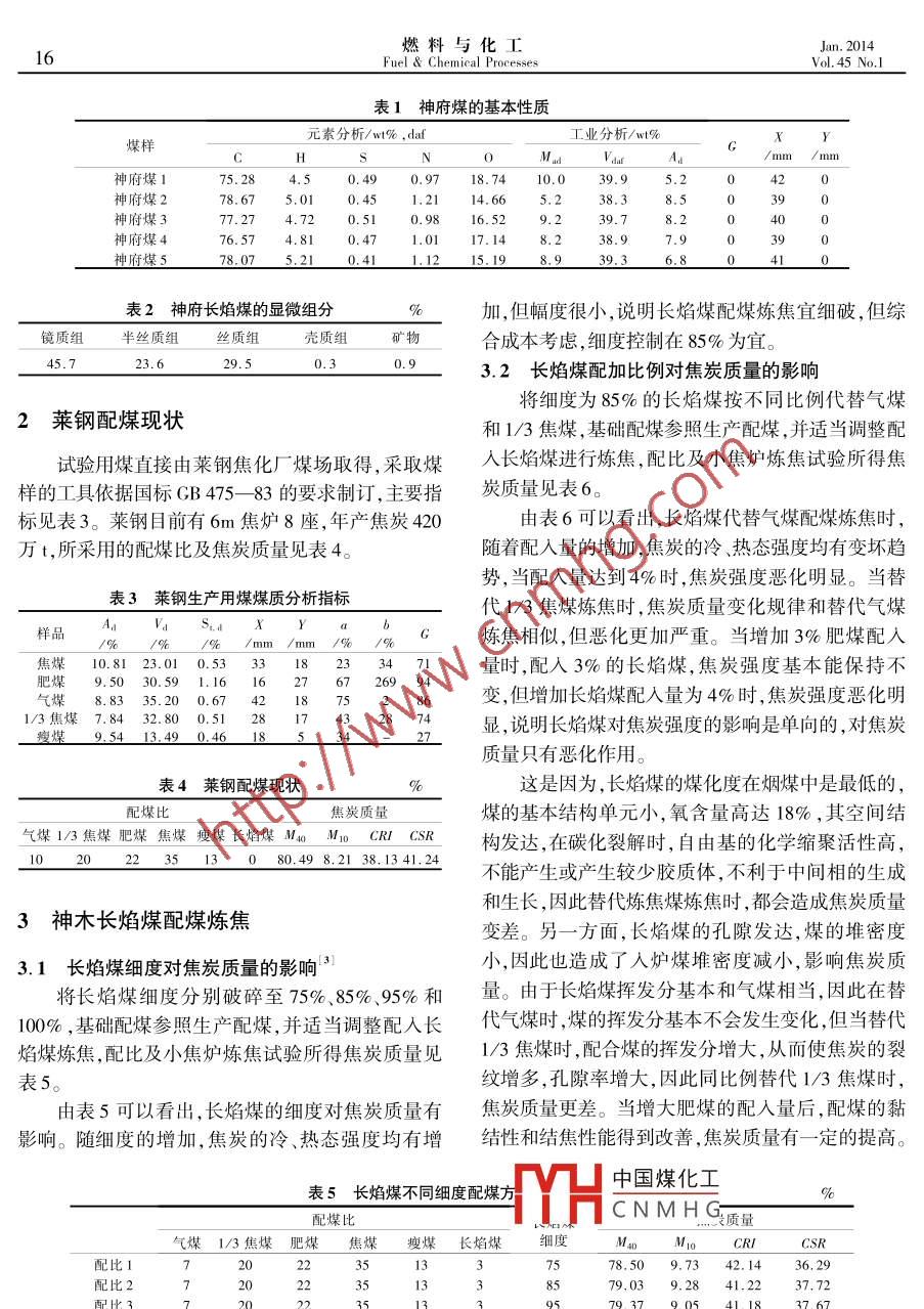 燃料與化工第45卷第1期Fuel & Chemical Processes5長(zhǎng)焰煤配煤煉焦的研究種振宇王長(zhǎng)寶(萊蕪鋼鐵集團(tuán)有限公司技術(shù)中心,萊蕪271105 )摘要:在對(duì)神府長(zhǎng)焰煤基礎(chǔ)性質(zhì)研究的基礎(chǔ)上,基于現(xiàn)有配煤方案,通過(guò)添加神府長(zhǎng)焰煤替代部分1/3焦煤和氣煤進(jìn)行配煤煉焦試驗(yàn),結(jié)果表明,在增加肥煤配比時(shí)可以用長(zhǎng)焰煤替代部分1/3 焦煤和氣煤,有利于降低焦炭的硫分和灰分,擴(kuò)大煉焦煤資源,降低配煤成本。關(guān)鍵詞:焦炭;長(zhǎng)焰煤;配煤中圖分類號(hào): TQ520.62 .文獻(xiàn)標(biāo)識(shí)碼: A文章編號(hào): 1001-3709 (2014) 01-0015-03Study on cokemaking with blending long flame coalChong Zhenyu W ang Changbao( Technology Center of Laiwu lron & Steel Group Co ., Ltd, Laiwu 271105 ,China)Abstract: Based on the properties analysis of long flame coal . We added long flame coal to replacepart of 1/3 coking coal and gas coal for cokemaking test according to the present coal blendingscheme. The result shows that long flame coal can replace part of 1/3 coking coal and gas coal forcokemaking when increasing the mass percentage of fat coal . This will be beneficial for reducing sul -fur and ash content in coke , saving the coking coal resources and lowering the coal blending cost .Key words: Coke; Long flame coal ; Coal blending我國(guó)煤炭資源儲(chǔ)量大,種類全,但各種煤所占比性高 ,熱穩(wěn)定性差,煤中的化合物較多,結(jié)焦性差。例差別較大,分布也不均勻。氣煤、長(zhǎng)焰煤弱黏煤、煤的化學(xué)、工藝性質(zhì)與含氧官能團(tuán)的種類和數(shù)量有不黏煤、無(wú)煙煤儲(chǔ)量多,而肥煤、焦煤資源較少。其關(guān),煤有機(jī)質(zhì)的組成原子中氧起著特殊的作用。若中長(zhǎng)焰煤、不黏煤、弱黏煤約占全國(guó)煤炭?jī)?chǔ)量的能在不破壞煤分子基本結(jié)構(gòu)的條件下,脫除煤分子25% ,且- -般是低灰、低硫煤,價(jià)格低廉,其中少數(shù)煤中具化學(xué)活性的含氧基團(tuán)及低分子化合物,將有可種還具有特低灰、特低硫和特低磷等特點(diǎn)。近年來(lái),能改善弱黏煤的性質(zhì),提高其利用價(jià)值。隨著我國(guó)煉焦工業(yè)的迅速發(fā)展,煉焦煤資源短缺的1神府 長(zhǎng)焰煤性能.矛盾日益突出,為了擴(kuò)大煉焦煤源,出現(xiàn)了各種煉焦新工藝新技術(shù),其中,在配煤中增加弱黏煤或不黏神府煤是指神府東勝礦區(qū)的煤,神府東勝礦區(qū)煤的比例是主要的研究方向之- .中 。因此,在煉焦是我國(guó)目前已探明儲(chǔ)量最大的煤田,已探明2300配煤中,在滿足高爐用焦質(zhì)量的前提下增加弱黏煤億t,位列世界八大煤田之一。煤類以不黏煤、長(zhǎng)焰的配入量,對(duì)于降低焦炭的灰分、硫分,擴(kuò)大煉焦煤煤為主,屬特低硫、特低灰特低磷、中高發(fā)熱量高源具有重要意義2。揮發(fā)分煤,是世界上少有的優(yōu)質(zhì)動(dòng)力用煤和化工用弱黏煤本身的結(jié)構(gòu)和性質(zhì)決定了它們的黏結(jié)性煤,其價(jià)格相對(duì)煉焦煤(如氣煤)便宜近1倍。從產(chǎn)較差(甚至沒(méi)有),從而限制了它們?cè)诔R?guī)煉焦配煤量較大的5個(gè)礦點(diǎn)進(jìn)行取欄,然后進(jìn)行基本性質(zhì)分中的配用量。研究表明,高揮發(fā)分弱黏煤的分子結(jié)析,中國(guó)煤化工分析見(jiàn)表2??梢钥礃?gòu)中芳香環(huán)縮合程度較小,但橋鍵側(cè)鏈和官能團(tuán)較出,著THCNMH G% ,S含量低于0.51%,多,夾雜的低分子化合物較多,結(jié)構(gòu)無(wú)方向性,孔隙屬于低硫、低灰煤;神府煤中主要含有鏡質(zhì)組、絲質(zhì)組率和比表面積較大,使得弱黏煤的含氧量高,化學(xué)活和半絲質(zhì)組,而殼質(zhì)組含量很少。收稿日期: 2013-05-13作者簡(jiǎn)介:種振宇(1980-), 男,工程師燃料與化工Jan. 201416Fuel & Chemical ProcssesVol. 45 No.1表1神府煤的基本性質(zhì)煤樣元素分析/wt% ,daf工業(yè)分析/wt%GH_S_N0MadVaA/mm / mm神府煤14.50.490.9718.7410.05.42神府煤278.675. 010.45! .2114.665.238.38. 539神府煤377.274.720.510.9816. 529.239.78.240神府煤476. 574.810.471.0117.1438. 97.9神府煤578.07_ 5. 210.411.1215.198.939. 36.8_4__(表2神府長(zhǎng)焰煤的顯微組分%加,但幅度很小,說(shuō)明長(zhǎng)焰煤配煤煉焦宜細(xì)破,但綜鏡質(zhì)組半絲質(zhì)組絲質(zhì)組殼質(zhì)組礦物合成本考慮,細(xì)度控制在85%為宜。45.723.629.50.30.93.2長(zhǎng)焰煤配加比 例對(duì)焦炭質(zhì)量的影響將細(xì)度為85%的長(zhǎng)焰煤按不同比例代替氣煤2萊 鋼配煤現(xiàn)狀和1/3焦煤,基礎(chǔ)配煤參照生產(chǎn)配煤,并適當(dāng)調(diào)整配試驗(yàn)用煤直接由萊鋼焦化廠煤場(chǎng)取得,采取煤人長(zhǎng)焰煤進(jìn)行煉焦,配比及小焦?fàn)t煉焦試驗(yàn)所得焦樣的工具依據(jù)國(guó)標(biāo)GB 475- -83 的要求制訂,主要指炭質(zhì)量見(jiàn)表6。標(biāo)見(jiàn)表3。萊鋼目前有6m焦?fàn)t8座,年產(chǎn)焦炭420由表6可以看出,長(zhǎng)焰煤代替氣煤配煤煉焦時(shí),萬(wàn)t,所采用的配煤比及焦炭質(zhì)量見(jiàn)表4。隨著配人量的增加,焦炭的冷、熱態(tài)強(qiáng)度均有變壞趨勢(shì),當(dāng)配人量達(dá)到4%時(shí),焦炭強(qiáng)度惡化明顯。當(dāng)替表3萊鋼生產(chǎn)用煤煤質(zhì)分析指標(biāo)代1/3焦煤煉焦時(shí),焦炭質(zhì)量變化規(guī)律和替代氣煤樣品A,/4SuuXY/mm /mm /9/q煉焦相似,但惡化更加嚴(yán)