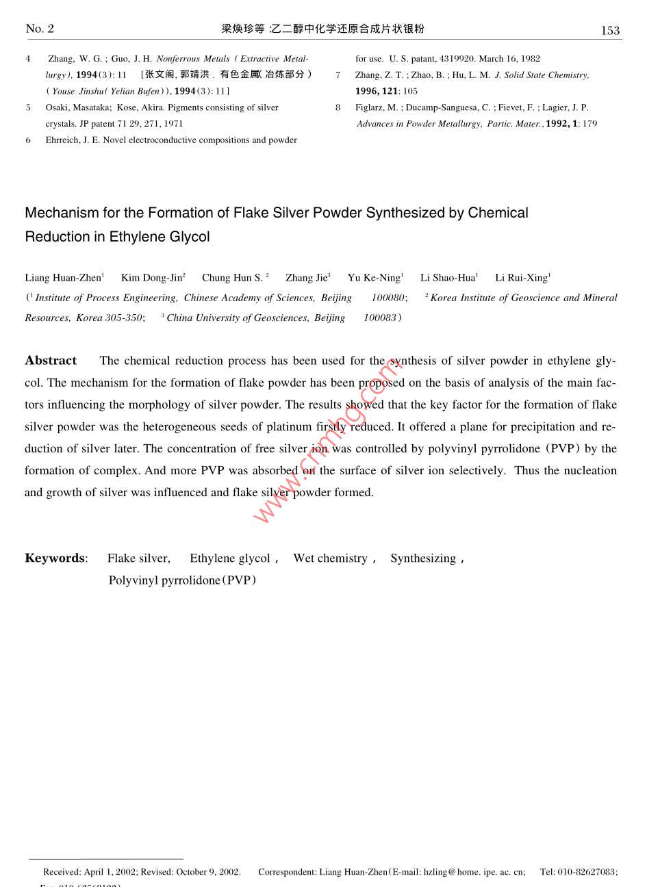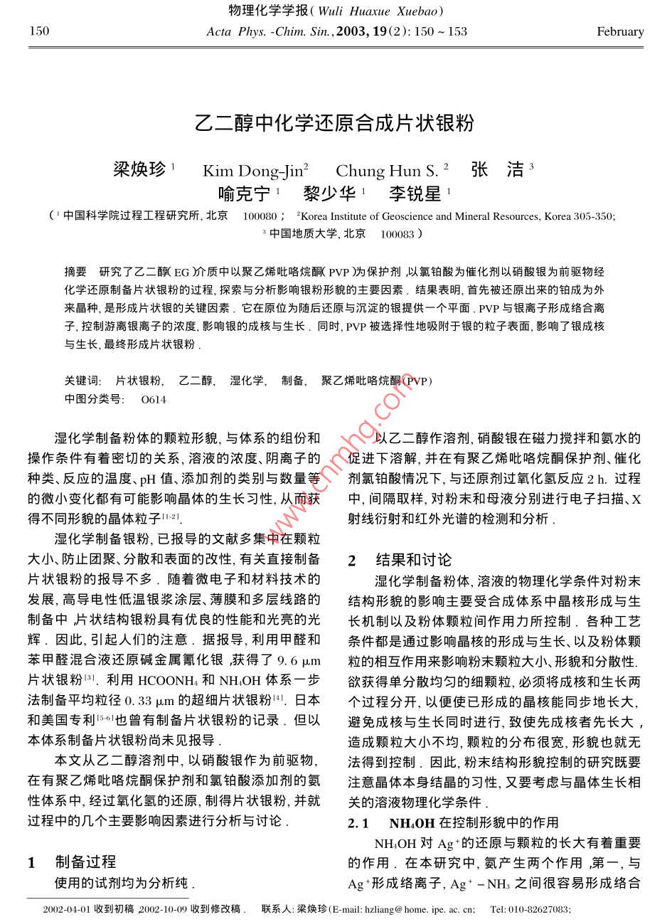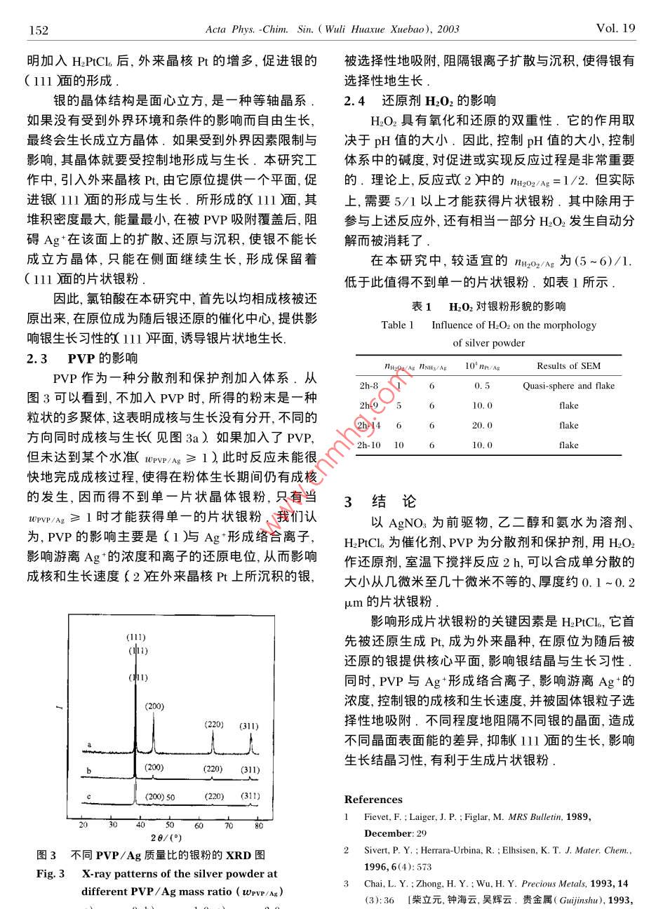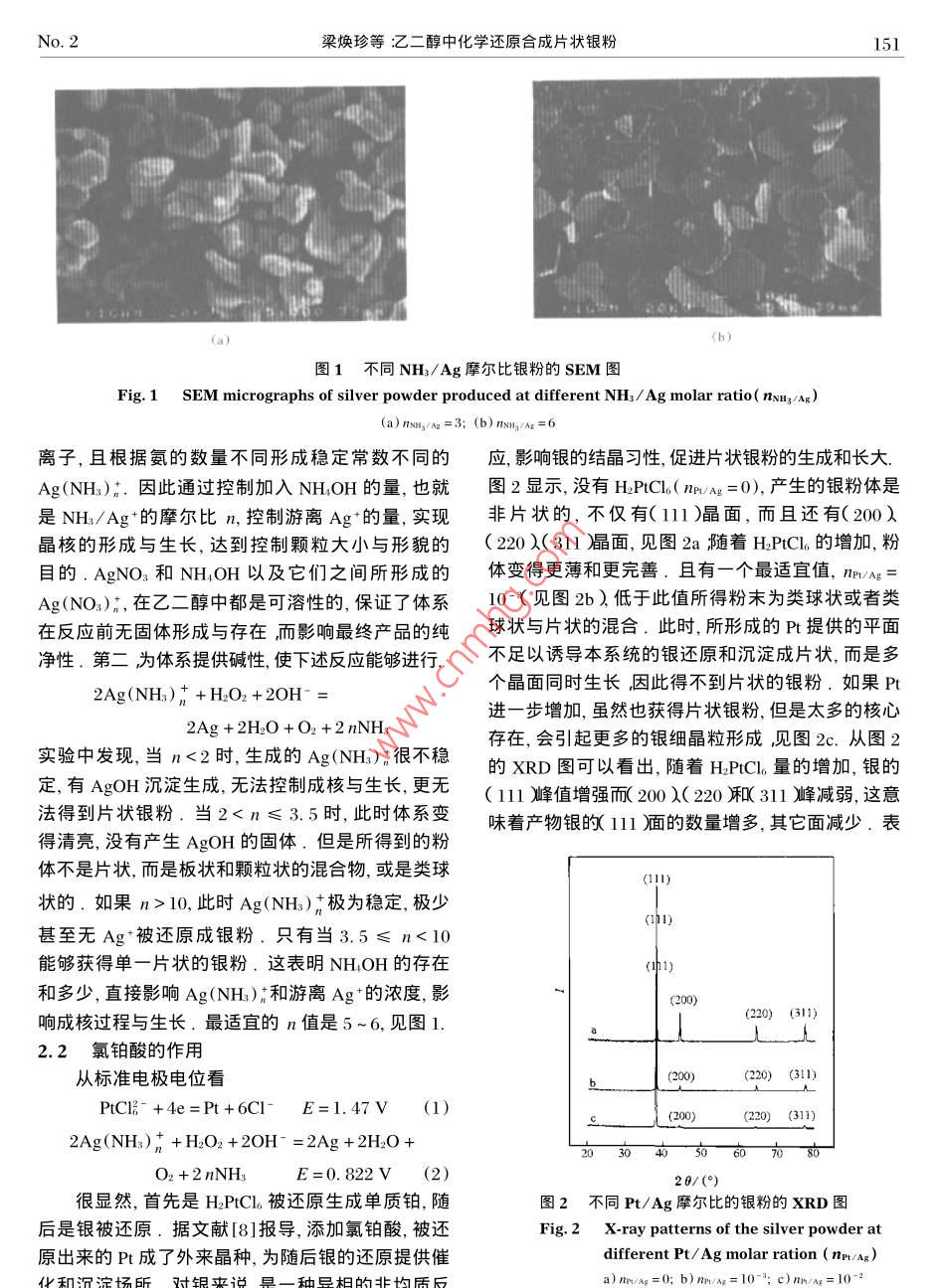 物理化學(xué)學(xué)報(bào)( Wuli Huaxue Xuebao)150 Acta Phys.-him.sin.,2003,19(2):150~153 February乙二醇中化學(xué)還原合成片狀銀粉梁煥珍1 Kim Dong-Jin2 Chung Hun.2張潔3喻克寧黎少華李銳星(中國科學(xué)院過程工程研究所北京100080 Korea Institute of Geoscience and Mineral Resources, Korea 3305-3503中國地質(zhì)大學(xué),北京100083)摘要研究了乙二醇(EG價(jià)質(zhì)中以聚乙烯吡咯烷酮(PVP)為護(hù)劑以氯鉑酸為催化劑以硝酸銀為前驅(qū)物經(jīng)化學(xué)還原制備片狀銀粉的過程探索與分析影響銀粉形貌的主要因素.結(jié)果表明,首先被還原出來的鉑成為外來晶種是形成片狀銀的關(guān)鍵因素,它在原位為隨后還原與沉淀的銀提供一個(gè)平面.PVP與銀離子形成絡(luò)合離子,控制游離銀離子的濃度,影響銀的成核與生長同時(shí),PVP被選擇性地吸附于銀的粒子表面,影響了銀成核與生長,最終形成片狀銀粉關(guān)鍵詞:片狀銀粉,乙二醇,濕化學(xué),制備,聚乙烯吡咯烷酮(VP)中圖分類號(hào):0614濕化學(xué)制備粉體的顆粒形貌,與體系的組份和以乙二醇作溶劑,硝酸銀在磁力攪拌和氨水的操作條件有著密切的關(guān)系溶液的濃度、陰離子的促進(jìn)下溶解,并在有聚乙烯吡咯烷酮保護(hù)劑催化種類反應(yīng)的溫度H值添加劑的類別與數(shù)量等劑氯鉑酸情況下,與還原劑過氧化氫反應(yīng)2h.過程的微小變化都有可能影響晶體的生長習(xí)性,從而獲中,間隔取樣,對(duì)粉末和母液分別進(jìn)行電子掃描、X得不同形貌的晶體粒子21射線衍射和紅外光譜的檢測和分析濕化學(xué)制備銀粉,已報(bào)導(dǎo)的文獻(xiàn)多集中在顆粒大小、防止團(tuán)聚、分散和表面的改性,有關(guān)直接制備2結(jié)果和討論片狀銀粉的報(bào)導(dǎo)不多,隨著微電子和材料技術(shù)的濕化學(xué)制備粉體,溶液的物理化學(xué)條件對(duì)粉末發(fā)展,高導(dǎo)電性低溫銀漿涂層、薄膜和多層線路的結(jié)構(gòu)形貌的影響主要受合成體系中晶核形成與生制備中片狀結(jié)構(gòu)銀粉具有優(yōu)良的性能和光亮的光長機(jī)制以及粉體顆粒間作用力所控制.各種工藝輝.因此,引起人們的注意.據(jù)報(bào)導(dǎo),利用甲醛和條件都是通過影響晶核的形成與生長、以及粉體顆苯甲醛混合液還原堿金屬氰化銀獲得了9.6μm粒的相互作用來影響粉末顆粒大小、形貌和分散性片狀銀粉.利用 HCOONH4和NHOH體系一步欲獲得單分散均勻的細(xì)顆粒,必須將成核和生長兩法制備平均粒徑0.33μm的超細(xì)片狀銀粉41.日本個(gè)過程分開,以便使已形成的晶核能同步地長大,和美國專利5也曾有制備片狀銀粉的記錄.但以避免成核與生長同時(shí)進(jìn)行,致使先成核者先長大,本體系制備片狀銀粉尚未見報(bào)導(dǎo).造成顆粒大小不均,顆粒的分布很寬,形貌也就無本文從乙二醇溶劑中,以硝酸銀作為前驅(qū)物,法得到控制.因此粉末結(jié)構(gòu)形貌控制的研究既要在有聚乙烯吡咯烷酮保護(hù)劑和氯鉑酸添加劑的氨注意晶體本身結(jié)晶的習(xí)性,又要考慮與晶體生長相性體系中經(jīng)過氧化氫的還原制得片狀銀粉,并就關(guān)的溶液物理化學(xué)條件過程中的幾個(gè)主要影響因素進(jìn)行分析與討論2.1NH4OH在控制形貌中的作用NH4OH對(duì)Ag+的還原與顆粒的長大有著重要1制備過程的作用.在本研究中,氨產(chǎn)生兩個(gè)作用,第一,與使用的試劑均為分析純Ag+形成絡(luò)離子,Ag+-NH3之間很容易形成絡(luò)合2002-04-01收到初稿2002-10-09收到修改稿.聯(lián)系人:梁煥珍(E-mai hzlianghome.ipe.ac.cnTel:010-82627083 No.2梁煥珍等乙二醇中化學(xué)還原合成片狀銀粉151圖1不同NH3/Ag摩爾比銀粉的SEM圖 Fig. 1 SEM micrographs of silver powder produced at different NH3/ Ag molar ratio( nNHz/As) (a)/ 3: b),/=6離子,且根據(jù)氨的數(shù)量不同形成穩(wěn)定常數(shù)不同的應(yīng),影響銀的結(jié)晶習(xí)性,促進(jìn)片狀銀粉的生成和長大Ag(NH3)因此通過控制加入NH4OH的量,就圖2顯示,沒有H2PtCl(n/g=0),產(chǎn)生的銀粉體是是NH/Ag+的摩爾比n,控制游離Ag+的量,實(shí)現(xiàn)非片狀的,不僅有(111)晶面,而且還有(200晶核的形成與生長,達(dá)到控制顆粒大小與形貌的(220)(311)晶面,見圖2a隨著H2PtCl的增加,粉目的.AgNO3和NHOH以及它們之間所形成的體變得更薄和更完善.且有一個(gè)最適宜值,npgAg(NO)在乙二醇中都是可溶性的,保證了體系10-(見圖2b)低于此值所得粉末為類球狀或者類在反應(yīng)前無固體形成與存在,而影響最終產(chǎn)品的純球狀與片狀的混合此時(shí),所形成的Pt提供的平面凈性.第二為體系提供堿性,使下述反應(yīng)能夠進(jìn)行不足以誘導(dǎo)本系統(tǒng)的銀還原和沉淀成片狀而是多個(gè)晶面同時(shí)生長因此得不到片狀的銀粉如果Pt進(jìn)一步增加,雖然也獲得片狀銀粉,但是太多的核心 2Ag+2H20+O2+2 nNH3實(shí)驗(yàn)中發(fā)現(xiàn),當(dāng)n<2時(shí),生成的Ag(NH3)很不穩(wěn)存在,會(huì)引起更多的銀細(xì)晶粒形成見圖2c.從圖2的XRD圖可以看出,隨著H2PtCl量的增加,銀的定,有AgOH沉淀生成,無法控制成核與生長,更無(11)增強(qiáng)(200)(220311峰減弱,這意法得到片狀銀粉.當(dāng)210,此時(shí)Ag(NH3)極為穩(wěn)定,極少1)甚至無Ag+被還原成銀粉.只有當(dāng)3.5≤n<10能夠獲得單一片狀的銀粉,這表明NHOH的存在(1)和多少,直接影響Ag(NH3)和游離Ag+的濃度,影200響成核過程與生長,
