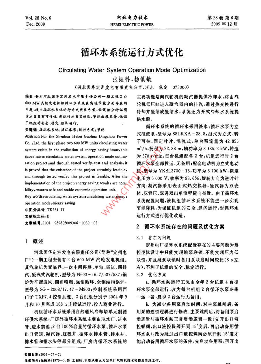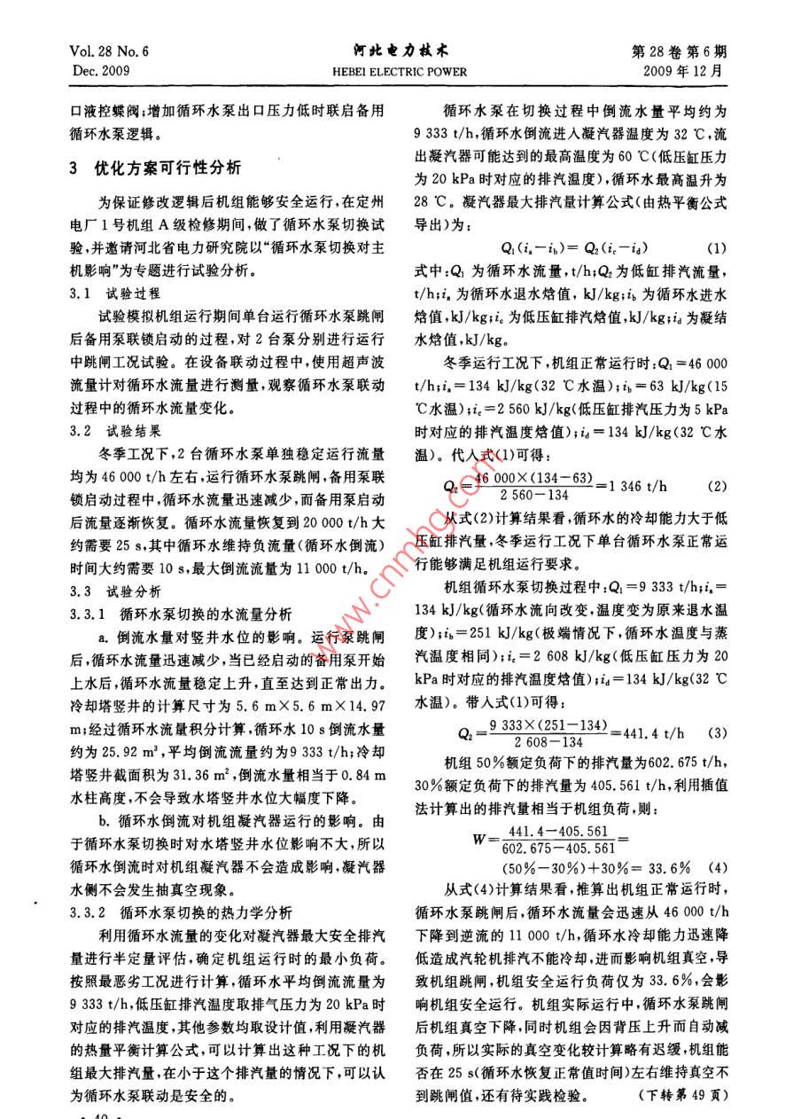 Vol. 28 No 6河此電力軾術(shù)第28卷第6期Dec.2009HEBEI ELECTRIC POWER2009年12月循環(huán)水系統(tǒng)運行方式優(yōu)化Circulating Water System Operation Mode Optimization張振科,楊慎敏(河北國華定洲發(fā)電有限責(zé)任公司,河北保定073000摘要:針對河北國華定洲發(fā)電有限貴任公司一期工程2臺主要功能是向汽輪機的凝汽器提供冷卻水,將由汽600MW汽輪發(fā)電機組循環(huán)水系統(tǒng)在實現(xiàn)節(jié)能方面存在的輪機低壓缸進入凝汽器內(nèi)的排汽,通過熱交換進行問題,提出循環(huán)水系統(tǒng)運行方式優(yōu)化方案,經(jīng)試驗分析證明冷卻并凝結(jié)成凝結(jié)水,系統(tǒng)還為開式冷卻水系統(tǒng)提該方案具有可行性,新運行方案實施后,節(jié)能效果顯著,保證了機組的安全、穗定、經(jīng)濟運行。供水源。關(guān)鍵詞:循環(huán)水系統(tǒng);循環(huán)水泵;運行方式;節(jié)能循環(huán)水系統(tǒng)的循環(huán)水采用淡水;循環(huán)水泵為立Abstract: For the Shenhua Hebei Guohua Dingzhou Power式混流泵,型號為88LKXA-28.8,型式為立式、轉(zhuǎn)co. Ltd. the first phase two6o0 MW units circulating water子可抽、固定葉片、混流式,單臺泵流量為42855system exists in the realization of energy saving issue,thim3/h,揚程為2238m,軸功率為31852kW轉(zhuǎn)速paper raises circulating water system operation mode optimi-為370r/min,每臺機組配備2臺,機組遠行時2臺zation project, and through tested verify, test and analysis,it循環(huán)水泵全部投運,無備用;配套電動機為立式電動is proved that the existence of the project certainly feasible,機,型號為YKSL3700-16,功率為3700kW額定and through tested verify this project is feasible. After the電壓為6000V效率為93.6%旋轉(zhuǎn)方向為逆時針implementation of the project, energy saving results are nota方向;凝汽器采用表面式熱交換器,凝汽器為雙殼bility, ensures safe and stable economic operation unit.Key words: circulating water system; circulating water pum體、雙背壓、雙進雙出單流程橫向布置。由于循環(huán)水operation mode; energy saving系統(tǒng)配置問題,該機組循環(huán)水系統(tǒng)不能進一步實現(xiàn)中圖分類號:TK264.11節(jié)能降耗,為保證機組的安全、經(jīng)濟運行,對循環(huán)水文獻標志碼:B運行方式進行優(yōu)化改造。文章編號:1001-9898(2009)06-0039-022循環(huán)水系統(tǒng)存在的問題及優(yōu)化方案1概述2.1存在的問題定州電廠循環(huán)水系統(tǒng)配置存在的主要問題為熱河北國華定洲發(fā)電有限責(zé)任公司(簡稱“定州電控邏輯設(shè)計中只能實現(xiàn)跳泵聯(lián)鎖,不能實現(xiàn)壓力低廠”)一期工程安裝有2臺600MW汽輪發(fā)電機組。聯(lián)鎖并且跳泵聯(lián)鎖時備用泵聯(lián)啟時間較長(8s左其汽輪機為亞臨界、一次中間再熱、單軸、四缸、四排右),不利于機組的安全穩(wěn)定運行。汽凝汽式汽輪機型號為N600-16.7/537/537;鍋2.2優(yōu)化方案爐為平衡通風(fēng)、四角噴燃、強制循環(huán)、全鋼結(jié)構(gòu)鍋爐a.循環(huán)水泵運行工況由全年2臺機組4臺循型號為SG-2008/17.47-M903;控制系統(tǒng)采用西環(huán)水泵全部運行,改為每臺機組2臺循環(huán)水泵冬季門子TXP74控制系統(tǒng)。2臺機組分別于2004年9一運一備,夏季2臺運行無備用。月和10月完成168h連續(xù)試運行,投入商業(yè)運行。b.為減少備用泵啟動時間,對主泵跳閘后,備機組循環(huán)水系統(tǒng)采用自然通風(fēng)冷卻塔單元制循用泵的連鎖邏輯進行修改:主泵跳閘后,將備用泵啟環(huán)供水系統(tǒng),廠房外循環(huán)水系統(tǒng)主要由取水口、進水動邏輯與循環(huán)水泵正常啟動邏輯一致(先開出口液管、進水前池、2臺100%容量的循環(huán)水泵、循環(huán)水泵控蝶閥,出口液控蝶閥開到15度后,再啟動備用循出口管道、凝汽器、虹吸井、循環(huán)水排水管、排水井、環(huán)水泵),改為跳過出口液控蝶閥必須開到15°度才排水管和排水頭等部分組成;廠房內(nèi)循環(huán)水系統(tǒng)的能啟動備用循環(huán)水泵的條件,先啟動備用泵再開出收稿日期:200907-01作者簡介:張振科(1970—)男,工程師主要從事火力發(fā)電廠汽輪機技術(shù)檢修及管理工作VoL 28 No 6阿此電力軾木第28卷第6期Dec.2009HEBEI ELECTRIC POWER2009年12月口液控蝶閥;增加循環(huán)水泵出口壓力低時聯(lián)啟備用循環(huán)水泵在切換過程中倒流水量平均約為循環(huán)水泵邏輯。9333t/h,循環(huán)水倒流進入凝汽器溫度為32℃,流3優(yōu)化方案可行性分析出凝汽器可能達到的最高溫度為60℃(低壓缸壓力為20kPa時對應(yīng)的排汽溫度),循環(huán)水最高溫升為為保證修改邏輯后機組能夠安全運行,在定州28℃。凝汽器最大排汽量計算公式(由熱平衡公式電廠1號機組A級檢修期間,做了循環(huán)水泵切換試導(dǎo)出)為:驗,并邀請河北省電力研究院以“循環(huán)水泵切換對主Q, (i, -ib)=Q2 (ic-ia)(1)機影響”為專題進行試驗分析。式中:Q為循環(huán)水流量,t/h;Q2為低缸排汽流量,31試驗過程t/h;i為循環(huán)水退水焓值,kJ/kg;i為循環(huán)水進水試驗?zāi)M機組運行期間單臺運行循環(huán)水泵跳閘焓值kJ/kg;i為低壓缸排汽焓值,kJ/kg;i為凝結(jié)后備用泵聯(lián)鎖啟動的過程,對2臺泵分別進行運行水焓值,kJ/kg中跳閘工況試驗。在設(shè)備聯(lián)動過程中,使用超聲波冬季運行工況下,機組正常運行時:Q1=46000流量計對循環(huán)水流量進行