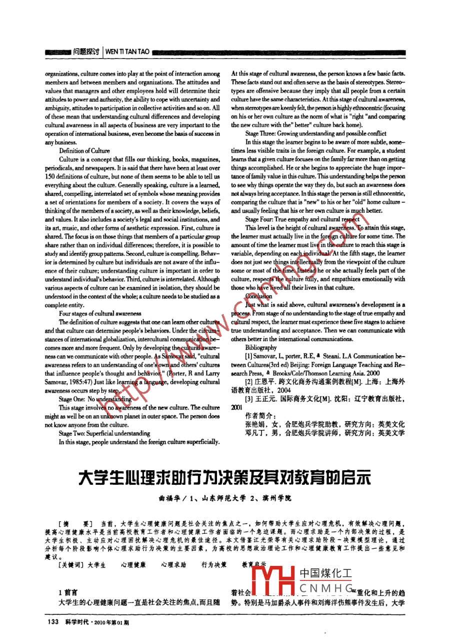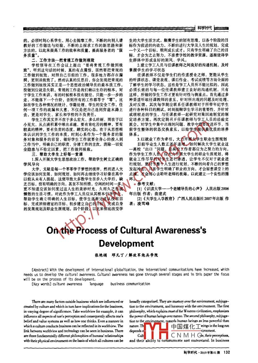 科學時代a P的。必須時刻心系學生,用心去揣摩工作,不斷的向別人請 生的大學生活方式,顛覆學生的固有思維,以各個階段的目教好的工.作做法與經(jīng)驗,不斷的去探求工作的新思路和新標作 為前進的內(nèi)動力,不斷的進行大學及人生的規(guī)劃,完成方法的,以此來提高T.作的效率和質(zhì)量,提高服務者的“服一個又一個目標,順利成長成才。只有學生明確了自己的目務質(zhì)量"標,才會為之去努力,不浪費學校的教學資源,逐漸使得學二工作方法-把常規(guī)工作做到極致生群體中形成良好的班風、學風。學校領(lǐng)導在工作會議上提出“要將常規(guī)工作做到極2.建立學工人員與任課教師之間良好的溝通機制,及時致", 聽到這句話的時候,真的有點震驚,居然要把常規(guī)的掌握學生的學習狀態(tài)工作做到極致,對照自己目前的工作,很多地方都存在漏任課教師不僅是學生們的傳道授業(yè)之師,更能從學生洞,更別談極致了。然而認真的反思后,你會發(fā)現(xiàn)把常規(guī)的的聽課狀態(tài)、課堂表現(xiàn)、課后作業(yè)、考試成績等方面全面的工作做到極致其實正是一個思想政治輔導員的最本質(zhì)工作,了解學生的學習狀態(tài),這些是學工人員所不能比擬的,因此沒做到位就是失職,常規(guī)的工作是我們賴以生存的根本,對必須 長效的與每-位任課教師建立良好的溝通機制,只有于學生工作來講,有的時候根本沒有捷徑,只能一一步一步的這樣,所做的學生工作才更有針對性與側(cè)重點。首先通過多走,不能落下一個臺階,否則所有的工作都等于“零”,比種渠道聽取任課教師的意見,針對所出現(xiàn)的問題及時處理、如在學生各種情況的統(tǒng)計、學籍處理、學生的安全工作,任及時反饋。其次每學期應聯(lián)系任課教師對于所帶年紀學生何一項工作的疏漏和大意,不僅是把自己送到窮途末路上進行各種科 目的測試,時刻提醒學生學習的重要性,并針對去,更是對學生、家長和學校的不負責任。成績較差的學生,與任課教師一起研究對策因地制宜的制學生工作其實并不在于多么宏大、多么壯麗、而在于以定培養(yǎng)方 案。再次定期開開任課教師與學工人員的經(jīng)驗交小見大,從點滴積累中堆出卓越,要有肯吃苦的精神,要有流會, 對學生中集中出現(xiàn)的問題、教學中需要改進環(huán)節(jié)、當較真的精神,要有負責的態(tài)度,踏實的心態(tài)。在于從思想根前學生整體的狀態(tài)交換意見,以給學生提供最優(yōu)質(zhì)的培養(yǎng)本認識到學生工作的本質(zhì),時刻心系作為一一個服務者的服體系 。務對象和服務的宗旨,做好學生工作就要全身心的投入到3.以就業(yè)工作為牽引,大力開展大學生職業(yè)生涯規(guī)劃工作當中,明確自己的職責,分清工作的主次,消除- -切安目前畢業(yè)生人數(shù)正逐年遞增,如何解決大學生就業(yè)這全隱患與不穩(wěn)定因素,把工作做到極致。- -高?!俺隹凇皢栴},是高校工.作者都應為之努力的方向,三、幫助大學生上好每一堂課作為學生工作人員,應大力開展大學生的職業(yè)生涯規(guī)劃,將1.深人開展大學生思想政治工作,幫助學生樹立正確的就業(yè) 工作盡早的對學生進行滲透,讓學生不僅對于就業(yè)進學風導向.行規(guī)劃,更對于整個人生進行規(guī)劃,不斷的向著自己的夢想大學,無疑是每一個莘莘學子夢想的彼岸,然而進入大發(fā)起沖擊。 只有學生明確了職業(yè)的方向,才會留意課堂上:的學應該如何發(fā)展、如何規(guī)劃、如何再去繼續(xù)學習好像在高中點滴, 才會用心去聆聽老師的牧誨,以此建立-一個良性的循以前從未有人提起,這便導致大多數(shù)學生在步人大學后,缺不。乏日標,沒有明確的方向,甚至不知所措,空閑的時間一多,更不知道應該如何度過這人生的美妙時光,久而久之形成(1] 《識讀大學一- 個老輔導員的心聲》 人民出版2006懶散的生活習慣。對此作為學工人員應從其根本引導學生,年出版 作者:曲建武幫助學生確立明確的人生目標,使學生逐漸完成從沒有目2]《大學生人學教育》廣西人民出版社2007年出版作標、完成班級寢室的目標、初步建立自己的月標、完成自身腎:凌雪峰的發(fā)展規(guī)劃及職業(yè)生涯規(guī)劃,四個階段。以此來徹底改變學On the Process of Cultural Awareness'sDevelopment張艷娟鄧凡丁1解放軍炮兵學院[Abstract] With the development of international globalization, the international comunications have increased, thichneeds us to develop the cultural awareness. Cultural awareness has gone through several stages and in this paper the focuswill be on the process of its deve lopment.[Key words] culture awarenesslanguagebusiness communicationcreated by culture and which in turn have implications for the business, tion to the environment, and harmony with the environment. The firstin varying degree of significance. Take worldview for example, it can philosophy, which explains most! of the Westem cin,n emphasiesinluence all apects of one's perception and consequently afects one's the power of human being over nature. The second philosoplay, subjuga-belief and value systems as well as how one thinks. Even a manner in tion to the envirorment. rerards human beings as less powerful thanwhich a culture conducts business can be rleced in its worldview. Thenatue.1th中國煤化工eingsin the lognlink between worddview and lchnoloy can be seen in business. There depends ovirnment.are three fundamentall