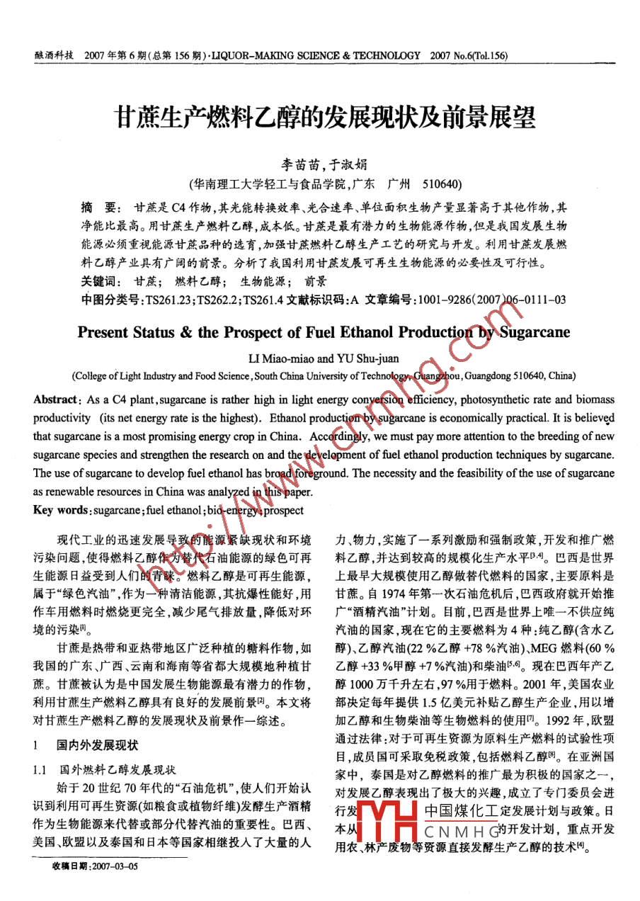 釀酒科技2007年第6期(總第156期) LIQUOR- MAKING SCIENCE& TECHNOLOGY2007No.6(Tol.156)甘蔗生產(chǎn)燃料乙醇的發(fā)展現(xiàn)狀及前景展望李苗苗,于淑娟(華南理工大學(xué)輕工與食品學(xué)院,廣東廣州510640)摘要:甘蔗是C4作物,其光能轉(zhuǎn)換效率、光合速率、單位面積生物產(chǎn)量顯著高于其他作物,其凈能比最高。用甘蔗生產(chǎn)燃料乙醇,成本低。甘蔗是最有潛力的生物能源作物,但是我國發(fā)展生物能源必須重視能源廿蔗品種的選育,加強(qiáng)甘蔗燃料乙醇生產(chǎn)工藝的研究與開發(fā)。利用甘蔗發(fā)展燃料乙醇產(chǎn)業(yè)具有廣闊的前景。分析了我國利用甘蔗發(fā)展可再生生物能源的必要性及可行性。關(guān)鍵詞:甘蔗;燃料乙醇;生物能源;前景中圖分類號:TS261.23;TS2622;TS2614文獻(xiàn)標(biāo)識碼:A文章編號:1001-9286(2007)06-011103resent Status the Prospect of Fuel Ethanol Production by SugarcaneLI Miao-miao and YU Shu-juan(College of Light Industry and Food Science, South China University of Technology, Guangzhou, Guangdong 510640, China)Abstract: As a C4 plant, sugarcane is rather high in light energy conversion efficiency, photosynthetic rate and biomassproductivity (its net energy rate is the highest). Ethanol production by sugarcane is economically practical. It is believedthat sugarcane is a most promising energy crop in China. Accordingly, we must pay more attention to the breeding of newsugarcane species and strengthen the research on and the development of fuel ethanol production techniques by sugarcaneThe use of sugarcane to develop fuel ethanol has broad foreground. The necessity and the feasibility of the use of sugarcaneas renewable resources in China was analyzed in this paper.Key words: sugarcane; fuel ethanol; bio-energy; prospect現(xiàn)代工業(yè)的迅速發(fā)展導(dǎo)致的能源緊缺現(xiàn)狀和環(huán)境力物力,實施了一系列激勵和強(qiáng)制政策,開發(fā)和推廣燃污染問題,使得燃料乙醇作為替代石油能源的綠色可再料乙醇,并達(dá)到較高的規(guī)?;a(chǎn)水平隊4。巴西是世界生能源日益受到人們的青睞。燃料乙醇是可再生能源,上最早大規(guī)模使用乙醇做替代燃料的國家,主要原料是屬于“綠色汽油”,作為一種清潔能源,其抗爆性能好,用甘蔗。自1974年第一次石油危機(jī)后,巴西政府就開始推作車用燃料時燃燒更完全,減少尾氣排放量,降低對環(huán)廣“酒精汽油”計劃。目前,巴西是世界上唯一不供應(yīng)純境的污染田。汽油的國家,現(xiàn)在它的主要燃料為4種:純乙醇(含水乙甘蔗是熱帶和亞熱帶地區(qū)廣泛種植的糖料作物,如醇)、乙醇汽油(22%乙醇+78%汽油)MEG燃料(0我國的廣東、廣西、云南和海南等省都大規(guī)模地種植甘乙醇+33%甲醇+7%汽油)和柴油56?,F(xiàn)在巴西年產(chǎn)乙蔗。甘蔗被認(rèn)為是中國發(fā)展生物能源最有潛力的作物,醇1000萬千升左右,97%用于燃料。2001年,美國農(nóng)業(yè)利用甘蔗生產(chǎn)燃料乙醇具有良好的發(fā)展前景。本文將部決定每年提供15億美元補(bǔ)貼乙醇生產(chǎn)企業(yè),用以增對甘蔗生產(chǎn)燃料乙醇的發(fā)展現(xiàn)狀及前景作一綜述加乙醇和生物柴油等生物燃料的使用叨。1992年,歐盟1國內(nèi)外發(fā)展現(xiàn)狀通過法律:對于可再生資源為原料生產(chǎn)燃料的試驗性項目,成員國可采取免稅政策,包括燃料乙醇圖。在亞洲國1.1國外燃料乙醇發(fā)展現(xiàn)狀家中,泰國是對乙醇燃料的推廣最為積極的國家之始于20世紀(jì)70年代的“石油危機(jī)”,使人們開始認(rèn)對發(fā)展乙醇表現(xiàn)出了極大的興趣,成立了專門委員會進(jìn)識到利用可再生資源(如糧食或植物纖維)發(fā)酵生產(chǎn)酒精行發(fā)V中國煤化工定發(fā)展計劃與政策。日作為生物能源來代替或部分代替汽油的重要性。巴西本從CNMHG開發(fā)計劃,重點(diǎn)開發(fā)美國歐盟以及泰國和日本等國家相繼投入了大量的人用農(nóng)、林產(chǎn)廢物等資源直接發(fā)酵生產(chǎn)乙醇的技術(shù)。稿日期:2007-0305111釀酒科技2007年第6期(總第156期)· LIQUOR- MAKING SCIENCE& TECHNOLOGY2007No.6(Io.156)巴西的酒精主要以糖蜜或甘蔗汁為原料,目前有分析,在中國的生產(chǎn)條件下,甘蔗是單位面積產(chǎn)酒精量70%以蔗糖為原料的酒精廠采用間歇發(fā)酵,發(fā)酵能力達(dá)最高,最有潛力的作物。印度國家糖業(yè)管理聯(lián)合會主席150萬L酒精。約有350個酒精廠采用連續(xù)發(fā)酵工藝。Rao嗎比較了各種能源作物單位面積酒精產(chǎn)量,認(rèn)為甘在兩種發(fā)酵過程中,酵母均被從發(fā)酵后醪液中分離出蔗與小薯產(chǎn)量最高。美國夏威夷再生能源協(xié)會資料表來,經(jīng)稀硫酸沖洗后再用于發(fā)酵過程。發(fā)酵可獲得較高明,在多種能源植物中,能源甘蔗的單位面積酒精產(chǎn)量酒精濃度(8%ol~11%V)和較高酒精得率(⑨2%Vol~最多叫。中國南方緯度、氣候與巴西相似,發(fā)展能源甘蔗93%wo)及較短發(fā)酵時間(6~10h),可使酵母1d回收有著得天獨(dú)厚的自然資源條件,利用甘蔗生產(chǎn)燃料乙醇利用3次,連續(xù)運(yùn)行200d。由于野生酵母具有很強(qiáng)的發(fā)的成本比用其他作物具有明顯的優(yōu)勢。其次,甘蔗生產(chǎn)酵能力,在巴西30個酒精廠已有21個將野生酵母作為燃料乙醇加工成本低。用玉米或木薯等淀粉質(zhì)原料生產(chǎn)接種菌種進(jìn)行發(fā)酵。在北美,燃料乙醇的生產(chǎn)主要以玉酒精,