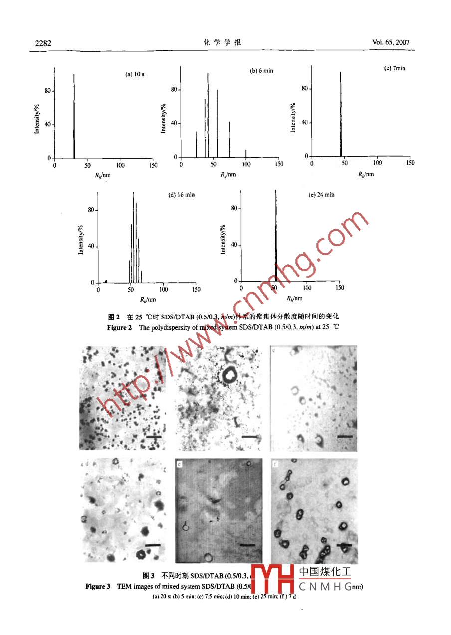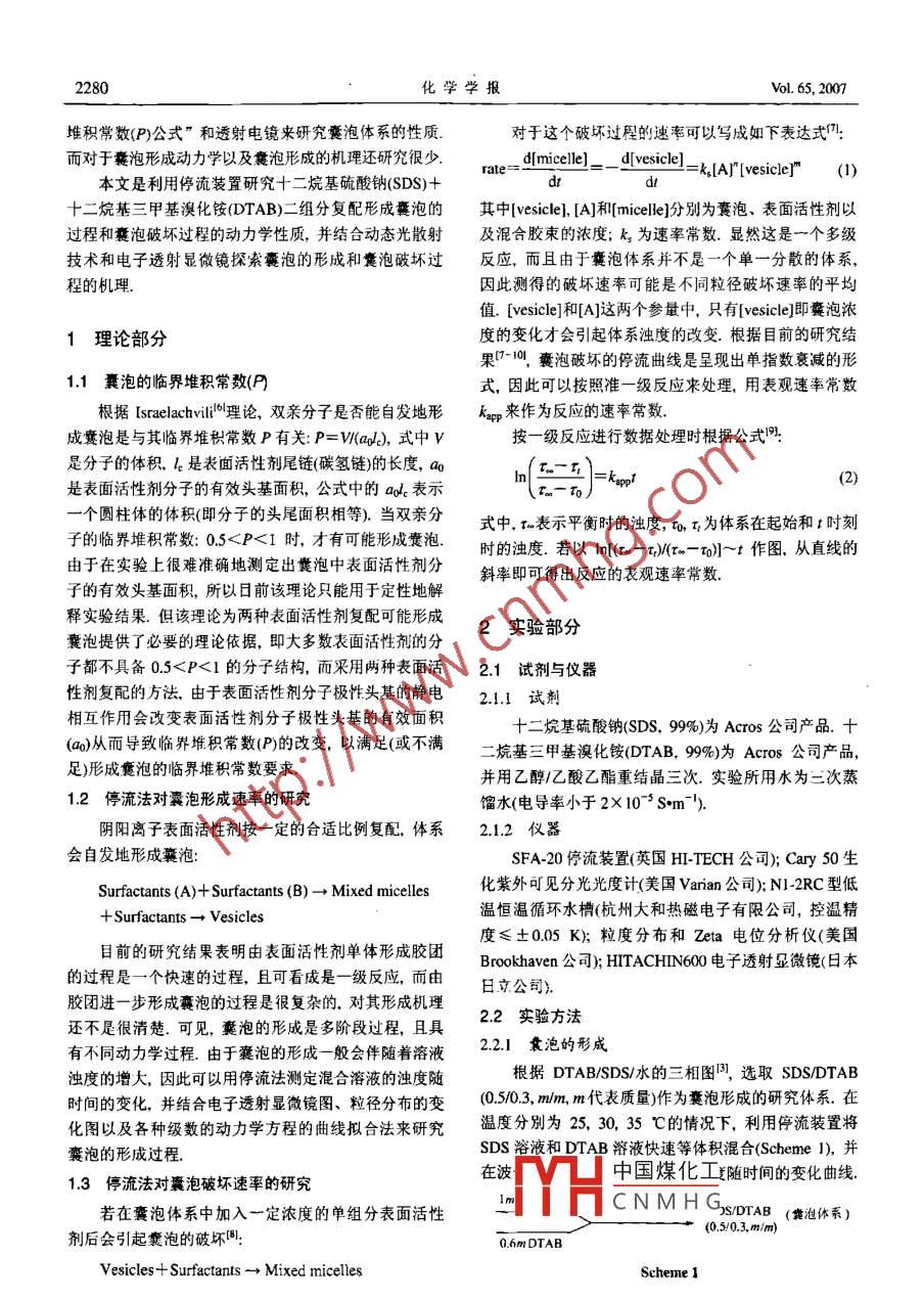 2007年第65卷化學(xué)學(xué)報(bào)wol65,2007第20期,2279~228ACTA CHIMICA SINICANo.20,2279~2284·研究論文·囊泡形成和破壞的動(dòng)力學(xué)周文婷徐曉明藍(lán)琴韓國(guó)彬*(固體表面物理化學(xué)國(guó)家重點(diǎn)實(shí)驗(yàn)室廈門(mén)大學(xué)化學(xué)化工學(xué)院化學(xué)系廈門(mén)361005)摘要利用停流裝置研究了十二烷基硫酸鈉(SDS和十二烷基三甲基溴化銨①DTAB)復(fù)配形成囊泡的過(guò)程和囊泡破壞過(guò)程的動(dòng)力學(xué)性質(zhì),并結(jié)合動(dòng)態(tài)光散射技術(shù)和電子透射顯微鏡探索囊泡形成和羹泡破壞過(guò)程的機(jī)理動(dòng)態(tài)光散射和電子透射顯微鏡的研究結(jié)果表明囊泡的形成過(guò)程主要包括四個(gè)階段:混合膠團(tuán)→柔性的長(zhǎng)棒狀聚集體→“非平衡襄泡”平衡囊泡,而與其對(duì)應(yīng)的粒度分散度則呈現(xiàn)“單分散性→多分散性”的周期性變化規(guī)律.此外,動(dòng)力學(xué)結(jié)果表明泡形成過(guò)程很長(zhǎng),但其活化能不大,這意味著囊泡形成過(guò)程的控制步驟可能不是活化能控制.而相對(duì)于囊泡的形成,囊泡的破壞過(guò)程是十分迅速的關(guān)鍵詞囊泡;表面活性劑;停流法;臨界堆積常數(shù)Kinetics of vesicle Formation and BreakdownZHOU, Wen-Ting XU, Xiao-Ming LAN, Qin HAN, Guo-Bin(State Key Laboratory for Physical Chemistry of Solid Surface and Department of Chemistry, College of Chemistry andChemical Engineering Xiamen University, Xiamen 361005)Abstract A combination of stopped-flow, transmission electron microscopy and dynamic light-scatteringtechniques has been used to study the kinetics of vesicle formation and breakdown as well as the mechanismof vesicle formation and breakdown in DTAB/SDS aqueous solutions. The results show that the process ofvesicle formation can be modeled as a sequence of distinct processes: mixed micelles-flexible stick-shapedaggregates-non-equilibrium vesicles -equilibrium vesicle system, and the evolution of particle dispersiondegree appears to be a periodical change of "monodispersity-polydispersity"In addition, the kineticanalysis shows that the process of vesicle formation lasts for a long time. However, the activation energy ofvesicle formation is not too high, which implies that the control procedure of the process is independent ofactivation energy. In contrast to the process of vesicle formation, vesicle breakup to mixed micelles appearsto be a rapid process.Keywords vesicle; surfactant; stopped-flow method; effective packing parameter囊泡是由兩層雙親分子定向單層尾對(duì)尾地結(jié)合成成的囊泡有其獨(dú)特的性質(zhì),例如可通過(guò)合成不同類(lèi)型的封閉單分子雙層所構(gòu)成的外殼,和殼內(nèi)包藏的微水相構(gòu)表面活性劑來(lái)形成所需要的各種囊泡,也可通過(guò)調(diào)節(jié)陰成,它可分為兩種類(lèi)型:由天然的或合成的磷脂所組陽(yáng)離子表面活性劑的比例來(lái)控制泡表面的電荷,以適成的囊泡(脂質(zhì)體)和由雙親分子自組裝形成的囊泡.到應(yīng)不同的囊泡研究的要求,并可用聚合物包裹的方法來(lái)目前為止,有關(guān)囊泡的大多數(shù)研究都局限于脂質(zhì)體,且進(jìn)一步提高它的穩(wěn)定性等.目前大多數(shù)有關(guān)表面活性劑研究的歷史較為悠久.相比之下,對(duì)雙親分子自組裝形囊泡中國(guó)煤化工面活性劑復(fù)配的體成的囊泡性質(zhì)的研究歷史較短.由于雙親分子自組裝形系CNMH是出的“聚集體臨界E-mail: hange xmucdu.cnReceived August 31, 2006: revised May 9. 2007; accepted July 2, 2007夏門(mén)大學(xué)科技創(chuàng)新重點(diǎn)項(xiàng)目(No. XMKJCX20052001)資助項(xiàng)目2280化學(xué)學(xué)報(bào)vl.65,2007堆積常數(shù)(P)公式”和透射電鏡來(lái)研究囊泡體系的性質(zhì)對(duì)于這個(gè)破壞過(guò)程的速率可以寫(xiě)成如下表達(dá)式n而對(duì)于囊泡形成動(dòng)力學(xué)以及囊泡形成的機(jī)理還研究很少rate-d[micelle] vesicleks[A][vesicle]" (1)本文是利用停流裝置研究十二烷基硫酸鈉(SDS)+十二烷基三甲基溴化銨DTAB)二組分復(fù)配形成囊泡的其中 vesicle,[A]和 micelle]別為囊泡、表面活性劑以過(guò)程和囊泡破壞過(guò)程的動(dòng)力學(xué)性質(zhì),并結(jié)合動(dòng)態(tài)光散射及混合膠束的濃度;k為速率常數(shù).顯然這是一個(gè)多級(jí)技術(shù)和電子透射顯微鏡探索囊泡的形成和囊泡破壞過(guò)反應(yīng),而且由于囊泡體系并不是一個(gè)單一分散的體系,程的機(jī)理因此測(cè)得的破壞速率可能是不同粒徑破壞速率的平均值.[ vesicle]和A]這兩個(gè)參量中,只有 vesicle即囊泡濃1理論部分度的變化才會(huì)引起體系濁度的改變.根據(jù)目前的研究結(jié)果囊泡破壞的停流曲線是呈現(xiàn)出單指數(shù)衰減的形1.1囊泡的臨界堆積常數(shù)(月式,因此可以按照準(zhǔn)一級(jí)反應(yīng)來(lái)處理,用表觀速率常數(shù)根據(jù) sraelachvili理論,雙親分子是否能自發(fā)地形kp來(lái)作為反應(yīng)的速率常數(shù)成囊泡是與其臨界堆積常數(shù)P有關(guān):P=Wa),式中v按一級(jí)反應(yīng)進(jìn)行數(shù)據(jù)處理時(shí)根據(jù)公式9是分子的體積,l是表面活性劑尾鏈(碳?xì)滏?的長(zhǎng)度,a是表面活性劑分子的有效頭基面積,公式中的ad表示To-to個(gè)圓柱體的體積(即分子的頭尾面積相等)當(dāng)雙親分式中,r表示平衡時(shí)的濁度,x為體系在起始和r時(shí)刻子的臨界堆積常數(shù):