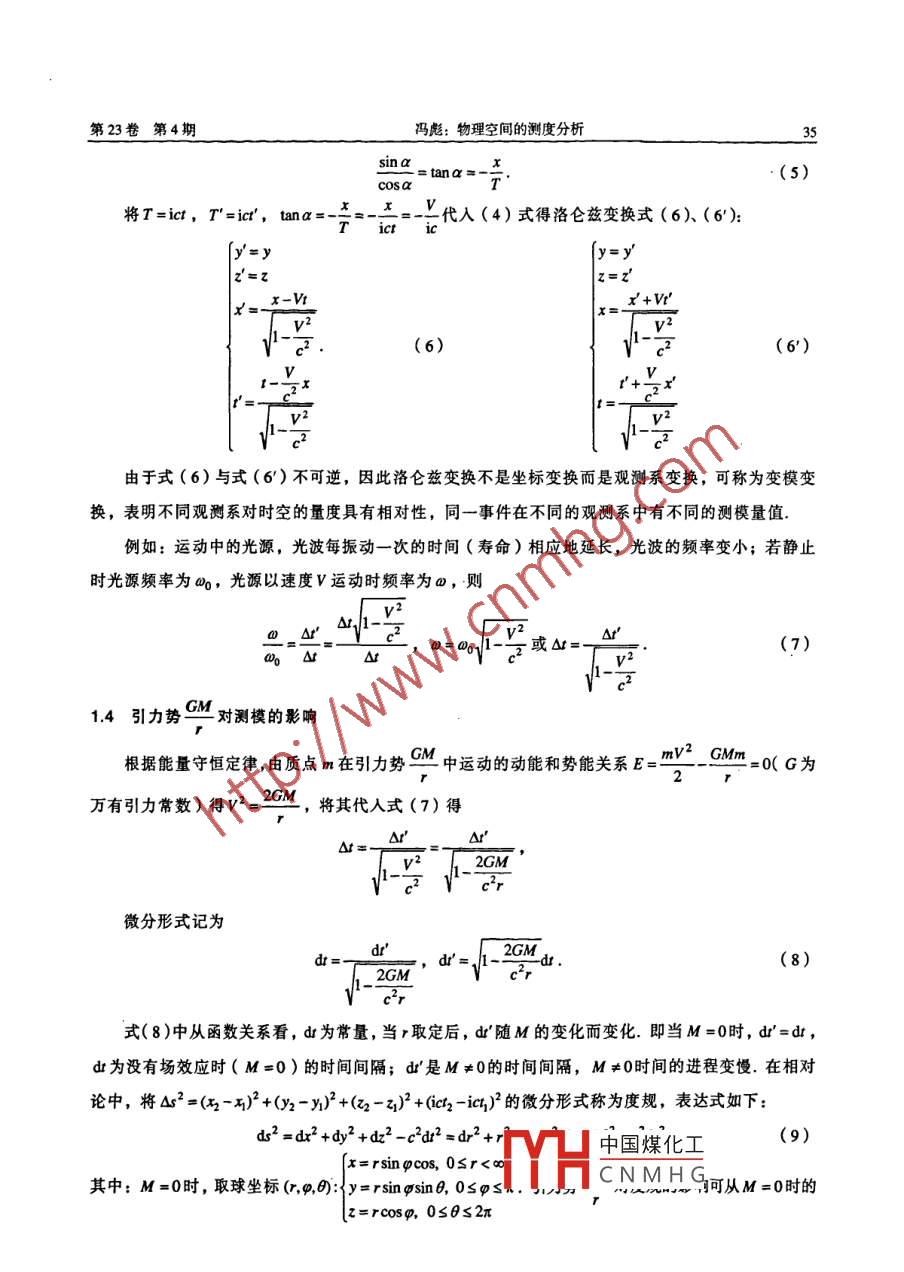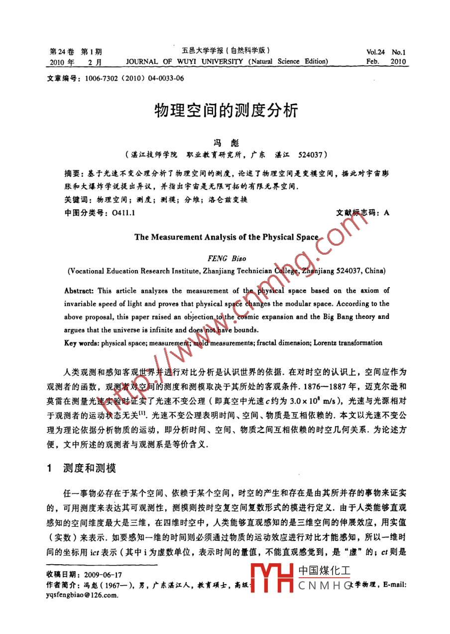 .第24卷第1期五邑大學學報(自然科學版)Vol:24 No.12010年2月JOURNAL OfF WUYI UNIVERSITY (Natural Science Edition)Feb. 2010文章編號: 1006-7302 (2010) 04-0033-06物理空間的測度分析馮彪(湛江技師學院 職業(yè)教育研究所,廣東湛江524037)摘要:基于光速不變公理分析了物理空間的測度,論述了物理空間是變??臻g,據(jù)此對宇宙膨脹和大爆炸學說提出異議,并指出宇宙是無限可拓的有限無界空間.關鍵詞:物理空間;測度;測模;分維;洛侖茲變換中圖分類號: 0411.1文獻標志碼: AThe Measurement Analysis of the Physical SpaceFENG Biao(Vocational Education Research Institute, Zhanjiang Technician College, Zhanjiang 524037, China)Abstract: This article analyzes the measurement of the physical space based on the axiom ofinvariable speed of light and proves that phyeical space changes the modular space. According to theabove proposal, this paper raised an objection to the cosmic expansion and the Big Bang theory andargues that the universe is infinite and does not have bounds.Key words: physical space; measurement; mold measurements; fractal dimension; Lorentz transformation人類觀測和感知客觀世界并進行對比分析是認識世界的依據(jù).在對時空的認識上,,空間應作為觀測者的函數(shù),觀測者對空間的測度和測模取決于其所處的客觀條件.1876--1887年,邁克爾遜和莫雷在測量光速實驗時證實了光速不變公理(即真空中光速c約為3.0x 10* m/s),光速與光源相對于觀測者的運動狀態(tài)無關"光速不變公理表明時間、空間、物質是互相依賴的.本文以光速不變公理為理論依據(jù)分析物質的運動,即分析時間、空間、物質之間互相依賴的時空幾何關系.為論述方便,文中所述的觀測者與觀測系是等價含義.1測度和測模任一事物必存在于某個空間、依賴于某個空間,時空的產(chǎn)生和存在是由其所并存的事物來證實的,可用測度來表達其可觀測性,測模則按時空復空間復數(shù)形式的模進行定義.由于人類能夠直觀感知的空間維度最大是三維,在四維時空中,人類能夠直觀感知的是三維空間的伸展效應,用實值(實數(shù))來表示.如要感知一維的時間則必須通過物質的運動效應進行對比才能感知,所以一維時間的坐標用ict表示(其中i為虛數(shù)單位,表示時間的量值,不能直觀感覺到,是“虛”的; ct則是中國煤化工收稿日期: 2009-06-17作者簡介:馮彪(1967-),男,廣東湛江人,教育碩士,高級{.MYHC NM H G學物理, E-mail:yqsfengbiao@ 126.com.34五邑大學學報(自然科學版)2010年光速乘以時間“換算"為空間坐標量值) .設空間2=(xy, z)和時間T(icr)的復數(shù)形式為B=s2(x,y,z)+T(ict), 則時空復空間(2,T)按復數(shù)的模定義川=(x2 +y2 +z2 +c42)2稱為測模,其微分形式為|dB|= (dx2 +dy2 +dz2 +c2d2)3.1.1 宇宙集是零測集.物質與時空不可分,時空與物質同時產(chǎn)生,同時湮滅.例如,由高能粒子物理學可知電子的產(chǎn)生及湮滅一不僅光子可以產(chǎn)生正負電子, 正負電子也可以湮滅為光子,光子在傳播過程中由于紅移最后變成幾何點,即2r(光子)-→e*(正電子)+e~ (負電子), e*(正電子)+e' (負電子)-→2r(光子)→0.根據(jù)Lebesque 測度可知,由物質M、空間2和時間T組成的宇宙集是零測集,即宇宙集U= {(M,Q,T)|F(M,S,T)=0}中存在OF = (OM2 + ss2 + sr2)z =[(M1-M2)2 +(Q2-2)2 +(T-7)呼=0.(1)1.2 物理空間是時空復空間物理空間是物質空間,也是宇宙集的子集,即SM =M.-Mz≠0,由(1)式得(A-s2)F+(T-7)P<0,因P(2,T)或(I",T)此,物理空間是時空復空間,即2⊥T,用四維直角坐標表.示: 2=(x,y,z), U=(x,y,ct). 由光速不變公理得觀測系的變換:設觀測系K'(s2,T')沿著觀測系K(2,T)以速度V作慣性運動,其光速不變,開始時T'=To=0,%=2=0,即觀7一> a測系K'的原點(2,T6)=(0,0)與觀測系K的原點°|\(20,To)= (0,0)重疊.又始終有022 +0r2 =(0Q2)2 +(GT")",使(LT)與(L),T')的關系是旋轉變換關系,如圖1所示,其變圖1觀測系 的旋轉變換關系圄換形式與坐標系旋轉變換相同,即有2=sI'cosa-T'sina,T = I'sina +T' cosa.(2)當J'=0時,代入(2)式得sina.= tana=-T*(3)cosa1.3四維時空的洛侖茲變換光子的運動是光速慣性運動,光速是觀測速度的極限.由光速不變作慣性參照系,就等價于靜止參照系。由式(2)、(3)可推導出洛侖茲變換公式,它是愛因斯坦《相對論>的基礎,而《相對論》已為現(xiàn)代物理學的大量事實證明是正確的理論.設觀測系K'(x,y,',icr) 沿著觀測系K(x,yz,icr)的x軸以速度V作慣性運動,其光速不變,開始時為=x=0,y=y=0,為=Zo=0, b6=i=0. 即觀測系K"的原點(x%,y%, z,icr')= 0,0,0,0), .與觀測系K的原點(0ovo,z,ico)=(0,0,0.)重疊.又始終有y=y', z=z',代人s2+sT2=(0S2)? +(&T)2得0x2 +or2 =(Qr)2 +(0r)2使(x,T)與(x,T)的關系是旋轉變換關系。與式(2)、(3)有相同的形式,即中國煤化工x=x'cosa-T"sina, T=xMHCNMHG(4)當x'=0時,代人(4)式得:第23卷第4期馮彪:物理空間的測度分析35soc=tana=-三..(5)cosa將T=ict,T'=ic', tana=-=--=-代人(4)式得洛侖茲變換式(6)、(6');ict[y'=y{y=y'z'=zx-Vt。x' +Vr')2(6)(6')由于式(6)與式(6')不可逆,因此洛侖茲變換不是坐標變換而是觀測系變換,可稱為變模變換,表明不同觀測系對時空的量度具有相對性,同一事件在不同的觀測系中有不同的測模量值.例如:運動中的光源,光波每振動一次的時間(壽命)相應地延長,光波的頻率變小;若靜止時光源頻率為0o,光源以速度V運動時頻率為a,則V2V@。;Ot'st’'.或Ot=-(7)△t-1.4引力勢C對測模的影響根據(jù)能量守恒定律,由質點m在引力勢CM.中運動的動能和勢能關系E=mV2_ GMm-MT=0( G為萬有引力常數(shù))得v2=ZOM,將其代人式(7)得A'2GM√I-z V- c2r微分形