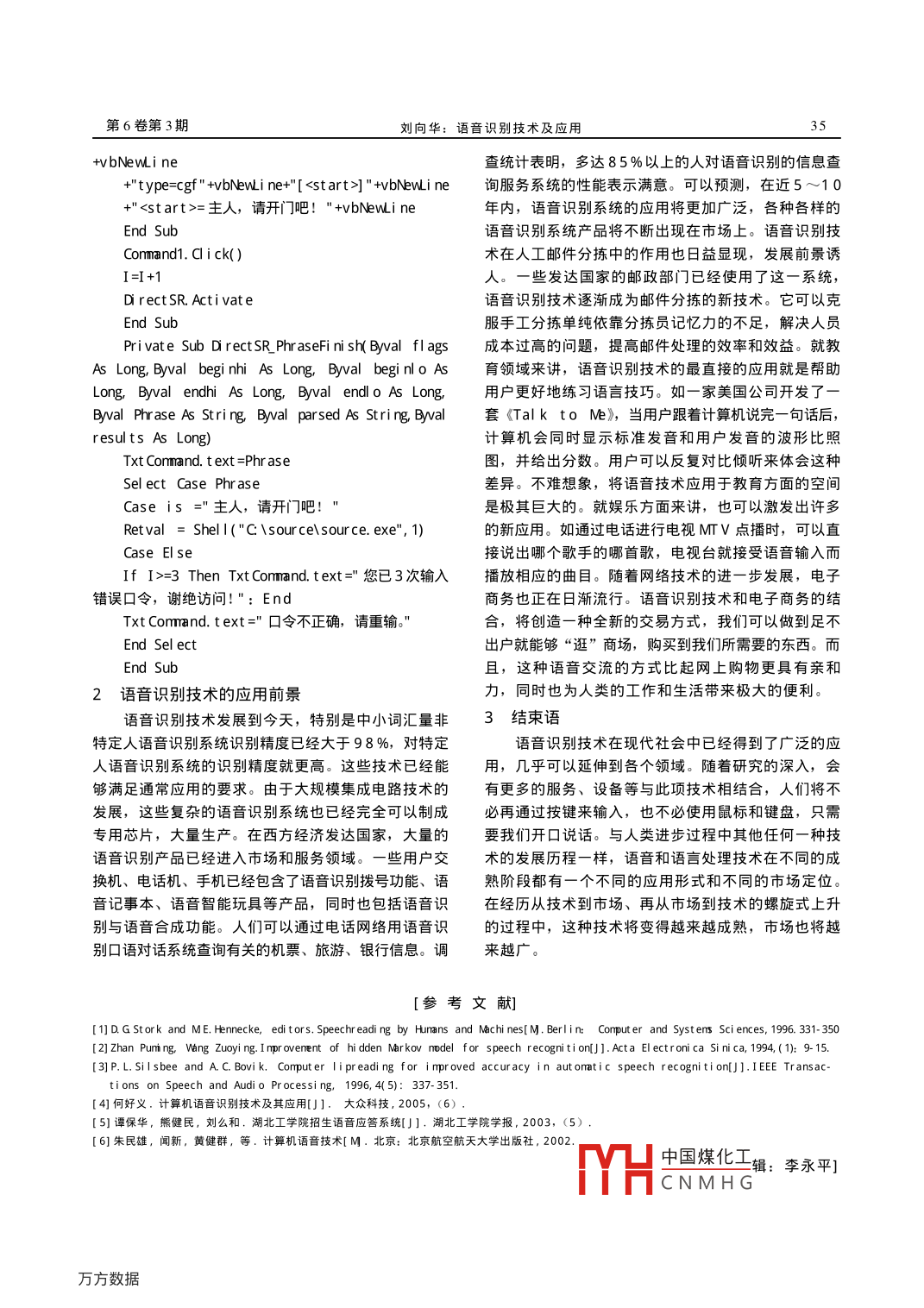 第6卷第3期溫州職業(yè)技術(shù)學(xué)院學(xué)報Vol 6 No. 32006年9月Journal of wenzhou vocational Technical college語音識別技術(shù)及應(yīng)用劉向華(溫州職業(yè)技術(shù)學(xué)院計算機系,浙江溫州325035)[摘要]語音識別技術(shù)近年來得到了飛速的發(fā)展并且在越來越多的領(lǐng)域得到了廣泛的應(yīng)用。隱馬爾可夫模型(HM語音識別技術(shù)是一種基于訓(xùn)練數(shù)據(jù)提供的概率自動構(gòu)造識別系統(tǒng)的技術(shù),主要用于大量詞匯的語音識別,而且具有良好的識別性能和抗噪性能。因此,一般的語音識別系統(tǒng)都采用基于HM旳識別方法作為其基本算法。本文列舉了語音識別在教學(xué)中的應(yīng)用示例來分析其基本算法。[關(guān)鍵詞]語音識別技術(shù);隱馬爾可夫模型(HM;語音模型[中圖分類號]TN12.34[文獻標識碼]A[文章編號]1671-4326(2006)03-0033-03Speech Recognition Technology and its applicationLIU Xiang-huaComputer Science Department, Wenzhou Vocational Technical College, Wenzhou, 325035, China)Abstract: The speech recognition technology has boomed in recent years and is widely used in more andmore fields. The speech recognition technology of HMM is the technology that is based on the recognition systerof the auto-construction probability provided by the practical digit. It is mainly used in speech recognition of a largenumber of vocabularies with the fine property of recognition and anti-noise. Therefore, the common speech recog-nition system usually adopts the recognition approach based on HMM as its basic algorithm. This paper, demonKey words: Speech recognition technology; HMM; Language modey ysis on its basic algorithmstrating the application of the speech recognition in teaching, makes an ana0引言語音輸入識別結(jié)果特征提取語音識別技術(shù)是2000~2010年間信息技術(shù)領(lǐng)域重要的十大科技發(fā)展技術(shù)之一。語音識別是一門交叉學(xué)科,正逐步成為信息技術(shù)中人機接口的關(guān)鍵技術(shù)。語圖1語音識別系統(tǒng)的實現(xiàn)過程1音識別技術(shù)與語音合成技術(shù)結(jié)合使人們能夠甩掉鍵隱馬爾可夫模型( Hi dden mar kov Model s,簡稱盤,通過語音命令進行相應(yīng)的操作。語音技術(shù)的應(yīng)用HMM語音識別技術(shù)是一種統(tǒng)計技術(shù),它提供了一種基已經(jīng)成為一個具有競爭性的新興高技術(shù)產(chǎn)業(yè)。于訓(xùn)練數(shù)據(jù)提供的概率自動構(gòu)造識別系統(tǒng)的技術(shù)。這語音識別技術(shù)是 Rabi ner等人在20世紀80年代引入語音識別領(lǐng)域與機器進行語音交流,讓機器明白你說什么,這的一種語音識別算法。該算法通過對大量語音數(shù)據(jù)進是人們長期以來夢寐以求的事情。近20年來,語音識行數(shù)據(jù)統(tǒng)計,建立識別條的統(tǒng)計模型,然后從待識別別技術(shù)取得顯著進步,開始從實驗室走向市場。預(yù)計語音中提取特征,與這些模型匹配,通過比較匹配分在未來10年內(nèi),語音識別技術(shù)將進入工業(yè)、家電、通數(shù)以獲得識別結(jié)果。通過大量的語音,就能夠荻得信、汽車電子、醫(yī)療、家庭服務(wù)、消費電子產(chǎn)品等各個穩(wěn)健的統(tǒng)計模型,能夠適應(yīng)實際語音中的各種突發(fā)個領(lǐng)域。一個完整的語音識別系統(tǒng)可大致分為三部情況?;贖M的算法23,主要用于大量詞匯的語音分,如圖1所示。識別系統(tǒng),而且其算法具有良好的識別性能和抗噪性1.1隱馬爾可夫語音識別技術(shù)能,故現(xiàn)在[收稿日期]2006-01-15TH中國煤化工HMM的識CNMHG[作者簡介劉向華(1977一),女,湖南隆回人,溫州職業(yè)技術(shù)學(xué)院計算機系助教溫州職業(yè)技術(shù)學(xué)院學(xué)報2006年9月別方法作為基本算法。一個典型的HMM語音識別過程=argnax[ B()≤i≤T包括以下幾個方面返回結(jié)果(1)利用前向、后向算法計算模型的形成觀察概S=B.(s-)t=T-1,T-2T-3,…,0率集p(X/中)。其計算方法如下:s=(S。51S2…,S)是最佳序列。初始狀態(tài):a(i)=丌1≤i≤N(4)根據(jù)最佳狀態(tài)序列對應(yīng)的值,給出候選音節(jié)%(9.1)ab(x)1t≤1可≤N聲韻母。(5)通過語言模型形成詞和句子1.2隱馬爾可夫語音識別技術(shù)的改進隊x4)=a(i)隨著語音識別研究工作的深入開展,HMM語音識那么p(x/中)=a(S)(S是最后的狀態(tài))別方法愈來愈受到人們的重視,基于HMM技術(shù)的識別(2)利用 Baum Wel ch算法求出最優(yōu)解 ar gax{p系統(tǒng)的缺點就在于統(tǒng)計模型的建立需要依賴一個較大(X/φ)}。其方法描述如下:的語音庫。這在實際工作中占有很大的工作量。且模5(i,j)表示t時狀態(tài)為i以及t+1時狀態(tài)為j的型所需要的存儲量和匹配計算(包括特征矢量的輸出概率,即i,j)=p(q=,q,,)概率計算)的運算量相對較大,通常需要具有一定容5(1,/D(q=,q,Wλ)量SRAM的DSP才能完成。另外,它的一個最主要的缺p( A)點是根據(jù)詞模型推出的狀態(tài)段長分布是指數(shù)分布,這q()a1b(0)(j)不符合語音的本質(zhì)屬性,因此,現(xiàn)在推出了一種非齊p(dλ)次的HM晤音識別模型( Dur at i on d stri but i on BasedHi dden№ br kov model,簡稱DDBH№M。在此模型中用q(1)ab(0-)9.(j)狀態(tài)的段長分布函數(shù)替代了齊次HMM中的狀態(tài)轉(zhuǎn)移矩點q()a(0,),)陣,徹底拋棄了“平穩(wěn)的假設(shè)”,而從非平穩(wěn)的角度考慮問題,使模型成為一種基于狀態(tài)段長分布的隱含Y()+i,)表示t時狀態(tài)為的概率,元= Mar kov