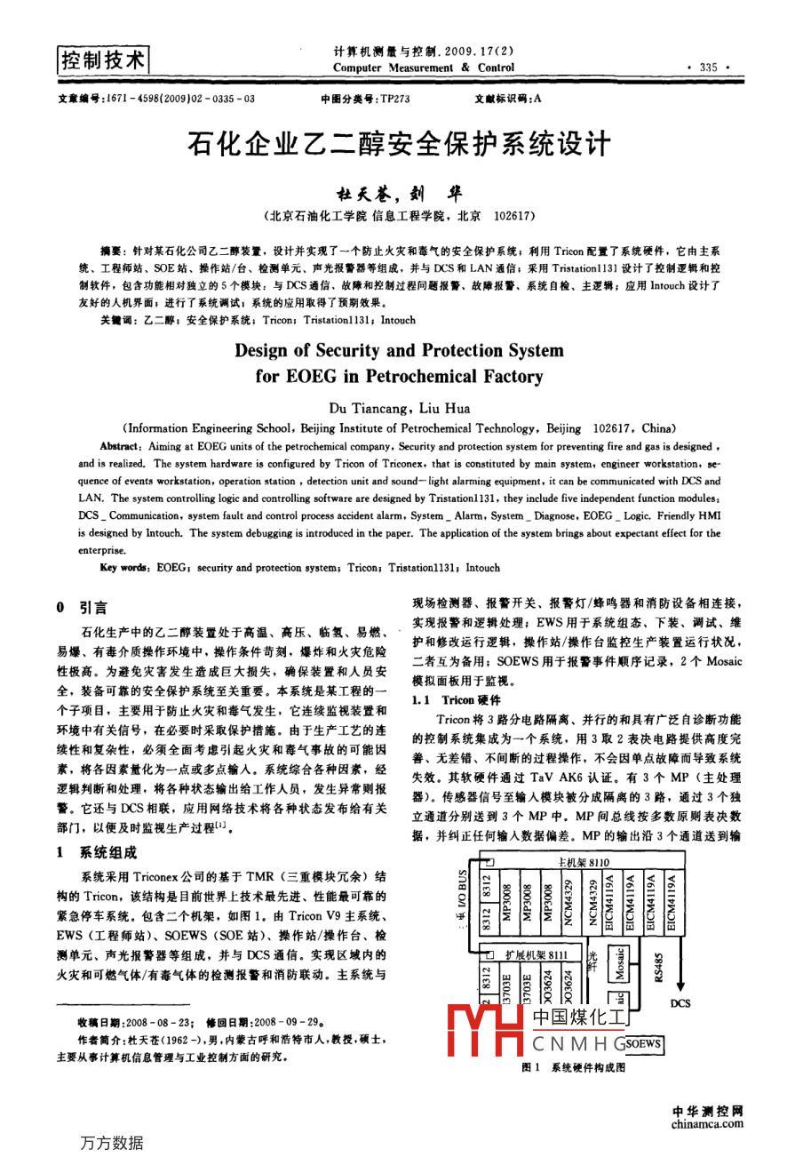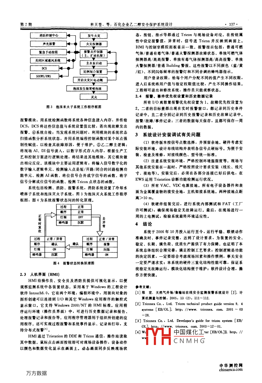控制技術計算機測量與控制.2009.17(2)Computer Measurement Control335文章編號:1671-4598(2009102-0335-03中圖分類號:TP273文獻標識碼:A石化企業(yè)乙二醇安全保護系統(tǒng)設計杜天蒼,刻華(北京石油化工學院信息工程學院,北京102617)擴要:針對某石化公司乙二醇裝置,設計并實現(xiàn)了一個防止火災和毒氣的安全保護系統(tǒng);利用 Tricon配置了系統(tǒng)硬件,它由主系統(tǒng)、工程師站、SOE站、操作站/臺、檢測單元、聲光報警器等組成,并與DCS和LAN通信;采用 Tristationl131設計了控制邏輯和控制軟件,包含功能相對獨立的5個模塊:與DCS通信,故障和控制過程問題報警、故障報警、系統(tǒng)自檢、主邏輯;應用 Intouch設計了友好的人機界面;進行了系統(tǒng)調(diào)試;系統(tǒng)的應用取得了預期效果關鍵安全保護系統(tǒng); Tricon; Tristationl13l; IntouchDesign of Security and Protection Systemfor EOEG in Petrochemical FactoryDu Tiancang, Liu Hua(Information Engineering School, Beijing Institute of Petrochemical Technology, Beijing 102617, China)and is realized. The system hardware is configured by Tricon of Triconex, that is constituted by main system, engineer workstation, se-quence of events workstation, operation station detection unit and sound-light alarming equipment, it can be communicated with DCS andLAN, The system controlling logic and controlling software are designed by Tristationl131, they include five independent function modules:ontrol process accident alarm, System Alarm, System Diagnoseis designed by Intouch. The system debugging is introduced in the paper. The application of the system brings about expectant effect for theenterprise.Key words: EOEGr security and protection system; Tricon: Tristation1131: Intouch0引言現(xiàn)場檢測器、報警開關、報警燈/蜂鳴器和消防設備相連接,石化生產(chǎn)中的乙二醇裝置處于高溫、高壓、臨氫、易燃實現(xiàn)報警和邏輯處理;EWS用于系統(tǒng)組態(tài)、下裝、調(diào)試、維護和修改運行邏輯,操作站/操作臺監(jiān)控生產(chǎn)裝置運行狀況易爆、有毒介質(zhì)操作環(huán)境中,操作條件苛刻,爆炸和火災危險性極高。為避免災害發(fā)生造成巨大損失,確保裝置和人員安二者互為備用; SOEWS用于報警事件順序記錄,2↑ Mosaic全,裝備可靠的安全保護系統(tǒng)至關重要。本系統(tǒng)是某工程的一模擬面板用于監(jiān)視。1.1 Tricon硬件個子項目,主要用于防止火災和毒氣發(fā)生,它連續(xù)監(jiān)視裝置和環(huán)境中有關信號,在必要時采取保護措施。由于生產(chǎn)工藝的連Tricon將3路分電路隔離、并行的和具有廣泛自診斷功能續(xù)性和復雜性,必須全面考慮引起火災和毒氣事故的可能的控制系統(tǒng)集成為一個系統(tǒng),用3取2表決電路提供高度完善、無差錯、不間斷的過程操作,不會因單點故障而導致系統(tǒng)素,將各因素量化為一點或多點輸人。系統(tǒng)綜合各種因素,經(jīng)失效。其軟硬件通過TaⅤAK6認證。有3個MP(主處理邏輯判斷和處理,將各種狀態(tài)輸出給工作人員,發(fā)生異常則報器)。傳感器信號至輸入模塊被分成隔離的3路,通過3個獨警.它還與DCS相聯(lián),應用網(wǎng)絡技術將各種狀態(tài)發(fā)布給有關立通道分別送到3個MP中,MP間總線按多數(shù)原則表決數(shù)據(jù),并糾正任何輸入數(shù)據(jù)偏差,MP的輸出沿3個通道送到輸1系統(tǒng)組成系統(tǒng)采用 Triconex公司的基于TMR(三重模塊冗余)結構的 Tricon,該結構是目前世界上技術最先進、性能最可靠的緊急停車系統(tǒng)。包含二個機架,如圖1,由 Tricon V9主系統(tǒng)、EwS(工程師站)、 SOEWS(SOE站)、操作站/操作臺、測單元、聲光報警器等組成,并與DCS通信。實現(xiàn)區(qū)域內(nèi)的火災和可燃氣體/有毒氣體的檢測報警和消防聯(lián)動。主系統(tǒng)與收稿日期:2008-08-23;修回日期:2008-09-29中國煤化工作者簡介:杜天蒼(1962-),男,內(nèi)蒙古呼和浩特市人,教授,碩士,C N MH GSOEWS主要從事計算機信息管理與工業(yè)控制方面的研究中華測控網(wǎng)計算機測量與控制出模塊,并冉次表決/選擇。在表決電路中含有總的反饋電路,個激活系統(tǒng)便認為該回路中產(chǎn)生了報警,報警觸點閉合。當切用于對輸出狀態(tài)做最后校驗,診斷潛在故障斷電源、重置探測器后,報警觸點斷開。短路問路時,I>Tricon對每個獨立分電路/模塊/功能電路都進行廣泛自診15.14。開路冋路時,Im<0.49。設備閉合路時(只要有斷,對操作錯誤進行檢測和報告。所有診斷信息均存在系統(tǒng)變一個探測器激活):7.81