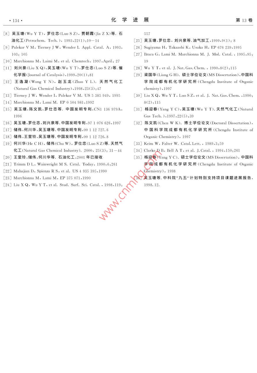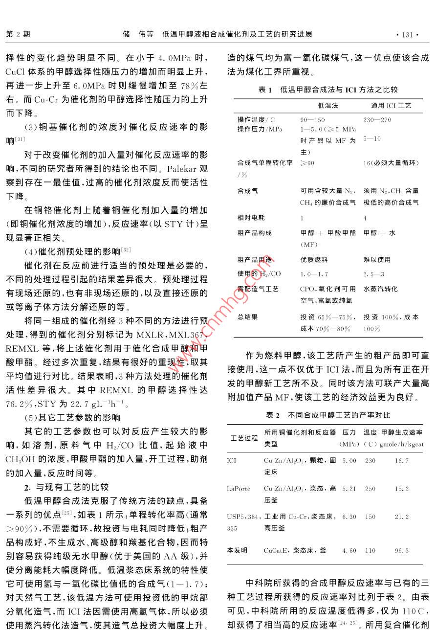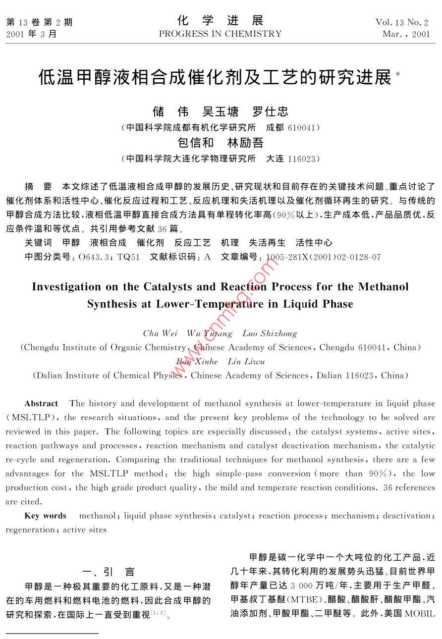 第13卷第2期化學進展2001年3月PROGRESS IN CHEMISTRY2001低溫甲醇液相合成催化劑及工藝的研究進展儲偉吳玉塘羅仕忠(中國科學院成都有機化學研究所成都610041)包信和林勵吾(中國科學院大連化學物理研究所大連116023)摘要本文綜述了低溫液相合成甲醇的發(fā)展歷史、研究現(xiàn)狀和目前存在的關鍵技術問題。重點討論了催化劑體系和活性中心、催化反應過程和工藝、反應機理和失活機理以及催化劑循環(huán)再生的研究。與傳統(tǒng)的甲醇合成方法比較,液相低溫甲醇直接合成方法具有單程轉化率高(90%以上),生產成本低,產品品質優(yōu),反應條件溫和等優(yōu)點。共引用參考文獻36篇。關鍵詞甲醇液相合成催化劑反應工藝機理失活再生活性中心中圖分類號:O643.3;TQ51文獻標識碼:A文章編號:1005-281X(2001)02-0128-0Investigation on the Catalysts and reaction Process for the methanoSynthesis at Lower-Temperature in Liquid PhaseChu Wei Wu Yutang Luo shizhong(Chengdu Institute of Organic Chemistry, Chinese Academy of Sciences, Chengdu 610041, China)Bao Xinhe lin liez( Dalian Institute of Chemical Physics, Chinese Academy of Sciences, Dalian 116023, ChinaAbstract The history and development of methanol synthesis at lower-temperature in liquid phase(MSLTLP), the research situations, and the present key problems of the technology to be solved arereviewed in this paper. The following topics are especially discussed the catalyst systems, active sitesreaction pathways and processes, reaction mechanism and catalyst deactivation mechanism, the catalyre-cycle and regeneration. Comparing the traditional techniques for methanol synthesis, there are a fewadvantages for the MSL TLP method: the high simple-pass conversion (more than 90%), the lowproduction cost, the high grade product quality, the mild and temperate reaction conditions. 36 referencesare citedKey words methanol; liquid phase synthesis; catalyst; reaction process; mechadeactivationregeneration active sites甲醇是碳一化學中一個大噸位的化工產品,近幾十年來,其轉化利用的發(fā)展勢頭迅猛。目前世界甲甲醇是一種極其重要的化工原料,又是一種潛醇年產量已達3000萬噸/年,主要用于生產甲醛在的車用燃料和燃料電池的燃料,因此合成甲醇的甲基叔丁基醚(MTBE)、醋酸、醋酸酐、醋酸甲酯、汽研究和探索,在國際上一直受到重視油添加劑、甲酸甲酯、二甲醚等。此外,美國 MOBIL第2期儲偉等低溫甲醇液相合成催化劑及工藝的研究進展129公司使用改性的ZSM-5分子篩為催化劑進行甲醇的水平,但仍存在著3大缺點有待克服和突破78制汽油(MTG),已經在新西蘭實現(xiàn)工業(yè)化。半個世(1)由于受到反應溫度下熱力學平衡的限制(見圖紀以來,合成甲醇工業(yè)的進展,很大程度上取決于新1),單程轉化率低,在合成塔出口產物中甲醇濃度極催化劑的研制成功以及質量的改進。在合成甲醇的少能超過7%,因此不得不使用多次循環(huán),這就大大生產中,很多工藝指標和操作條件都由所用催化劑增加了合成氣制造工序的投資和合成氣成本7。(2)的性質決定。ICI等方法要求原料氣中必須含有5%的CO2,從而1966年以前,國外的甲醇合成工廠幾乎都使用產生了有害的雜質—水,為了使甲醇產品符合燃鋅鉻催化劑,基本上沿用了1923年德國開發(fā)的料及下游化工產品的要求,不得不進行能耗很高的3oMPa的高壓工藝流程。在我國,1954年開始建立甲醇水分離。(3)ICI等傳統(tǒng)方法的合成氣凈化成本甲醇工業(yè),也使用鋅鉻催化劑,但鋅鉻催化劑的活性很高溫度較高(320400C),為了荻取較高的轉化率,必為了克服上述3大缺點,國外自70年代以來進須在高壓下操作。從50年代開始,很多國家著手進行了大量的改進研究,長期的研究結果表明必須從行低溫低壓甲醇催化劑的研究工作。1966年以后,根本上改變催化劑體系,開發(fā)出具有低溫(90英國ICⅠ公司和西德的 Lurgi公司先后提出了使用180C)、高活性、高選擇性、無過熱問題的催化劑體銅基催化劑,操作壓力為5-10MPa;1966年末ICI系,使生產過程在大于90%的高單程轉化率和高選公司在英國的低壓(5MPa)甲醇合成裝置正式投入擇性狀態(tài)下操作,這就是低溫液相合成甲醇-12。工業(yè)生產,使低壓法最先問世4-6。以后許多國家又對于低溫液相合成甲醇,近年來,國際上很多大提出了中壓法,如IC1公司采用10MPa下操作,日公司和研究機構都在進行研究"-11,如 Brookhaven本氣體化學公司使用了15MPa操作的流程,丹麥 National Laboratory, Shell International,Topsoe公司提出了操作壓力為4.8-18MPa的流 namprogretti S.P.A., Mitsui petrochemicals,程。目前總的趨勢是由高壓向低、中壓發(fā)展。低壓、 Pittsburgh University, Amoco Corporation…等。中壓流程所用的催化劑都是含銅的催化劑。在“八五”期間,國家計委給中國科學院成都有機化學所等單位下達了專項研究的支持以及中科院“九0.IMPa1. 0MPa五”重大項目特別支持。經過幾年的研究和努力,已取得了良好的階段進展115-20二、催化劑體系與活性中心的研究0.4目前工業(yè)上應用的甲醇合成催化劑有鋅鉻催化劑和銅基催化劑,例如 ZnO-Cr2O3、 Cuo-Zno(-Al2等1。催化劑的選擇性與活性既取決于其組成,又取決于其制備方法。催化劑的生產分為兩個主要階反應溫度/c段:制備階段和還原活化階段。在此過程中所用的原料需對有害雜質的含量進行嚴格控制。由于可克服常規(guī)反應溫度下平衡轉化率的限制圖1不同溫度、壓力下甲醇合成的平衡轉化率而獲得高的單程轉化率和產品