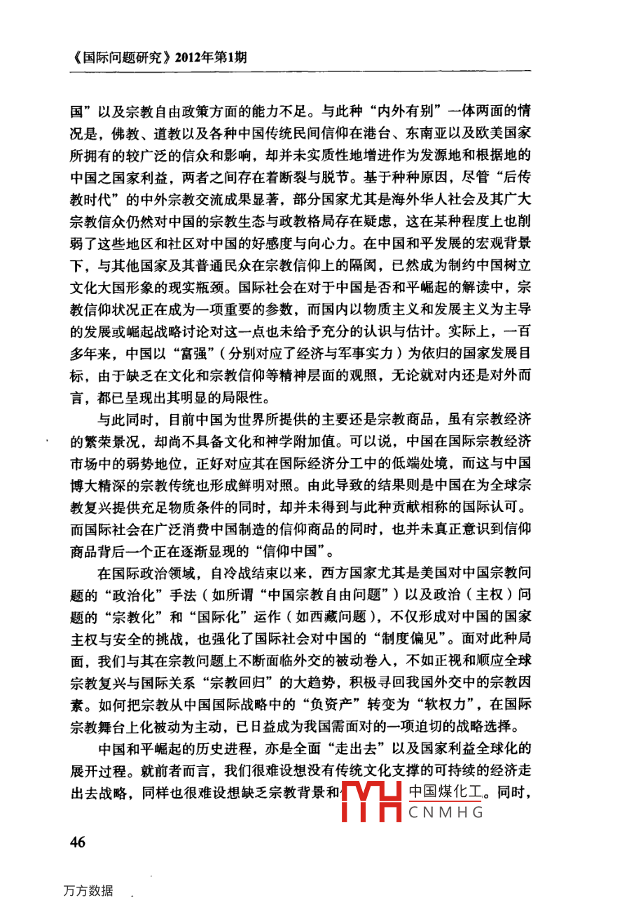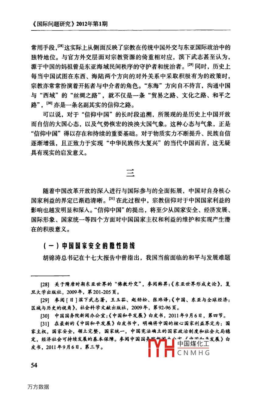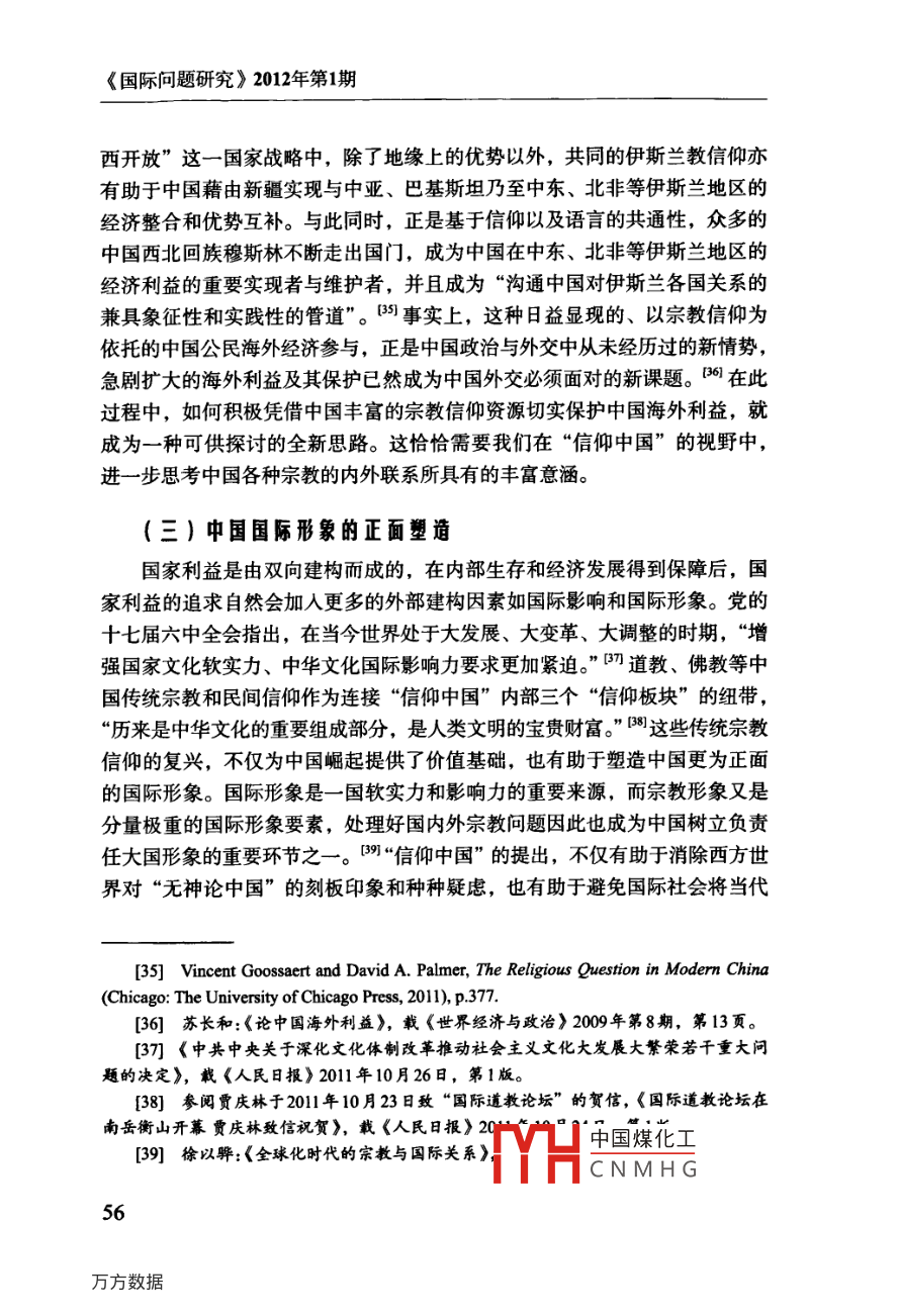 信仰中國口徐以驊鄒磊〔關(guān)鍵詞〕宗教、“信仰中國”、“信仰板塊”、國家利益、中國外交提要〕國內(nèi)宗教發(fā)展、跨國宗教交流與國家總體外交三者之間的良性互動,已逐漸成為中國和平發(fā)展進程中具有全局性意義且亟需面對的戰(zhàn)略問題。中國在宗教信仰領(lǐng)域更加有所作為的關(guān)鍵,即在于正視一個逐漸浮現(xiàn)的、與“文化中國”和“中華經(jīng)濟團”并存的“信仰中國”。它包含了三個緊密相連的“信仰板塊”:中國大陸與港、澳、臺;中國傳統(tǒng)宗教信仰與各種東西方宗教的海外華人信眾群體;中國傳統(tǒng)宗教信仰的外國信眾群體。中國國家力量對“信仰中國”的積極敘述、塑造與展示,不僅將為民族復興提供堅實的價值支撐,也將對中國國家主權(quán)和利益的維護與拓展產(chǎn)生積極意義。中圖分類號〕B9282〔文獻標識碼〕A〔文章編號〕04528832(2012)1期0043-16〔完稿日期〕2011年12月14日〔作者簡介〕徐以驊,復旦大學國際關(guān)系與公共事務(wù)學院教授,博士生導師鄒磊,復旦大學國際關(guān)系與公共事務(wù)學院博士生誠如國際關(guān)系學者杰克·斯奈德( Jack Snyder)所言,自“9·11”事件以來,“宗教已然成為國際政治討論中的一項核心議題”?;貙嶋H上,宗教從本文是教育部哲學社會科學重大課題攻關(guān)項目“宗教與中國國家安全研究”(項目批準號:06JZD0005)以及復旦大學985工程三期“全球化時代的宗教與國家建設(shè)”研究項目的中期成果。中國煤化工[1] Jack Snyder ed, Religion and nternalCNMHGork, ColumbiaUniversity Press, 2011), Introduction, p 1《國際問題研究》2012年第1期所謂“威斯特伐利亞的放逐”回歸“國際關(guān)系的中心”,與其說是長期作為宗教無用論之重災區(qū)”的國際關(guān)系學界的重新發(fā)現(xiàn),毋寧說是對20世紀下半葉以來全球宗教復興及其深遠影響的遲到確認。陰兼具跨國與文化特性的宗教,不僅在后冷戰(zhàn)時代的國家安全、外交政策、地區(qū)沖突中扮演著或隱或顯的重要角色,亦與同屬跨國性力量的互聯(lián)網(wǎng)、跨界民族、非政府組織和各種國際運動等緊密結(jié)合而更具全球影響力。全球宗教復興以及宗教政治化的趨勢,是宗教在某種程度上成為各種國內(nèi)政治的“另一種形式的繼續(xù)”,向并且在國際關(guān)系領(lǐng)域成為各種政府和非政府行為體競相爭奪的資源。某種結(jié)合地緣政治和地緣經(jīng)濟因素,并且兼具廣泛參與性、主體多元性和軟硬實力的地緣宗教( geo-religion),正在成為各國國際戰(zhàn)略的重要考量因素,其對迅速發(fā)展的中國具有不容忽視的現(xiàn)實與潛在意義。[2]徐以驊:《當代國際關(guān)系中的“宗教回歸”》,載徐以驊主編:《宗教與美國社會——宗教與國際關(guān)系》(第四輯上),時事出版杜2007年,第1-31頁;徐以驊:《宗教與當代國際關(guān)系》,載《國際問題研究》2010年第2期,第4449頁; Pavlos Hatzopoulosand Fabio Petito, eds, Religion in international Relations: The Return from Exile(New YorkPalgrave Macmillan, 2003); Jonathan Fox and Shmuel Sandler, Bring Religion into intermationalRelations(New York: Palgrave Macmillan, 2004); Scott M. Thomas, The Resurgence of religionand the Transformation of Intermational Relations: Struggle for Soul of the Twenty-First Centur(New York: Palgrave Macmillan, 2005).3]參閱徐以驊、劉騫:《宗教對國際安全的影響及其對中國的啟示》,收入金澤、年永輝主編:《中國宗教報告(2008)》,社會科學文獻出版社,2008年,第208-221頁;徐以驊、章遠:《試論宗教影響中國國家安全的路徑和范式》,載《復旦學報》(哲學社會科學版)2009年第4期,第109-115頁;徐以驊:《當代中國宗教與國家安全》,收入晏可佳主編:《中國宗教與宗教學》,上海人民出版社,2010年,第181頁[4] See Douglas M. Johnston, Jr, Religion, Terror and Error U.S. Foreign Policy and theChallenge of Spiritual Engagement( Santa Barbara, Califomia: Praeger Security Intermational,2011); Jeffey Haynes, Religion and Foreign Policy Making in the USA, India and Iran: towardsa research agenda, Third World quarterly,vol.29,no.1(2008),p.l43-165.徐以驊:《宗教與冷戰(zhàn)后美國外交政策——以美國宗教團體的“蘇丹運動”為例》,載《中國社會科學》2011年第5期,第199-218頁。[5]最新的研究參閱章遠:《科索沃沖突中的宗教因素解讀》,載《世界經(jīng)濟與政治》2011年第9期,第20-35頁。[6] Conn Hallinan, "Religion and Foreign Policy, Politics by other Means, BerkeleyDaily planet, Nov9. 2007.中國煤化工[門]關(guān)于地緣宗教以及地緣宗教學本文作者將CNMHG信仰中國與西方世界長期以來對于“無神論中國”的刻板印象截然相反,各種權(quán)威數(shù)據(jù)均表明,中國不僅是傳統(tǒng)而且是新興“宗教大國”,主流宗教的增長、新興宗教的崛起以及民間信仰的復興相互交織,成為全球宗教復興的一個重要組成部分。同時,“后傳教時代”的中外宗教交流亦較以往任何時候都更為多樣、廣泛而頻繁,呈現(xiàn)出前所未有的開放格局。目前中國已成為世界上最大的宗教商品提供者。僅以《圣經(jīng)》出版為例,2010年11月8日,南京愛德印刷有限公司舉行“八千萬圣經(jīng)印刷慶典”。該“世界上最大的單體圣經(jīng)印刷企業(yè)”從1985年下線第一本圣經(jīng)到目前已形成年產(chǎn)1500萬至2000萬冊圣經(jīng)的產(chǎn)能,目前不僅已經(jīng)印刷了8種民族