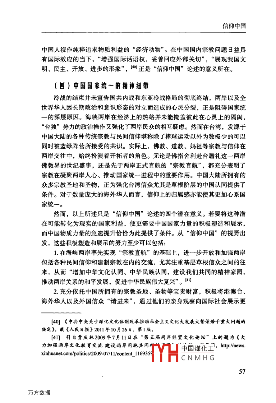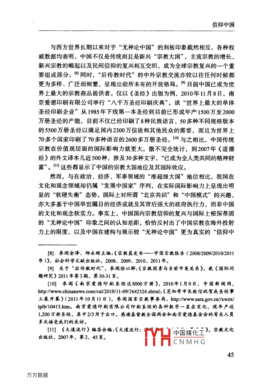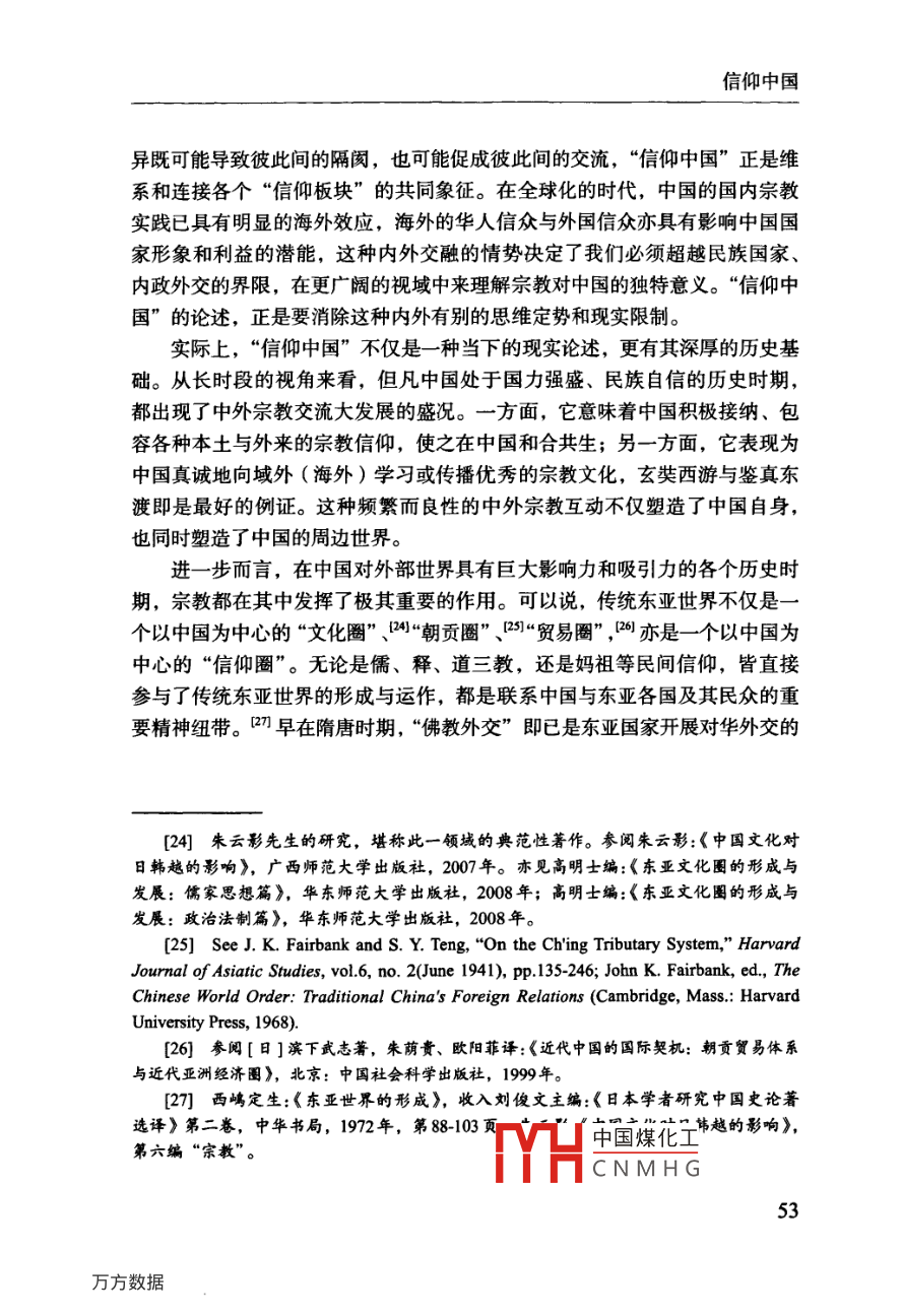 信仰中國口徐以驊鄒磊〔關(guān)鍵詞〕宗教、“信仰中國”、“信仰板塊”、國家利益、中國外交提要〕國內(nèi)宗教發(fā)展、跨國宗教交流與國家總體外交三者之間的良性互動,已逐漸成為中國和平發(fā)展進程中具有全局性意義且亟需面對的戰(zhàn)略問題。中國在宗教信仰領(lǐng)域更加有所作為的關(guān)鍵,即在于正視一個逐漸浮現(xiàn)的、與“文化中國”和“中華經(jīng)濟團”并存的“信仰中國”。它包含了三個緊密相連的“信仰板塊”:中國大陸與港、澳、臺;中國傳統(tǒng)宗教信仰與各種東西方宗教的海外華人信眾群體;中國傳統(tǒng)宗教信仰的外國信眾群體。中國國家力量對“信仰中國”的積極敘述、塑造與展示,不僅將為民族復興提供堅實的價值支撐,也將對中國國家主權(quán)和利益的維護與拓展產(chǎn)生積極意義。中圖分類號〕B9282〔文獻標識碼〕A〔文章編號〕04528832(2012)1期0043-16〔完稿日期〕2011年12月14日〔作者簡介〕徐以驊,復旦大學國際關(guān)系與公共事務(wù)學院教授,博士生導師鄒磊,復旦大學國際關(guān)系與公共事務(wù)學院博士生誠如國際關(guān)系學者杰克·斯奈德( Jack Snyder)所言,自“9·11”事件以來,“宗教已然成為國際政治討論中的一項核心議題”?;貙嶋H上,宗教從本文是教育部哲學社會科學重大課題攻關(guān)項目“宗教與中國國家安全研究”(項目批準號:06JZD0005)以及復旦大學985工程三期“全球化時代的宗教與國家建設(shè)”研究項目的中期成果。中國煤化工[1] Jack Snyder ed, Religion and nternalCNMHGork, ColumbiaUniversity Press, 2011), Introduction, p 1《國際問題研究》2012年第1期所謂“威斯特伐利亞的放逐”回歸“國際關(guān)系的中心”,與其說是長期作為宗教無用論之重災區(qū)”的國際關(guān)系學界的重新發(fā)現(xiàn),毋寧說是對20世紀下半葉以來全球宗教復興及其深遠影響的遲到確認。陰兼具跨國與文化特性的宗教,不僅在后冷戰(zhàn)時代的國家安全、外交政策、地區(qū)沖突中扮演著或隱或顯的重要角色,亦與同屬跨國性力量的互聯(lián)網(wǎng)、跨界民族、非政府組織和各種國際運動等緊密結(jié)合而更具全球影響力。全球宗教復興以及宗教政治化的趨勢,是宗教在某種程度上成為各種國內(nèi)政治的“另一種形式的繼續(xù)”,向并且在國際關(guān)系領(lǐng)域成為各種政府和非政府行為體競相爭奪的資源。某種結(jié)合地緣政治和地緣經(jīng)濟因素,并且兼具廣泛參與性、主體多元性和軟硬實力的地緣宗教( geo-religion),正在成為各國國際戰(zhàn)略的重要考量因素,其對迅速發(fā)展的中國具有不容忽視的現(xiàn)實與潛在意義。[2]徐以驊:《當代國際關(guān)系中的“宗教回歸”》,載徐以驊主編:《宗教與美國社會——宗教與國際關(guān)系》(第四輯上),時事出版杜2007年,第1-31頁;徐以驊:《宗教與當代國際關(guān)系》,載《國際問題研究》2010年第2期,第4449頁; Pavlos Hatzopoulosand Fabio Petito, eds, Religion in international Relations: The Return from Exile(New YorkPalgrave Macmillan, 2003); Jonathan Fox and Shmuel Sandler, Bring Religion into intermationalRelations(New York: Palgrave Macmillan, 2004); Scott M. Thomas, The Resurgence of religionand the Transformation of Intermational Relations: Struggle for Soul of the Twenty-First Centur(New York: Palgrave Macmillan, 2005).3]參閱徐以驊、劉騫:《宗教對國際安全的影響及其對中國的啟示》,收入金澤、年永輝主編:《中國宗教報告(2008)》,社會科學文獻出版社,2008年,第208-221頁;徐以驊、章遠:《試論宗教影響中國國家安全的路徑和范式》,載《復旦學報》(哲學社會科學版)2009年第4期,第109-115頁;徐以驊:《當代中國宗教與國家安全》,收入晏可佳主編:《中國宗教與宗教學》,上海人民出版社,2010年,第181頁[4] See Douglas M. Johnston, Jr, Religion, Terror and Error U.S. Foreign Policy and theChallenge of Spiritual Engagement( Santa Barbara, Califomia: Praeger Security Intermational,2011); Jeffey Haynes, Religion and Foreign Policy Making in the USA, India and Iran: towardsa research agenda, Third World quarterly,vol.29,no.1(2008),p.l43-165.徐以驊:《宗教與冷戰(zhàn)后美國外交政策——以美國宗教團體的“蘇丹運動”為例》,載《中國社會科學》2011年第5期,第199-218頁。[5]最新的研究參閱章遠:《科索沃沖突中的宗教因素解讀》,載《世界經(jīng)濟與政治》2011年第9期,第20-35頁。[6] Conn Hallinan, "Religion and Foreign Policy, Politics by other Means, BerkeleyDaily planet, Nov9. 2007.中國煤化工[門]關(guān)于地緣宗教以及地緣宗教學本文作者將CNMHG信仰中國與西方世界長期以來對于“無神論中國”的刻板印象截然相反,各種權(quán)威數(shù)據(jù)均表明,中國不僅是傳統(tǒng)而且是新興“宗教大國”,主流宗教的增長、新興宗教的崛起以及民間信仰的復興相互交織,成為全球宗教復興的一個重要組成部分。同時,“后傳教時代”的中外宗教交流亦較以往任何時候都更為多樣、廣泛而頻繁,呈現(xiàn)出前所未有的開放格局。目前中國已成為世界上最大的宗教商品提供者。僅以《圣經(jīng)》出版為例,2010年11月8日,南京愛德印刷有限公司舉行“八千萬圣經(jīng)印刷慶典”。該“世界上最大的單體圣經(jīng)印刷企業(yè)”從1985年下線第一本圣經(jīng)到目前已形成年產(chǎn)1500萬至2000萬冊圣經(jīng)的產(chǎn)能,目前不僅已經(jīng)印刷了8種民族