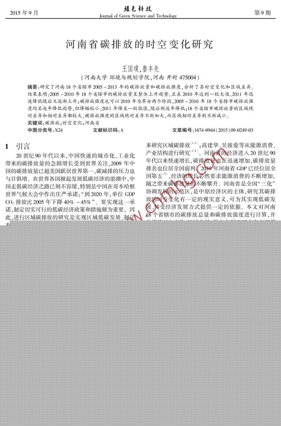 綠色科技2015年9月第9期Journal of Green Science and Technology河南省碳排放的時空變化研究王國璞,魯豐先(河南大學環(huán)境與規(guī)劃學院,河南開封475004)摘要:研究了河南18個省轄市2005 ~2013年的碳排放量和碳排放強度,分析了其時空變化和區(qū)域差異。結果表明:2005 ~2010年18個省轄市的碳排放量呈整體上升趨勢,且在2010年達到一較大值,2011年迅速降低隨后又逐漸上升;碳排放強度也可以2010年為界分兩個階段,2005 ~2010年18個省轄市碳排放強度均呈逐年降低趨勢,但降幅較小,2011年降至一較低值,隨后則逐年降低;18個省轄市碳排放量的區(qū)城絕對差異和相對差異都較大,碳排放強度的區(qū)域絕對差異不斷加大,而區(qū)域相對差異則不斷減小。關鍵詞:碳排放;時空變化;河南省中圖分類號:X24文獻標識碼:A文章編號:1674-9944(2015 )09-0249-031引言來研究區(qū)域碳排放21;高建華、吳彼愛等從能源消費、20世紀90年代以來,中國快速的城市化、工業(yè)化產業(yè)結構進行研究5.4。河南省的經濟進入20世紀90帶來的碳排放量的急劇增長受到世界關注,2009年中年代以來快速增長,碳排放量也在迅速增加,碳排放量國的碳排放量已超美國躍居世界第一- ,碳減排的壓力也排名也位居全國前列。2010年河南省CDP已經位居全與日俱增。在世界各國掀起發(fā)展低碳經濟的浪潮中,中國第五5,經濟的增長必然要求能源消費的不斷增加,國走低碳經濟之路已刻不容緩,特別是中國在哥本哈根隨之帶來碳排放量的不斷攀升。河南省是全國“三化”世界氣候大會中作出莊嚴承諾:“到2020年,單位GDP協(xié)調發(fā)展的示范區(qū),是中原經濟區(qū)的主體,研究其碳排CO2排放比2005年下降40% ~45%”。要實現這一-承放的時空變化有--定的現實意義,可為其實現低碳發(fā)諾,制定切實可行的低碳經濟政策和措施頗為重要。因展、轉變經濟發(fā)展方式提供- -定的依據。本文對河南此,進行區(qū)域碳排放的研究是實現區(qū)域低碳發(fā)展制定18個省轄市的碳排放總量和碳排放強度進行計算,并有效政策的前提和依據。近年來有關碳排放的研究日分析其時空變化、區(qū)域差異,提出有利于河南省實現低益豐富,多數學者如王錚、趙榮欽、魏-鳴等從能源消費碳發(fā)展的對策和建議。收稿日期:2015-0629基金項目:國家自然科學基金項目(編號:41171438) ;河南大學碩士研究生科研創(chuàng)新項目(編號:Y1427010)資助作者簡介:王國璞(1989- ),女,河南周口人,河南大學環(huán)境與現在學院碩士研究生。通訊作者:魯豐先(1974-),男,河南南陽人,副教授,博士,主要從事區(qū)域可持續(xù)發(fā)展研究。的數據和經驗,下一步還將從減噪飛行程序航空公司報,2012(2).噪聲表現排名噪聲附加收費等方面做深入研究,進一2]龔輝,王巧燕.機場航空噪聲監(jiān)測終端選址方法和實踐[J].噪聲與振動控制,2013(2).步推動航空噪聲削減工作。3]王維,高金華,高峰,等.我國民用機場航空噪聲影響現狀及原因分析[J].2003(5).參考文獻:[1]余成軒.機場航空噪聲監(jiān)測系統(tǒng)及其作用[J].中國民航大學學The Application of Aircraft Noise and Operation Monitoring System( ANOMS) in Beijng Capital International AirportDuan Gang , Jiang Wenjuan( Beijing Capital International Airport Co. ,Ld. , Beijing 100621 , China)Abstract : With the rapid growth of the passenger throughput and fligh中國煤化工ir craft noise has becomeincreasingly serious around the airport . As the first and the only one aia ,the airport is strength-ening the use of ANOMS. On the basis of the monitoring data withinTYHCNMH Gbromote the work of noiseabatement through several measures ,such as the calculating of noise contour ,analysis of the priority runway ,recognition ofthe noise sensitive area ,eli mination of the old aircraft ,and monitoring of the ilgal aircraft ,etc.Key words : capital airport ;aircraft noise ; ANOMS ; noise abatement249。王國璞,等:河南省碳排放的時空變化研究環(huán)境及保護勢,但是在2011年降到-較低值隨后增加,然而均未超2研究方法過2010年的最大值。其中平頂山、安陽、鶴壁、漯河、三河南省18個省轄市碳排放量的計算是基于數據的門峽、駐馬店六市則不符合上述特征??色@得性'”.7], 采用替代方法,即碳排放量=單位GDP從空間上,也大致分兩個階段:第- -階段(2005 ~能耗xGDP總量x碳排放系數,其中碳排放系數取0.2010年) ,18個省轄市的碳排放量排名只有鄭州和新鄉(xiāng)738]。區(qū)域差異包括絕對差異和相對差異,研究絕對差不變,分別是第-一、 第七。變動較小的有開封、洛陽、鶴異的方法有標準差、極差等指標;研究相對差異的有變壁、焦作、濮陽、許昌、周口、濟源8市。變動較大的有平異系數、泰爾指數(Theil Index)等21。文中利用標準差頂山、安陽、漯河、三門峽、南陽、商丘、信陽、駐馬店8來研究絕對差異,利用變異系數來研究相對差異。市,其中漯河、信陽、駐馬店變化較大,漯河變化波動較大,且排序一直靠后,信陽的排序則在不斷下降,駐馬店3結果分析的排序也在不斷下降直至倒數第一。第 二階段(2011 ~2013年),碳排放量排名相對都比較穩(wěn)定,排名變動的3.1碳排放量的時空變化特征有開封、平頂山、焦作、信陽、濟源5市,其中濟源保持排2005 ~2013年18個省轄市的碳排放量的差異較名上升,其他4市排名均下降,但變幅較小。其他13市大(表1)。從時間上,可以將其分為兩個階段:第- -階排名保持不變。段(2005 ~ 2010年),碳排放量逐年增加,
