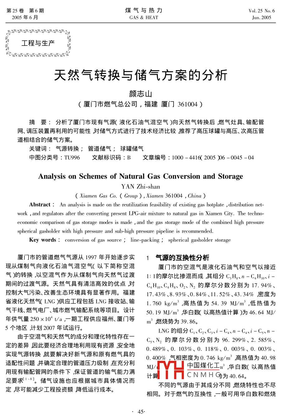 第25卷第6期煤氣與熱力205年6月gas heatJun.2005工程與生產(chǎn)天然氣轉(zhuǎn)換與儲(chǔ)氣方案的分析顏志山(廈門(mén)市燃?xì)饪偣?福建廈門(mén)361004)摘要:分析了廈門(mén)市現(xiàn)有氣源液化石油氣混空氣)向天然氣轉(zhuǎn)換后燃?xì)庠罹?、輸配管網(wǎng)、調(diào)壓裝置再利用的可能性對(duì)儲(chǔ)氣方式進(jìn)行了技術(shù)經(jīng)濟(jì)比較推薦了高壓球罐與高壓、次高壓管道相結(jié)合的儲(chǔ)氣方案。關(guān)鍵詞:氣源轉(zhuǎn)換;管道儲(chǔ)氣;球罐儲(chǔ)氣中圖分類號(hào):TU996文獻(xiàn)標(biāo)識(shí)碼:B文章編號(hào):1000-4416(2005)6-0045-04Analysis on Schemes of Natural Gas Conversion and StorageYan Zhi-shanXiamen Gas Co.( Group), Xiamen 361004, ChinaAbstract: An analysis is made on the reutilization feasibility of existing gas hotplate distribution network and regulators after the converting present LPG-air mixture to natural gas in Xiamen City. The techconomic comparison of gas storage modes is made and the gas storage mode of the combined higholder with high pressure and sub-high pressure pipeline is recommendedords: conversion of gas source line-packing spherical gasholder storage廈門(mén)市的管道燃?xì)鈿庠磸?997年開(kāi)始逐步實(shí)1氣源的互換性分析現(xiàn)從煤制氣向液化石油氣混空氣(以下簡(jiǎn)稱空混廈門(mén)市的空混氣是液化石油氣和空氣以接近氣)轉(zhuǎn)換,以空混氣作為從煤制氣向天然氣過(guò)渡1:1的摩爾比摻混而成其組分CH、n-C2H1期間的過(guò)渡氣源。天然氣具有清潔高效的優(yōu)點(diǎn)對(duì)CH0、CH3、O2、N2的摩爾分?jǐn)?shù)分別為17.94%控制大氣污染、改善生態(tài)環(huán)境具有顯著作用。福建17.43%、8.93%、0.84%、11.52%、43.34%密度為省液化天然氣LNG)供應(yīng)工程包括ING接收站輸1.760kg/m3,高熱值為54.39M/m3,低熱值為氣干線、燃?xì)怆姀S、城市燃?xì)廨斉湎到y(tǒng)等項(xiàng)目。設(shè)計(jì)50.19MJ/m3華白數(shù)以高熱值計(jì)算)為46.64MJ/年供氣量20×10va,期工程供應(yīng)福州、廈門(mén)等m3燃燒勢(shì)為39.86。5個(gè)地區(qū)計(jì)劃2007年試運(yùn)行。LNG的組分C由于空混氣和天然氣的成分和理化特性存在一C5、N2的摩爾分?jǐn)?shù)分別為96.299%、2.585%、定的差異因此要經(jīng)濟(jì)合理地利用現(xiàn)有資源安全地0.489%、0.103%、0.118%、0.003%、0.003%用現(xiàn)有輸配管網(wǎng)的條件下保證管道的輸氣能力清/相密度為076m高熱值為吸實(shí)現(xiàn)氣源轉(zhuǎn)換就要解決好新氣源和原有燃?xì)饩叩倪m配性問(wèn)題并確定合理的管道壓力級(jí)制在充分利0.400中國(guó)煤化工m3,華白數(shù)(以高熱值足要求。儲(chǔ)氣設(shè)施也應(yīng)根據(jù)城市具體情況而計(jì)算CNMH③為40.64。定盡可能減少工程投資額降低運(yùn)行成本不同的氣源由于其成分不同燃燒特性也不盡相同。對(duì)于燃?xì)獾幕Q性,一般可用華白數(shù)和燃燒45第6期煤氣與熱力第25卷勢(shì)判定。當(dāng)兩者燃燒特性相差較大時(shí)還應(yīng)考慮火MPa焰特性如離焰、回火、黃焰和不完全燃燒等。柜式調(diào)壓器出口壓力2800Pa廈門(mén)市的空混氣和天然氣華白數(shù)相差約15%箱式調(diào)壓器出口壓力2600Pa超出了±(5%~10%)的互換范圍,兩種燃?xì)夥謩e灶具額定壓力2000Pa屬于10T、12T天然氣。因此,氣源轉(zhuǎn)換時(shí)需對(duì)燃③管網(wǎng)的置換灶具予以改造??紤]到二者燃燒勢(shì)僅相差2%,廈門(mén)市目前有中低壓管道約700km中-低壓火焰?zhèn)鞑ニ俣冉咏腥細(xì)庠罹叩幕鹂谉釓?qiáng)度、火調(diào)壓站33座用戶約17×104戶。天然氣進(jìn)入廈門(mén)孔總面積和天然氣相適配故在氣源轉(zhuǎn)換過(guò)程中將后對(duì)現(xiàn)有的空混氣輸配管網(wǎng)可采用天然氣直接置灶前壓力從2800Pa調(diào)至2o0Pa調(diào)大燃?xì)庠罹邠Q的方式天然氣經(jīng)調(diào)壓后進(jìn)入現(xiàn)有的空混氣供氣的風(fēng)門(mén),該部分燃?xì)庠罹呖稍谶^(guò)渡階段繼續(xù)使用。系統(tǒng)管網(wǎng)中的空混氣可由用戶直接燃燒使用。置然后分批對(duì)原有燃?xì)庠罹叩膰娮斐叽邕M(jìn)行調(diào)整毎換時(shí)按照從氣源點(diǎn)由近及遠(yuǎn)分區(qū)分期轉(zhuǎn)換。根據(jù)戶的改造費(fèi)用約30元。這樣既可減輕用戶的經(jīng)濟(jì)廈門(mén)市的城市燃?xì)夤庖?guī)模及范圍每個(gè)轉(zhuǎn)換區(qū)域負(fù)擔(dān)還能盡量減少因氣源轉(zhuǎn)換給用戶帶來(lái)的不便。范圍約1km2區(qū)域內(nèi)用戶約5000戶以便于人員2輸配管網(wǎng)的適用性分析組織、聯(lián)絡(luò)和搶險(xiǎn)。區(qū)域內(nèi)商業(yè)、工業(yè)用戶較多時(shí),①工藝流程可將區(qū)域范圍適當(dāng)減小。天然氣由長(zhǎng)輸管道送至廈門(mén)分輸站然后至門(mén)④調(diào)壓與計(jì)量裝置站。在門(mén)站內(nèi)經(jīng)過(guò)濾、調(diào)壓、計(jì)量進(jìn)入城市高壓管目前全市有近400個(gè)調(diào)壓箱,均采用RTZ道經(jīng)高-中壓調(diào)壓站調(diào)壓后由中壓管網(wǎng)輸送到下312Q型調(diào)壓器。根據(jù)廠方提供的數(shù)據(jù)當(dāng)調(diào)壓箱輸級(jí)調(diào)壓設(shè)施直至用戶。入壓力為0.03MPa輸出壓力為2500Pa時(shí),以空②壓力級(jí)制氣為介質(zhì)的流量為50.2m3/h。計(jì)算可得輸入壓力由于上游分輸站來(lái)氣壓力為4.0MPa在安全為0.03MPa輸出壓力為2500Pa時(shí)空混氣流量間距允許條件