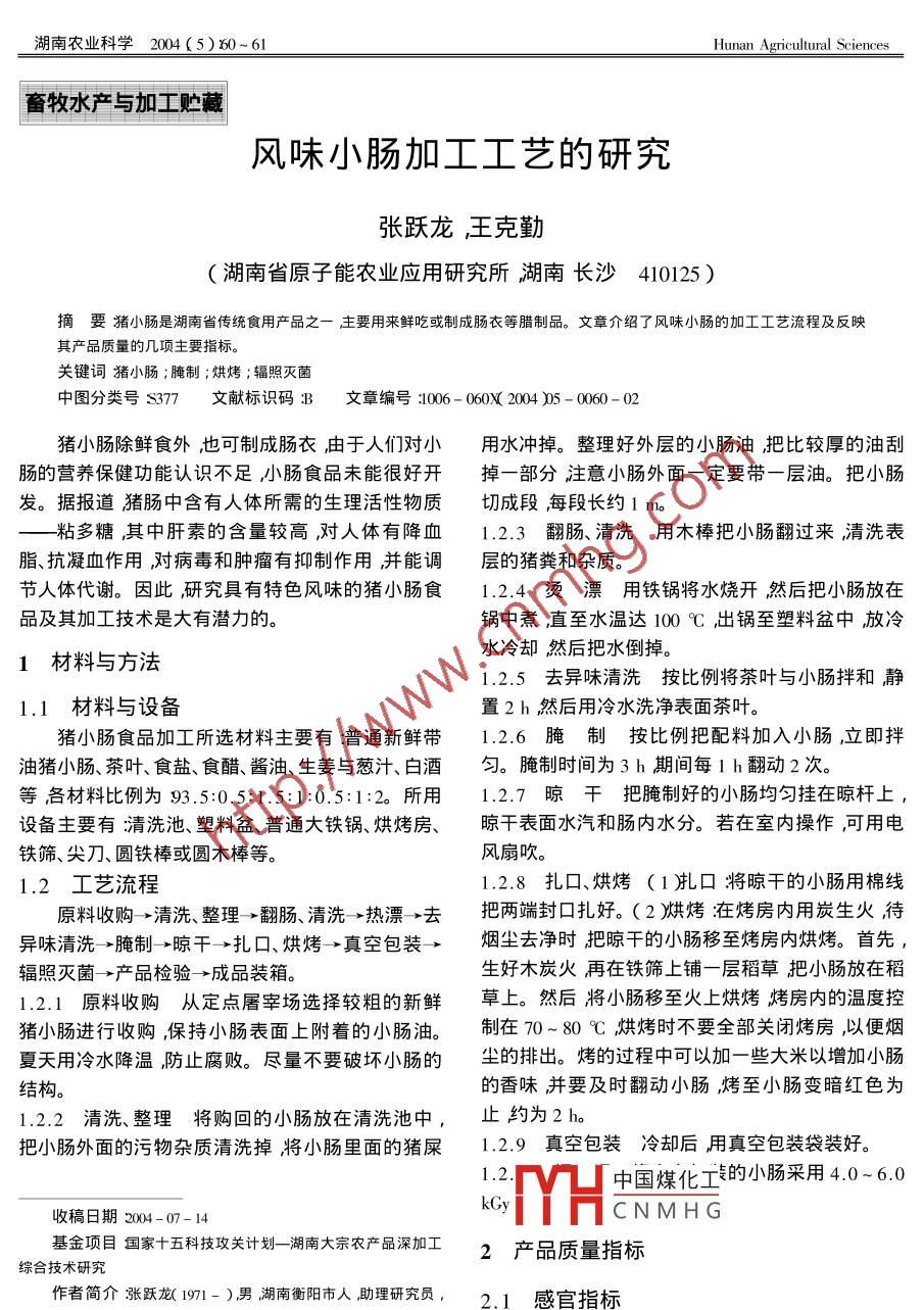湖南農(nóng)業(yè)科學(xué)2004(5):0~61畜牧水產(chǎn)與加工貯藏風味小腸加工工藝的研究張躍龍王克勤湖南省原子能農(nóng)業(yè)應(yīng)用研究所湖南長沙410125)摘要潴小腸是湖南省傳統(tǒng)食用產(chǎn)品之一主要用來鮮吃或制成腸衣等臘制品。文章介紹了風味小腸的加工工藝流程及反映其產(chǎn)品質(zhì)量的幾項主要指關(guān)鍵詞豬小腸;腌制;烘烤;輻照滅中圖分類號S377文獻標識碼B文章編號1006-060X2004)5-0060-02豬小腸除鮮食外也可制成腸衣由于人們對小用水沖掉。整理好外層的小腸油把比較厚的油刮腸的營養(yǎng)保健功能認識不足小腸食品未能很好開掉一部分注意小腸外面一定要帶一層油。把小腸發(fā)。據(jù)報道豬腸中含有人體所需的生理活性物質(zhì)切成段每段長約1m粘多糖其中肝素的含量較高對人體有降血1.2.3翻腸、清洗用木棒把小腸翻過來清洗表恉、抗凝血作用對病毒和腫瘤有抑制作用并能調(diào)層的豬糞和雜質(zhì)節(jié)人體代謝。因此研究具有特色風味的豬小腸食4燙漂用鐵鍋將水燒開然后把小腸放在品及其加工技術(shù)是大有潛力的。鍋中煮直至水溫達100℃出鍋至塑料盆中放冷材料與方法水冷卻然后把水倒掉。1.2.5去異味清洗按比例將茶葉與小腸拌和靜1.1材料與設(shè)備置2h然后用冷水洗凈表面茶葉。豬小腸食品加工所選材料主要有普通新鮮帶1.2.6腌按比例把配料加入小腸,立即拌油豬小腸、茶葉、食鹽、食醋、醬油、生姜與蔥汁、白酒勻。腌制時間為3h期間每Ih翻動2次。等各材料比例為93.5:0.5:1.5:1:0.5:1:2。所用7晾干把腌制好的小腸均勻掛在晾杄上設(shè)備主要有清洗池、塑料盆、普通大鐵鍋、烘烤房、晾干表面水汽和腸內(nèi)水分。若在室內(nèi)操作,可用電鐵篩、尖刀、圓鐵棒或圓木棒等。風扇吹。1.2工藝流程1.2.8扎口、烘烤(1虬口將晾干的小腸用棉線原料收購→清洗、整理→-翻腸、清洗-熱漂→去把兩端封口扎好。(烘烤在烤房內(nèi)用炭生火待異味清洗→亠腌制-晾干→扎口、烘烤-真空包裝?煙塵去凈時把晾干的小腸移至烤房內(nèi)烘烤。首先輻照滅菌→產(chǎn)品檢驗→亠成品裝箱。生好木炭火再在鐵篩上鋪一層稻草把小腸放在稻1.2.1原料收購從定點屠宰場選擇較粗的新鮮草上。然后將小腸移至火上烘烤烤房內(nèi)的溫度控豬小腸進行收購保持小腸表面上附著的小腸油。制在70~80℃烘烤時不要全部關(guān)閉烤房,以便煙夏天用冷水降溫防止腐敗。盡量不要破壞小腸的塵的排出??镜倪^程中可以加一些大米以增加小腸結(jié)構(gòu)的香味并要及時翻動小腸,烤至小腸變暗紅色為1.2.2清洗、整理將購回的小腸放在清洗池中,止約為2h把小腸外面的污物雜質(zhì)清洗掉將小腸里面的豬屎1.2.9真空包裝冷卻后用真空包裝袋裝好收稿日期2004-07-14AGaTHA中國煤化工的小腸采用4.0~60CNMHG基金項目國家十五科技攻關(guān)計劃一湖南大宗農(nóng)產(chǎn)品深加工2產(chǎn)品質(zhì)量指標綜合技術(shù)研究作者簡介張躍龍(1971-)男湖南衡陽市人助理研究員2.1感官指標主要從事農(nóng)產(chǎn)品加工研究工作感官指標主要指小腸食品的色澤、形態(tài)、氣味。第5期張躍龍等諷味小腸加工工藝的研究各指標要求如下。色澤外觀暗紅色均勻一致。形3結(jié)果與分析態(tài)表面光滑大小均勻。氣味洧烤肉的香味。(1采用以上工藝生產(chǎn)的小腸既保持了小腸的2.2理化指標營養(yǎng)價值而且小腸油中也有許多營養(yǎng)因子經(jīng)過此理化指標主要指小腸食品的水分及重金屬元素工藝形成了獨特風味的小腸食品無煙熏味并延長含量。其中水分要低于10%,砷、鉛、銅等的含量了小腸的保質(zhì)期。符合國家標準的要求。(2珈加工后的小腸用微波爐加熱或即食皆可。2.3微生物指標(3)工藝生產(chǎn)的風味小腸投資不大操作方符合食品行業(yè)標準。便既可適用家庭手工生產(chǎn)也可進行工業(yè)化生產(chǎn)上接第59頁)生產(chǎn)實踐信息(6屆內(nèi)外雜交水稻在研項目動態(tài)跟2.4資金困難蹤信息(7閫內(nèi)外雜交水稻研究論文、著作、學(xué)術(shù)報中國正處在社會主義初級階段經(jīng)濟還不富裕,告、會議資料等文獻信息〔8)國內(nèi)外雜交水稻專家國家資金有困難而農(nóng)業(yè)又是一個弱勢產(chǎn)業(yè)農(nóng)業(yè)科與咨詢信息(9交稻國際合作研究與開發(fā)信息研的社會效益大但自身經(jīng)濟效益小因此用于農(nóng)業(yè)(10內(nèi)外雜交水稻組織機構(gòu)及其主要負責人信信息資源建設(shè)的投資自然更少。這是雜交水稻信息息(11內(nèi)外雜交水稻產(chǎn)量、效益綜合信息(12)資源建設(shè)不能持續(xù)的根本原因雜交水稻產(chǎn)業(yè)化經(jīng)營與市場開發(fā)信息3雜交水稻信息資源建設(shè)的發(fā)展策略從長遠的觀點看雜交水稻信息資源在未來的開發(fā)利用中將有技術(shù)含量更高的新知識信息出現(xiàn),3.1指導(dǎo)思想并且這些高科技知識信息將融化在虛擬現(xiàn)實(ⅤR)雜交水稻信息資源建設(shè)的基本指導(dǎo)思想如下的技術(shù)之中。如虛擬廣告、虛擬商城、虛擬遺傳基因是以市場為導(dǎo)向以技術(shù)創(chuàng)新為依托以效益為中工程等等。無疑在未來雜交水稻的生產(chǎn)管理上心上網(wǎng)服務(wù),快捷、準確、及時、公平競爭、資源共必將實現(xiàn)智能化。享、造福