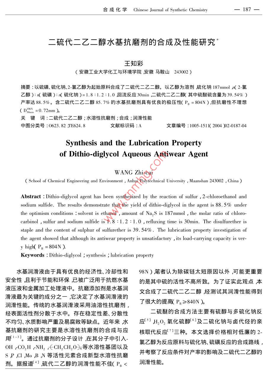 二硫代二乙二醇水基抗磨劑的合成及性能研究 二硫代二乙二醇水基抗磨劑的合成及性能研究