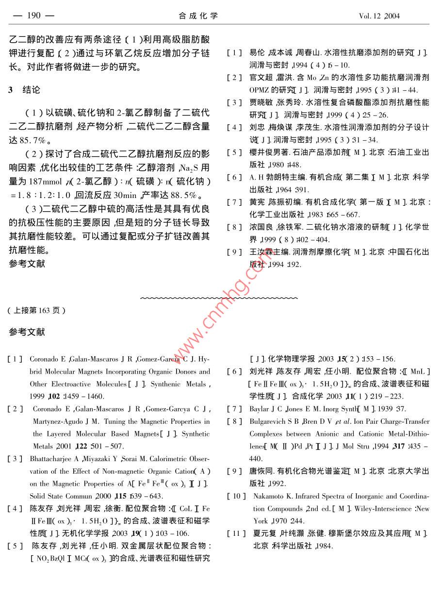 合成化學(xué) Chinese Journal of Synthetic Chemistry187二硫代二乙二醇水基抗磨劑的合成及性能研究王知彩安徽工業(yè)大學(xué)化工與環(huán)境學(xué)院安徽馬鞍山243002)摘要:以硫磺、硫化鈉、2-氯乙醇為起始原料合成了二硫代二乙二醇。以乙醇為溶劑硫化鈉187moκ2·氯乙醇):κ硫磺):κ硫化鈉)=1,8:1.2:1.0冋回流反應(yīng)30min匚硫代二乙二釀`其中硫醚硫含量為39.54%)產(chǎn)率達(dá)8.5%。含二硫代二乙二醇85.7%的水基抗磨劑具有優(yōu)良的極壓性(P=804N),但抗磨性不理想(D3o=0.72mm關(guān)鍵詞:二硫代二乙二醇;水溶性抗磨劑;合成;潤滑性能中圖分類號:0623.82丌TF624.8文獻(xiàn)標(biāo)識碼:A文章編號:1005-1511(200402018704Synthesis and the lubrication Propertyof Dithio-diglycol Aqueous Antiwear AgentWANG Zhi-caSchool of Chemical Engineering and Environment Anhui Polytechnical University Maanshan 243002, ChinaAbstract: Dithio-diglycol agent has been synthesized by the reaction of sulfur 2-chloroethanol andsodium sulfide. The results demonstrate that the yield of dithio-diglycol in the agent is 88. 5% underthe optimism conditions: solvent is ethanol, amount of Na, S is 187mmol, the molar ratio of chlorocarbinol, sulfur and sodium sulfide is 1.8:1.2: 1.0, refluxing time is 30min. The disulfurether isstaple and the content of sulphur of sulfurether is 39. 54%. The lubrication property investigation ofthe agent showed that although its antiwear property is unsatisfactory its load-carrying capacity is ver-y higH( PB=804N)Keywords: Dithio-diglycol synthesis i lubrication property水基潤滑液由于具有優(yōu)良的經(jīng)濟(jì)性、冷卻性和98N)筆者認(rèn)為除碳鏈太短原因以外,可能更重要安全性且利于節(jié)能和環(huán)保已被廣泛用于抗燃水基的是其中硫的活性不高所致。為了證實(shí)此觀點(diǎn)本液壓液和金屬加工處理液中??鼓ヌ砑觿┦撬鶟櫸暮铣闪硕虼叶冀?jīng)測試其潤滑性能得到滑液最為關(guān)鍵的成分之一它決定了水基潤滑液的潤滑性能。傳統(tǒng)的水基潤滑液采用油溶性抗磨劑了很大的提高PB≥840N經(jīng)表面活性劑分散于水中。存在穩(wěn)定性差、分散性二硫醚的合成方法主要有硫醇與多硫化鈉反不均勻、水質(zhì)影響嚴(yán)重及易腐敗等缺點(diǎn)。近年來水應(yīng)3〕H2O2氧化硫醇6及二硫化鈉與鹵代烴的親基抗磨劑的研究主要是水溶性抗磨劑的合成與應(yīng)核取代反應(yīng)三種。本文選擇價(jià)格相對低廉的2用1-3通過抗磨劑的分子設(shè)計(jì)在其分子中引入OH;CO2HNH2,∈CH2CH2O等水溶性基團(tuán)以及氯乙醇為反應(yīng)原料與硫化鈉、硫磺反應(yīng)的合成路線SPCI Mo, B,N等活性元素合成新型水溶性抗磨并考察了反應(yīng)條件對產(chǎn)率的影響及二硫代二乙醇的劑。據(jù)報(bào)道41,硫代二乙醇的潤滑性能不佳(Pn<潤滑性能。188合成化學(xué)Vol.122004反應(yīng)式如下:在可由分析結(jié)果推算出抗磨劑的大致組成為巰醇2CICH, CH, OH1.3%硫代二乙醇13.0%,二硫代二乙二醇857%HOCH. CH SSCH CHOH +2NacTable 1 The Composition of Reaction Product wt/%)1實(shí)驗(yàn)部分Total sulphur40.08Sulphur of thioalcohol0.541.1儀器與試劑PE-1725X型傅立葉紅外光譜儀KBr涂膜法)Chlorine0.02廈門試驗(yàn)機(jī)廠生產(chǎn)的Ms-800型四球機(jī)(摩擦副:Φ12.7mm-級GCrl5軸承鋼球)產(chǎn)物中硫及硫醇含量按化學(xué)分析法測定”殘抗磨劑的IR光譜分析結(jié)果顯示:3390cm-1為余氯利用卡里烏斯法測定。將所制得二硫代二乙~OH伸縮振動(dòng)吸收峰2920cm-1為CH2-的伸縮振動(dòng)醇配制成1%的水溶液,四球機(jī)測試其抗磨性吸收峰530cm-處產(chǎn)生的峰為-S-S彎曲振動(dòng)吸收(D)和極壓性P值峰50cmˉ處岀現(xiàn)CH,-S-的CS彎曲振動(dòng)特征峰1420cm-處是-S-CH2-的-CH2S的彎曲振動(dòng)吸收峰。2-氯乙醇化學(xué)純無水乙醇硫磺硫化鈉等均為分析純試劑由此可以推斷它具有二硫代二乙醇的紅外光譜特征1.2Na2S2的合成312.2反應(yīng)條件對抗磨劑產(chǎn)率的影響在250mL三頸燒瓶中加入Na2S14.6由于二硫化鈉的合成條件及影響文獻(xiàn)8已做187mmol)58℃水浴加熱攪拌熔融30min后加入詳細(xì)報(bào)道本文僅對二硫化鈉與2氯乙醇合成二硫硫磺7222mo),并在此溫度下攪拌反應(yīng)lh,代二乙醇反應(yīng)條件的影響進(jìn)行試驗(yàn)研究。即得產(chǎn)率為95%的紅色Na2S2溶液約0.18mol(1)溫度對抗磨劑產(chǎn)率的影響1.3二硫代二乙二醇抗磨劑的合成改變反應(yīng)溫度其它反應(yīng)條件同1.3考察不同在1.2制得的Na2S2溶液中加入無水乙醇的反應(yīng)溫度對抗磨劑收率的影響結(jié)果見圖1。由120mL裝好冷凝回流裝置。攪拌下30min內(nèi)滴加圖1可知隨溫度升高抗磨劑產(chǎn)率增加當(dāng)反應(yīng)溫2氯乙醇2mn(約0.32ml)加熱回流30mn。反度達(dá)到65后產(chǎn)率隨溫度的變化不大。由此表應(yīng)混合物靜置冷卻,上層為黃色透明油狀液體,下明在30min的反應(yīng)時(shí)間內(nèi)合成反應(yīng)受動(dòng)力學(xué)控層為白色固體。將反應(yīng)混合物在攪拌下滴加濃鹽制溫度升高有利于加快反應(yīng)速度提高反應(yīng)產(chǎn)率。酸直到對姜黃試紙呈中性。過濾,無水乙醇洗滌。盡管反應(yīng)溫度達(dá)到65℃后升高溫度反應(yīng)產(chǎn)率提高濾液常壓蒸餾除去溶劑乙醇后減壓蒸餾80℃/16.明顯但考慮到乙醇回流時(shí)反應(yīng)易于控制。因此7kPa脎除去未反應(yīng)的2-氯乙醇得二硫代二乙二醇為及應(yīng)溫度選擇乙醇的回