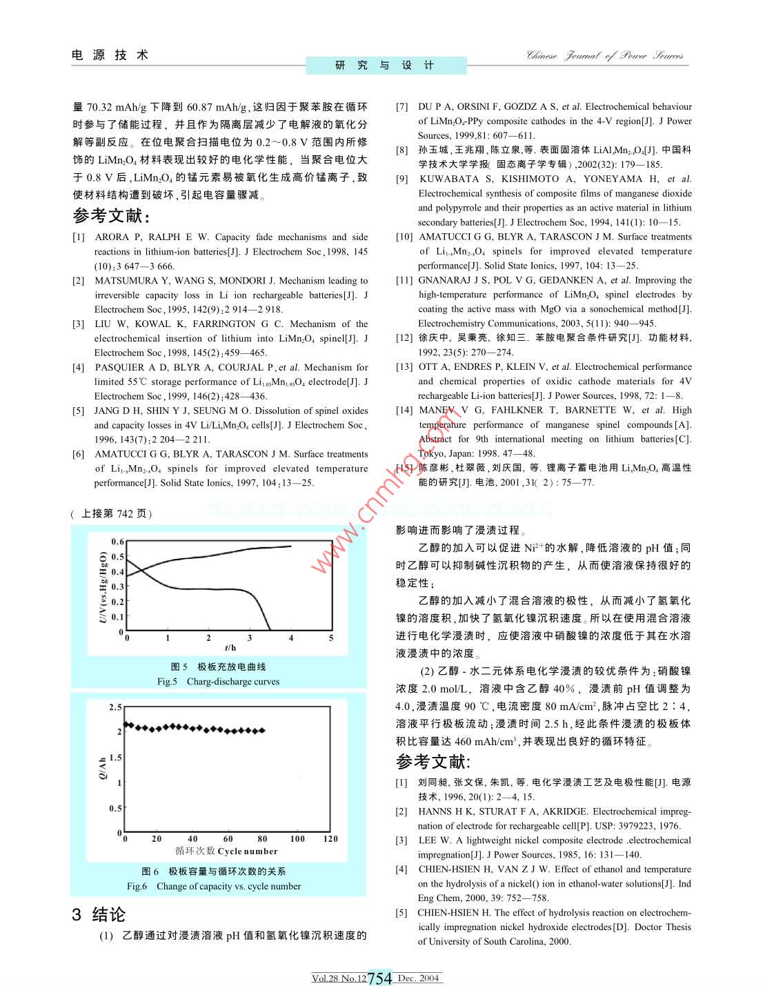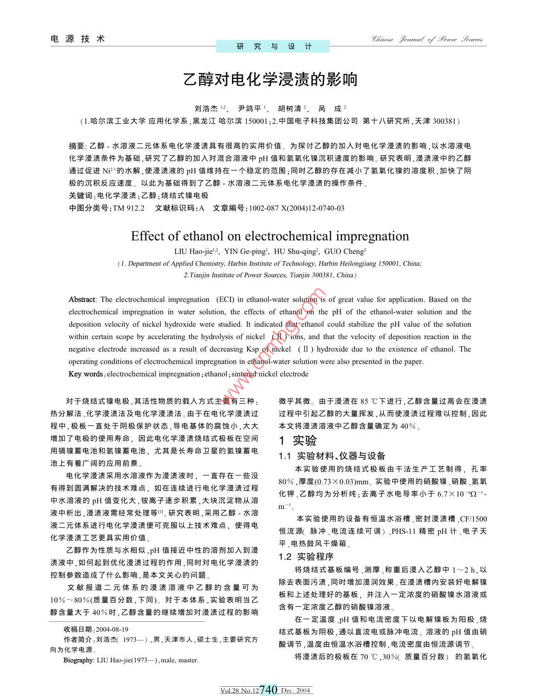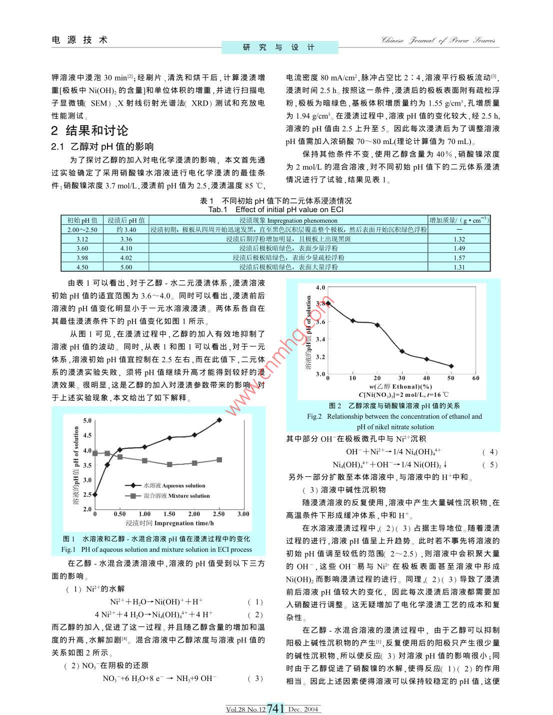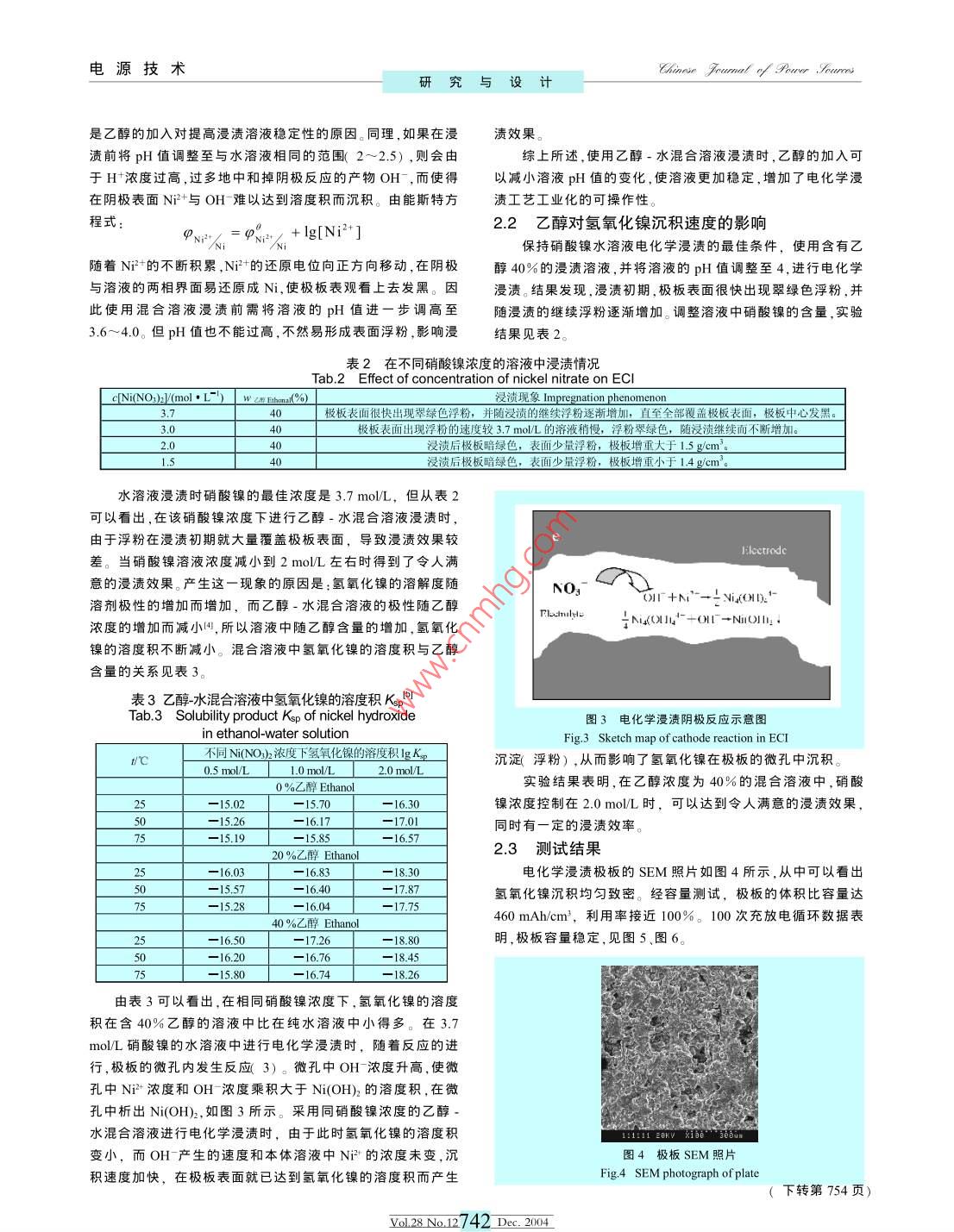 電源技術(shù)Chinese fumet y our.orme研究與設(shè)計(jì)乙醇對(duì)電化學(xué)浸漬的影響劉浩杰尹鴿平1,胡樹清2,咼成(1.哈爾濱工業(yè)大學(xué)應(yīng)用化學(xué)系,黑龍江哈爾濱150001;2.中國(guó)電子科技集團(tuán)公司第十八研究所,天津300381)摘要:乙醇-水溶液二元體系電化學(xué)浸漬具有很高的實(shí)用價(jià)值。為探討乙醇的加入對(duì)電化學(xué)浸漬的影響,以水溶液電化學(xué)浸漬條件為基礎(chǔ),研究了乙醇的加入對(duì)混合溶液中pH值和氫氧化鎳沉積速度的影響。研究表明,浸漬液中的乙醇通過促進(jìn)Ni的水解,使浸漬液的pH值維持在一個(gè)穩(wěn)定的范圍;同時(shí)乙醇的存在減小了氧化鎳的溶度積,加快了陰極的沉積反應(yīng)速度。以此為基礎(chǔ)得到了乙醇·水溶液二元體系電化學(xué)浸漬的操作條件。關(guān)鍵詞:電化學(xué)浸漬:乙醇:燒結(jié)式鎳電極中圖分類號(hào):TM912.2文獻(xiàn)標(biāo)識(shí)碼:A文章編號(hào):1002-087X(2004)12-0740-03Effect of ethanol on electrochemical impregnationLIU Hao-jiel2, YIN Ge-ping', HU Shu-qing, GUO Cheng2(I. Department of Applied Chemistry, Harbin Institute of Technology, Harbin Heilongjiang 150001, China;2. Tianjin Institute of Power Sources, Tianjin 300381, ChinaAbstract: The electrochemical impregnation (ECI) in ethanol-water solution is of great value for application. Based on theelectrochemical impregnation in water solution, the effects of ethanol on the ph of the ethanol-water solution and thedeposition velocity of nickel hydroxide were studied. It indicated that ethanol could stabilize the pH value of the solutionwithin certain scope by accelerating the hydrolysis of nickel (II) ions, and that the velocity of deposition reaction in thenegative electrode increased as a result of decreasing Ksp of nickel ( Il) hydroxide due to the existence of ethanol. Theoperating conditions of electrochemical impregnation in ethanol-water solution were also presented in the paper.Key words: electrochemical impregnation ethanol; sintered nickel electrode對(duì)于燒結(jié)式鎳電極,其活性物質(zhì)的載入方式主要有三種微乎其微。由于浸漬在85℃下進(jìn)行,乙醇含量過高會(huì)在浸漬熱分解法、化學(xué)浸漬法及電化學(xué)浸漬法。由于在電化學(xué)浸漬過過程中引起乙醇的大量揮發(fā),從而使浸漬過程難以控制,因此程中,極板一直處于陰極保護(hù)狀態(tài),導(dǎo)電基體的腐蝕小,大大本文將漫漬溶液中乙醇含量確定為40%。增加了電極的使用壽命,因此電化學(xué)漫漬燒結(jié)式極板在空間1實(shí)驗(yàn)用鎘鎳蓄電池和氬鎳蓄電池,尤其是長(zhǎng)壽命衛(wèi)星的氬鎳蓄電1.1實(shí)驗(yàn)材料、儀器與設(shè)備池上有著廣闊的應(yīng)用前景電化學(xué)浸漬采用水溶液作為浸漬液時(shí),一直存在一些沒本實(shí)驗(yàn)使用的燒結(jié)式極板由干法生產(chǎn)工藝制得,孔率有得到圓滿解決的技術(shù)難點(diǎn),如在連續(xù)進(jìn)行電化學(xué)浸漬過程80%,厚度(0.73×0.03)mm。實(shí)驗(yàn)中使用的硝酸鎳、硝酸、氬氧中水溶液的pH值變化大,銨離子逐步積累,大塊沉淀物從溶化鉀、乙醇均為分析純;去離子水電導(dǎo)率小于67×102液中析出,浸漬液需經(jīng)常處理等。研究表明,采用乙醇-水溶本實(shí)驗(yàn)使用的設(shè)備有恒溫水浴槽密封浸漬槽CF/1500液二元體系進(jìn)行電化學(xué)浸漬便可克服以上技術(shù)難點(diǎn),使得電化學(xué)浸漬工藝更具實(shí)用價(jià)值恒流源脈沖、電流連續(xù)可調(diào))、PHS-1l精密pH計(jì)、電子天平電熱鼓風(fēng)干燥箱乙醇作為性質(zhì)與水相似,pH值接近中性的溶劑加入到浸化浸漬過程的作用,同時(shí)對(duì)電化學(xué)漫漬的12實(shí)驗(yàn)程序控制參數(shù)造成了什么影響,是本文關(guān)心的問題。將燒結(jié)式基板編號(hào)測(cè)厚、稱重后浸入乙醇中1~2h.以文獻(xiàn)報(bào)道二元體系的漫漬溶液中乙醇的含量可為除去表面污漬,同時(shí)增加浸潤(rùn)效果。在浸漬槽內(nèi)安裝好電解鎳10%~80%(質(zhì)量百分?jǐn)?shù),下同)。對(duì)于本體系,實(shí)驗(yàn)表明當(dāng)乙板和上述處理好的基板,并注入一定濃度的硝酸鎳水溶液或醇含量大于40%時(shí),乙醇含量的繼續(xù)增加對(duì)浸漬過程的影響含有一定濃度乙醇的硝酸鎳溶液。在一定溫度、pH值和電流密度下以電解鎳板為陽(yáng)極、燒收稿日期:200408-19結(jié)式基板為陰極,通以直流電或脈沖電流。溶液的pH值由硝作者簡(jiǎn)介:劉浩杰1973-),男天津市人,碩士生,主要研究方酸調(diào)節(jié),溫度由恒溫水浴槽控制,電流密度由恒流源調(diào)節(jié)向?yàn)榛瘜W(xué)電源。Biography: LIU Hao-jie(1973-), male, master.將浸漬后的極板在70℃,30%質(zhì)量百分?jǐn)?shù))的氫氧化yol28No12740Dec,2004電源技術(shù)Chinese fumet y our.orme研究與設(shè)計(jì)鉀溶液中浸泡3σmin;經(jīng)刷片、清洗和烘干后,計(jì)算漫漬増電流密度8σmAm,脈沖占空比2:4,溶液平行極板流動(dòng)重[極板中Ni(OH的含量]和單位體積的增重,并進(jìn)行掃描電浸漬時(shí)間2.5h。按照這一條件,浸漬后的極板表面附有疏松浮子顯微鏡(SEM)、Ⅹ射線衍射光譜法(ⅹRD)測(cè)試和充放電粉,極板為暗綠色,基板體積增質(zhì)量約為1.55gcm,孔增質(zhì)量性能測(cè)試。為1.94gcm3。在浸漬過程中,溶液pH值的變化較大,經(jīng)2.5h,2結(jié)果和討論溶液的pH值由2.5上升至5。因此每次浸漬后為了調(diào)整溶液