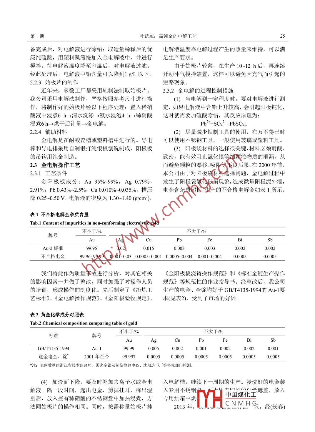 2014年2月貴金屬Feb.2014第35卷第1期Precious MetalsVoL 35. No高純金的電解工藝葉躍威(浙江省遂昌金礦有限公司,浙江遂昌323304)摘要:介紹了遂昌金礦有限公司的高純金電解工藝。實(shí)踐表明,采用該工藝,在金陽極板含金95%~9%下經(jīng)過一次金電解,金純度即可達(dá)到99,997%以上。經(jīng)檢測(cè),雜質(zhì)含量低于高純金(9999%的雜質(zhì)要求關(guān)鍵詞:有色金屬冶金;高純金;電解中圖分類號(hào):TF831文獻(xiàn)標(biāo)識(shí)碼:B文章編號(hào):1004-0676(2014)01-002304Electrolysis Process of High Purity GoldYE Yuewe(Suichang Gold Mine Limited Company, Suichang 323304, Zhejiang, China)Abstract: The high-purity gold electrolysis process of Suichang Gold Mine Co Ltd, is introduced. Theproduction practice showed that, the content of gold can reach above 99.997% after only one cyclelectrolysis from the anode plate which contains 95%0-99% gold. The test results showed thats accord with the requirement of Chinese national standard of high-purity gold(99.999%)Key words: nonferrous metallurgy; high purity gold; electrolysis process國(guó)標(biāo)一號(hào)金乃至高純金的生產(chǎn)工藝主要有化學(xué)指出,以99.9%或9999%黃金作為陽極,用滌綸濾法、溶劑萃取法和金電解法?;瘜W(xué)法提純具有投資布制作陽極濾袋,將陽極與電解液隔離,用純度為少,金屬積壓少的優(yōu)點(diǎn),但也有其無法克服的缺點(diǎn),99.99%的金始極片作陰極,可得到品位99,999%金即由于還原金粉的吸附作用,以AuCI-Ag的形態(tài)電解精煉是提高金的純度最為實(shí)用的一種方存在,以通常的方法難以去除,故銀等雜質(zhì)偏高。法,不僅除雜質(zhì)效果好,而且流程短,操作簡(jiǎn)便?;瘜W(xué)還原分離法一般以99.9%質(zhì)量分?jǐn)?shù),下同)遂昌金礦有限公司(以下簡(jiǎn)稱“我公司”)采用的是以上的Au作為原料,通過王水溶解造液,鹽酸趕非對(duì)稱交流電源,對(duì)含Au95%9%、Ag0.8%硝,控制溶液中的Au(I濃度及還原劑草酸的用量3.6%、Pb0.43%-5.41%的電解原料采用特殊的工藝和還原時(shí)間及溫度來實(shí)現(xiàn)5N金的生產(chǎn)。但此法對(duì)控制手段,電解金的質(zhì)量普遍在99997%以上,用環(huán)境污染較大,成本較高,勞動(dòng)強(qiáng)度大。該電解金澆鑄的金錠化學(xué)成份不僅優(yōu)于國(guó)標(biāo)一號(hào)金溶劑萃取法通常將9999A叫(金粉或陰極的要求,而且一次性生產(chǎn)出雜質(zhì)含量小于高純金金)用王水溶液或電解造液的方法制備較純的氯金(99.999%要求的高純金。酸溶液,再用高純乙醚萃取,經(jīng)反萃后以二氧化硫(高純草酸)還原,即可得到品位99,999金。但此法1電解原理同樣會(huì)對(duì)環(huán)境造成較大污染,而且存在易爆、易燃的防范問題電解精煉時(shí),以粗金作陽極,用純金始極片作會(huì),YH史圖國(guó)煤化工MHG收稿日期:2013-04-22作者:葉躍威,男,高級(jí)工程師,研究方向:選冶、化驗(yàn)技術(shù)。E-mail:yyw765@aliyun.com貴金屬第35卷au-3e= Al主要的雜質(zhì)為銀。為了解決銀的危害,我公司采用的是非對(duì)稱交流電源,該電源有如下優(yōu)勢(shì):對(duì)處理式中Me代表比較活潑的金屬元素。含銀較高的金陽極板,既可解決陽極鈍化問題,又陰極主要發(fā)生下列反應(yīng)可降低電源本身引起的陰極瞬時(shí)貧化,從而獲得較Au++3e=Au高純度的電金。另外,非對(duì)稱交流電源結(jié)構(gòu)簡(jiǎn)單Me+ne=Me只需變壓器調(diào)壓,可控硅控制導(dǎo)通時(shí)間即可,電工從上述陽極和陰極過程看,如果選擇適當(dāng)槽電可自行制作。壓(即適當(dāng)控制陰極電流密度),控制陰極只有Au2.1.2操作制度析出,而使活潑金屬(Me)不析出或基本不析出,仍對(duì)金電解的工具、設(shè)備等必須采用專用制度,留于電解液中,這樣金就得到了純化。不許混亂使用。操作中使用專用手套及專用工具我公司金電解工藝流程圖如下所示專用物品擺放在專用工具箱中,對(duì)通風(fēng)等設(shè)施均采用木質(zhì)、塑料等材料,避免鐵釘?shù)氖褂?。金?.1.3塑料陽極框的使用我們根據(jù)金電解槽及金陽極板的尺寸,自制了金陽極板澆鑄塑料陽極框。每次使用前,在陽極框外套用兩層耐酸的滌綸布。這樣,在清洗殘極時(shí)能輕松拿取,避免陽極泥滴落到電解液中,同時(shí)在有限的極距間避免發(fā)生短路事故。裝槽電解2.1.4濃差極化的克服由于電解液含金量大,靜態(tài)生產(chǎn)時(shí)溶液易分層當(dāng)濃差極化嚴(yán)重時(shí),生產(chǎn)出的電金下部分很好,而金陽極泥電解金金殘極上部分出現(xiàn)黑色的海綿金。為了克服濃差極化,某冶煉廠采用在金電解系統(tǒng)中增設(shè)一個(gè)高位槽和一個(gè)[銀陽極澆鑄[硝酸一次浸煮低位槽,通過鈦泵使金電解液采用下進(jìn)上出的方式進(jìn)行循環(huán)8。這無疑增加了金的積壓和操作環(huán)境對(duì)氨水浸煮金純度的影響因素。我公司采用一套自制的充氣裝置,不需額外增加金的積壓,很好地解決了濃差極硝酸二次浸煮化問題。22對(duì)金電解原料的要求切割澆鑄」22.1金陽極板盡量提高金陽極板的質(zhì)量,減少其中的雜質(zhì)含高純金錠量,對(duì)高純金的生產(chǎn)至關(guān)重要。我公司采用“黑金圖1金電解工藝流程圖粉硝酸一段浸出→高鉛金粉→堿浸岀→硝酸二段浸Fig. I Diagram of gold electrolysis process出→澆鑄除雜→金陽極”的工藝,處理后的金陽極板含鉛可降到1%以下,金陽極含金