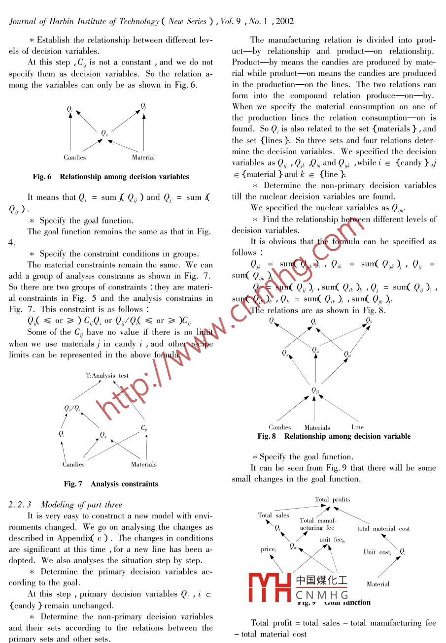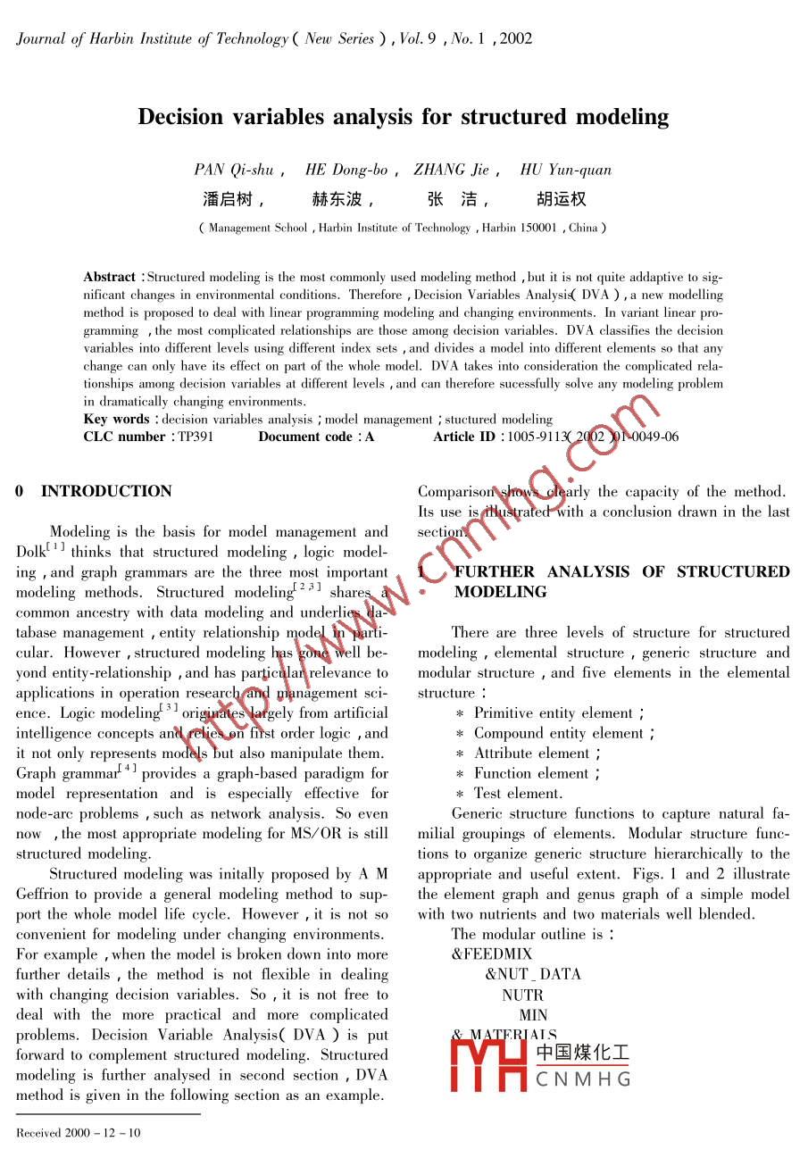 Journal of Harbin Institute of Technology( New Series ) , Vol. 9 ,No. 1 ,2002Decision variables analysis for structured modelingPAN Qi-shu ,HE Dong-bo,ZHANG Jie,HU Yun-quan潘啟樹,赫東波,張潔,胡運權(quán)( Management School , Harbin Institute of Technology , Harbin 150001 , China )but it is not quite addaptive to sig-nificant changes in environmental conditions. Therefore , Decision Variables Analysi( DVA ) ,a new modellingmethod is proposed to deal with linear programming modeling and changing environments. In variant linear pro-gramming , the most complicated relationships are those among decision variables. DVA classifies the decisionvariables into different levels using different index sets , and divides a model into different elements so that anychange can only have its effect on part of the whole model. DVA takes into consideration the complicated rela-tionships among decision variables at different levels , and can therefore sucessfully solve any modeling problemin dramatically changing environments.Key words : decision variables analysis ; model management ; stuctured modelingCLC number : TP391Document code : AArticle ID : 1005-9113( 2002 )01 -0049-060 INTRODUCTIONComparison shows clearly the capacity of the method.Its use is illustrated with a conclusion drawn in the lastModeling is the basis for model management ancsection.Dolk' 1] thinks that structured modeling , logic model-ing , and graph grammars are the three most important1FURTHER ANALYSIS OF STRUCTUREDmodeling methods. Structured modeling231 shares aMODELINGcommon ancestry with data modeling and underlies da-tabase management , entity relationship model in parti-There are three levels of structure for structuredcular. However , structured modeling has gone well be-modeling , elemental structure , generic structure andyond entity-relationship , and has particular relevance tomodular structure , and five elements in the elementalapplications in operation research and management sci-structure :ence. Logic modeling 31 originates largely from artificial* Primitive entity element ;intelligence concepts and relies on first order logic , andCompound entity element ;it not only represents models but also manipulate them.* Attribute element ;Graph grammar + J provides a graph-based paradigm forFunction element ;model representation and is especially effective fo*Test element.node-arc problems , such as network analysis. So evenGeneric structure functions to capture natural fa-now , the most appropriate modeling for MS/OR is stillmilial groupings of elements. Modular structure func-structured modeling.tionsto organize generic structure hierarchically to theStructured modeling was initally proposed by A Mappropriate and useful extent. Figs. 1 and 2 illustrateGeffrion to provide a general modeling method to sup-the element graph and genus graph of a simple modelport the whole model life cycle. However ,it is not sowith two nutrients and two materials well blended.convenient for modeling under changing environments.The modular outline is :For example , when the model is broken down into more&FEEDMIXfurther details ,the method is not flexible in dealing&NUT_ DATAwith changing decision variables. So , it is not free toNUTRdeal with the more practical and more complicatedMINproblems. Decision Variable Analysis( DVA ) is put& MATFRIAISforward to complement structured modeling. Structured中國煤化工modeling is further analysed in second section ,DVAYHCNMHG.method is given in the following section as an example.Reeived 2000-12- 1049.Journal of Harbin Institute of Technology( New Series ) ,Vol. 9 ,No. 1 ,2002Nutrition testprogramming because they form the relationship amongthe components of an optimization problem that cannuitsition levelstotal-costgenerally be divided into goal and constraint condi-tions. Some definitions and theorems are as defined be-ow :( 1 ) Levels of decision variables. Decision varia-unit cosquantity,bles can be classified to different levels by different? R 9sansets , so that we can find different levels of decisionvariables.( 2 ) Primary deoision variables and primary setsof decision variables. The set to which decision varia-nutrientsmaterialsbles naturally belongs by semantic is called the primaryFig. 1 Element graph for a 2 x 2 feedmix modelset of decision variables , and at the same time , thevariables are called primary decision variables. For ex-TNlevelample , quantity is the primary decision variable whilethe product is the primary set for a product-mix prob-Totcostlem , and the primary set in transportation is the Carte-sian product of suppliers and customers.A MinAnalysis. ,Ucost( 3 ) Nuclear decision variables. When the deci-sion variables are divided into further details by allB.kinds of relevant sets till they can not be divided anyNutrMaterialfurther , and the decision variables at this level arecalled nuclear decision variables.Fig.2 Genus graph for feedmix model( 4 ) Molecular decision variables. Decision varia-bles other than decision variables at nuclear level areANALYSIScalled molecular decision variables.( 5 ) Final decision variables. The variables whichNLEVELcan used to represent other levels of variables while theT :NLEVELmodel is finally constructed are called final decisionTOTCOSTIn structured modeling ,decision variables andPrimary or final decision variables can be nuclearfixed parameters are taken as two varieties of the samedecision variables sometimes , and they can also be mo-construction. Geoffrion thinks that this is appropriatelecular ones in other conditions.from the perspective of the whole modeling life cycle.Theorem 1 In linear programming , any molecu-However , decision variables are essential for modeling.lar variables can be presented by linear combination ofFor example , after we divide thgeneric graph into twonuclear variables.parts A and B according to the goal and constraint con-Theorem 2 In linear programming , any linearditions , we can see the intersecti