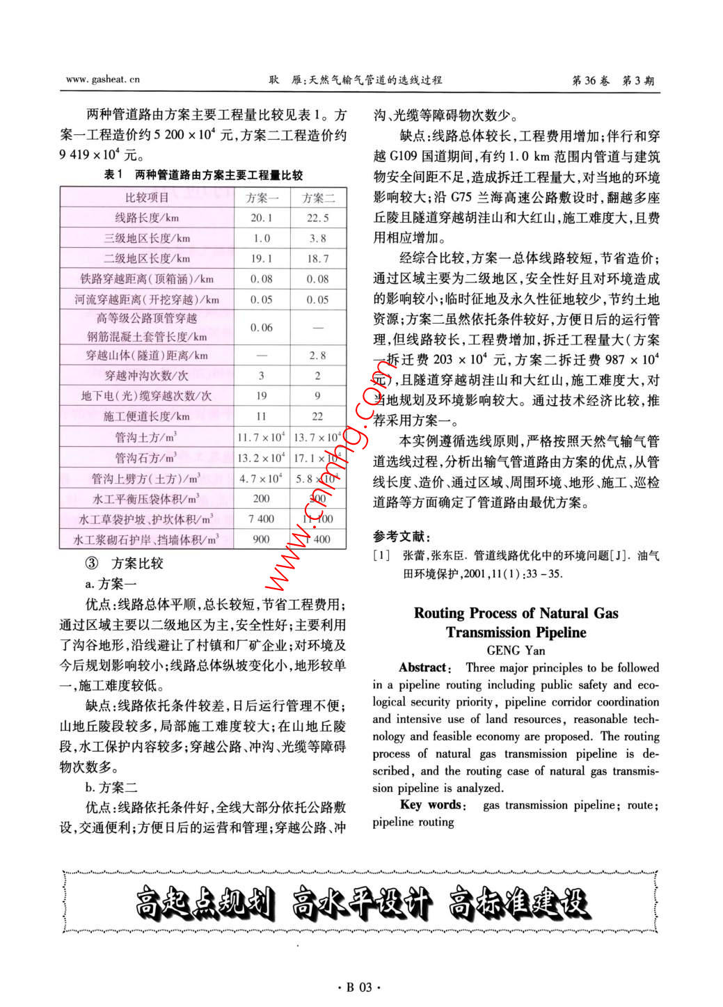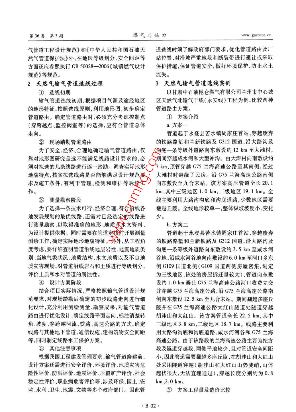 第36卷第3期煤氣與熱力Vol 36 No. 32016年3月gas heatMar.2016燃?xì)廨斉渑c儲(chǔ)運(yùn)·天然氣輸氣管道的選線過(guò)程耿雁(甘肅中石油昆侖燃?xì)庥邢薰?甘肅蘭州730030)摘要:提出公共安全、生態(tài)安全優(yōu)先,管道廊道統(tǒng)籌和節(jié)約利用土地資源,技術(shù)合理且經(jīng)濟(jì)可行是選線應(yīng)當(dāng)遵循的3個(gè)原則。闡述天然氣輸氣管道選線過(guò)程,分析夭然氣輸氣管道選線實(shí)例。關(guān)鍵詞:輸氣管道;線路;管道選線中圖分類號(hào):TE832文獻(xiàn)標(biāo)志碼:B文章編號(hào):1000-4416(2016)03-0B01-03境保護(hù)技術(shù)措施。②管道廊道統(tǒng)籌和節(jié)約利用土地資源管道自身的專業(yè)防護(hù)要求規(guī)定,沿線一定距離內(nèi)禁止進(jìn)行大規(guī)模的建設(shè)活動(dòng)。隨著我國(guó)國(guó)民經(jīng)濟(jì)的逐步發(fā)展,基礎(chǔ)設(shè)施的逐漸完備,很多城市內(nèi)部及周邊都有較多道路、市政及專業(yè)管線廊道。在保證安全防護(hù)距離的前提下,規(guī)劃新建天然氣管道應(yīng)盡可能與其他工程管線或道路共享廊道與防護(hù)綠化帶選線時(shí)還應(yīng)了解管道途經(jīng)區(qū)域內(nèi)土地使用權(quán)和征遷土地的程序,了解土地的價(jià)值和土地管理部門作者簡(jiǎn)介:耿雁,女,工程師,本科,主要從事城鎮(zhèn)燃?xì)鈱?duì)建設(shè)單位的支持程度,調(diào)查土地使用申報(bào)程序以規(guī)劃和天然氣工程技術(shù)研究工作。及對(duì)土地所有人的補(bǔ)償細(xì)節(jié)。節(jié)約土地資源,避免1天然氣輸氣管道選線原則對(duì)土地的無(wú)序分割,實(shí)現(xiàn)土地價(jià)值的最大化①公共安全、生態(tài)安全優(yōu)先③技術(shù)合理且經(jīng)濟(jì)可行選線規(guī)劃時(shí),應(yīng)充分調(diào)研氣源位置及氣源可靠設(shè)計(jì)階段是控制工程項(xiàng)目造價(jià)的關(guān)鍵,管道選性、市場(chǎng)用氣需求、管道通過(guò)地區(qū)的地形地貌、土壤、線更是直接關(guān)系到管道長(zhǎng)度、沿線高程等主要參數(shù),當(dāng)?shù)氐臍夂驙顩r、水文、地質(zhì)等特征。天然氣輸氣管對(duì)管道總造價(jià)影響極大。從工程角度來(lái)看管道線道屬于高危燃?xì)庠O(shè)施,存在泄漏污染、燃燒爆炸的可路的選擇的目的是在現(xiàn)實(shí)可行的前提下,應(yīng)盡可能能,如果發(fā)生事故,不但危及社會(huì)公共安全,而且會(huì)選擇較短的路由連接分輸閥室、首站、監(jiān)控閥室和末破壞生態(tài)環(huán)境。公共安全及生態(tài)安全是管道選站盡量避免經(jīng)過(guò)丘陵、多巖石地區(qū)、地震斷裂帶,盡線規(guī)劃時(shí)應(yīng)首先考慮的因素。因此,輸氣管道應(yīng)盡量減少鐵路、公路、河流等處管道穿跨越。保證采取量避開村鎮(zhèn)人口密集區(qū)、生態(tài)敏感區(qū)、水源保護(hù)地、的工程技術(shù)方案可以實(shí)施,有利于建設(shè)以及進(jìn)行管城鎮(zhèn)建設(shè)規(guī)劃區(qū)域等。同時(shí)選線規(guī)劃中可明確提出理、檢測(cè)和維護(hù)等后續(xù)工作。管道建設(shè)施工及運(yùn)行管理時(shí)應(yīng)采取的安全生產(chǎn)及環(huán)輸氣管道線路設(shè)計(jì)除執(zhí)行GB50251-2015《輸收稿日期:2015-12-24;修回日期:2016-01-07B01·第36卷第3期煤氣與熱力www.gasheat.ct氣管道工程設(shè)計(jì)規(guī)范》和《中華人民共和國(guó)石油天道選線時(shí)須了解政府部門要求,優(yōu)化管道路由及廠然氣管道保護(hù)法》外,在地區(qū)等級(jí)劃分、安全間距等站位置,對(duì)滑坡嚴(yán)重地段和斷裂帶進(jìn)行避讓或采取方面還應(yīng)參照?qǐng)?zhí)行GB50028-2006《城鎮(zhèn)燃?xì)庠O(shè)計(jì)保護(hù)措施,保證管道安全,做好環(huán)境保護(hù),防止水土規(guī)范》等規(guī)范。流失。2天然氣輸氣管道選線過(guò)程3天然氣輸氣管道選線實(shí)例①選線初期以甘肅中石油昆侖燃?xì)庥邢薰咎m州市中心城輸氣管道選線初期,根據(jù)項(xiàng)目氣源及途經(jīng)地區(qū)區(qū)天然氣北輸氣干線(永安線)工程為例,比較兩種的地形特征,按照選線原則,利用地形圖,初步確定管道路由方案管道路由。確定管道路由時(shí),必須充分考慮控制點(diǎn)①方案介紹(穿跨越點(diǎn)、監(jiān)控閥室等)的選擇,應(yīng)符合管道總體a.方案走向。管道起于永登縣苦水鎮(zhèn)周家莊首站,穿越廢棄現(xiàn)場(chǎng)踏勘管道路由的鐵路路塹和蘭新鐵路及G312國(guó)道,沿大路溝及為了安全、經(jīng)濟(jì)、合理地確定輸氣管道路由,僅溝底一條等級(jí)外道路向東敷設(shè)約12km至大灘村,靠對(duì)地形圖研究是遠(yuǎn)不能滿足線路設(shè)計(jì)要求的,必期間穿越咸水河和大型沖溝。由大灘村向南敷設(shè)約須對(duì)擬選的幾條線路進(jìn)行逐一踏勘。調(diào)查實(shí)際地形7km,頂管穿越G75蘭海高速公路至其南側(cè),經(jīng)過(guò)地貌特點(diǎn),核實(shí)擬選線路是否能夠滿足設(shè)計(jì)規(guī)范要大灘村時(shí)避繞了民房。沿G75蘭海高速公路南側(cè)求及施工條件,有利于管理、檢測(cè)和維護(hù)等后續(xù)工向東敷設(shè)至九合末站。該方案高壓管道全長(zhǎng)20.1作。km,其中三級(jí)地區(qū)1.0km,二級(jí)地區(qū)19.1km。全③測(cè)量勘察階段線主要利用大路溝溝底和溝底道路,少數(shù)地