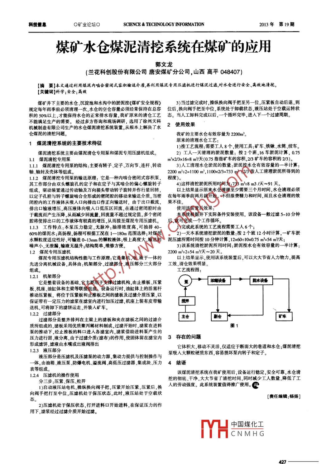 科技信息O礦業(yè)論壇0SCIENCE & TECHNOLOGY INFORMATION2013年第 19期煤礦水倉(cāng)煤泥清挖系統(tǒng)在煤礦的應(yīng)用郭文龍(蘭花科創(chuàng)股份有限公司唐安煤礦分公司,山西高平048407)[摘要]本文通過利用煤泥 內(nèi)嚙合密閉式容積輸送介質(zhì),再利用諜泥專用壓濾機(jī)進(jìn)行煤泥過濾,對(duì)水倉(cāng)進(jìn)行安全、高效地清挖。(關(guān)鍵詞]科學(xué);安全;高效煤礦井下主要的水倉(cāng)沉淀池和水溝中的淤泥按(煤礦安全規(guī)程》3)當(dāng)過濾完成時(shí),操縱換向閥手把至另一位,壓緊板自動(dòng)后退,到規(guī)定每年雨季前必須清理一次,水倉(cāng)的空倉(cāng)容量必須經(jīng)常保持在總?cè)菸缓?換向閥手把至中位,系統(tǒng)處于卸載狀態(tài),液壓站處于空載運(yùn)轉(zhuǎn)狀積的50%以上,才能保持水倉(cāng)的正常排水容量,我礦原來的清倉(cāng)工藝態(tài)。 當(dāng)人工卸料完成以后,一-個(gè)循環(huán)完畢進(jìn)入下一一個(gè)過濾周期。不能滿足生產(chǎn)的需要。經(jīng)過多方咨詢和現(xiàn)場(chǎng)調(diào)研,選用了徐州天科2使用效果機(jī)械制造有限公司生產(chǎn)的水倉(cāng)煤泥清挖系統(tǒng)裝置,從根本上解決了水倉(cāng)煤泥的清挖問題。我礦的主要水倉(cāng)有效容量為200m2。原來的清理水倉(cāng)工藝:1煤泥清挖系統(tǒng)的主要技術(shù)待征1)按工藝流程:需要工人8個(gè),使用工具:礦車鐵鍬水筒、絞車。煤泥清挖系統(tǒng)主要由煤泥清倉(cāng)專用泵和煤泥專用壓濾機(jī)組成。2)工人一天清理的淤泥數(shù)量:按2個(gè)班, 16車淤泥計(jì)算, 0.751.1煤泥清挖專用泵m>x2/3x16=8 m/天(0.75指指礦車的容積,2/3礦車的容積的213)。.1.1 煤泥清挖專用泵的結(jié)構(gòu):主要有轉(zhuǎn)子定子、萬向節(jié)、連桿、轉(zhuǎn)動(dòng)3)人工清理水倉(cāng)淤泥的數(shù)量:淤泥按水倉(cāng)有效容量的一半計(jì)算:軸、軸封及殼體等組成。2200 m'+2=1100 m',1100x2/3=733 m' (2/3 指人工清理淤泥所得到的.2煤泥清挖專用泵的輸送原理:它是一種內(nèi)嚙合密閉式容積泵, 程度)其工作部分由雙頭螺旋孔的定子和在定子與其嚙合的偏心螺旋轉(zhuǎn)子4)這樣清挖淤泥所用時(shí)間為:733 m'+8 m3 1天=91天。組成,驅(qū)動(dòng)裝置通過傳動(dòng)軸及萬向接頭帶動(dòng)轉(zhuǎn)子旋轉(zhuǎn)并作行星回轉(zhuǎn),以上結(jié)果顯示原來水倉(cāng)清理至少需要三個(gè)月時(shí)間,水倉(cāng)清理必須以定子孔腔與轉(zhuǎn)子螺旋嚙合全形成的密閉腔的移動(dòng)來輸送介質(zhì)。當(dāng)密在每年雨季前兩月 就開始。不但浪費(fèi)精力和時(shí)間,而且水倉(cāng)清理的效閉腔內(nèi)的工作液體從吸入口向排出口作正向輸送時(shí),由于出口截流,使用該裝置后效果:排出口輸液增壓,高壓液體向吸人口低壓區(qū)回流,在通過密閉腔時(shí)由于截流而產(chǎn)生壓降從而減少回流量,回流量不超過規(guī)定值。多個(gè)密閉本系統(tǒng)根據(jù)井下實(shí)際條件安裝使用,該設(shè)備一般過濾5- 10分鐘腔將使排出口的工作液體有較高的增壓,從而接至煤泥專用壓濾機(jī)。后 ,就可完成一個(gè)工作循環(huán)。1.1.3 工作特點(diǎn):本泵壓力穩(wěn)定,無脈沖;抽排濃度高,可抽排40~1)完成此系統(tǒng)的工藝流程需要工人6個(gè);60%的煤泥水;高揚(yáng)程,揚(yáng)程可根據(jù)工況在1- -180m范圍選擇;對(duì)煤泥2)一天本系統(tǒng)清挖淤泥的數(shù)量:按2個(gè)班12小時(shí)計(jì)算, -礦車淤水顆粒度適應(yīng)性好、可輸送0~13mm的顆粒液體;吸上高度大,輸送的泥壓濾所需時(shí)間按10分鐘計(jì)算, 12x60+ 10x0.75 m2=54 m/天;噪聲小,無泄漏,輸液無溫升;結(jié)構(gòu)簡(jiǎn)單,維修方便。3)該系統(tǒng)清挖淤泥所用時(shí)間:淤泥按水倉(cāng)有效容量的- - 半計(jì)算:1.2 煤泥專用壓濾機(jī)煤泥專用壓濾機(jī)結(jié)構(gòu)性能與工作原理:它是集機(jī)、電、液于-體的以 上結(jié)果顯示,使用該系統(tǒng)裝置后,可以大大節(jié)省人力物力,提高先進(jìn)分離機(jī)械設(shè)備,具體由:機(jī)架部分過濾部分液壓部分三大部分工效, 清倉(cāng)效果明顯。組成。工藝流程圖:1.2.1 機(jī)架部分它是整套設(shè)備的基礎(chǔ),它主要用于支撐過濾機(jī)構(gòu),由止推板、壓緊(綦)濃耀設(shè)備-?殿水設(shè)備板、機(jī)座、油缸體和主梁等聯(lián)接組成。設(shè)備運(yùn)行時(shí),油缸體上的活塞桿推動(dòng)壓緊板,將位于壓緊板和止推板之間的濾板及過濾介質(zhì)壓緊,以保證帶有- -定壓力的濾漿在濾室內(nèi)進(jìn)行加壓過濾,機(jī)座上裝有皮帶輸攪拌送機(jī),可將卸下的濾餅運(yùn)走,并裝入礦車。1.2.2過濾部分主倉(cāng).副倉(cāng)過濾部分是整齊排列在主梁上的濾板和夾在濾板之間的過濾介質(zhì)所組成的,濾板采用優(yōu)質(zhì)聚丙稀材料制成過濾開始時(shí),濾漿在進(jìn)料泵的推動(dòng)下,經(jīng)止推板的料口進(jìn)入各濾室內(nèi),濾漿借助進(jìn)料泵產(chǎn)生的壓力進(jìn)行固、液分離,由于過濾介質(zhì)(濾布)的作用,使固體留在濾室內(nèi)3存在的問題形成濾餅,濾液由水嘴或出液閥排出它體積大,移動(dòng)不靈活,僅適應(yīng)于斷面大的巷道和水倉(cāng);煤泥清挖1.2.3液壓部分液壓部分是壓濾機(jī)及壓濾泵的動(dòng)力源,集動(dòng)力提供與控制操作與泵吸