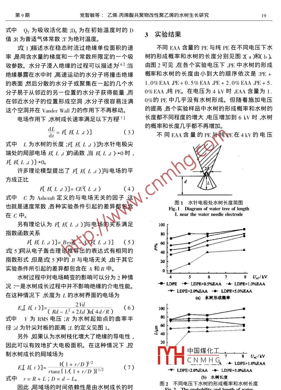 第21卷第9期中國(guó)電機(jī)工程學(xué)報(bào)Vol.21 No.9 Sep. 20012001年9月Proceedings of the CSEE回2001 Chin. Soc. for Elec . Eng.文章編號(hào)0258-8013( 2001 )09-0018-04 .乙烯_丙烯酸共聚物改性聚乙烯的水樹(shù)生長(zhǎng)研究黨智敏1 ,亢婕2,屠德民2 ,陳剛2, 阮建國(guó)2( 1.清華大學(xué)材料系北京100084 ; 2.西安交通大學(xué)電氣絕緣研究中心陜西西安710049 )STUDY ON WATER TREEING IN POLYETHYLENE MODIFIED BYETHYLENE-ACRYLIC ACID COPOL YMERDANG Zhi-min' , KANG Jie2 , TU De-min2 , CHEN Gang- , RUAN Jian-guo2( 1. Department of Materials ,Tshighua University ,Beijing 100084 ,China ;2. Electrical Insulation Research Center , Xi an Jiaotong University ,Xi' an 710049 , China )ABSTRACT :Polyethylene( PE) has been modified by a small細(xì)微的通道相連[2]。水樹(shù)枝的起始點(diǎn)是聚乙烯中amount of mixing ethylene- acrylic acid( EAA ) copolymer. The wa-的雜質(zhì)、微孔和微裂紋等缺陷。由于缺陷處的電場(chǎng)ter treeing in PE modified was also studied. The paper analyses the畸變將導(dǎo)致在較低的電場(chǎng)下引發(fā)水樹(shù)枝3]開(kāi)始時(shí)reason forming water treeing in PE and mechanism suppressing water水樹(shù)的生長(zhǎng)速度很慢,但隨著水樹(shù)的生長(zhǎng)水樹(shù)枝尖treeing. The conditin forming water teeing is water drop existing in端的電場(chǎng)愈加集中局部的高電場(chǎng)最終會(huì)導(dǎo)致水樹(shù)the structure defect in PE. And the method suppessing the water枝尖端引發(fā)電樹(shù)枝4]。電樹(shù)枝-旦形成即可能造成treeing is just reducing water drop. We found an optimum EAA con-電纜絕緣在短期內(nèi)被擊穿。tent suppressing water teeing. PE sample with 1.0% wt EAA can因此,研究抑制聚乙烯中水樹(shù)的產(chǎn)生和成長(zhǎng)對(duì)be studied further in cable insulation.提高我國(guó)電纜絕緣的壽命具有重要的現(xiàn)實(shí)意義。由KEY WORDS :ethylene-acrylic acid ; polyethylene ; moifcation ;于聚乙烯是憎水性的非極性聚合物,水的影響可以water treeing ; defect在聚乙烯電氣性能的不規(guī)則處(例如污染物、微孔摘要:以不同含量的乙烯~丙烯酸共聚物(EAA)對(duì)聚乙烯等)產(chǎn)生。基于這個(gè)原因,實(shí)驗(yàn)用極性共聚物乙烯~( PE )進(jìn)行了共混改性研究了改性后實(shí)驗(yàn)樣品中水樹(shù)的生長(zhǎng)丙烯酸( EAA )作為添加劑對(duì)聚乙烯( PE )進(jìn)行改性,情況。分析了PE樣品中形成水樹(shù)的原因及抑制水樹(shù)的機(jī)使PE有-定程度的親水性,從而使PE具有抑制水理,認(rèn)為水樹(shù)形成的條件是在結(jié)構(gòu)缺陷處有水滴形成,而抑樹(shù)形成的特性。制的方法就是設(shè)法消除水滴的形成。實(shí)驗(yàn)中找到了抑制PE中水樹(shù)形成的最佳EAA含量。PE+ 1 0% EAA的樣品可用2水的擴(kuò)散和水樹(shù)的成長(zhǎng)機(jī)理作電纜絕緣實(shí)用性的進(jìn)一步 研究。水樹(shù)的產(chǎn)生和成長(zhǎng)是在水和電場(chǎng)的共同作用下關(guān)鍵詞:乙烯丙烯酸共聚物;聚乙烯;改性;水樹(shù);缺陷形成的。從分子理論的觀點(diǎn)來(lái)看水的擴(kuò)散是在水分中圖分類號(hào)0631.3文獻(xiàn)標(biāo)識(shí)碼:A濃度影響下分子的無(wú)序運(yùn)動(dòng)。實(shí)驗(yàn)時(shí)聚乙烯材料的水分聚集梯度是沿著厚度方向因此濕度p透過(guò)材料1前言厚度薄層dl沿厚度方向流動(dòng)服從Fick定律5]電纜絕緣中大量使用交聯(lián)聚乙烯,但是由于水樹(shù)的生長(zhǎng)使絕緣遭受破壞。許多研究表明聚乙烯中國(guó)煤化工)(1)中的水樹(shù)是由微小的充水空洞組成1]這些充水空式中.MYHCNMHC材料的厚度20為沿洞基本上是沿電場(chǎng)方向排列的,且微孔之間可能有厚度方向的含水量的濃度梯度;D為擴(kuò)散系數(shù)它與基金項(xiàng)目國(guó)家自然科學(xué)基金資助項(xiàng)目( 5777001 )溫度的關(guān)系服從指數(shù)規(guī)律并可用公式描述如下Project Supported by National Natural Science Foundation of China(59777001 ).D=Dven(2)RT第9期黨智敏等:乙烯~丙烯 酸共聚物改性聚乙烯的水樹(shù)生長(zhǎng)研究19式中Qr為吸收活化能;Do為在初始溫度時(shí)的D3實(shí)驗(yàn)結(jié)果值;R為普適氣體常數(shù)T為絕對(duì)溫度。式1描述水在穩(wěn)態(tài)時(shí)流過(guò)絕緣單位面積的速不同EAA含量的PE與純PE在不同電壓下水率是用含水量的梯度和一個(gè)常數(shù)所限定的一個(gè)吸樹(shù)的形成概率和水樹(shù)的長(zhǎng)度分別見(jiàn)圖2( a)和( b )收參數(shù)。水分子浸入絕緣的過(guò)程可以描述為61:當(dāng)由圖2可見(jiàn),在各個(gè)實(shí)驗(yàn)電壓下,PE 中水樹(shù)的形成絕緣暴露在水中時(shí)高速運(yùn)動(dòng)的水分子將撞擊絕緣概率和水樹(shù)的長(zhǎng)度由小到大的順序依次是:PE +的表面然后分散的水分子或聚集在--起的幾個(gè)水1.0%EAA ,PE+ 0.5%EAA ,PE+ 2.0%EAA ,PE+ 5.分子易于從鄰近的另-位置的水分子獲得能量而0%EAA ,純PE。在電壓為4 kV時(shí)EAA含量為1.在鄰近水分子的位置形成空洞,水分子很容易注滿0%的PE中幾乎沒(méi)有水樹(shù)形成。但隨著施加電壓這個(gè)空洞并在Vander Wall力的作用下不再移動(dòng)。的提高各個(gè)實(shí)驗(yàn)樣品中水樹(shù)的形成概率和水樹(shù)的電場(chǎng)作用下水樹(shù)成長(zhǎng)速率滿足以下方程7] .長(zhǎng)度都不同程度的增大,電壓增加到6 kV時(shí),水樹(shù)出=H[K(L;)] .(3)的概率和長(zhǎng)度幾乎都不
