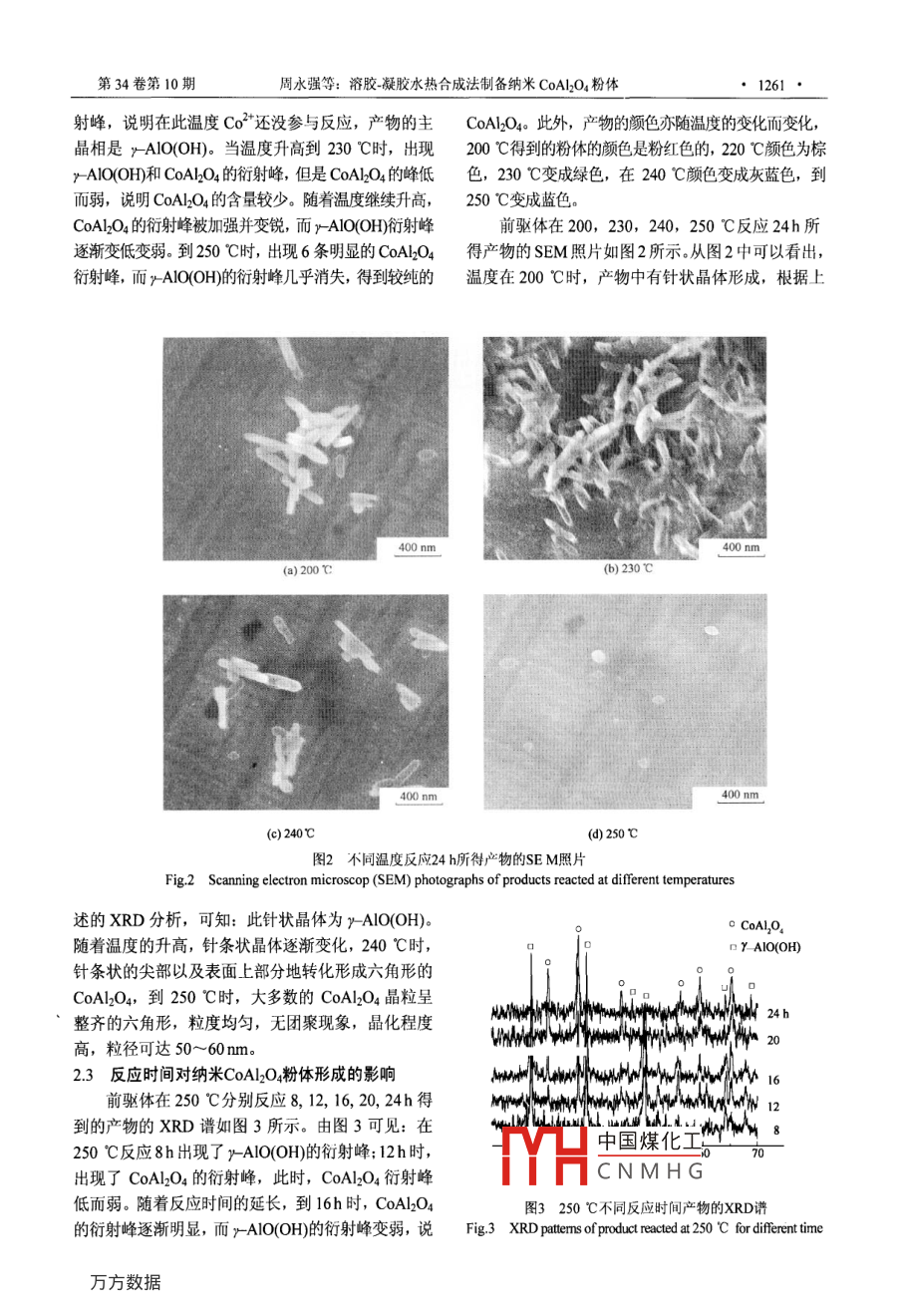第34卷第10期硅酸鹽學(xué)報(bào)Vol 34, No 102006年10月OURNAL OF THE CHINESE CERAMIC SOCIETY溶膠-凝膠水熱合成法制備納米CoAl2O4粉體周永強(qiáng)',梁曉娟',于方麗,王芬’,羅宏杰’,潘明初(1.溫州大學(xué)制筆行業(yè)重點(diǎn)實(shí)驗(yàn)室,浙江溫州325035;2.陜西科技大學(xué),陜西咸陽(yáng)712081;3.中國(guó)科學(xué)院上海硅酸鹽研究所,上海20050摘要:以仲丁醇鋁和硝酸鉆為原料,用溶膠凝膠水熱合成法制備了納米CoA2O4粉體,探討了水熱合成中前哪體的制備工藝條件,并用X射線衍射和掃描電鏡等手段分析了水熱系統(tǒng)中反應(yīng)溫度、反應(yīng)時(shí)間對(duì)納米 CoAlO4粉體的形成以及形貌的影響。結(jié)果表明:前驅(qū)體在250℃的水熱系統(tǒng)中反應(yīng)24h,能制備出較純凈、結(jié)晶完整、粒度均勻、粒徑小、尖晶石結(jié)構(gòu)的納米CoAl2O4粉體,其平均粒度約為50~60mm。關(guān)鍵詞:溶膠凝膠水熱合成法;納米CoAl2O4;粉體中圖分類號(hào):TQ174文章標(biāo)識(shí)碼:A文章編號(hào):04545648(200610-125904PREPARATION OF NANOMETER CoAlO4 POWDERS BY SOL-GEL HYDROTHERMAL METHODZHOU Yongqiang, LIANG Xiaojuan, YU Fangli, WANG Fen,, LUO Hongjie, PAN Mingchu'(1. Key Laboratory of Pen-mading Industry, Wenzhou University, Wenzhou 325035, Zhejiang; 2. Shaanxi University of Science andTechnology, Xianyang 712081, Shaanxi; 3. Shanghai Institute of Ceramics, Chinese Academy of Sciences, Shanghai 200050, China)Abstract: Nanometer CoAl2O4 powders were prepared by sol-gel-hydrothermal method using aluminum sec-butoxide and cobaltnitrate as the raw materials. the preparing conditions for the precursor were determined. The influence of the reacting temperaturesand time on the forming and morphology of products was investigated by X-ray diffraction and scanning electron microscopy. Thespinel structured CoAl O4 nano-powder with high purity, crystallization integrity, fine grain size (50-60 nm)were obtained throughydrothermal reaction at 250 C for 24hKey words: sol-gel-hydrothermal method; nanometer cobalt aluminate; powderCoAl2O4顏料是一種性能優(yōu)異、應(yīng)用前景廣闊但是這些制備方法大都需要后期的高溫?zé)崽幚?從的藍(lán)色顏料。它有鮮明的色澤,極優(yōu)良的耐候性和而導(dǎo)致粉體微粒間的團(tuán)聚和晶粒長(zhǎng)大。跟其它方法耐酸堿性,能耐受各種溶劑,耐熱可達(dá)1200℃,比,水熱合成法制備納米粉體具有高純、超細(xì)、粒是一般顏料所不能及的CoAl2O4顏料廣泛應(yīng)用于徑分布窄、顆粒團(tuán)聚程度輕、晶體發(fā)育完整、工藝超耐久性特別是超保色性、保光性和抗粉化性的外相對(duì)簡(jiǎn)單等優(yōu)點(diǎn)。同時(shí),水熱法制備粉體是在液相系統(tǒng)以及陶瓷、高溫涂料、搪瓷、玻璃、塑料、中一次完成,不需要后期的晶化熱處理,從而避免耐髙溫的工程塑料等的著色。近年來(lái),隨著中性墨了由于熱處理而產(chǎn)生粉體的硬團(tuán)聚、晶粒自行長(zhǎng)大水,高檔油漆、涂料等對(duì)納米級(jí)鈷藍(lán)顏料需求的不和容易混入雜質(zhì)等缺點(diǎn)。目前采用水熱合成法制備斷增加,納米鉆藍(lán)顏料的研究和應(yīng)用愈來(lái)愈受到重納米CoAl2O4粉體的研究較少,Chen等以AlCl視。 Zayat等用溶膠凝膠法和有機(jī)配合物前驅(qū)體6H2O和Co2HO為原料,水熱合成了平均粒徑法制備了納米級(jí)的鈷藍(lán)顏料。楊桂琴等用微乳液為65~75mm的鈷藍(lán)粉體。以仲丁醇鋁和硝酸鈷為法制得平均粒徑為169mm的鈷藍(lán)顏料。譚俊茹等原料,用溶膠凝膠水熱合成法制備了納米CoAl2O4用均勻沉淀法制備出80nm左右的CoAl2O4粉體。粉體,探討了采用溶膠凝凝膠法制備前驅(qū)體的工藝中國(guó)煤化工收稿日期:200602-08,修改稿收到日期:200607-01第一作者:周永強(qiáng)(1963~),男,碩士,教授CNMHE-mail:zhouyongqiang66@163.com1260硅酸鹽學(xué)報(bào)2006年條件和水熱系統(tǒng)中反應(yīng)溫度、反應(yīng)時(shí)間對(duì)納米Al(OCH(CH3 ) CH2CH3JOH+CH3 CH2(CH3)CHOHCoAl2O4粉體的形成以及形貌的影響。(1)1實(shí)驗(yàn)Al[OCH( CH3)CH2CH3 IOH+H2OAlOCH( CH3)CH2CH3 (OH)2OH11前驅(qū)體的制備和納米CoA12O粉體的水熱合成+CH3 CH2(CH3) CHOH實(shí)驗(yàn)用原料:仲丁醇鋁(12H2OAl,質(zhì)量分?jǐn)?shù)A[C4HO]2OH+A[C4HO2O為99.9%,下同);硝酸鈷(CoNO3)26H2O,9.5%];IC4H9OJz-Al-O-AICAH9OJ2+H2O(3)正丁醇(C4HOH,99.5%Al[C4H9OJ+ Al[C4H9OJOH在實(shí)驗(yàn)中,控制不同的水與仲丁醇鋁的摩爾比[C4H9OJ2-Al-O-Al[CAH9OJ2+ C4H9OH(4)R值、pH值以及水解溫度進(jìn)行多次實(shí)驗(yàn),確定前驅(qū)(OH)3→y- AlO(OH)+H2O體的最佳制備條件,制備出凝膠前驅(qū)體。然后,控xAOH)3+(1-x)Co2+(2-3x)OH+xNO3+制不同的反應(yīng)溫度和時(shí)間,水熱合成出CoA1O4粉nH2O=[Cor-(OH)2I(NO3 )xnH20(6)體。具體制備過(guò)程為:量取10ml仲丁醇鋁溶液加從溶膠凝膠制備實(shí)驗(yàn)得出:當(dāng)R<16時(shí),得不入到盛有20m正丁醇中溶液的反應(yīng)器中,在85℃到均一的溶膠;當(dāng)R≥16時(shí),可以得到均勻透明的恒溫水浴中攪拌下進(jìn)行反應(yīng),直至混合液變成透明,溶膠。當(dāng)加水量很小時(shí),雖然膠凝時(shí)間較短,但凝在透明溶液里加入一定比例的硝酸鈷溶液,(Co“與膠質(zhì)量差,隨著加水量的增加,膠凝時(shí)間呈上升趨A的摩爾比為1:,R=16~20,水解反應(yīng)2h之勢(shì),當(dāng)加水量R>24時(shí),不僅膠凝時(shí)間較長(zhǎng),而且后,敞開(kāi)容器口05h,蒸發(fā)掉多余的醇,然后再用凝膠質(zhì)量變差。當(dāng)R=16~24時(sh