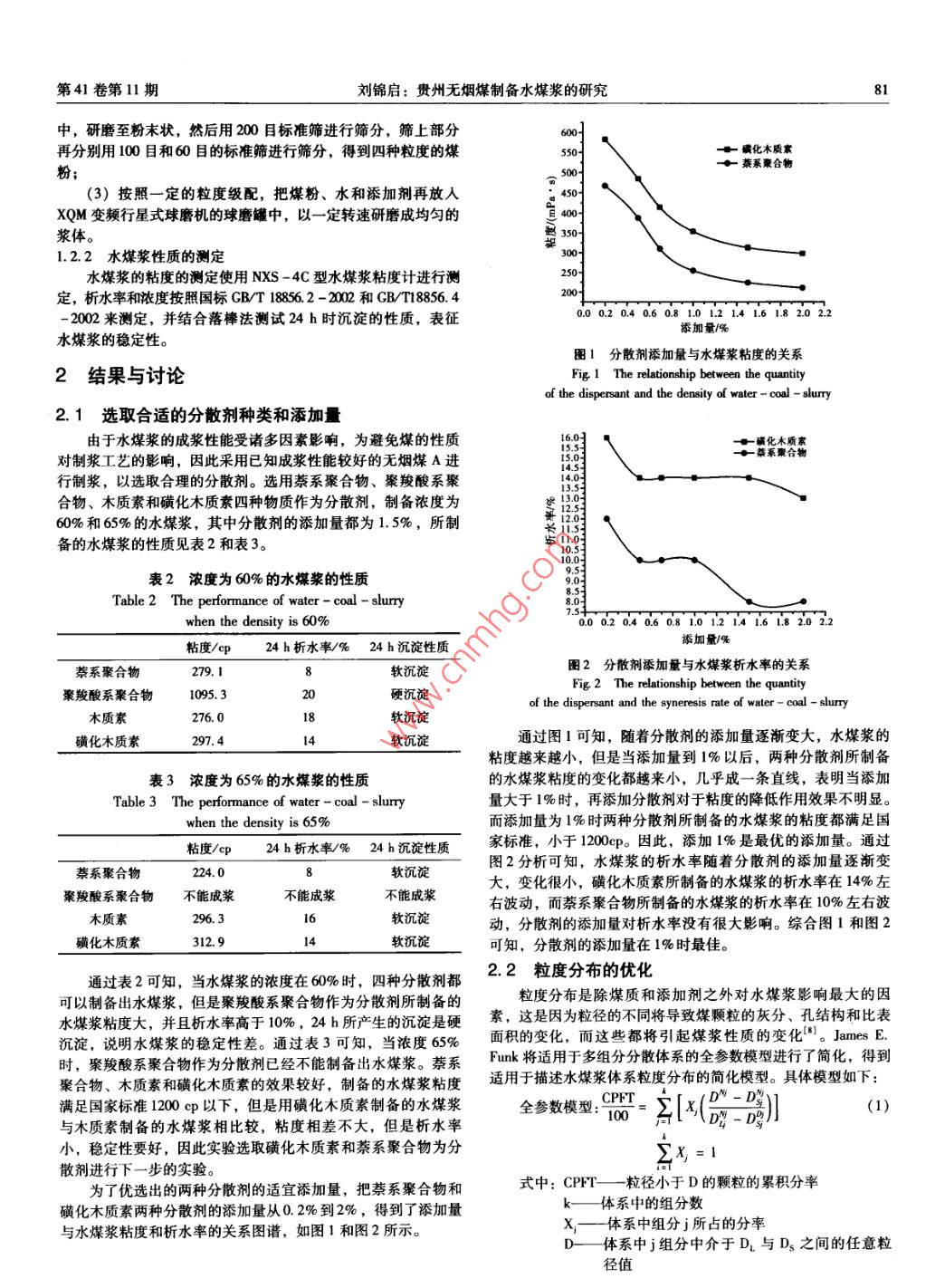 第41卷第11期廣州化工Vol 41 No 112013年6月Guangzhou Chemical IndustryJune 2013貴州無(wú)煙煤制備水煤漿的研究劉錦啟(貴州大學(xué)化學(xué)與化工學(xué)院,貴州貴陽(yáng)550025)摘要:通過(guò)向無(wú)煙煤中加入4種不同分散劑制備水煤漿,優(yōu)選出最佳的分散劑和添加量,然后通過(guò) Alfred模型研究了不同粒度分布對(duì)水煤漿性能的影響,并且與相同條件下煙煤制備的水煤漿性能進(jìn)行對(duì)比。結(jié)果表明:萘系聚合物和磺化木質(zhì)素是較好的分散劑,最優(yōu)的添加量為1%,當(dāng) Alfred模型參數(shù)N等于0.2時(shí)的粒度級(jí)配最佳,并且無(wú)煙煤的成漿性能明顯優(yōu)于煙煤。關(guān)鍵詞:無(wú)煙煤;分散劑;水煤漿;粒度級(jí)配中圖分類號(hào):TQ536.1文獻(xiàn)標(biāo)識(shí)碼:A文章編號(hào):1001-9677(2013)1-0080-04Study on the Preparation of water-coal-slurry by Guizhou AnthraciteLIU JinCollege of Chemical and Chemical Engineering, Guizhou University, Guiyang Guizhou 550025, China)Abstract: The best dispersant and adding quantity was selected by making water-coal-slurry made use of four dif-ferent dispersants. The effect of particle size distribution on the performance of water-coal-slurry was studied. The per-formance of water-coal-slurry that made by bituminous coal and anthracite at the same condition were contrasted.Theresults showed that naphthalene polymer and sulfonated lignin were good dispersant, and the best adding quantity was 1%the particle size distribution was the best when the model of Alfred parameter n was 0. 2. The performance of water-coalslurry made by anthracite was better than that made by bituminous coal.Key words: anthracite; dispersant; water-coal-slurry; particle size distribution水煤漿是由大約60%~η0%的煤粉、2ω0%~30%的水和煤,固定碳含量高于煙煤,屬于高階煤,適合制備水煤漿。1%的化學(xué)添加劑混合而成的,具有流動(dòng)性的煤基燃料。對(duì)比傳統(tǒng)煤炭的利用方式,水煤漿具有燃燒效率高,便于管道運(yùn)表1煤的工業(yè)分析輸,無(wú)粉塵污染,豐富煤炭利用方式等優(yōu)勢(shì),目前在我國(guó)已進(jìn)Table 1 The industrial analysis of coal入全面推廣應(yīng)用階段12。由于水煤漿的制備受到諸多因素的樣品灰分(Aad)水分(Mnd)揮發(fā)分(vad)固定碳(Fad)影響,如煤的性質(zhì)、添加劑的種類、粒度級(jí)配和制漿工藝等8.333.256.0482.38因此對(duì)于不同種類的煤炭,不同產(chǎn)地的煤炭要探究最佳的制漿工藝流程和適合的添加劑34。我國(guó)無(wú)煙煤的儲(chǔ)量居世界首位,而貴州省的無(wú)煙煤儲(chǔ)量是.9全國(guó)第二,占全國(guó)無(wú)煙煤儲(chǔ)量的20%以上。無(wú)煙煤是高階煤,含碳量高,揮發(fā)分小,適合作為工業(yè)燃料,因此充分開(kāi)發(fā)利用11.267.32我省的無(wú)煙煤意義重大6。針對(duì)從貴州遵義選取的無(wú)煙煤F13.7460.75通過(guò)優(yōu)化組合粒度分布和選取相匹配的分散劑,制備出高濃度、低粘度和穩(wěn)定性良好的水煤漿。1.2實(shí)驗(yàn)方法1.2.1水煤漿的制備流程1實(shí)驗(yàn)部分目前水煤漿的制備工藝呈現(xiàn)多樣化,主要包括濕法制漿1.1實(shí)驗(yàn)原料干法制漿和間歇式制漿工藝,其中濕法制漿應(yīng)用最為普遍。本實(shí)驗(yàn)采用制漿工藝流程如下從遵義選取3種無(wú)煙煤,分別記為A、B、C,其中A和B是精洗煤,C是原煤。另外從紅旗煤礦、大丫口煤和小河橋煤下烘干;(1)將煤炭破碎至球磨機(jī)可以研磨的粒度范圍,在105℃礦礦選取三種煙煤,分別記為D、E、F。對(duì)6種煤進(jìn)行了工業(yè)分析,見(jiàn)表1。從表1中可知,無(wú)煙煤的水分和揮發(fā)分小于煙(2)把烘干的煤加人到XQM變頻行星式球磨機(jī)的球磨罐基金項(xiàng)目:貴州省工業(yè)攻關(guān)重點(diǎn)項(xiàng)目(編號(hào):CY字(2010)3046號(hào),CZ字(2011)3012號(hào))。作者簡(jiǎn)介:劉錦啟(1988-),男,碩士。第41卷第11期劉錦啟:貴州無(wú)煙煤制備水煤漿的研究中,研磨至粉末狀,然后用200目標(biāo)準(zhǔn)篩進(jìn)行篩分,篩上部分再分別用100目和60目的標(biāo)準(zhǔn)篩進(jìn)行篩分,得到四種粒度的煤碳化木質(zhì)素粉一系聚合物(3)按照一定的粒度級(jí)配,把煤粉、水和添加劑再放入XQM變頻行星式球磨機(jī)的球磨罐中,以一定轉(zhuǎn)速研磨成均勻的漿體水煤漿性質(zhì)的測(cè)定水煤漿的粘度的測(cè)定使用NXS-4C型水煤漿粘度計(jì)進(jìn)行測(cè)定,析水率和濃度按照國(guó)標(biāo)GBT1882-200和GBT8856.42002來(lái)測(cè)定,并結(jié)合落棒法測(cè)試24h時(shí)沉淀的性質(zhì),表征0.00.20.40.6081012141.6.82.02.2添加量{%水煤漿的穩(wěn)定性。圖1分散劑添加量與水煤漿粘度的關(guān)系2結(jié)果與討論Fig 1 The relationship between the quantityof the dispersant and the density of water- coal-slury2.1選取合適的分散劑種類和添加量由于水煤漿的成漿性能受諸多因素影響,為避免煤的性質(zhì)160碳化木質(zhì)素對(duì)制漿工藝的影響,因此采用已知成漿性能較好的無(wú)煙煤A進(jìn)13族系聚合物行制漿,以選取合理的分散劑。選用萘系聚合物、聚羧酸系聚合物、木質(zhì)素和磺化木質(zhì)素四種物質(zhì)作為分散劑,制備濃度為260%和65%的水煤漿,其中分散劑的添加量都為1.5%,所制備的水煤漿的性質(zhì)見(jiàn)表2和表3。表2濃度為60%的水煤漿的性質(zhì)Table 2 The performance of water-coal-slurrywhen the density is 60%08101.2141.6182.02.2粘度/cp24h析水率/%24h沉淀性質(zhì