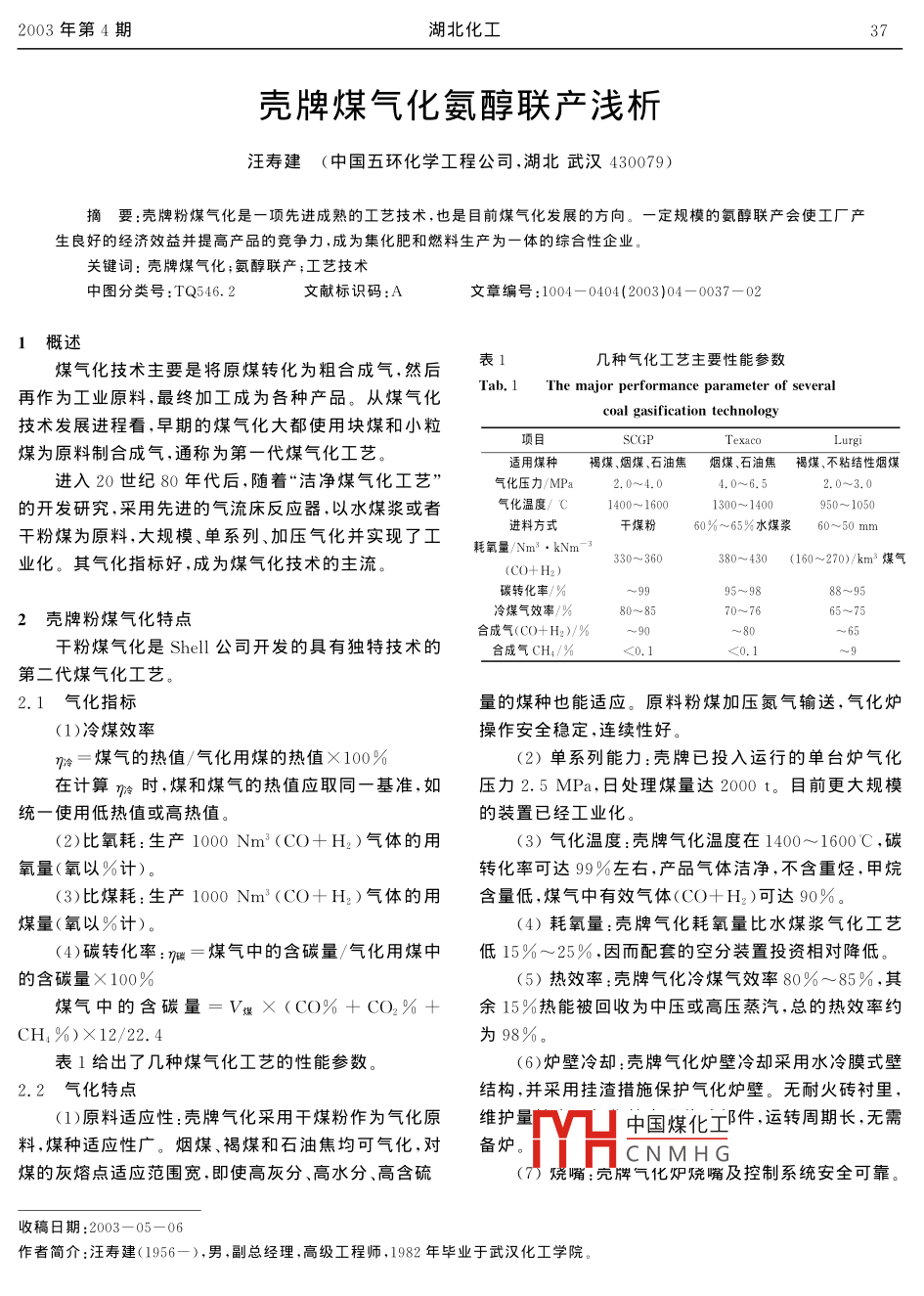 2003年第4期湖北化工37殼牌煤氣化氨醇聯(lián)產(chǎn)淺析汪壽建(中國(guó) 五環(huán)化學(xué)工程公司,湖北武漢430079)摘要:殼牌粉煤氣化是一項(xiàng)先進(jìn)成熟的工藝技術(shù), 也是目前煤氣化發(fā)展的方向。一定規(guī)模的氨醇聯(lián)產(chǎn)會(huì)使工廠產(chǎn)生良好的經(jīng)濟(jì)效益并提高產(chǎn)品的競(jìng)爭(zhēng)力,成為集化肥和燃料生產(chǎn)為-體的綜合性企業(yè)。關(guān)鍵詞:殼牌煤氣化;氨醇聯(lián)產(chǎn);工藝技術(shù)中圖分類號(hào):TQ546.2文獻(xiàn)標(biāo)識(shí)碼:A .文章編號(hào):1004 - 0404(2003)04- 0037-021概述表1幾種氣化工藝主要性能參數(shù)煤氣化技術(shù)主要是將原煤轉(zhuǎn)化為粗合成氣,然后'ab. 1The major performance parameter of several再作為工業(yè)原料,最終加工成為各種產(chǎn)品。從煤氣化coal gasification technology技術(shù)發(fā)展進(jìn)程看,早期的煤氣化大都使用塊煤和小粒項(xiàng)目SCGPTexacoLurgi煤為原料制合成氣,通稱為第一代煤氣化工藝。適用煤種褐煤、煙煤、石油焦煙煤 、石油焦褐煤 ,不粘結(jié)性煙煤進(jìn)入20世紀(jì)80年代后,隨著“潔凈煤氣化工藝”氣化壓力/MPa2.0~4.04.0~6.52.0~3.0的開發(fā)研究,采用先進(jìn)的氣流床反應(yīng)器,以水煤漿或者氣化溫度/ C1400~ 1600.1300~ 1400950~ 1050干粉煤為原料,大規(guī)模、單系列、加壓氣化并實(shí)現(xiàn)了工進(jìn)料方式干煤粉60%~65%水煤漿60~50 mm業(yè)化。其氣化指標(biāo)好,成為煤氣化技術(shù)的主流。耗氧量/Nm3. kNm~330~ 360380~430 (160~270)/km3 煤氣(C0+H2) .碳轉(zhuǎn)化率/%~9995~9888~95冷煤氣效率/%80~ 8570~76 .65~752殼牌粉煤氣化特點(diǎn)合成氣(CO+ H2)/%~90~ 80~65干粉煤氣化是Shell公司開發(fā)的具有獨(dú)特技術(shù)的合成氣CH4/%<0.1~g第二代煤氣化工藝。2.1氣化指標(biāo)量的煤種也能適應(yīng)。原料粉煤加壓氮?dú)廨斔?氣化爐(1)冷煤效率操作安全穩(wěn)定,連續(xù)性好。η冷=煤氣的熱值/氣化用煤的熱值X 100%(2)單系列能力:殼牌已投入運(yùn)行的單臺(tái)爐氣化在計(jì)算np冷 時(shí),煤和煤氣的熱值應(yīng)取同一基準(zhǔn),如壓力2.5 MPa,日處理煤量達(dá)2000 t。目前更大規(guī)模統(tǒng)--使用低熱值或高熱值。的裝置已經(jīng)工業(yè)化。(2)比氧耗:生產(chǎn)1000 Nm3 (CO+ H2)氣體的用(3)氣化溫度:殼牌氣化溫度在1400~1600C,碳氧量(氧以%計(jì))。轉(zhuǎn)化率可達(dá)99%左右,產(chǎn)品氣體潔凈,不含重?zé)N,甲烷(3)比煤耗:生產(chǎn)1000 Nm2(CO+ H2)氣體的用含量低,煤氣中有效氣體(CO+ H2)可達(dá)90%。煤量(氧以%計(jì))。(4)耗氧量:殼牌氣化耗氧量比水煤漿氣化工藝(4)碳轉(zhuǎn)化率:n碳=煤氣中的含碳量/氣化用煤中低15%~25%.因而配套的空分裝置投資相對(duì)降低。的含碳量X 100%(5)熱效率:殼牌氣化冷煤氣效率80%~85%,其煤氣中的含碳量=V煤X (CO% + CO2% +余15%熱能被回收為中壓或高壓蒸汽,總的熱效率約CH, %)X12/22.4為98%。表1給出了幾種煤氣化工藝的性能參數(shù)。(6)爐壁冷卻:殼牌氣化爐壁冷卻采用水冷膜式壁2.2 氣化特點(diǎn)結(jié)構(gòu),并采用掛渣措施保護(hù)氣化爐壁。無(wú)耐火磚襯里,(1)原料適應(yīng)性:殼牌氣化采用干煤粉作為氣化原維護(hù)星中國(guó)煤化工件,運(yùn)轉(zhuǎn)周期長(zhǎng),無(wú)需料,煤種適應(yīng)性廣。煙煤、褐煤和石油焦均可氣化,對(duì)備爐。煤的灰熔點(diǎn)適應(yīng)范圍寬,即使高灰分、高水分、高含硫*THCNMHG(7)燒嘴:殼牌氣化爐燒嘴及控制系統(tǒng)安全可靠。收稿日期:2003-05-06作者簡(jiǎn)介:汪壽建(1956-),男,副總經(jīng)理,高級(jí)工程師,1982年畢業(yè)于武漢化工學(xué)院。38汪壽建:殼牌煤氣化氨醇聯(lián)產(chǎn)淺析2003年第4期燒嘴設(shè)計(jì)壽命為8000 h,已有15 000 h運(yùn)行記錄。荷濾器)、濕法洗滌系統(tǒng)(文丘里和洗滌塔),洗滌后塵含蘭丹馬克電廠使用燒嘴已經(jīng)4年。氣化操作采用先進(jìn)量小于1 mg. Nm-'的合成氣進(jìn)一步經(jīng)空冷器及合成的控制系統(tǒng),設(shè)有必要的安全聯(lián)鎖.使氣化操作始終處氣水冷器冷卻至40C后送出。合成氣冷卻器產(chǎn)生的于最佳狀態(tài)運(yùn)行。高(中)壓蒸汽、氣化爐水冷壁副產(chǎn)的中壓蒸汽可供壓8)排渣:殼牌氣化爐高溫排出的熔渣經(jīng)激冷后成縮機(jī)透平使用。玻璃狀顆粒,性質(zhì)穩(wěn)定,對(duì)環(huán)境幾乎沒有影響。氣化污3.2合成氣制合成氨、尿素水中含氰化物少,易處理。Shell煤氣化得到90%以上的(CO+ H2)粗煤氣,這種粗煤氣中的(CO+ H2)氣是制合成氨的原料氣。3殼牌煤氣化氨醇聯(lián)產(chǎn)經(jīng)預(yù)變換后的一股粗煤氣進(jìn)一步通過蒸氣變換,在催殼牌煤氣化這種以煤為原料開發(fā)的潔凈煤技術(shù)是化劑作用下反應(yīng)得到(H2 +CO2),其中的CO2氣又是當(dāng)前煤氣化發(fā)展的方向。用合成氣加工可得到醇類,生產(chǎn)尿素的原料。變換氣再經(jīng)過氣體凈化,如低溫甲如甲醇;羰基合成得到醋酸,以及許多含氧化合物,如醇洗、甲烷化(或液氮洗)、配氮、壓縮后進(jìn)行氨合成,最醋酐、醋酸纖維、二甲醚、甲酸、甲酸甲酯和碳酸二甲后得到產(chǎn)品尿素。酯;合成氣也可制傳統(tǒng)產(chǎn)品合成氨和尿素。3.3 合成氣制甲醇3.1氣化工藝殼牌煤氣化工藝見圖1所示。這種粗煤氣中(CO+ H2)也是制甲醇的原料氣。粗煤氣先經(jīng)預(yù)變換后,其