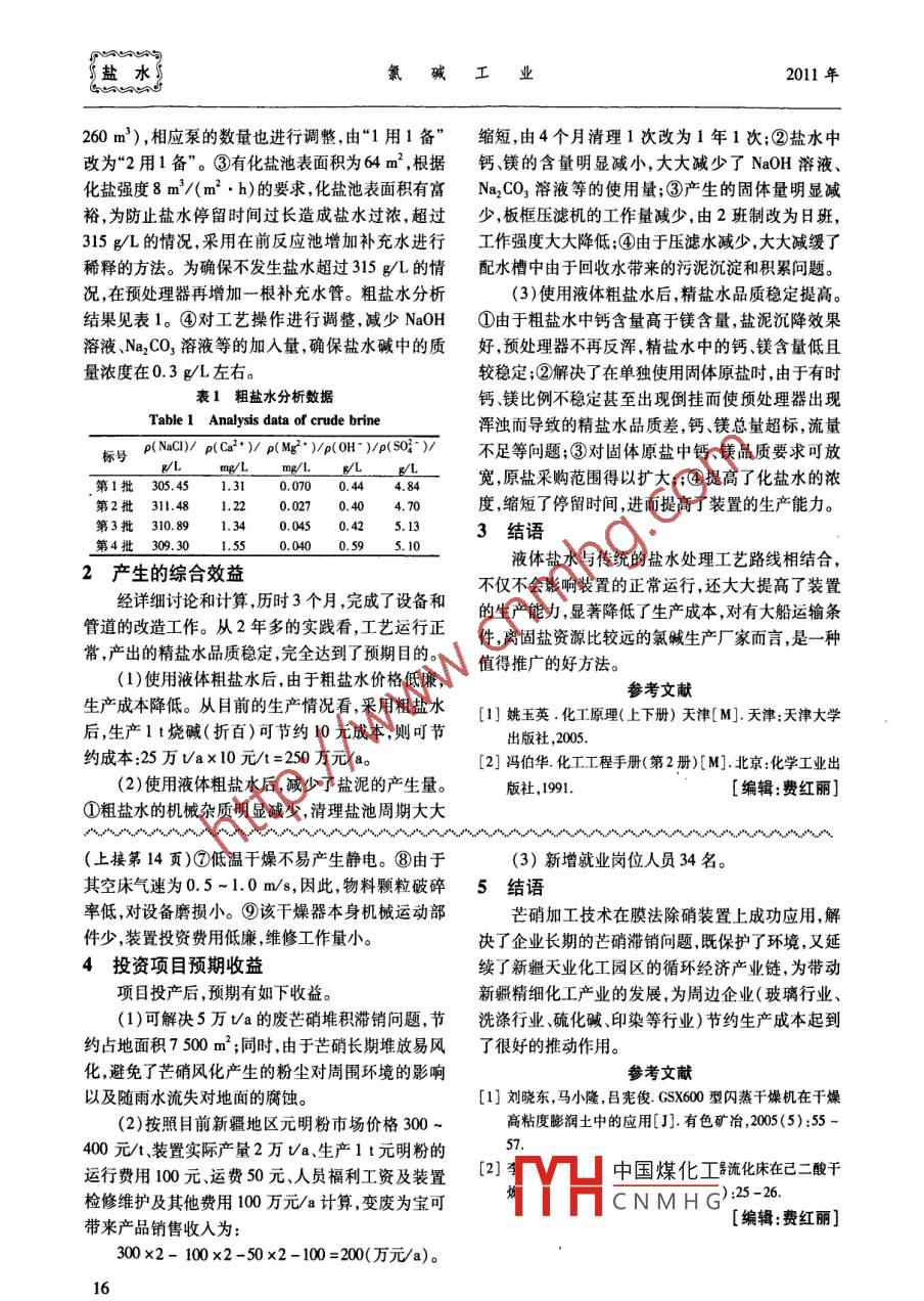 第47卷第5期氯堿工業(yè)Vol 47. No 52011年5月Chlor-Alkali IndustryMay, 2011化鹽系統(tǒng)改造經(jīng)驗(yàn)熊習(xí)兵,許峰(雙獅(張家港)精細(xì)化工有限公司,江蘇蘇州215635)[關(guān)鍵詞]氯堿生產(chǎn);鹽水精制;一次鹽水[摘要]介紹了雙獅(張家港)精細(xì)化工有限公司化鹽系統(tǒng)改造前后的運(yùn)行情況,總結(jié)了該次改造取得的效[中圖分類號(hào)]TQ114.261[文獻(xiàn)標(biāo)志碼]B[文章編號(hào)]1008-133X(2011)05-0015Experiences on improving salt dissolving systemXIONG Xibing, XU FengShuangshi( Zhangjiagang) Fine Chemical Industry Co., Ltd, Suzhou 215635, China)Key words: chlor-alkali production; brine refining; primary brineAbstract: The running situations of salt dissolving system in Shuangshi ( Zhangjiagang) Fine ChemicalLtd. before and after improvement are introduced. The benefits obtained from theimprovement are summarized雙獅(張家港精細(xì)化工有限公司(以下簡(jiǎn)稱去Mg(OH)2固體顆粒)、后反應(yīng)槽(在槽內(nèi)加入雙獅化工”)目前擁有25萬(wàn)Ua離子膜法燒堿裝置。Na2CO3溶液形成CaCO3固體顆粒)、膜過(guò)濾器(除近幾年來(lái),工業(yè)原鹽價(jià)格逐步上升,氯堿企業(yè)生產(chǎn)成去鹽水中的CaCO3固體顆粒、藻類以及其他雜質(zhì)顆本不斷增加。如何挖潛改造,節(jié)約成本,降低消耗,粒)后進(jìn)入精鹽水貯槽。成為雙獅化工技改工作的重點(diǎn)??紤]到公司擁有國(guó)電解后淡鹽水配水[化鹽泡一[前反應(yīng)槽}[預(yù)處理器際碼頭的優(yōu)勢(shì)(能夠停靠5萬(wàn)t級(jí)的液體船)及江蘇地區(qū)擁有豐富地下鹽的資源優(yōu)勢(shì),雙獅化工對(duì)現(xiàn)有漫清槽固體工業(yè)水FeCl3次鹽水系統(tǒng)進(jìn)行改造,采用直接采購(gòu)飽和的粗鹽水部分代替采購(gòu)鹽,既減少了運(yùn)輸成本,又降低了輔精鹽水貯槽一匱贗過(guò)濾器}[后反應(yīng)材消耗,顯著提高了經(jīng)濟(jì)效益。純堿1技術(shù)方案圖1原一次鹽水工藝流程圖(1)原一次鹽水工藝12。雙獅化工一次鹽水Fig 1 Original now chart of primary brine工序采用的是HVM膜工藝,其原工藝流程(見(jiàn)圖1)(2)改造方案的討論。為了降低成本,設(shè)計(jì)采為;來(lái)自電解工序的淡鹽水一部分直接進(jìn)入配水槽,用他和鹽水,所以要對(duì)鹽水工藝進(jìn)行了改造。①由部分經(jīng)過(guò)折流槽(其中加入氯化鋇溶液),通過(guò)稀于配水槽中的鹽水來(lái)自電解脫氯工段,溫度約70酸溶液調(diào)節(jié)折流槽內(nèi)溶液的pH值,除去BaSO4固℃,而采購(gòu)鹽水溫度為常溫(約25℃),所以需要重體顆粒。淡鹽水由澄清槽溢流至配水槽通過(guò)化鹽新核算原有換熱器的面積。原有換熱器的面積為給料泵打人化鹽池鹽水飽和后經(jīng)過(guò)前反應(yīng)槽(在33.8m2,已不能滿足生產(chǎn)的要求,經(jīng)過(guò)計(jì)算需要再槽內(nèi)加入NaOH溶液,形成Mg(OH)2細(xì)小懸浮固增加60m2。②原有泵需要重新考慮。原有泵的流體顆粒)再經(jīng)預(yù)處理器(加入FeCl絮凝劑氣浮除量為200m/臺(tái),已不能滿足生產(chǎn)要求(需要總量為中國(guó)煤化工[作者簡(jiǎn)介熊習(xí)兵(1973-),男,工程師1996年畢業(yè)于蘇州城CNMHG獅(張家港)精細(xì)化工有限公司副總經(jīng)理負(fù)責(zé)項(xiàng)目工作。[收稿日期]2010-07-13鹽水氯堿工業(yè)2011年260m3),相應(yīng)泵的數(shù)量也進(jìn)行調(diào)整,由“1用1備”縮短,由4個(gè)月清理1次改為1年1次;②鹽水中改為“2用1備”。③有化鹽池表面積為64m2,根據(jù)鈣、鎂的含量明顯減小,大大減少了NaOH溶液、化鹽強(qiáng)度8m3/(m2h)的要求,化鹽池表面積有富Na2CO23溶液等的使用量;③產(chǎn)生的固體量明顯減裕,為防止鹽水停留時(shí)間過(guò)長(zhǎng)造成鹽水過(guò)濃,超過(guò)少,板框壓濾機(jī)的工作量減少,由2班制改為日班315g/L的情況,采用在前反應(yīng)池增加補(bǔ)充水進(jìn)行工作強(qiáng)度大大降低;④由于壓濾水減少大大減緩了稀釋的方法。為確保不發(fā)生鹽水超過(guò)315g/L的情配水槽中由于回收水帶來(lái)的污泥沉淀和積累問(wèn)題。況,在預(yù)處理器再增加一根補(bǔ)充水管。粗鹽水分析3)使用液體粗鹽水后,精鹽水品質(zhì)穩(wěn)定提高。結(jié)果見(jiàn)表1。④對(duì)工藝操作進(jìn)行調(diào)整,減少NaOH①由于粗鹽水中鈣含量高于鎂含量,鹽泥沉降效果溶液Na2CO3溶液等的加入量,確保鹽水堿中的質(zhì)好,預(yù)處理器不再反渾精鹽水中的鈣鎂含量低且量濃度在0.3g/L左右。較穩(wěn)定;②解決了在單獨(dú)使用固體原鹽時(shí)由于有時(shí)表1粗鹽水分析數(shù)據(jù)鈣、鎂比例不穩(wěn)定甚至出現(xiàn)倒掛而使預(yù)處理器出現(xiàn)Table 1 Analysis data of crude brine渾濁而導(dǎo)致的精鹽水品質(zhì)差,鈣、鎂總量超標(biāo),流量標(biāo)號(hào)p(NaC)/p(Ca2)/p(Mg)p(OH)p(S02)不足等問(wèn)題;③對(duì)固體原鹽中鈣、鎂品質(zhì)要求可放第1批205461:004.寬,原鹽采購(gòu)范圍得以擴(kuò)大;④提高了化鹽水的濃第2批311.481.220.0270.404.70度縮短了停留時(shí)間,進(jìn)而提高了裝置的生產(chǎn)能力第3批310.891.343結(jié)語(yǔ)第4批309.30液體鹽水與傳統(tǒng)的鹽水處理工藝路線相結(jié)合2產(chǎn)生的綜合效益經(jīng)詳細(xì)討論和計(jì)算,歷時(shí)3個(gè)月,完成了設(shè)備和的生產(chǎn)能力,顯著降低了生產(chǎn)成本對(duì)有大船運(yùn)輸條管道的改造工作。從2年