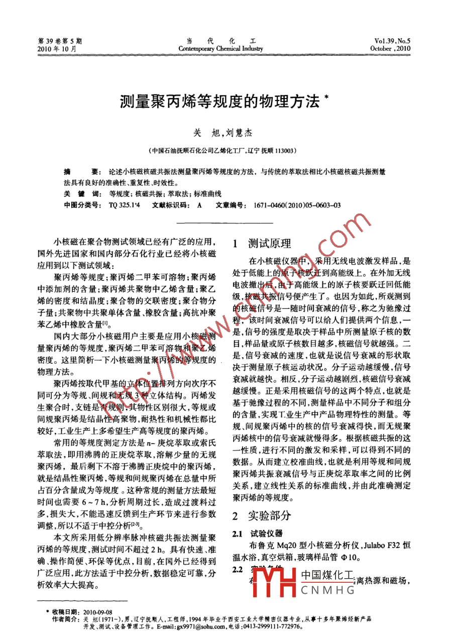 第39卷第5期當代化工Vo1. 39, No 52010年10月Contemporary Chemical IndustryOctober, 2010測量聚丙烯等規(guī)度的物理方法關旭,劉慧杰(中國石油撫順石化公司乙烯化工廠遼寧撫順113003)摘要:論述小核磁核磁共振法測量聚丙烯等規(guī)度的方法,與傳統(tǒng)的萃取法相比小核磁核磁共振測量法具有良好的準確性、重復性時效性關鍵詞:等規(guī)度;核磁共振;萃取法;標準曲線中圖分類號:TQ325.14文獻標識碼:A文章編號:1671-0460(2010)05-0603-03小核磁在聚合物測試領域已經(jīng)有廣泛的應用,1測試原理國外先進國家和國內(nèi)部分石化行業(yè)已經(jīng)將小核磁應用到以下測試領域:在小核磁儀器中,采用無線電波激發(fā)樣品,是聚丙烯等規(guī)度;聚丙烯二甲苯可溶物;聚丙烯處于低能上的原子核躍遷到高能級上。在外加無線中添加劑的含量;聚丙烯共聚物中乙烯含量;聚乙電波撤出后,由于高能級上的原子核要躍遷回低能烯的密度和結(jié)晶度;聚合物的交聯(lián)密度;聚合物分級核磁共振信號便產(chǎn)生了。也因為如此,所觀測到子量;共聚物中共聚單體含量、橡膠含量;高抗沖聚的核磁信號是一隨時間衰減的信號稱之為馳像過苯乙烯中橡膠含量叩。程,該時間衰減信號可以給人們提供兩個信息,國內(nèi)大部分小核磁用戶主要是應用小核磁測是,信號的強度是取決于樣品中所測量原子核的數(shù)量聚丙烯的等規(guī)度,聚丙烯二甲苯可溶物和聚乙烯目,樣品量或原子核數(shù)目越多核磁信號就越強。二密度。這里簡析一下小核磁測量聚丙烯的等規(guī)度的是,信號衰減的速度,也就是說信號衰減的形狀取物理方法決于測量原子核運動狀況。分子運動越緩慢,信號聚丙烯按取代甲基的立體位置排列方向次序不衰減就越快。相反,分子運動越劇烈核磁信號衰減同可分為等規(guī)、間規(guī)和無規(guī)3種立體結(jié)構(gòu)。丙烯發(fā)越緩慢。正是采用核磁信號的這兩個特點也就是生聚合時,支鏈是否規(guī)則,其物性區(qū)別很大,等規(guī)或基于馳豫過程的不同測量樣品中不同分子和組分間規(guī)聚丙烯是結(jié)晶性高聚物耐熱性和機械性都比的含量,實現(xiàn)T業(yè)生產(chǎn)中產(chǎn)品物理特性的測量。等較好,工業(yè)生產(chǎn)上多希望生產(chǎn)高等規(guī)度的聚丙烯規(guī)、間規(guī)聚丙烯中的核的信號衰減得快,而無規(guī)聚常用的等規(guī)度測定方法是n-庚烷萃取或素氏丙烯核中的信號衰減就慢得多。根據(jù)核磁共振的這萃取法,即用沸騰的正庚烷萃取溶解少量的無規(guī)性質(zhì),進行不同的激發(fā)和采樣,可以得到不同的聚丙烯,最后剩下不溶于沸騰正庚烷中的聚丙烯,數(shù)據(jù)。從而建立校準曲線,也就是利用等規(guī)和間規(guī)就是結(jié)晶性聚丙烯等規(guī)和間規(guī)聚丙烯在總量中所聚丙烯共振衰減信號與正庚烷萃取率之間的比例占百分含量成為等規(guī)度。這種常規(guī)的測量方法最短關系,建立線性關系的標準曲線,并由此準確測定時間也需要6~7h,分析周期過長,造成過渡料過聚丙烯的等規(guī)度多損失大,不能迅速反饋到生產(chǎn)環(huán)節(jié)來進行參數(shù)2實驗部分調(diào)整,所以不適于中控分析。本文所采用低分辨率脈沖核磁共振法測量聚2l試驗儀器丙烯的等規(guī)度,測試時間不超過2h。具有快速準布魯克Mq20型小核磁分析儀, Julabo F32恒確、操作簡便、環(huán)保等優(yōu)點,目前,在國外已經(jīng)得到溫水浴,真空烘箱玻璃樣品管Φ10。廣泛應用,此方法適于中控分析,數(shù)據(jù)穩(wěn)定可靠,分中國煤化工析效率大大提高。離熱源和磁場,CNMHG·收稿日期:20100908作者簡介:關旭(1971-),男,遼寧撫順人,工程師,1994年半業(yè)于西安工業(yè)大學精密儀器專業(yè),從事十多年聚烯烴新產(chǎn)品開發(fā)、測試、設備管理工作。E-mail:gx997l@sohu.com,電話:0413-29991172976當代化工第39卷第5期通過標準樣品自校磁場頻率為1995MHz。恒溫水浴:一個標準大氣壓下,(40±01)℃環(huán)境溫度:(23±2)℃,相對濕度:20%~80%;97,8樣品質(zhì)量:(25±0.01)g23樣品預處理把收集并編號的聚丙烯顆粒樣品在真空干燥箱內(nèi)干燥1h以上,取出后冷卻30min,然后放入水浴中加熱15min以上,放入小核磁測量孔后,要穩(wěn)定2min以上再進行測量。主要操作條件見表1。95.0952954956958NMR Ratio表1主要操作條件圖1標準曲線Table 1 The major operating conditionsFig. 1 The standard curve技術參數(shù)操作條件表32種測試方法結(jié)果對比體溫度代℃Table 3 Comparison of the two kinds of test methods掃描次數(shù)序號萃取法NMR增益/dB9802624標準曲線的建立選取撫順乙烯廠質(zhì)檢處聚丙烯T30s粒料103456份,以核磁信號強度比值為橫坐標,以萃取法獲得98.1l0的等規(guī)度值作為縱坐標測出數(shù)據(jù)確定了10個點通過電腦校正,得出一條連續(xù)平滑的直線,即反映出其核磁信號與等規(guī)度間線性關系的基本曲線,通過曲線校正,剔除偏差交大的點,當核磁法與萃取97385法測得結(jié)果偏差<0.2%時,基本曲線就可作為標準表3數(shù)據(jù)表明偏差最大0.12%,<02%,準確曲線使用。在以后的工作中可以不斷的補充新的標性完全合格。樣點,調(diào)整曲線斜率和截距,直到曲線的斜率和截26重復性距不再隨加點而變化或變化很小,就得到了最終的選擇其中3個樣品進行測試,任選其三,結(jié)果標準曲線。見表4。表2和圖1分別是選取的T
