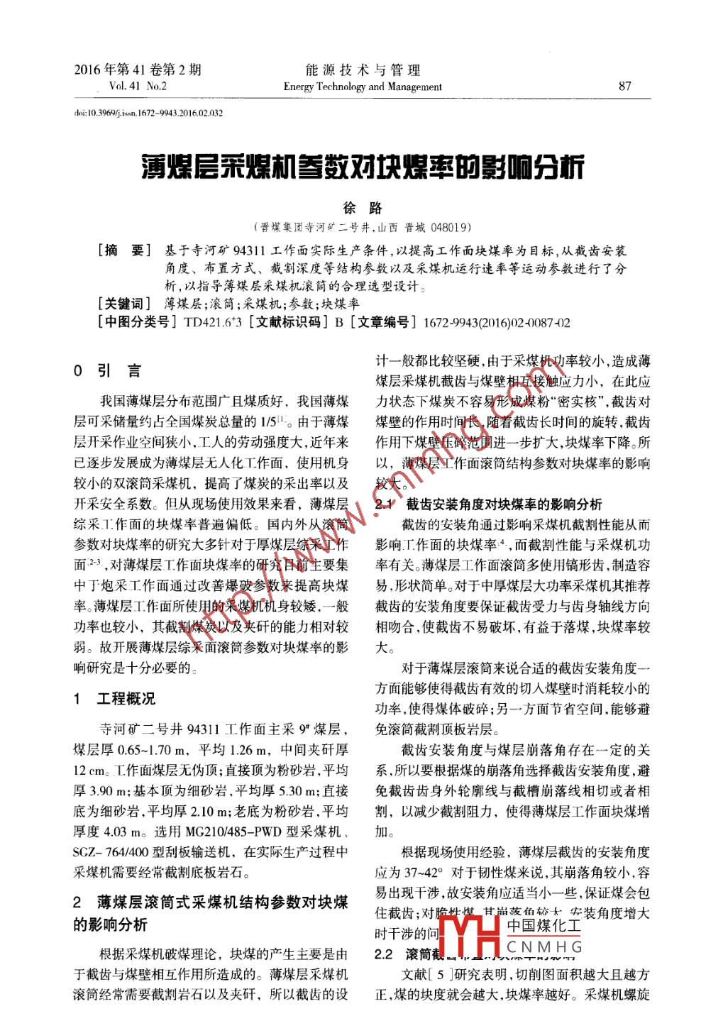 2016年第41卷第2期能源技術(shù)與管理Vol. 41 No.2Energy Technology and Management87doi: 10.3969/j isn.1672- 9943.2016.02.032薄煤層采煤機(jī)參數(shù)對塊煤率的影響分析徐路(晉煤集團(tuán)寺河礦二號井.山西晉城048019) .[摘要]基于寺河礦94311工作面實(shí)際生產(chǎn)條件,以提高工作面塊煤率為目標(biāo),從截齒安裝角度、布置方式、截割深度等結(jié)構(gòu)參數(shù)以及采煤機(jī)運(yùn)行速率等運(yùn)動參數(shù)進(jìn)行了分析,以指導(dǎo)薄煤層采煤機(jī)滾筒的合理選型設(shè)計(jì)。[關(guān)鍵詞]薄煤層;滾筒;采煤機(jī);參數(shù);塊煤率[中圖分類號] TD421.6*3 [文獻(xiàn)標(biāo)識碼] B [文章編號] 1672-9943(2016)02-0087-02計(jì)一般都比較堅(jiān)硬,由于采煤機(jī)功率較小,造成薄0引言煤層采煤機(jī)截齒與煤壁相互接觸應(yīng)力小,在此應(yīng)我國薄煤層分布范圍廣且煤質(zhì)好,我國薄煤力狀態(tài)下煤炭不容易形成煤粉“密實(shí)核”,截齒對層可采儲量約占全國煤炭總量的15。由于薄煤煤壁的作用時間長,隨著截齒長時間的旋轉(zhuǎn),截齒層開采作業(yè)空間狹小,工人的勞動強(qiáng)度大,近年來作用下煤壁壓碎范圍進(jìn)-步擴(kuò)大,塊煤率下降。所已逐步發(fā)展成為薄煤層無人化工作面,使用機(jī)身以,薄煤層工作面滾筒結(jié)構(gòu)參數(shù)對塊煤率的影響較小的雙滾筒采煤機(jī),提高了煤炭的采出率以及較大。開采安全系數(shù)。但從現(xiàn)場使用效果來看,薄煤層2.1截齒安裝角 度對塊煤率的影響分析綜采工作面的塊煤率普遍偏低。國內(nèi)外從滾筒截齒的安裝角通過影響采煤機(jī)截割性能從而參數(shù)對塊煤率的研究大多針對于厚煤層綜采工作影響工作面的塊煤率4,而截割性能與采煤機(jī)功面2,對薄煤層工作面塊煤率的研究目前主要集率有關(guān)。薄煤層工作面滾簡多使用鎬形齒,制造容中于炮采工作面通過改善爆破參數(shù)來提高塊煤易,形狀簡單。對于中厚煤層大功率采煤機(jī)其推薦率。薄煤層工作面所使用的采煤機(jī)機(jī)身較矮,-般截齒的安裝角度要保證截齒受力與齒身軸線方向功率也較小,其截割煤炭以及夾矸的能力相對較相吻合,使截齒不易破壞,有益于落煤,塊煤率較弱。故開展薄煤層綜采面滾簡參數(shù)對塊煤率的影大。響研究是十分必要的。對于薄煤層滾簡來說合適的截齒安裝角度--方面能夠使得截齒有效的切入煤壁時消耗較小的1工程概況 .功率,使得煤體破碎;另-.方面節(jié)省空間,能夠避寺河礦二號井94311工作面主采9*煤層,免滾簡截割頂板巖層。煤層厚0.65~1.70m,平均1.26 m,中間夾矸厚截齒安裝角度與煤層崩落角存在一定的關(guān)12 cm。工作面煤層無偽頂;直接頂為粉砂巖,平均系,所以要根據(jù)煤的崩落角選擇截齒安裝角度,避厚3.90m;基本頂為細(xì)砂巖,平均厚5.30m;直接免截齒齒身外輪廓線與截槽崩落線相切或者相底為細(xì)砂巖,平均厚2.10 m;老底為粉砂巖,平均割,以減少截割阻力,使得薄煤層工作面塊煤增厚度4.03 m。選用MG210/485- -PWD型采煤機(jī)、加。SGZ- 764/400型刮板輸送機(jī),在實(shí)際生產(chǎn)過程中根據(jù)現(xiàn)場使用經(jīng)驗(yàn),薄煤層截齒的安裝角度采煤機(jī)需要經(jīng)常截割底板巖石。應(yīng)為37~42°對于韌性煤來說,其崩落角較小,容.2薄煤層滾筒式采煤機(jī)結(jié)構(gòu)參數(shù)對塊煤易出現(xiàn)干涉,故安裝角應(yīng)適當(dāng)小一些,保證煤會包.住截齒;對脆件煤甘崩菠魚較太安裝角度增大的影響分析時干涉的問中國煤化工根據(jù)采煤機(jī)破煤理論,塊煤的產(chǎn)生主要是由2.2滾筒截HCNMH G .于截齒與煤壁相互作用所造成的。薄煤層采煤機(jī)文獻(xiàn)[ 5 ]研究表明,切削圖面積越大且越方滾筒經(jīng)常需要截割巖石以及夾矸,所以截齒的設(shè)正,煤的塊度就會越大,塊煤率越好。采煤機(jī)螺旋2016年4月88徐路薄煤層采煤機(jī)參數(shù)對塊煤率的影響分析Apr., 2016滾筒上截齒的排列布置方式不同會直接影響截割0.09~0.12時,可以獲得比較理想的塊煤。煤時的能量消耗以及落煤的塊度大小6。目前截4現(xiàn)場使用情況齒的排列形式有交叉式(棋盤式)順序式(重復(fù)式)等,交叉式截齒的截割阻力小于截齒分布密度較94311工作面主采煤層含12 cm夾矸,在實(shí)大的順序式排列方式,可以消耗較小的功率獲得際割煤過程中經(jīng)常需要截割底板巖石,滾筒截齒較大的塊煤率。經(jīng)常出現(xiàn)磨損破壞等情況。將滾筒截齒的排列方當(dāng)采煤機(jī)的牽引速度、滾筒轉(zhuǎn)速相同時,交叉式改變?yōu)榻徊媾帕泻?截齒的磨損情況明顯好轉(zhuǎn),式排列的截齒切削厚度大于順序排列的截齒,單且工作面塊煤率有一定的提高。齒上所能承受的載荷也大于順序排列的截齒,但5結(jié)論由于順序排列截齒分布均勻使得截齒上所受載荷相對穩(wěn)定且截齒截割斷面更接近正方形,所以其從薄煤層綜采工作面滾筒采煤機(jī)參數(shù)對塊煤截割能力較強(qiáng)。但對于薄煤層工作面來說,切削厚率的影響進(jìn)行分析,得出如下結(jié)論:度較小,文獻(xiàn)[7-8]認(rèn)為切削厚度較小時交叉式排(1)截齒安裝角度影響截割性能、塊煤率和列的塊煤率大于順序式。通過現(xiàn)場實(shí)際使用也發(fā)煤層崩落角;現(xiàn)截齒交叉排列的工作面塊煤率高于順序式排列(2)交叉式排列截齒的截